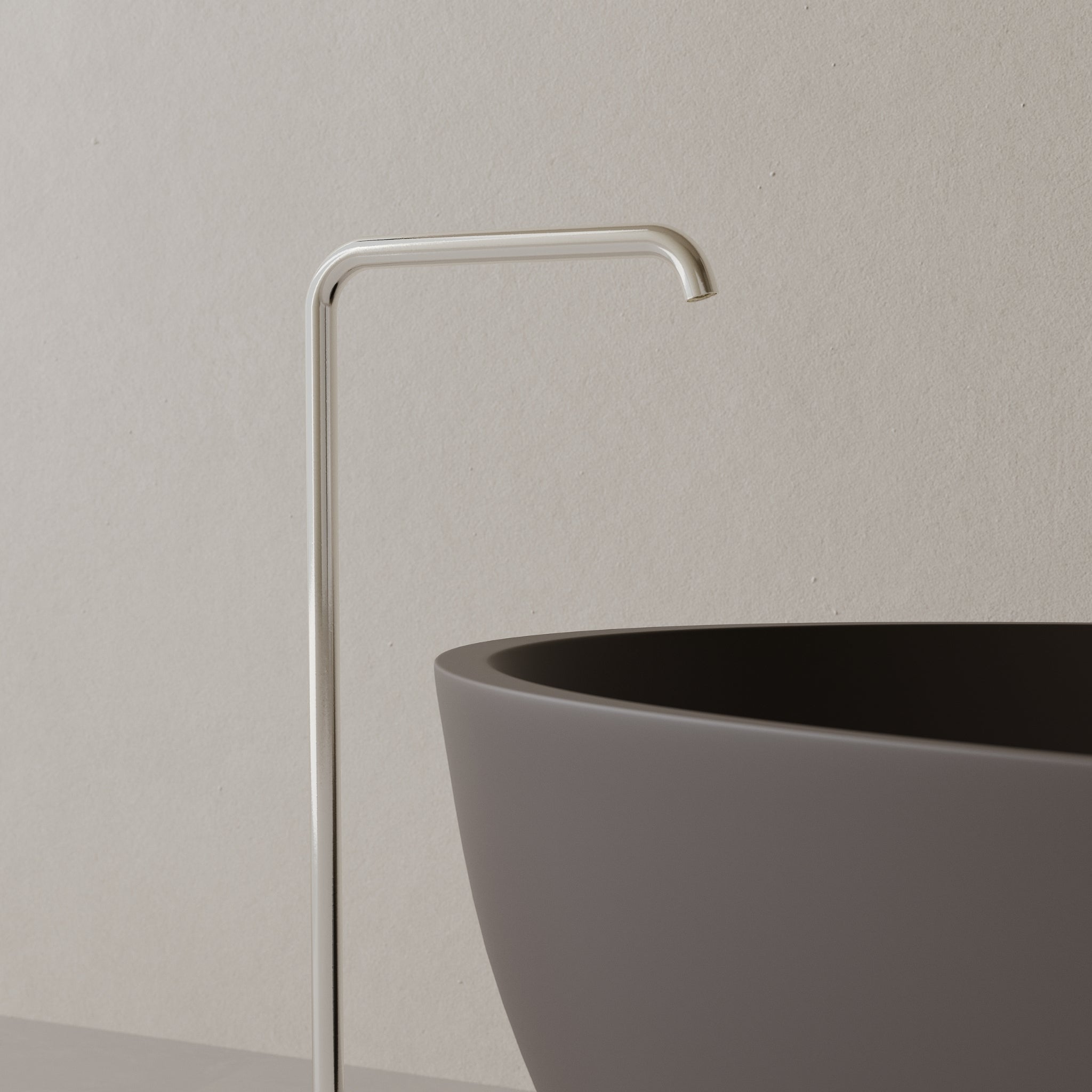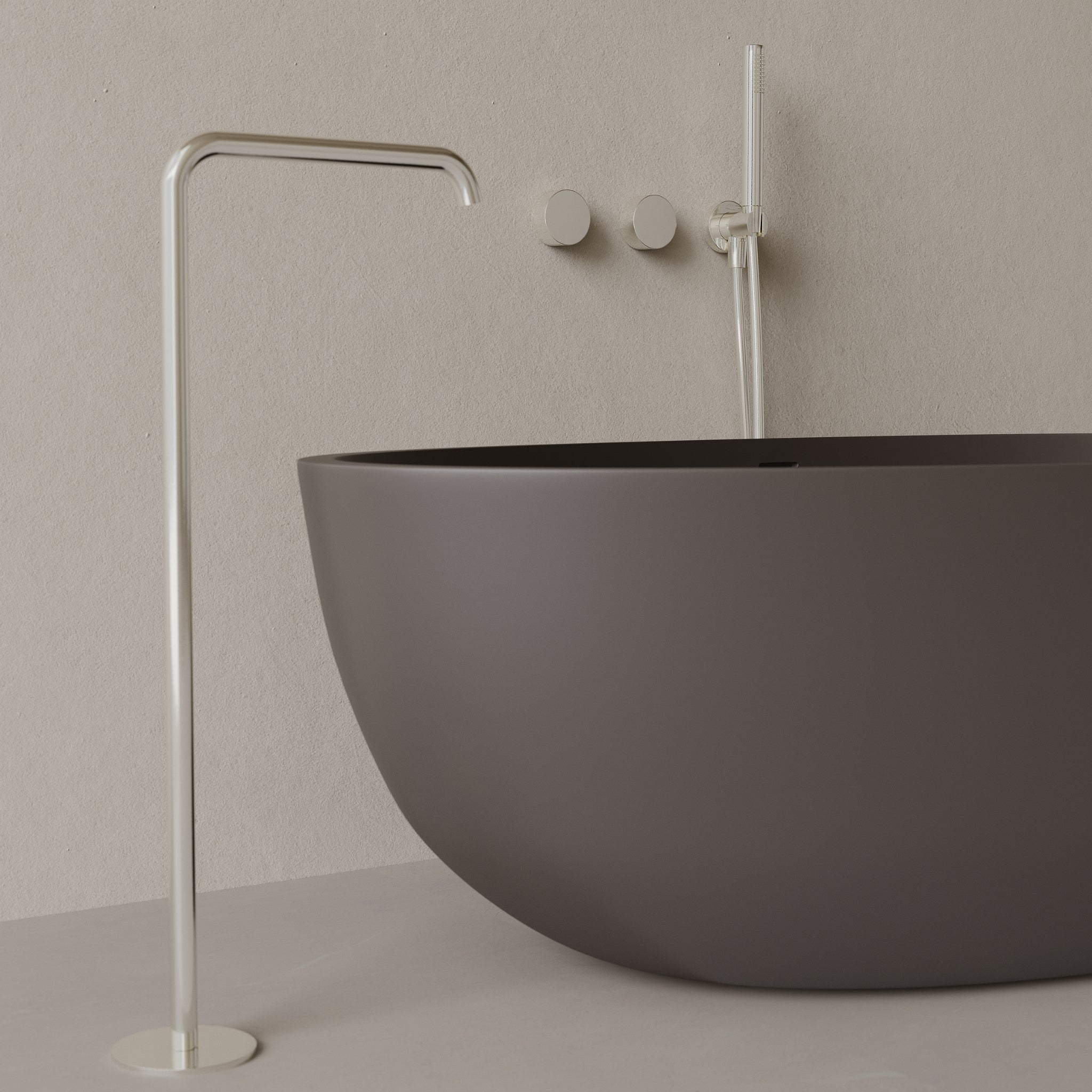 With its softened square profile and rounded corners, this floor-mounted bathtub filler brings a contemporary sense of ease to architectural form. The gently curved silhouette lends a balanced, welcoming presence, while dual knob controls ensure precise water and temperature regulation. An integrated handheld enhances versatility for daily rituals. Designed for intuitive use and visual harmony, it supports an uninterrupted, restorative soak.