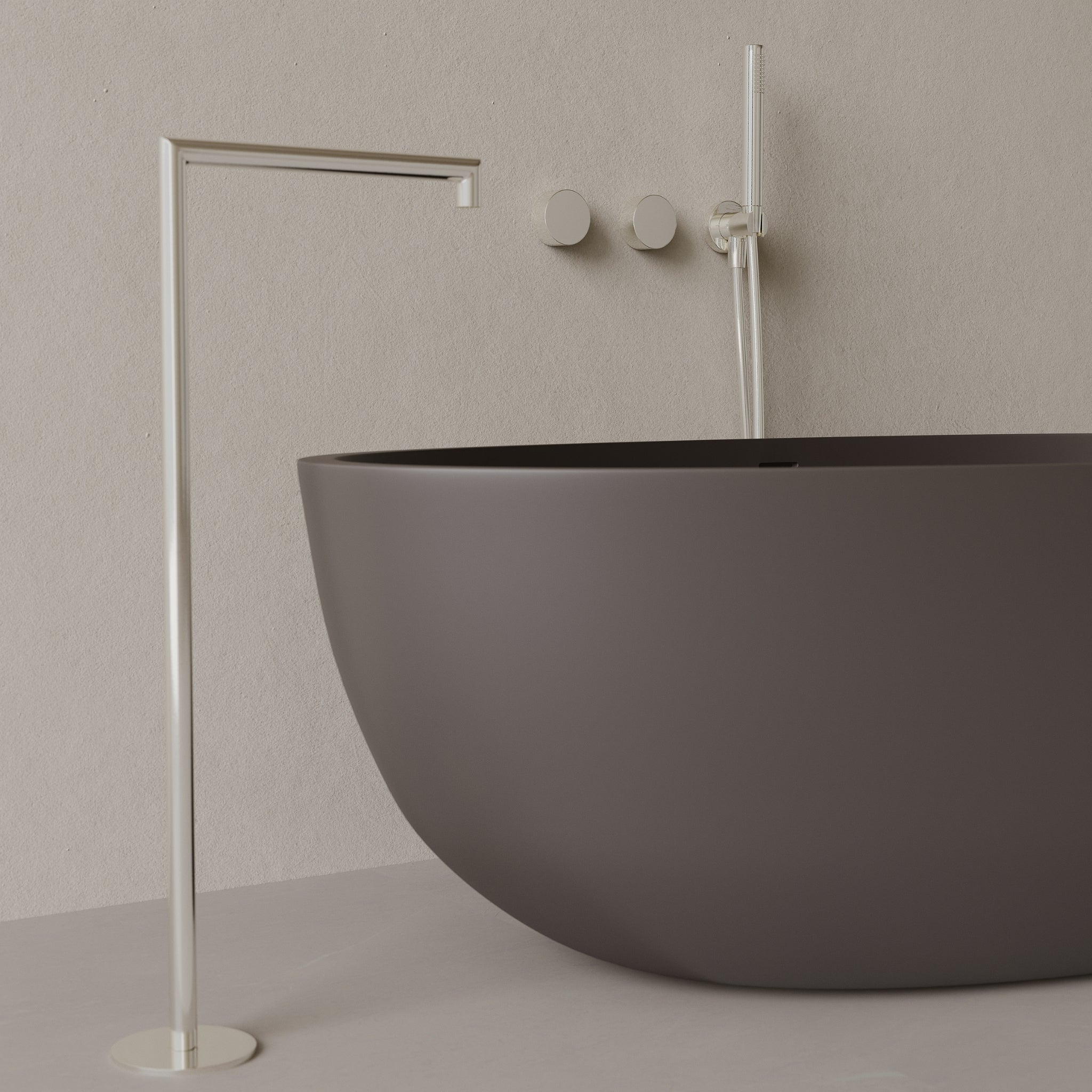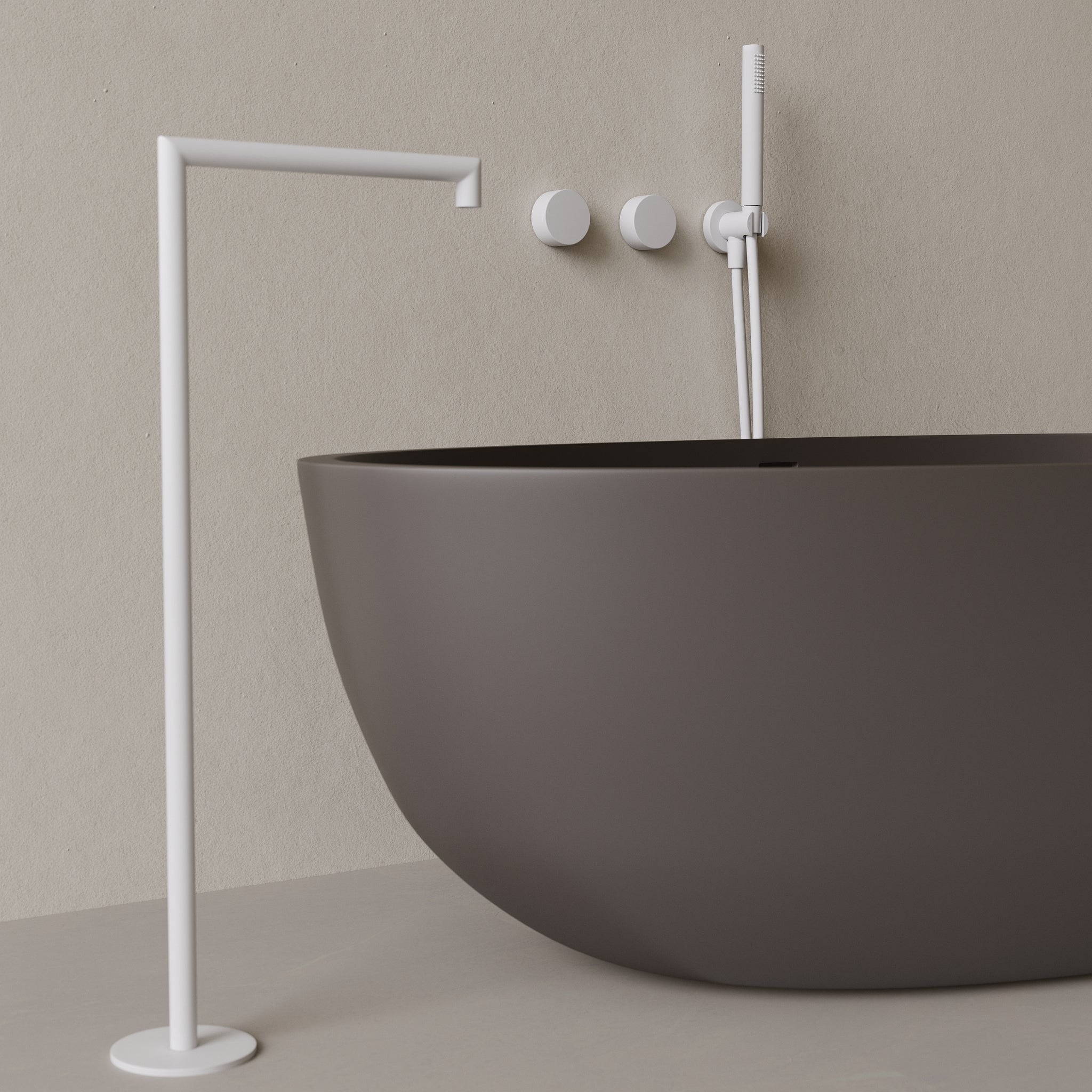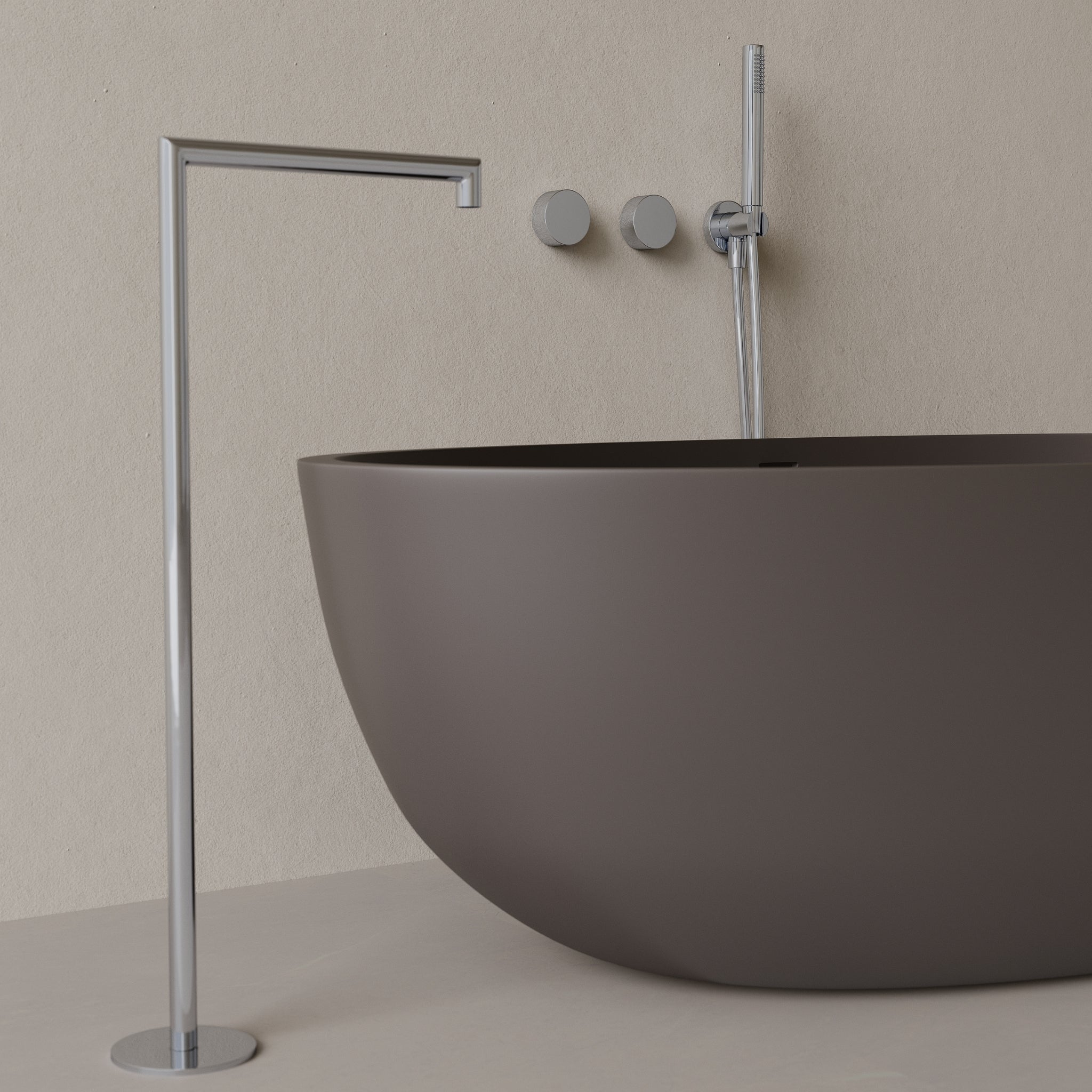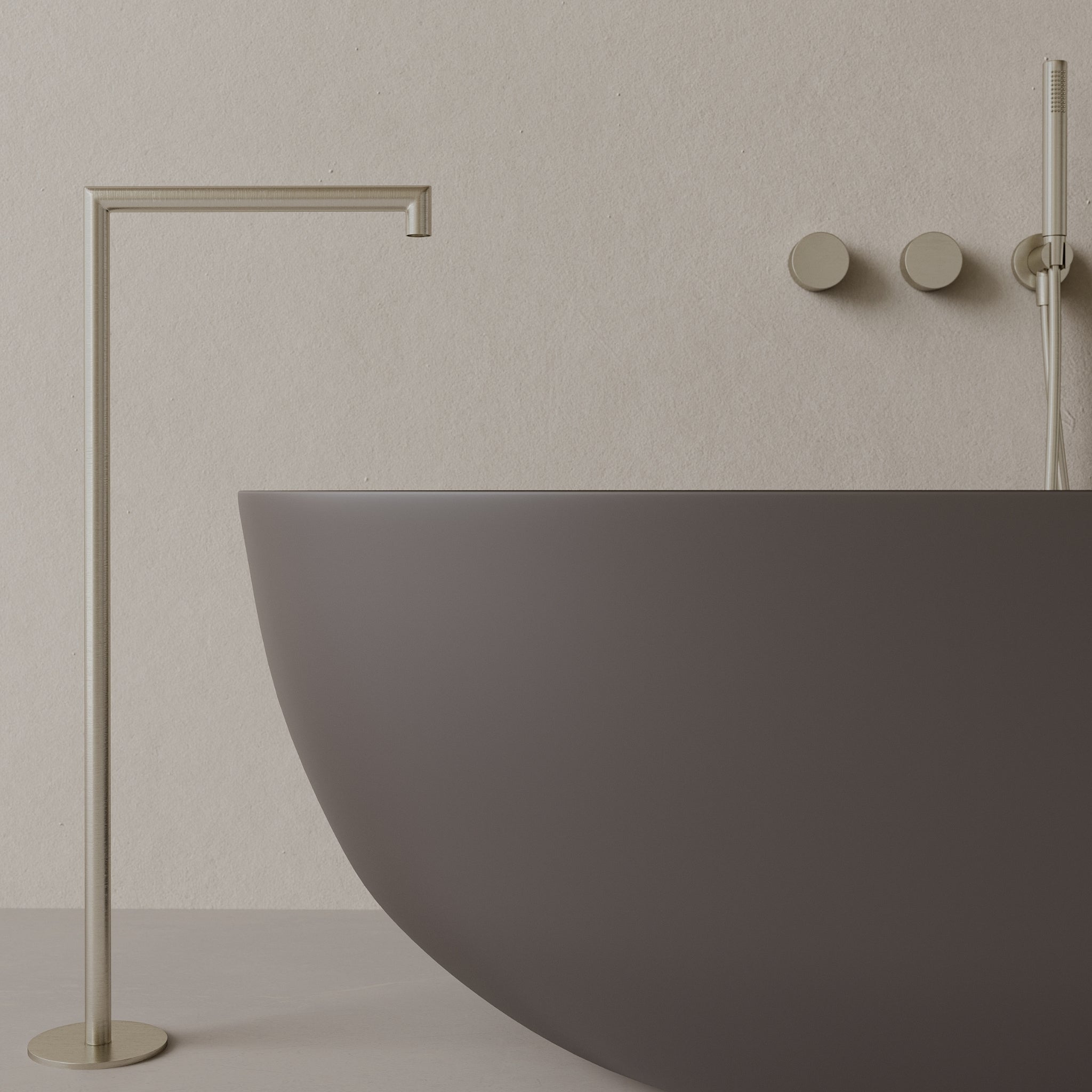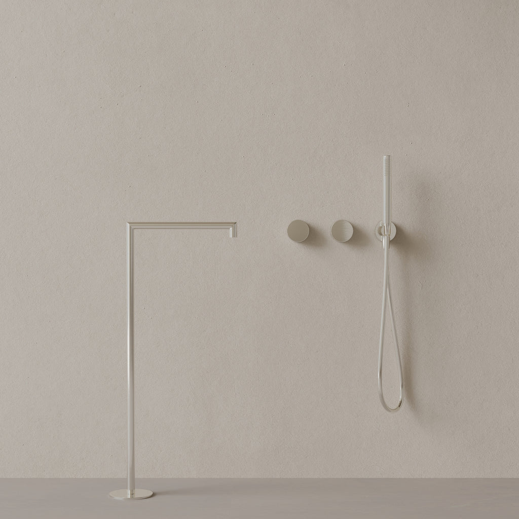 This floor-mounted bathtub filler features a square, architectural silhouette that adds definition and balance to the space. Dual knob controls offer precise water and temperature adjustment, while the integrated handheld enhances everyday functionality. Designed for control and simplicity, it supports an uninterrupted, restorative soak.
