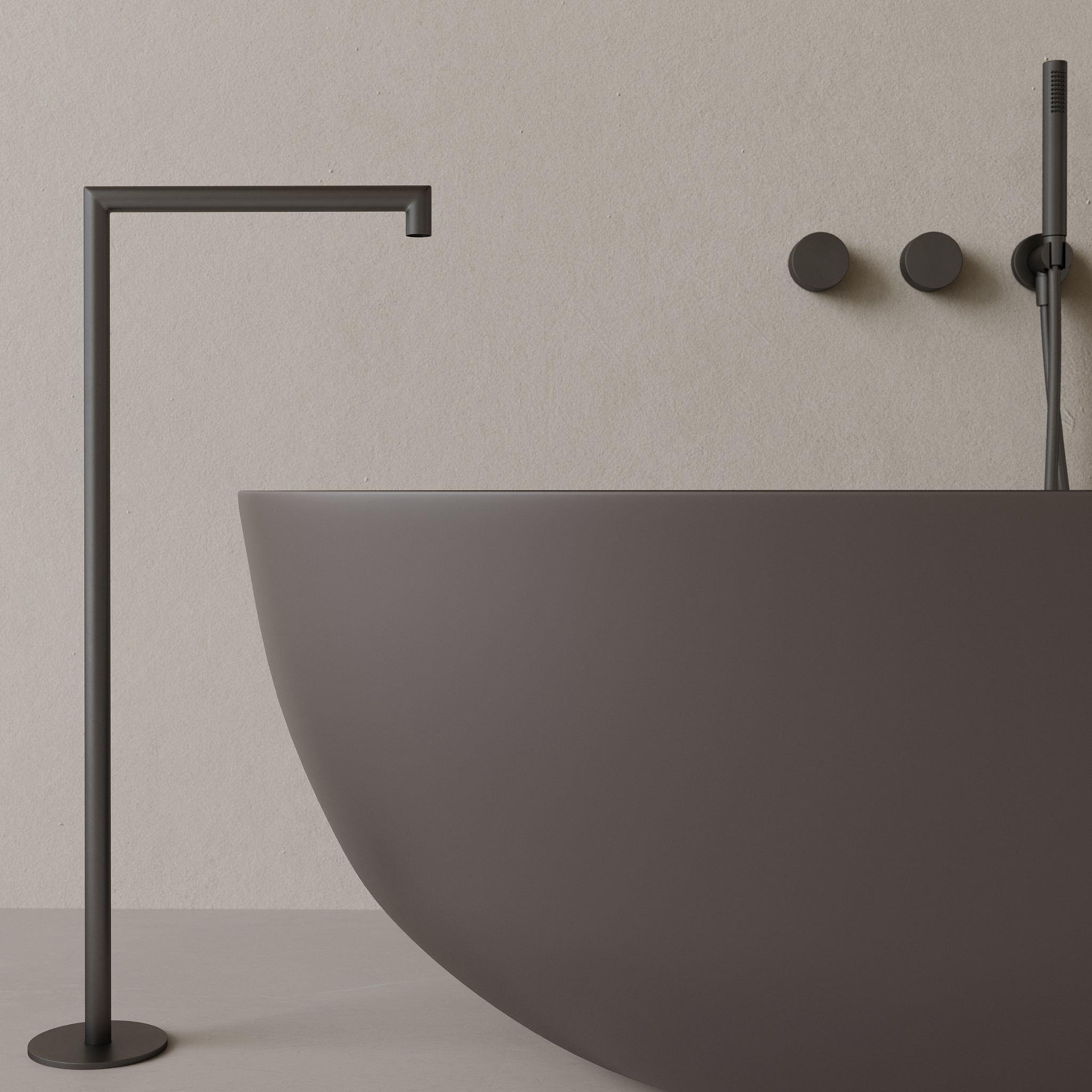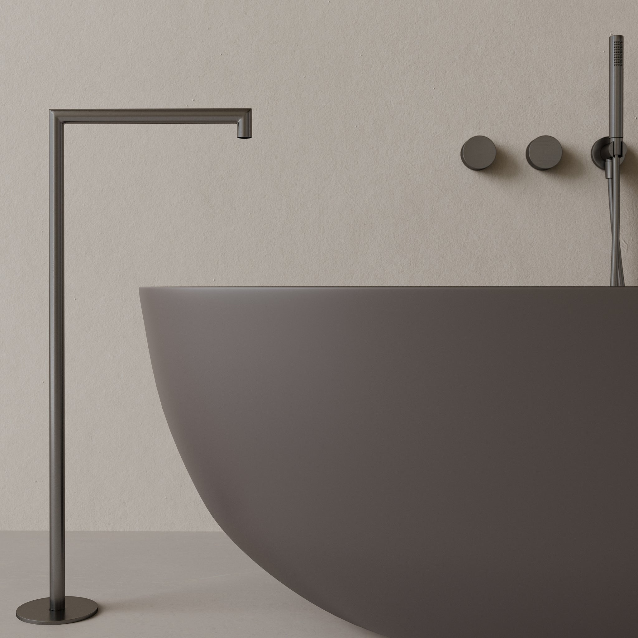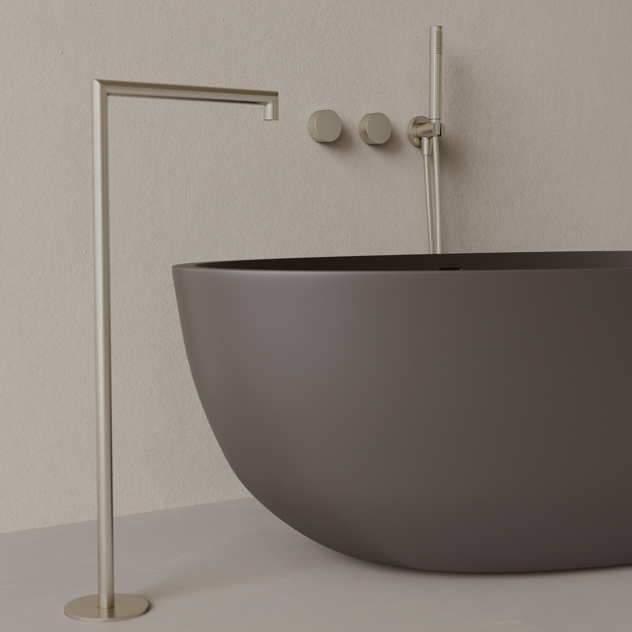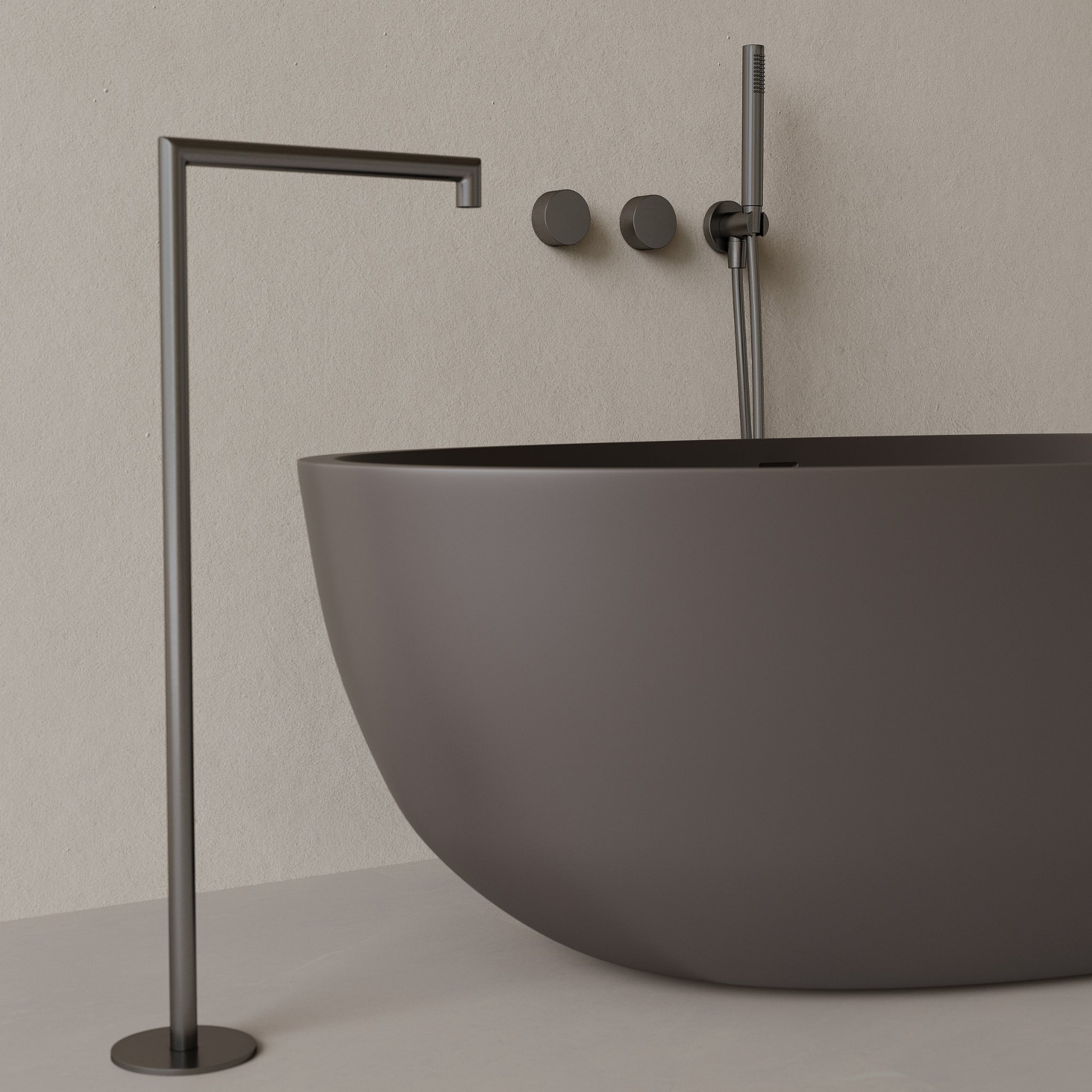 This floor-mounted bathtub filler features a square, architectural silhouette that adds definition and balance to the space. Dual knob controls offer precise water and temperature adjustment, while the integrated handheld enhances everyday functionality. Designed for control and simplicity, it supports an uninterrupted, restorative soak.