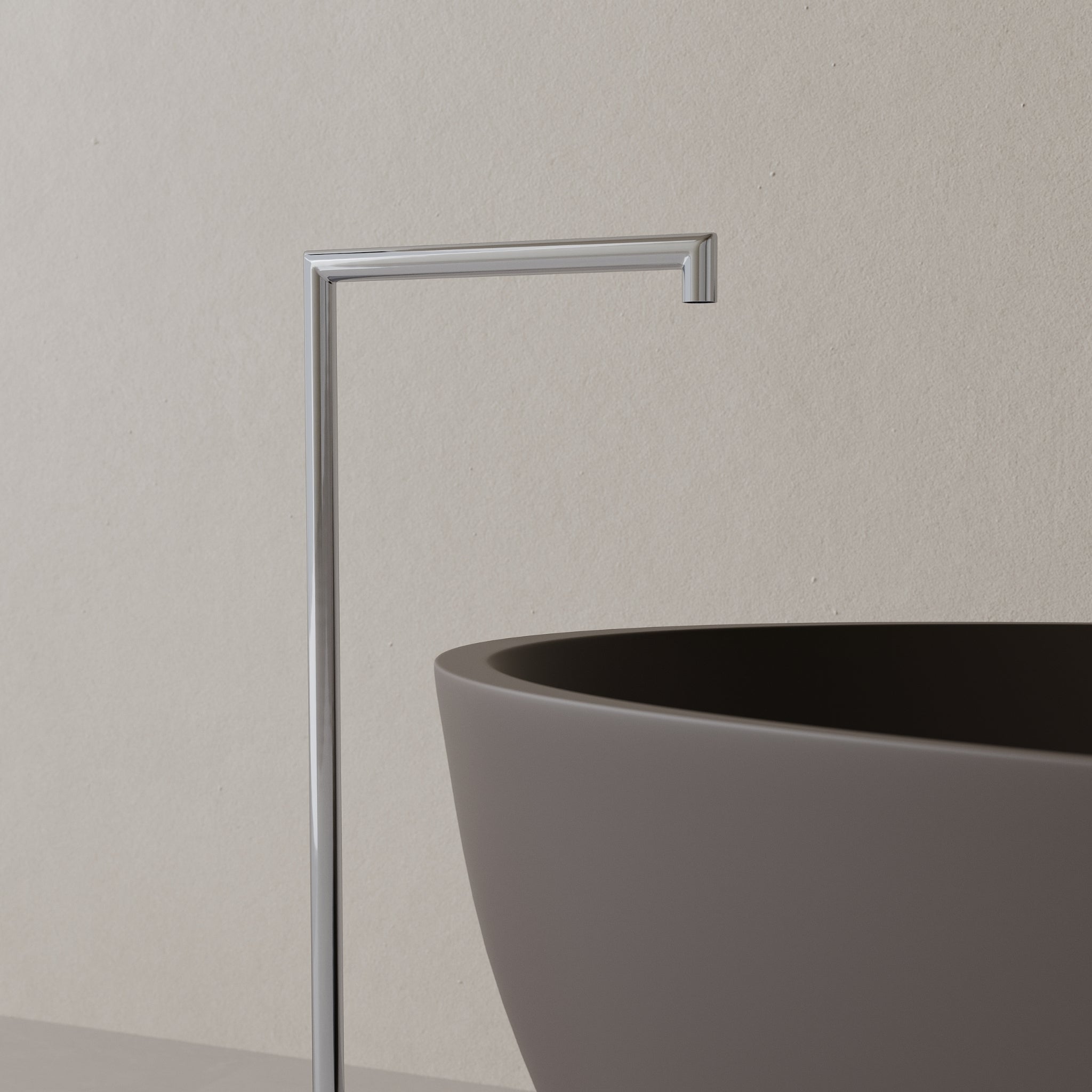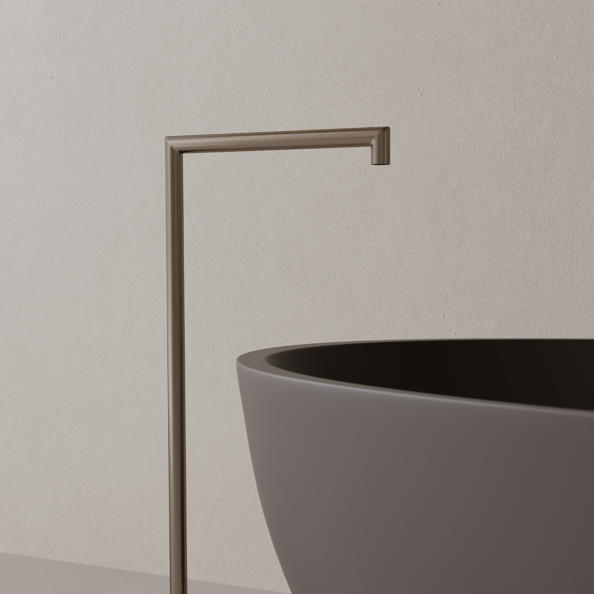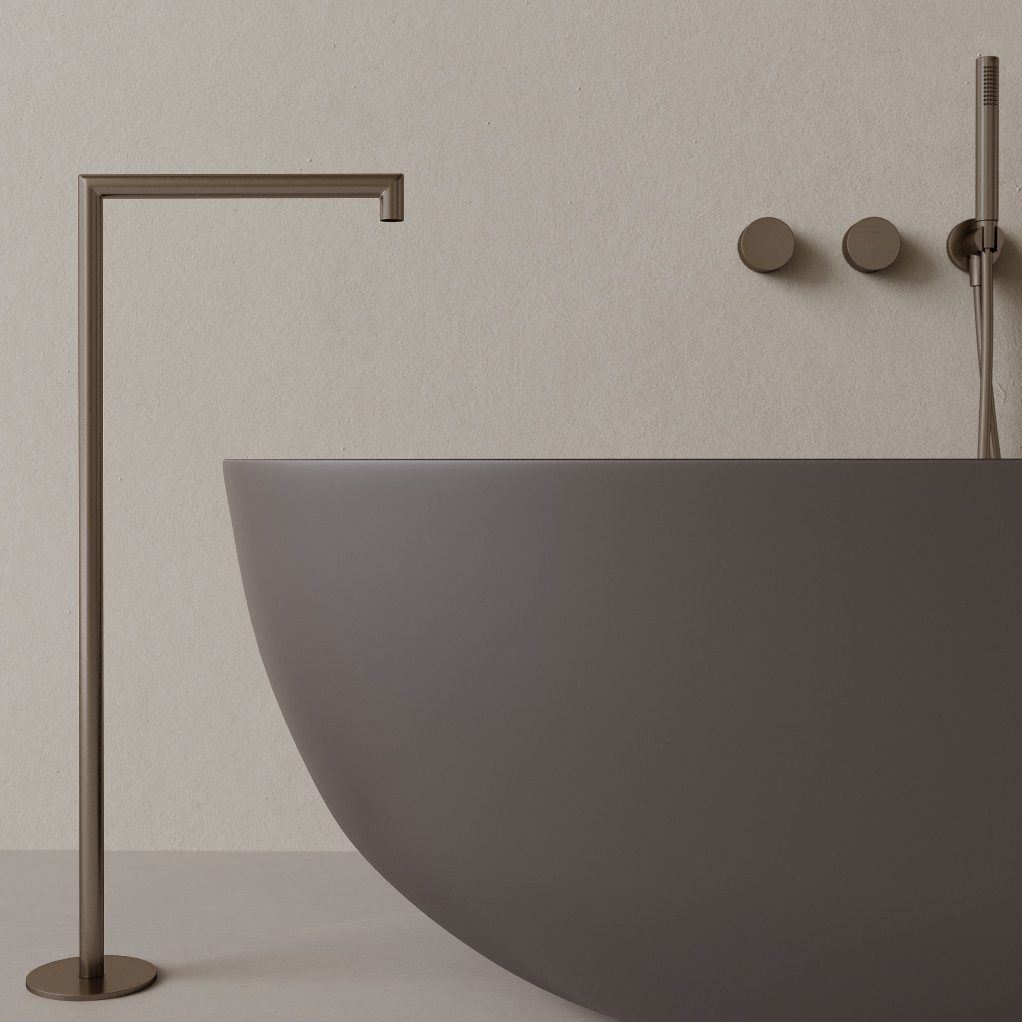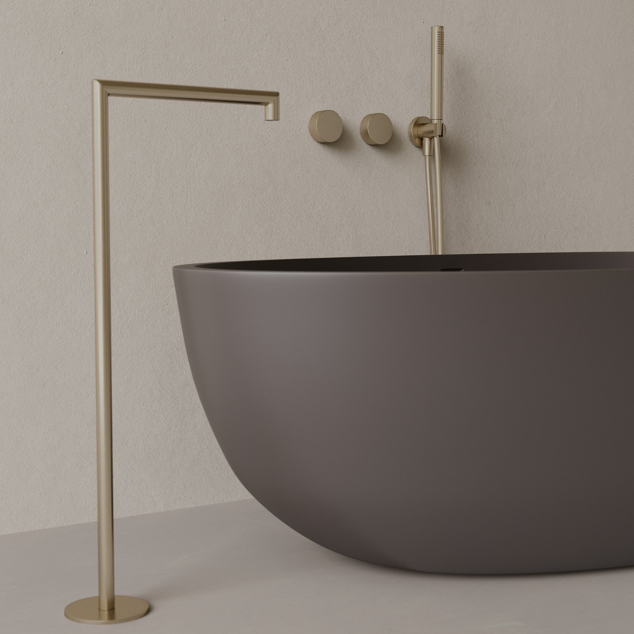 This floor-mounted bathtub filler features a square, architectural silhouette that adds definition and balance to the space. Dual knob controls offer precise water and temperature adjustment, while the integrated handheld enhances everyday functionality. Designed for control and simplicity, it supports an uninterrupted, restorative soak.
