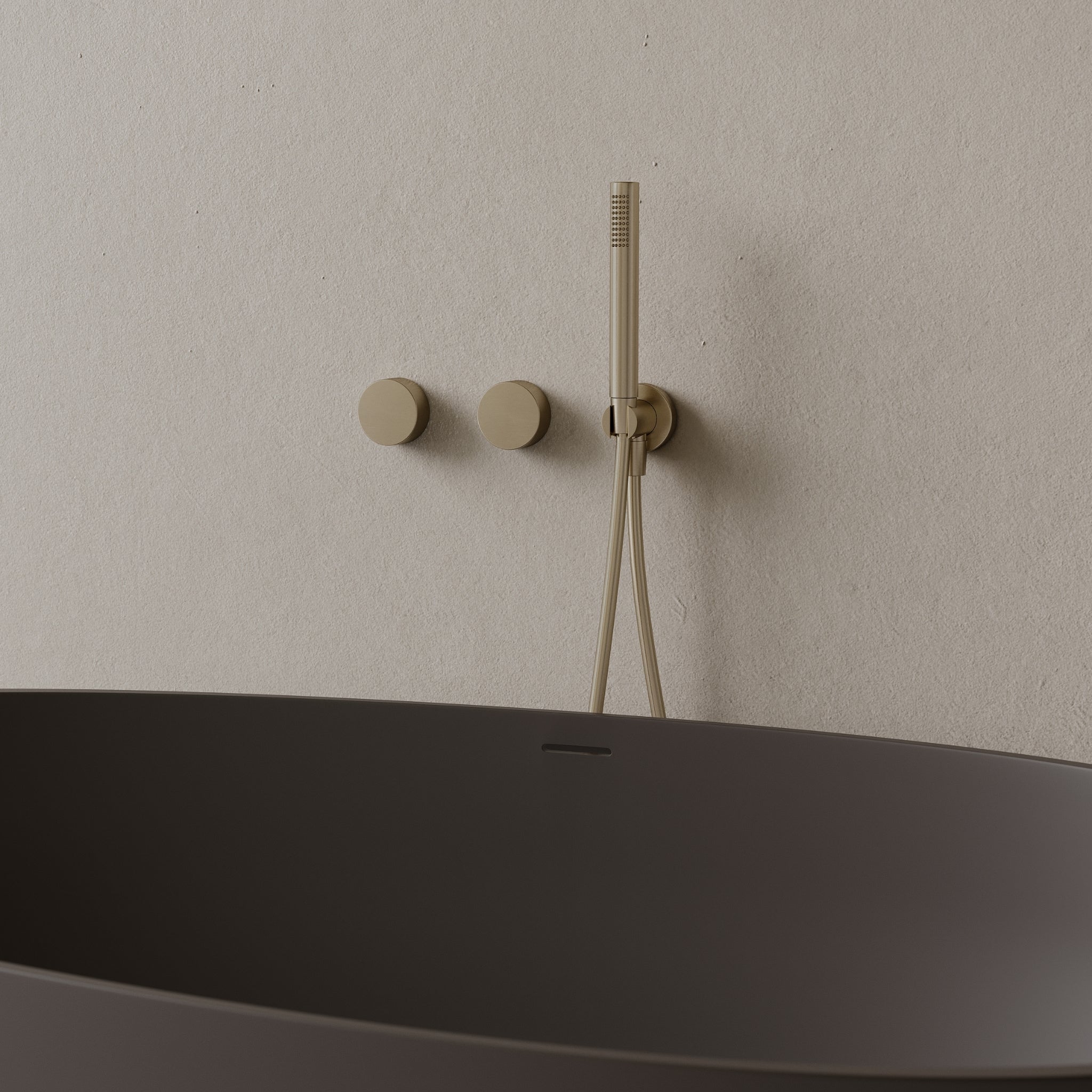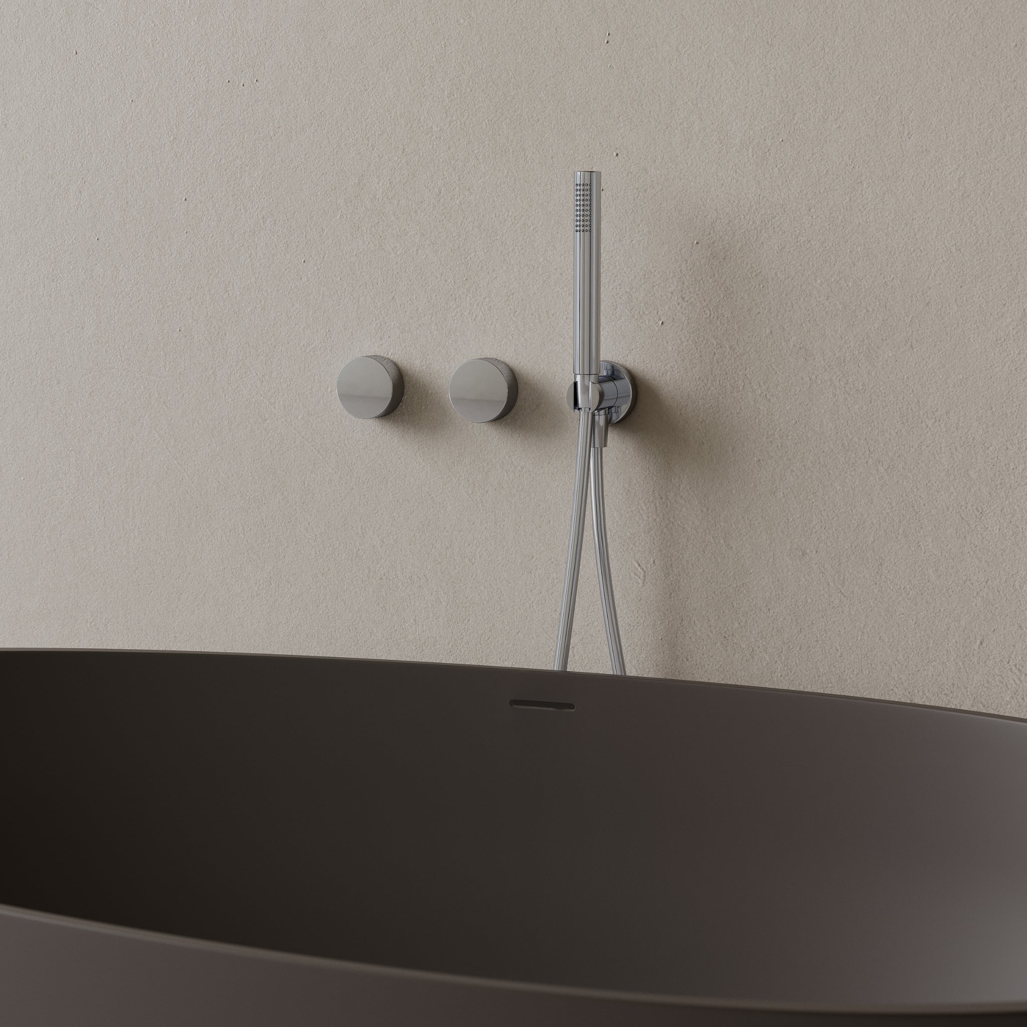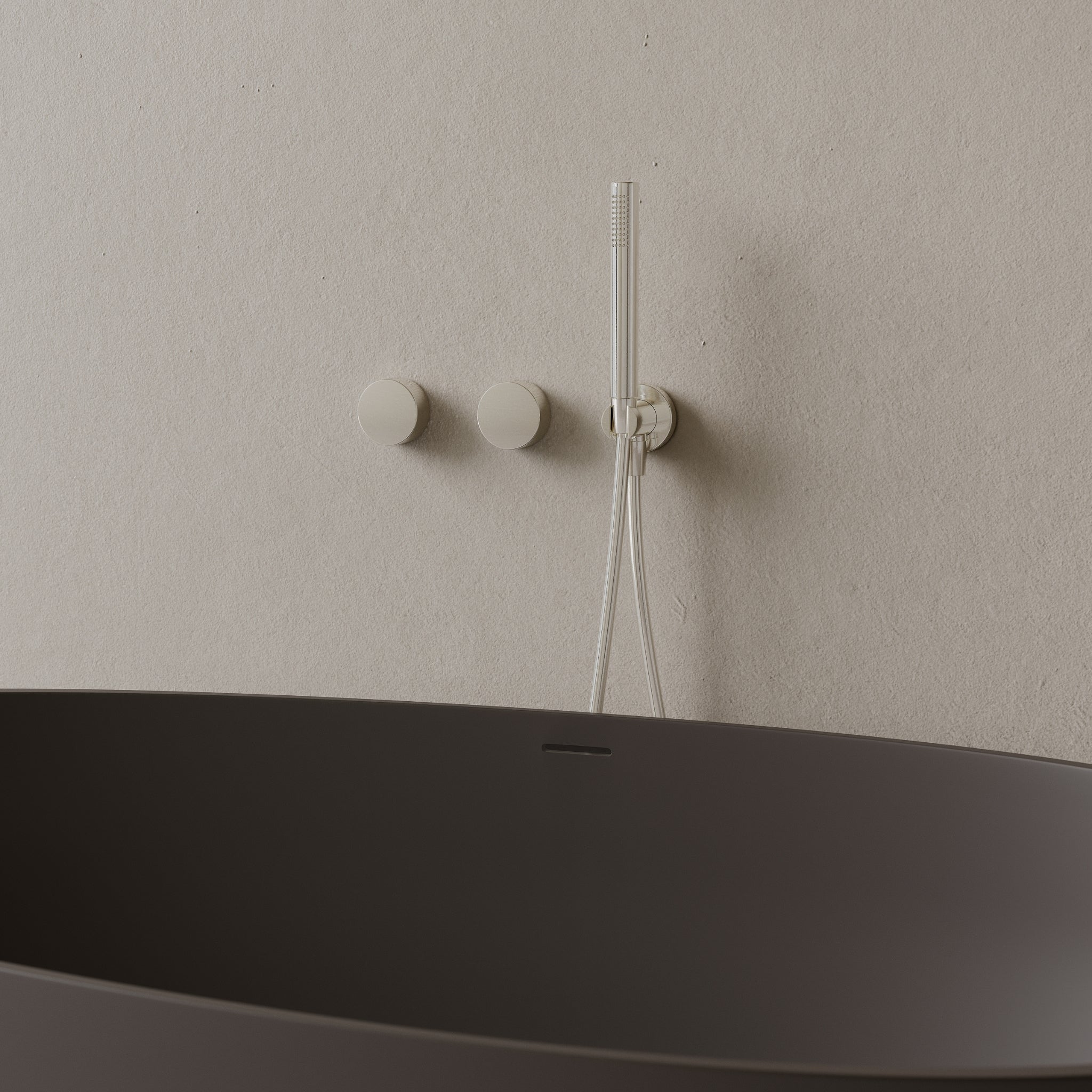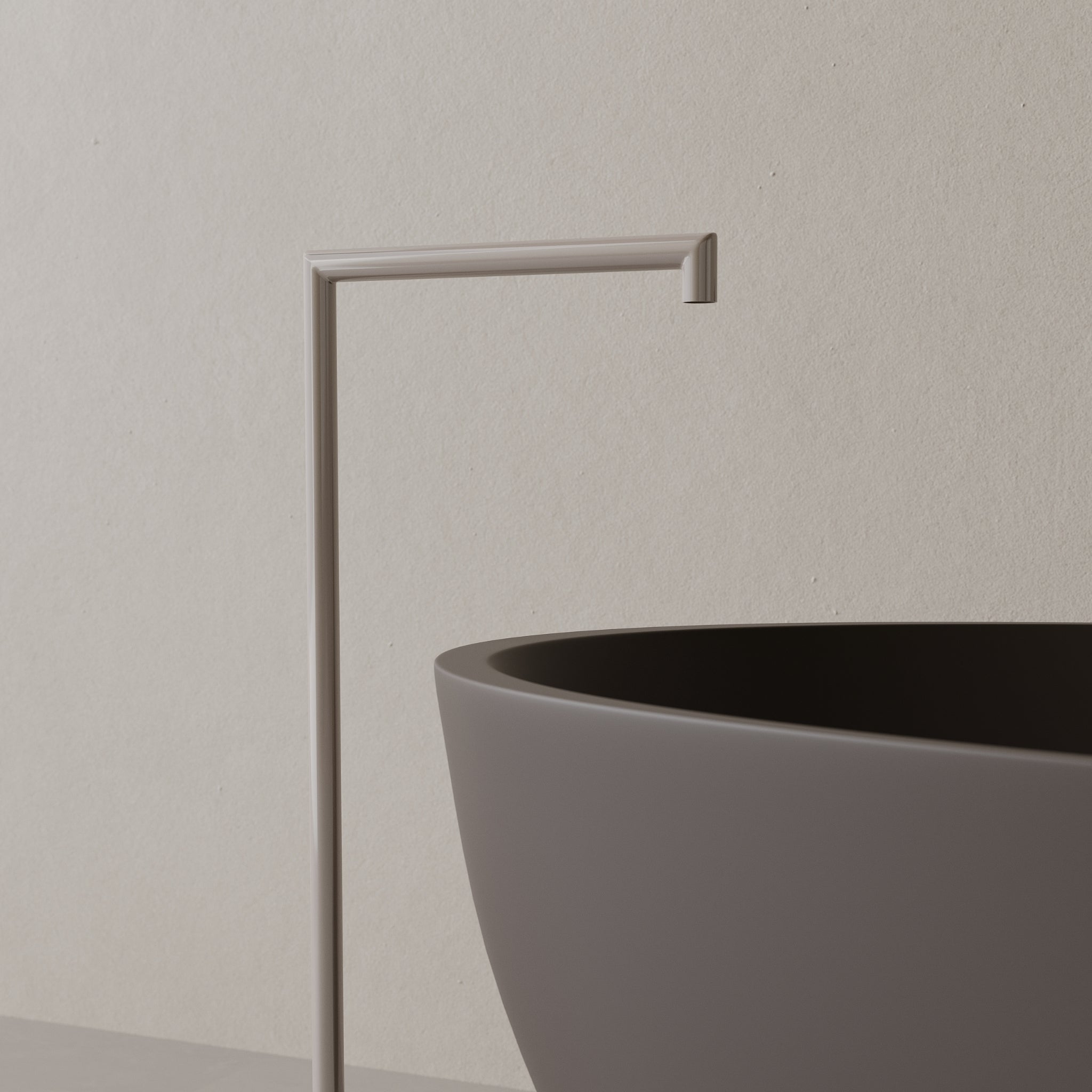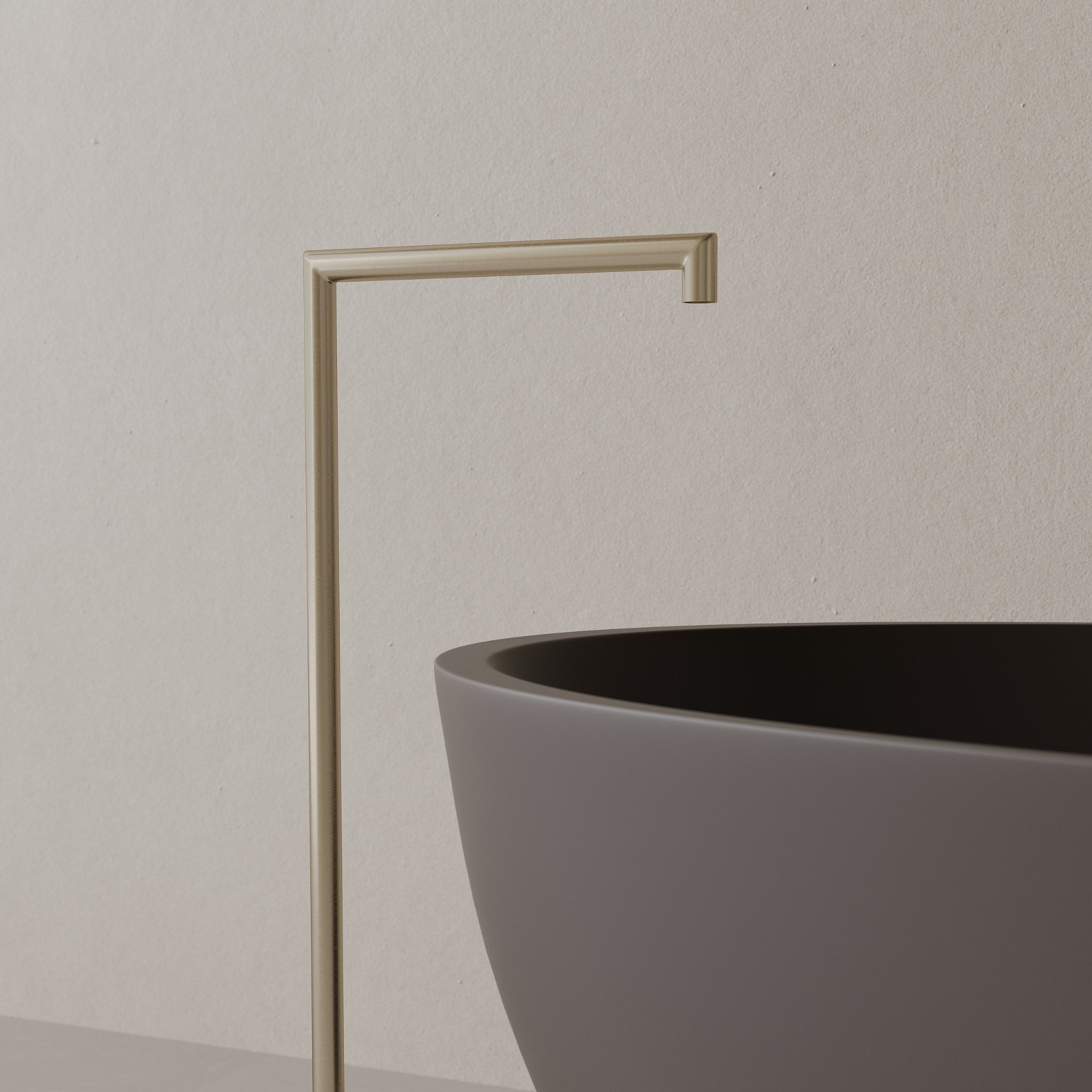 This floor-mounted bathtub filler features a square, architectural silhouette that adds definition and balance to the space. Dual knob controls offer precise water and temperature adjustment, while the integrated handheld enhances everyday functionality. Designed for control and simplicity, it supports an uninterrupted, restorative soak.