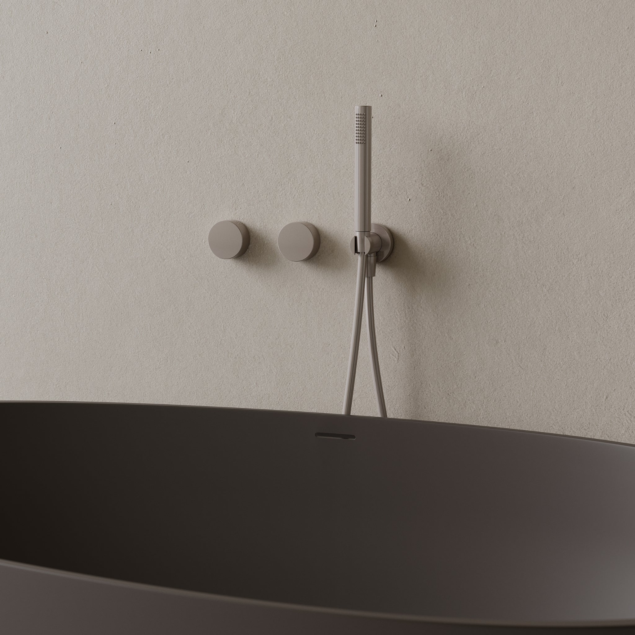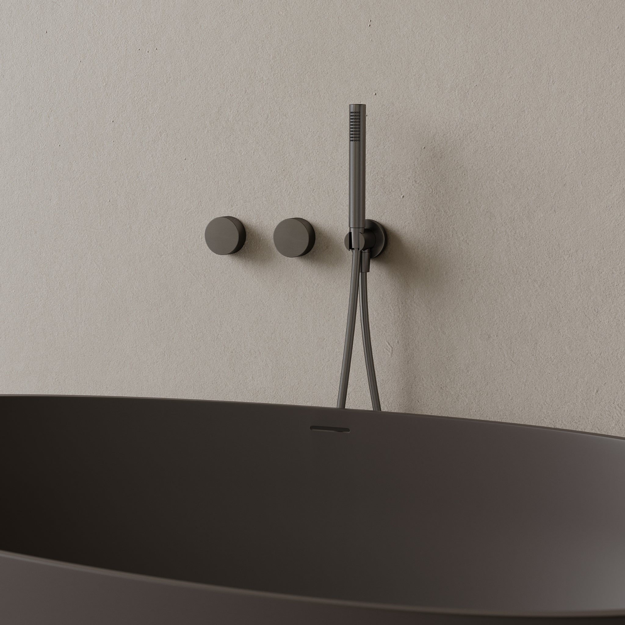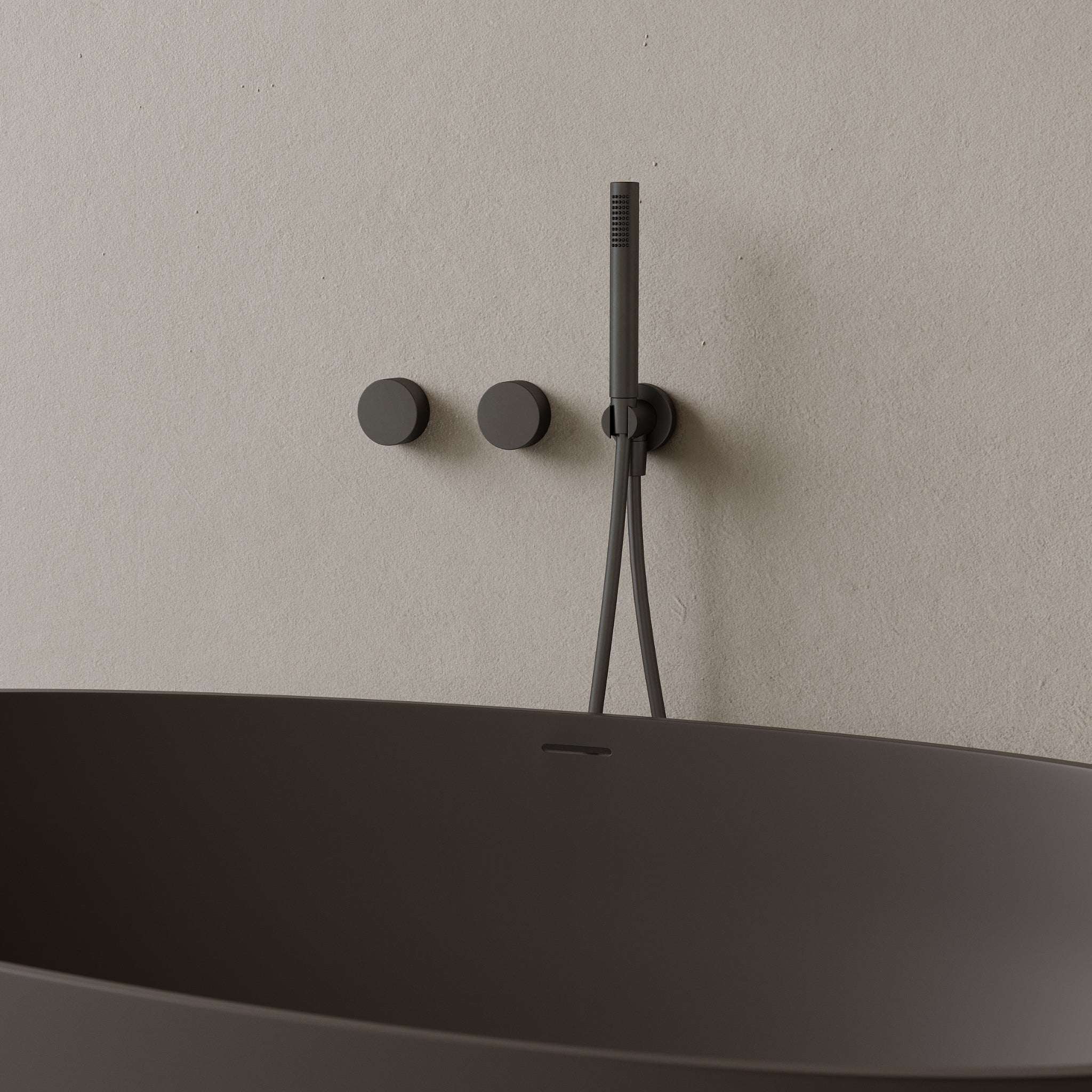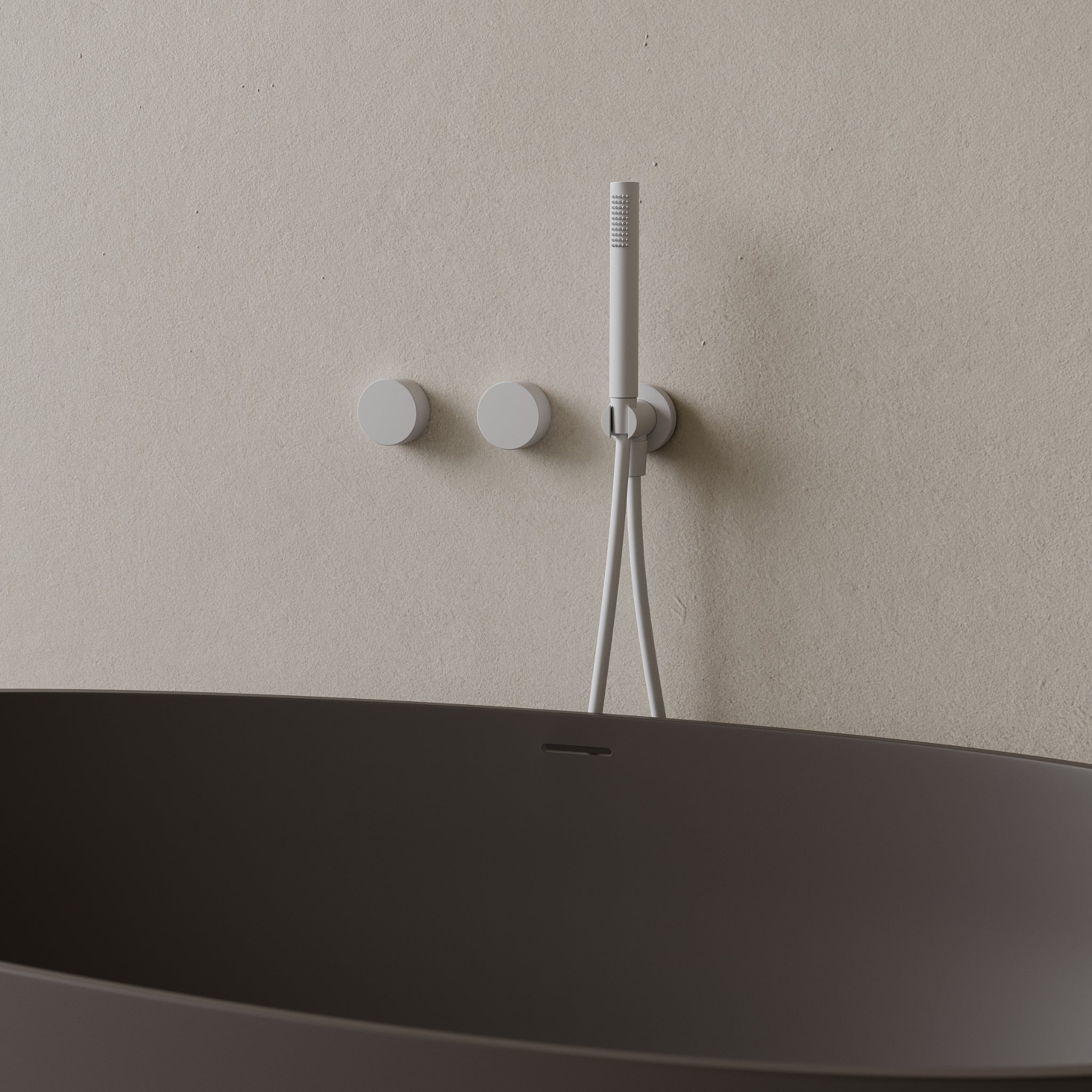 This floor-mounted bathtub filler features a square, architectural silhouette that adds definition and balance to the space. Dual knob controls offer precise water and temperature adjustment, while the integrated handheld enhances everyday functionality. Designed for control and simplicity, it supports an uninterrupted, restorative soak.