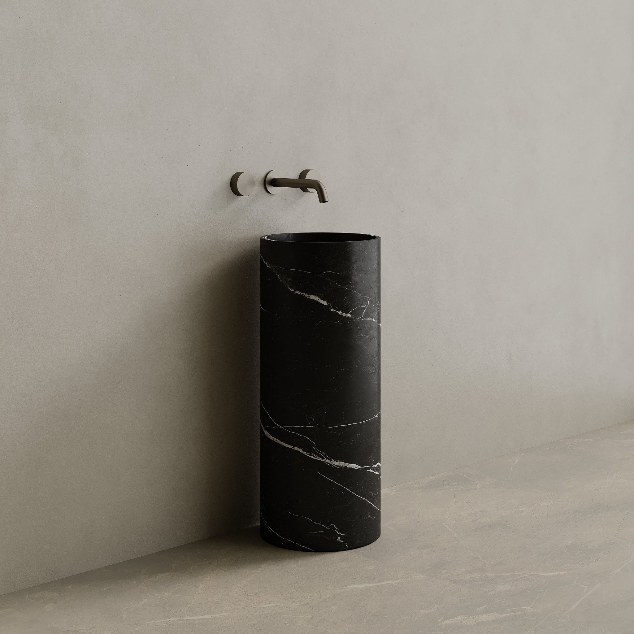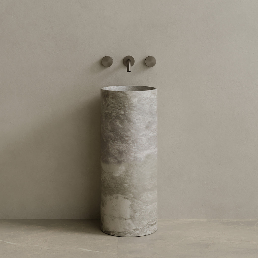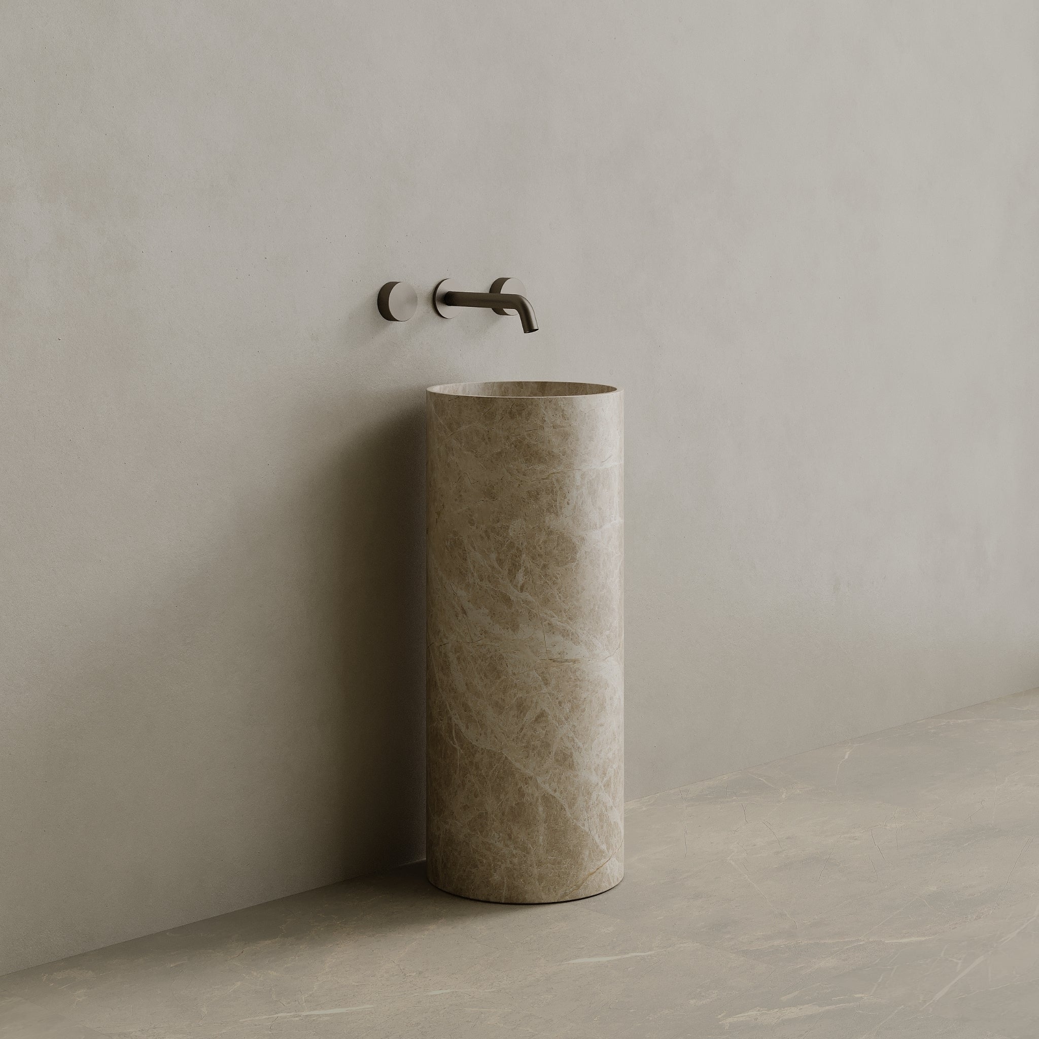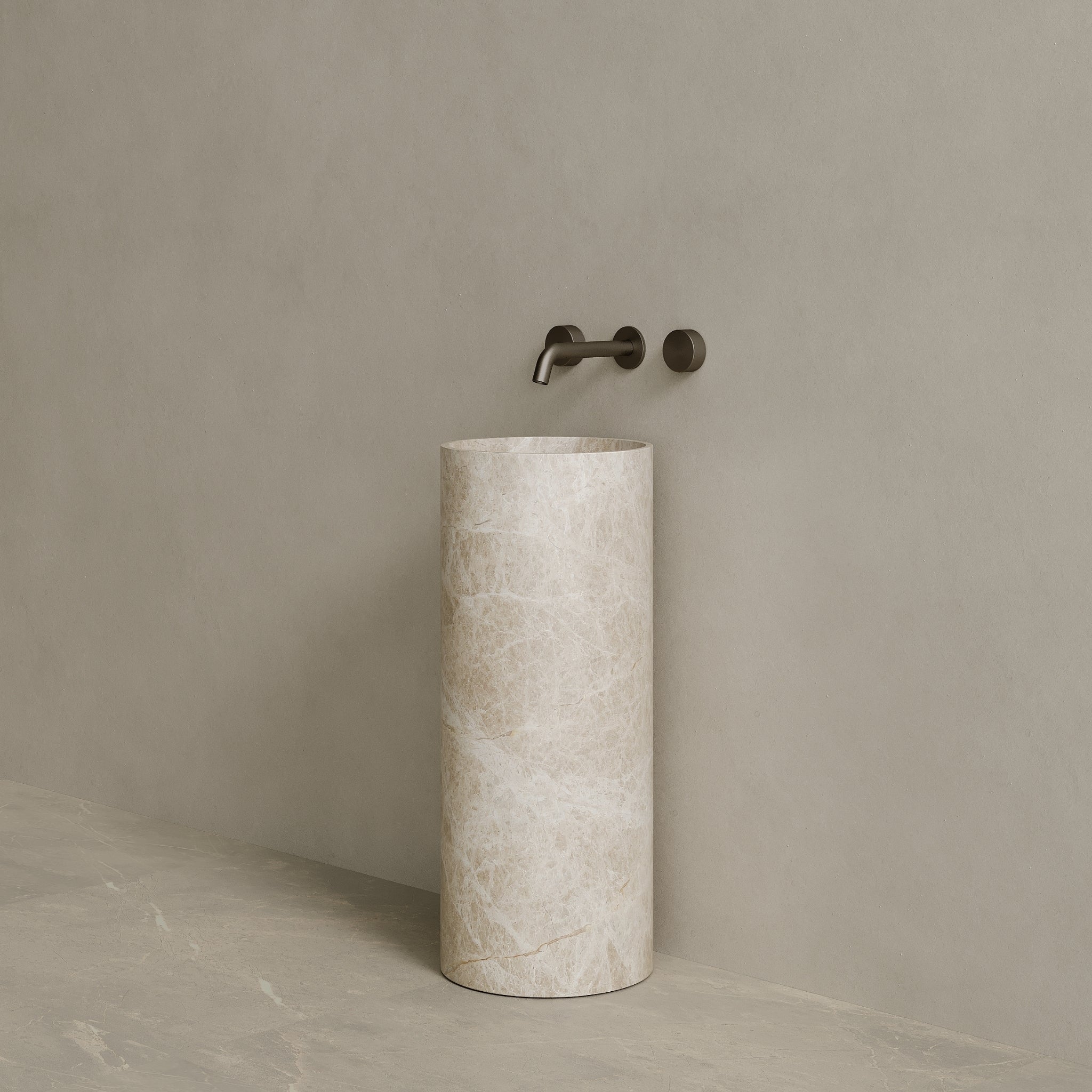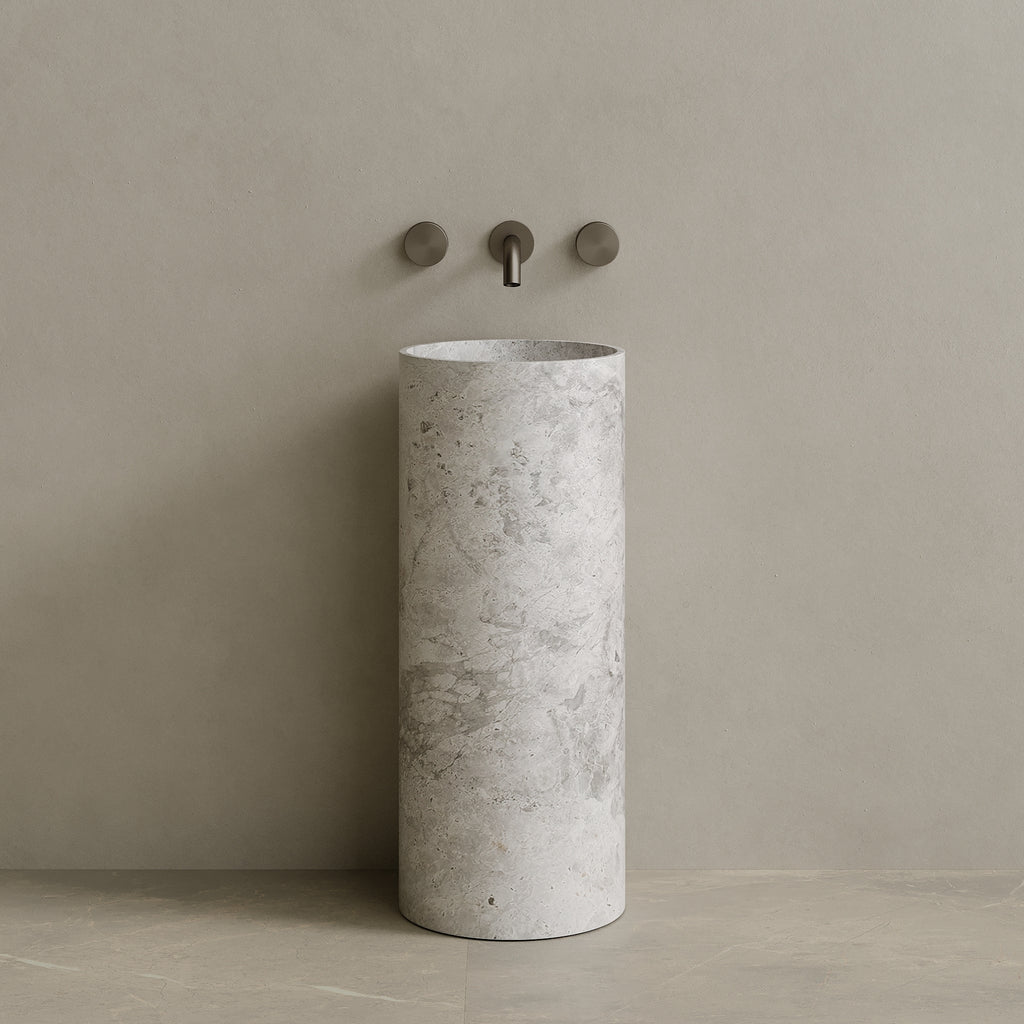 The Colva Freestanding Pedestal Sink introduces a refined sculptural silhouette with its slim, rounded form and minimalist profile. Hand-carved from natural stone, this monolithic sink offers a fluid presence and smooth surface, making it an understated yet impactful addition to any contemporary bath space.