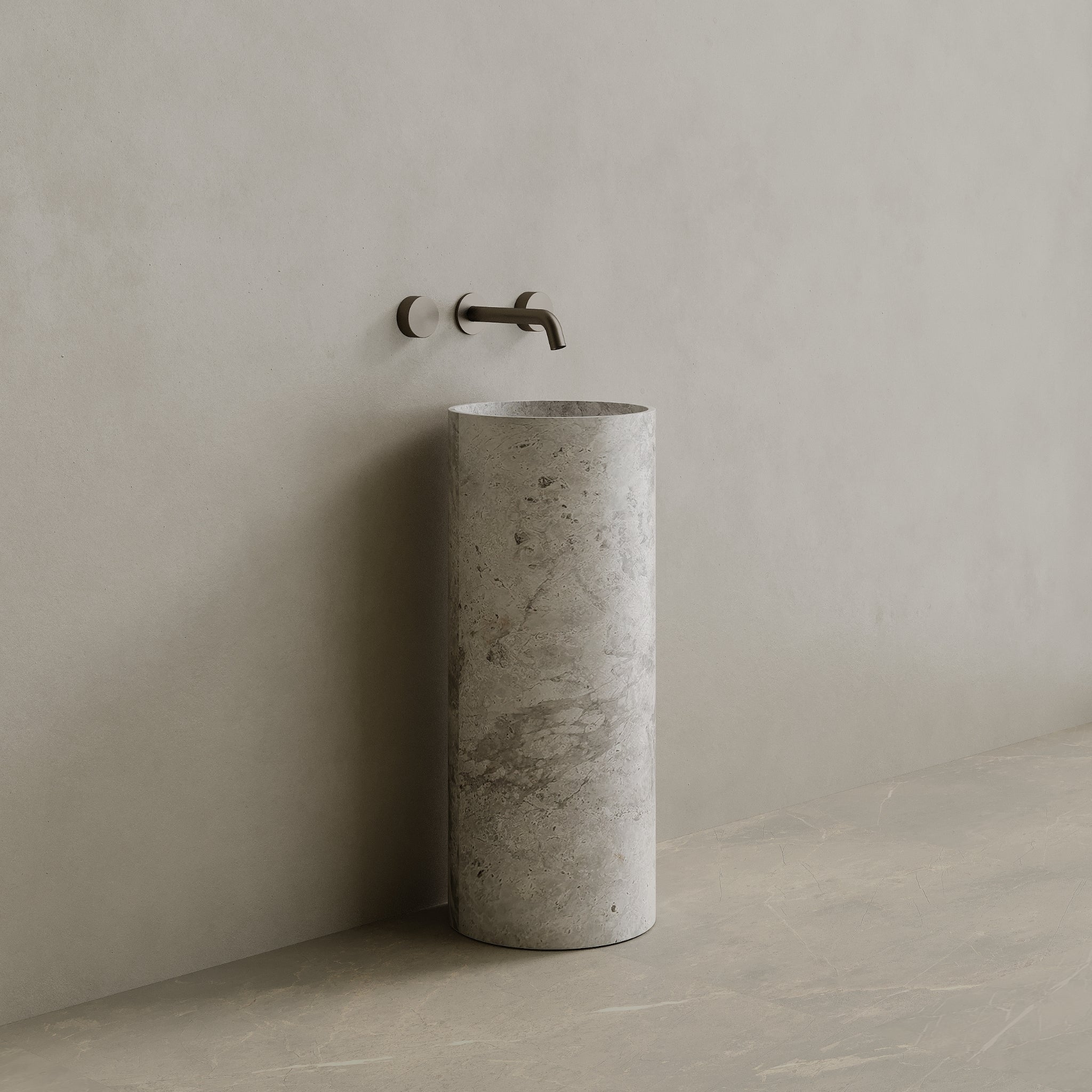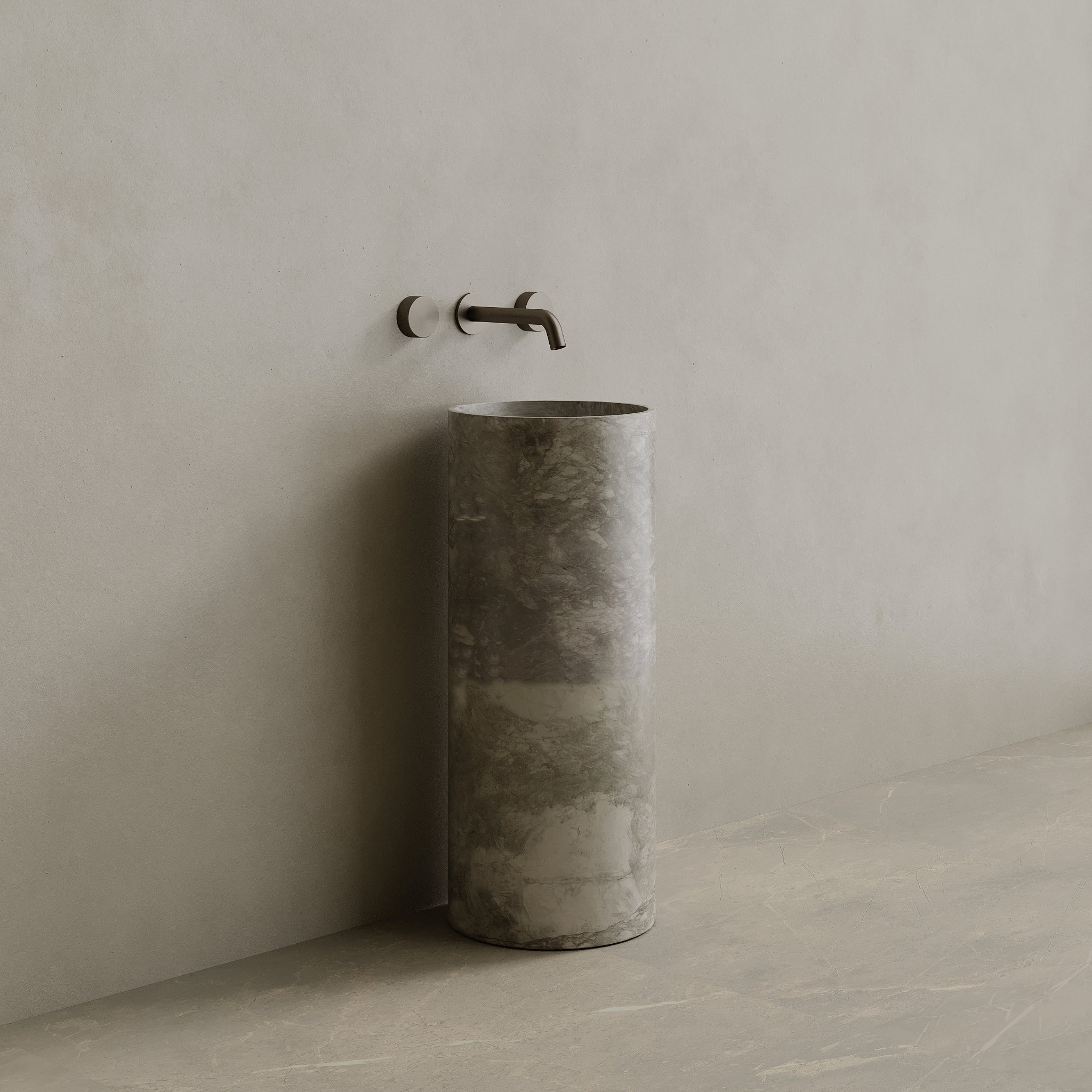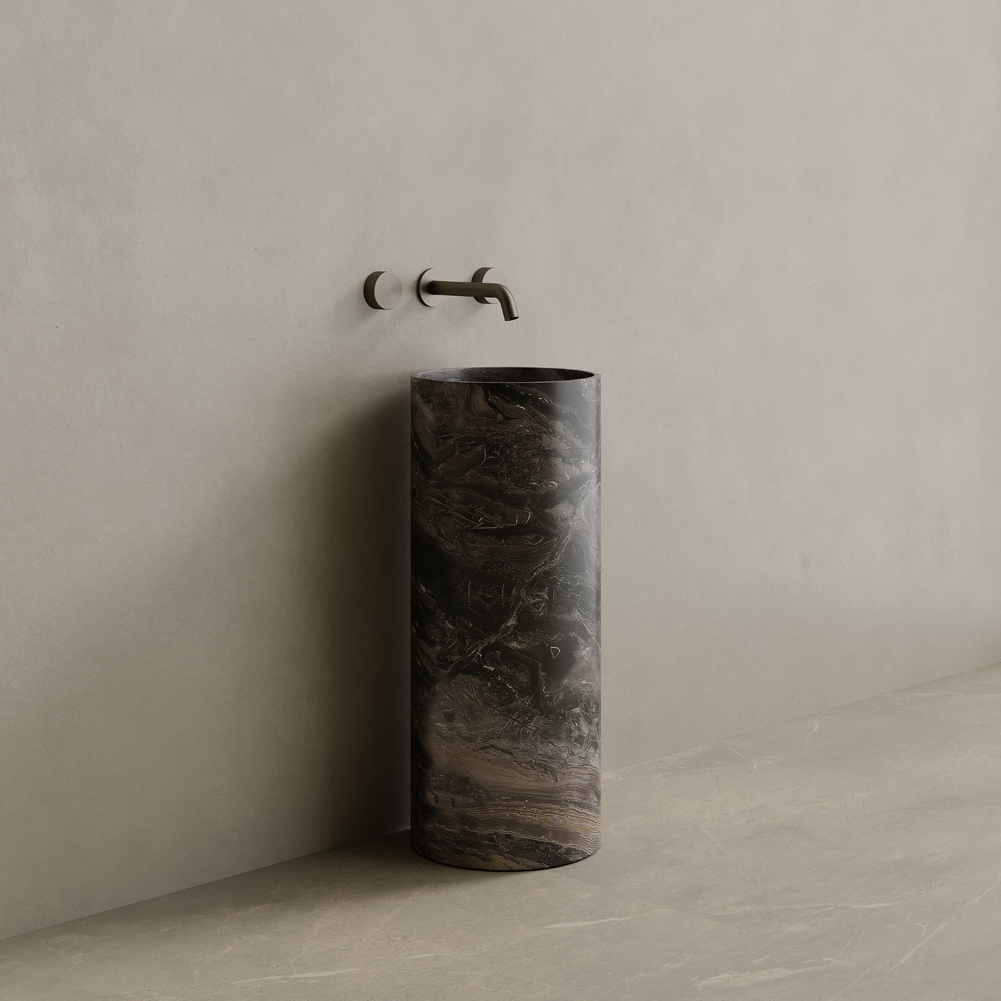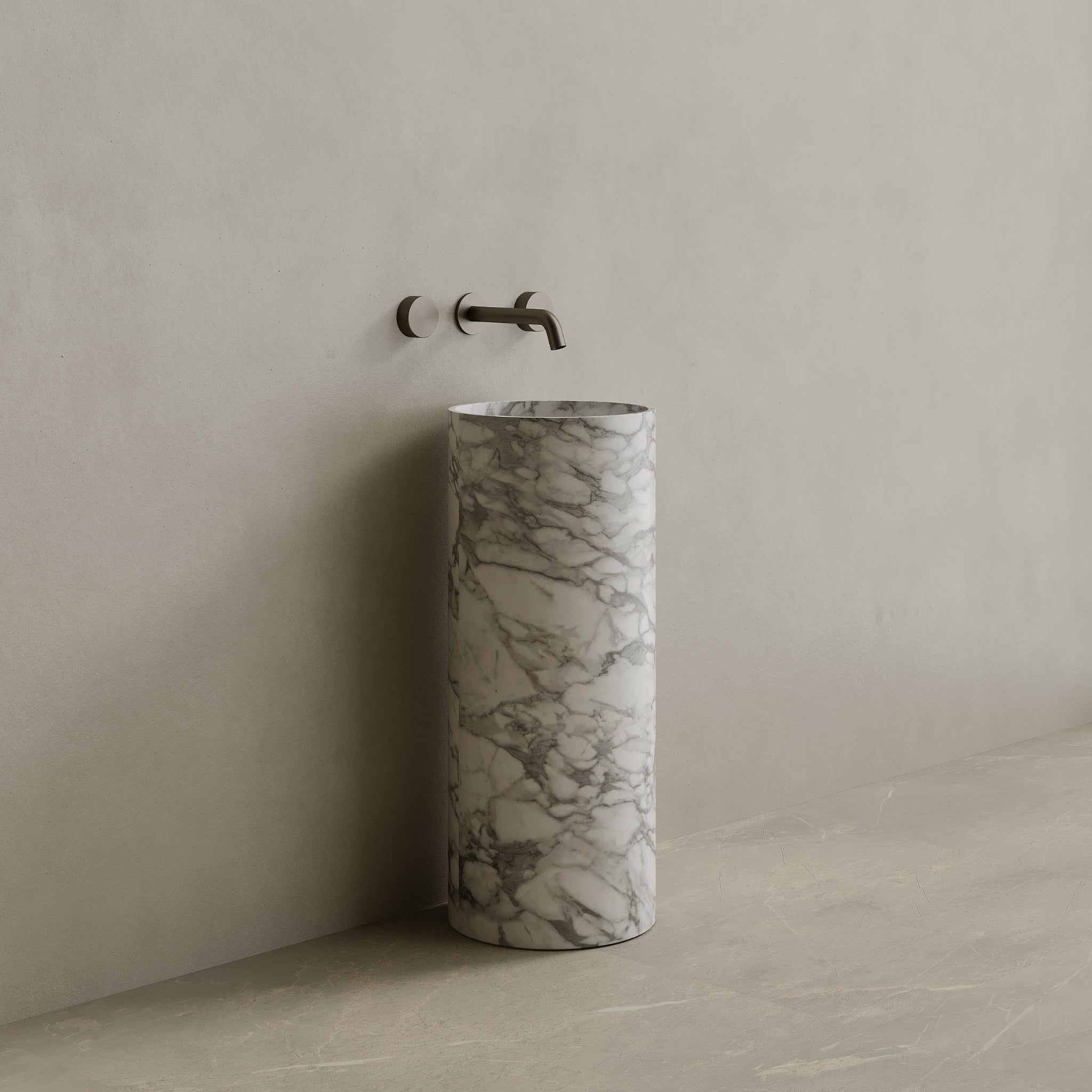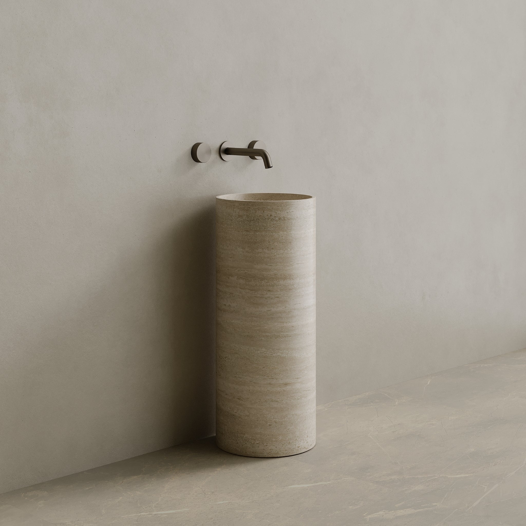 The Colva Freestanding Pedestal Sink introduces a refined sculptural silhouette with its slim, rounded form and minimalist profile. Hand-carved from natural stone, this monolithic sink offers a fluid presence and smooth surface, making it an understated yet impactful addition to any contemporary bath space.