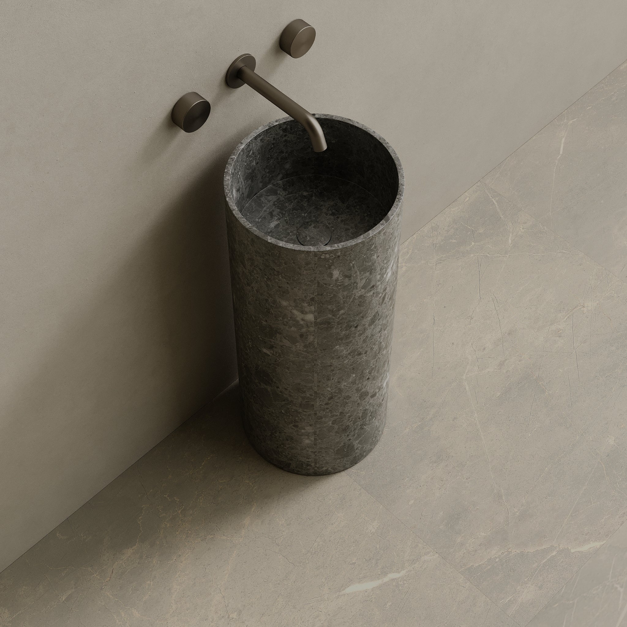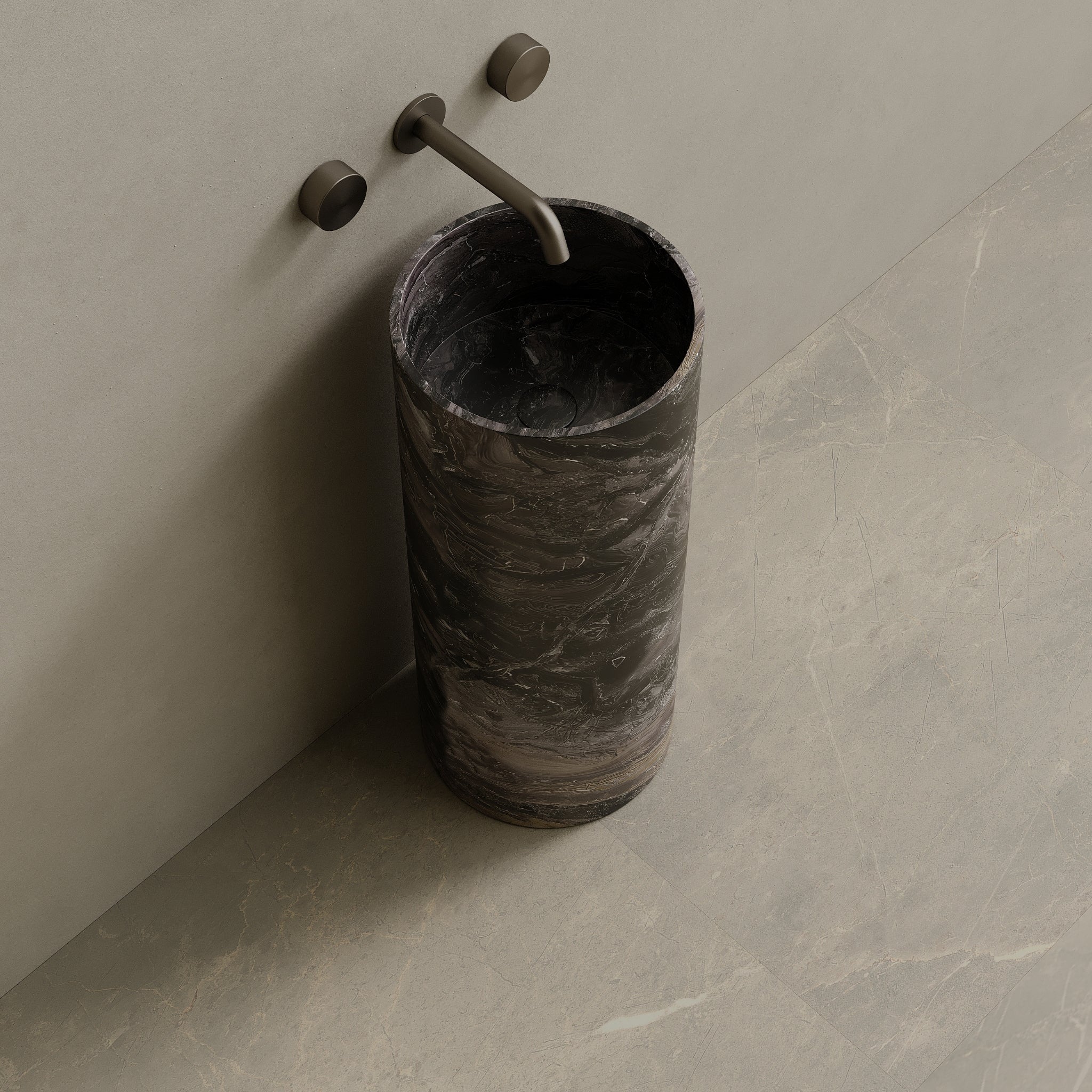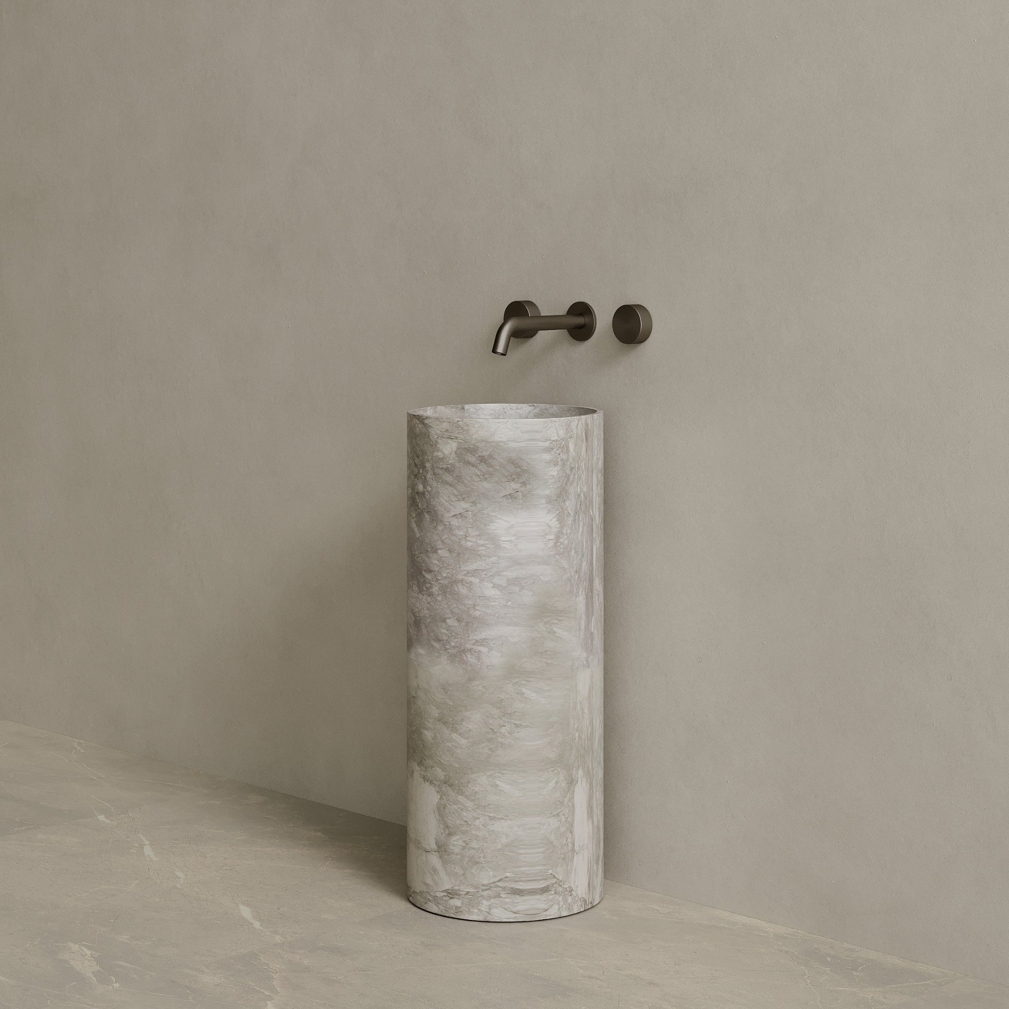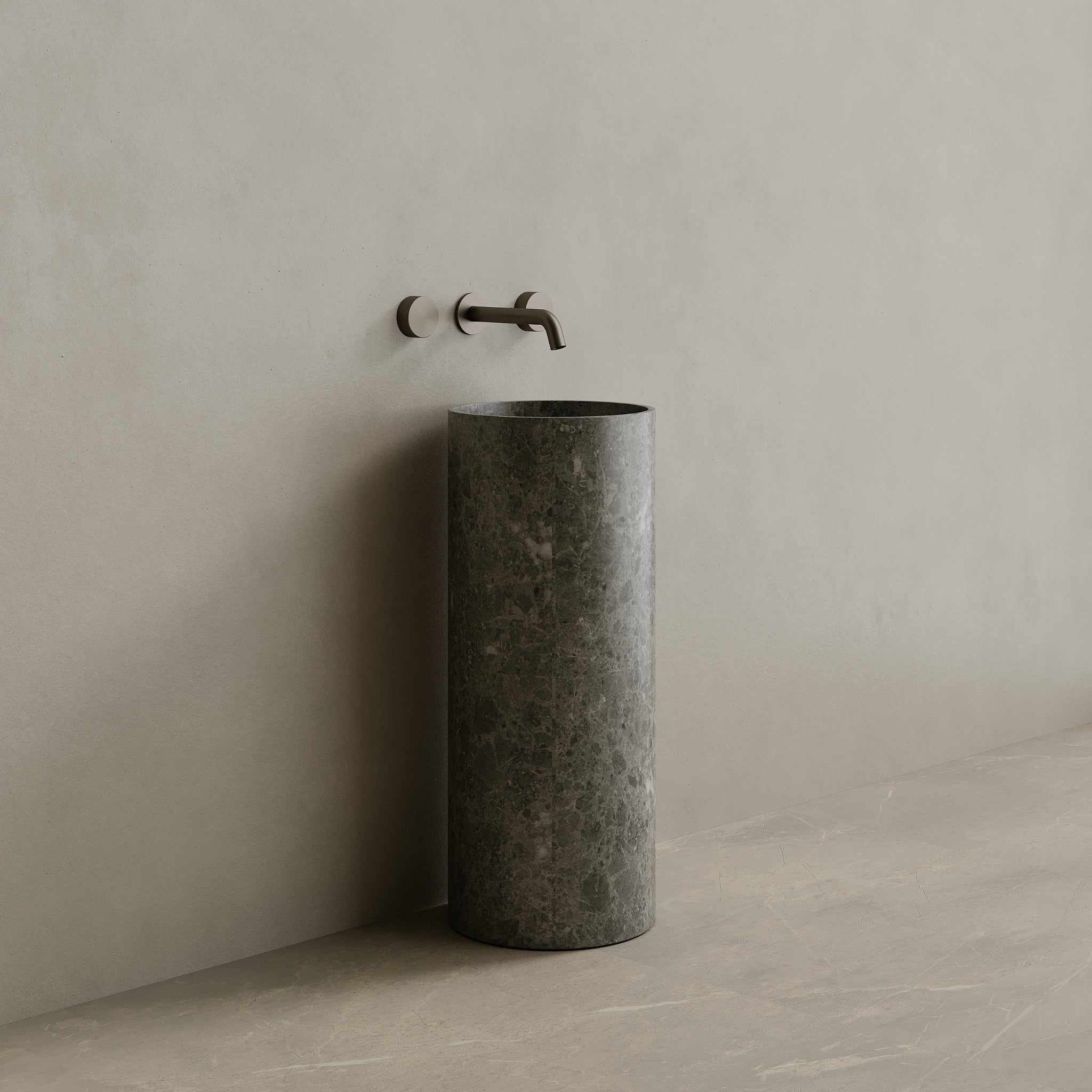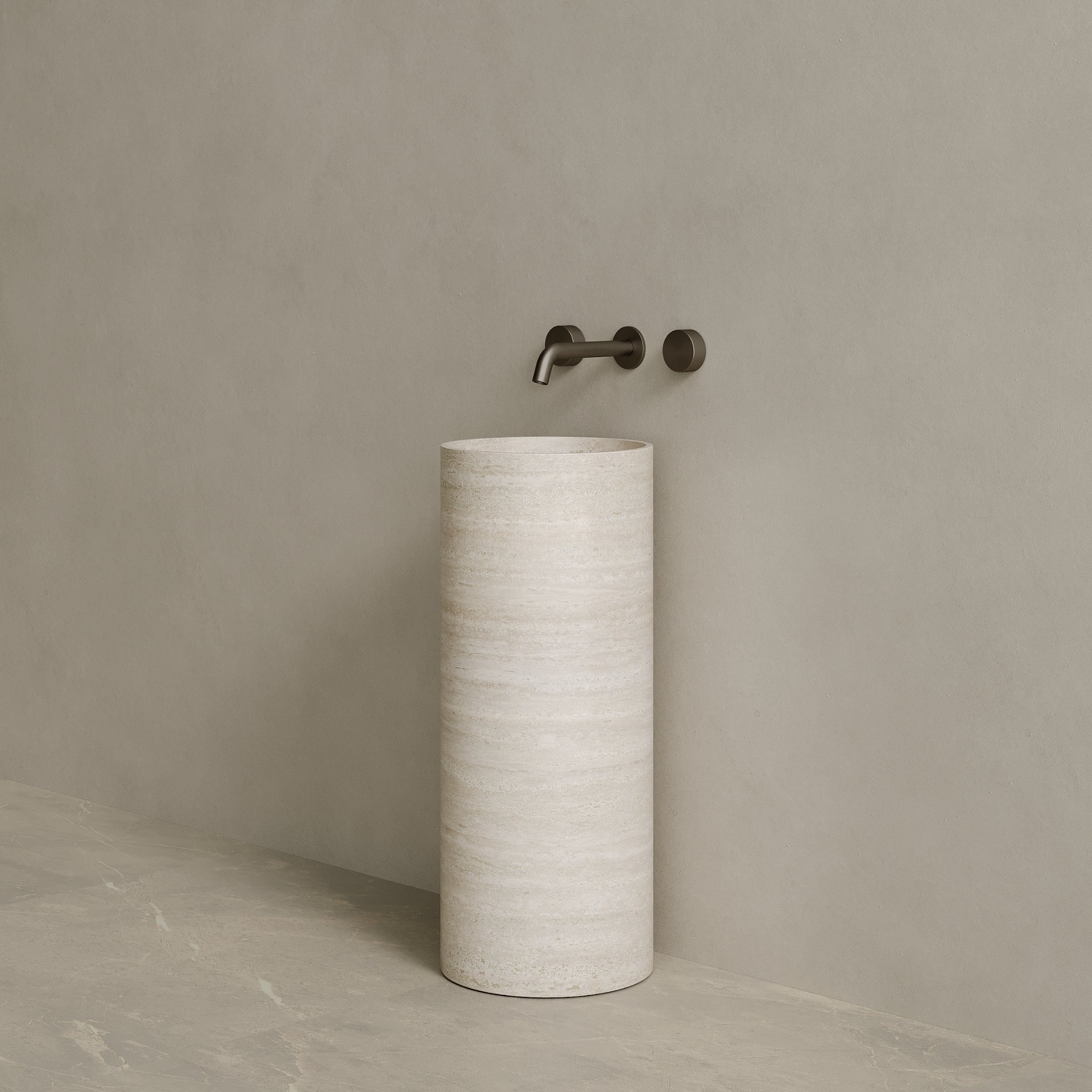 The Colva Freestanding Pedestal Sink introduces a refined sculptural silhouette with its slim, rounded form and minimalist profile. Hand-carved from natural stone, this monolithic sink offers a fluid presence and smooth surface, making it an understated yet impactful addition to any contemporary bath space.