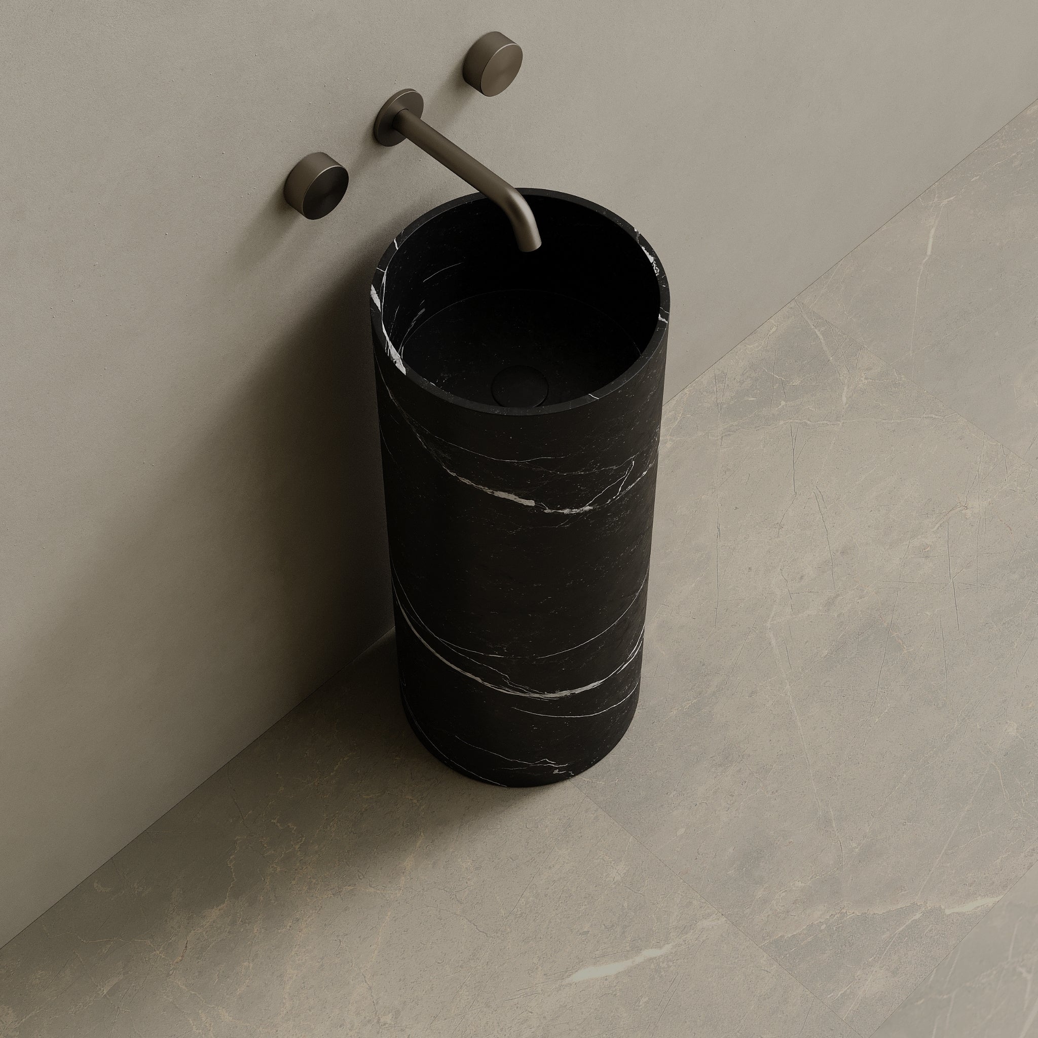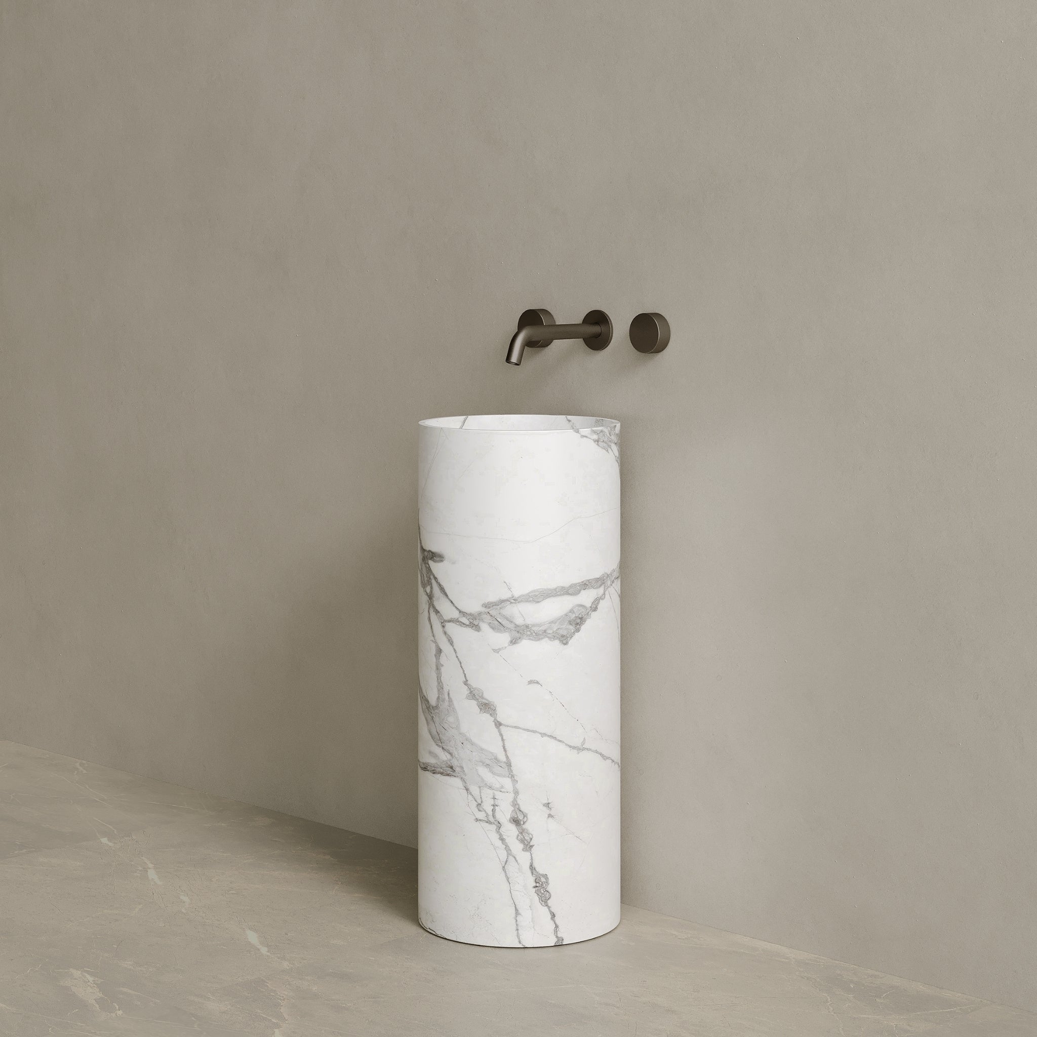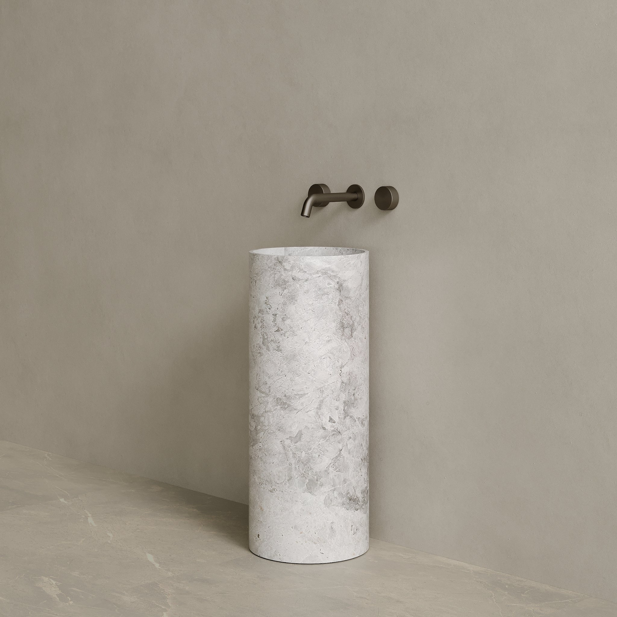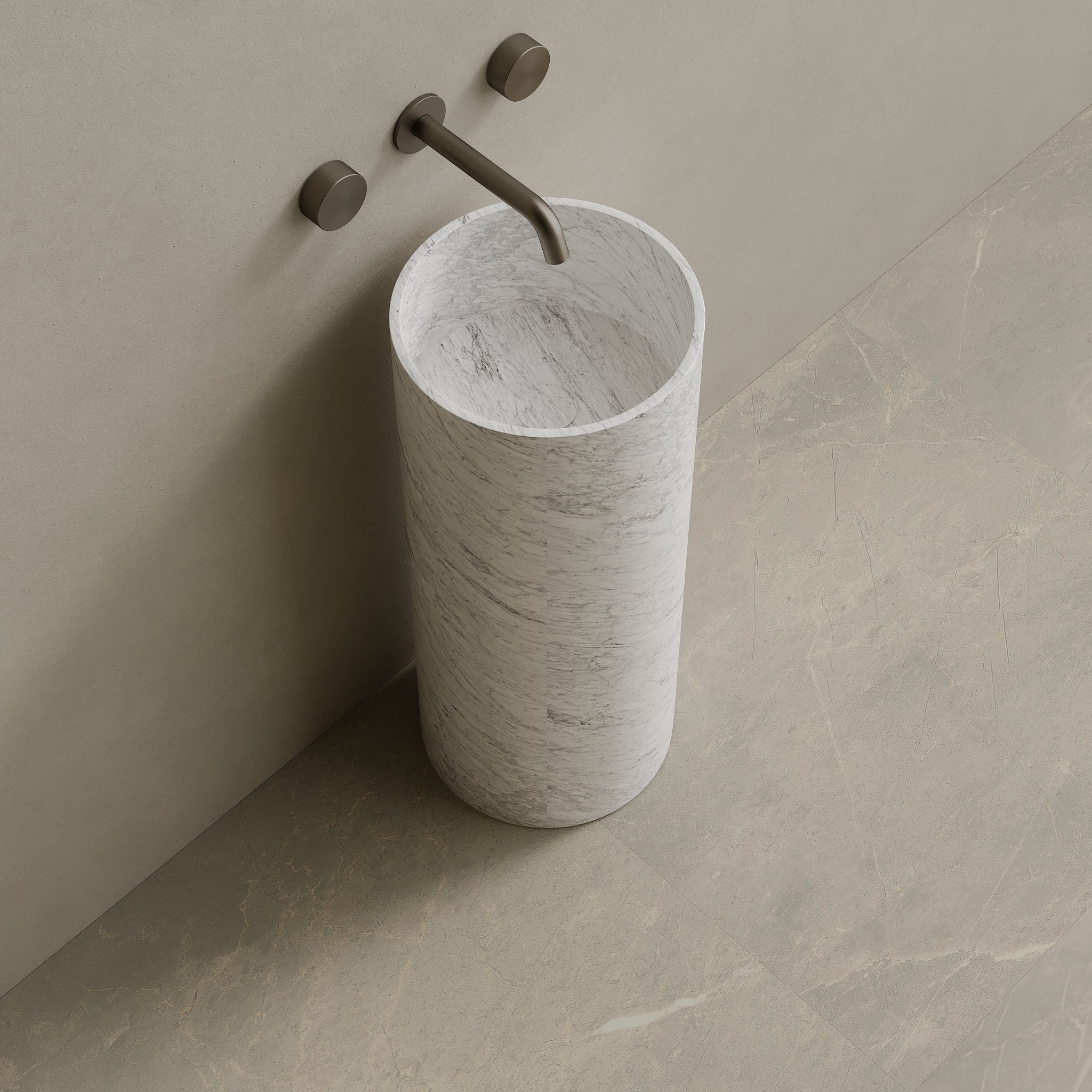 The Colva Freestanding Pedestal Sink introduces a refined sculptural silhouette with its slim, rounded form and minimalist profile. Hand-carved from natural stone, this monolithic sink offers a fluid presence and smooth surface, making it an understated yet impactful addition to any contemporary bath space.