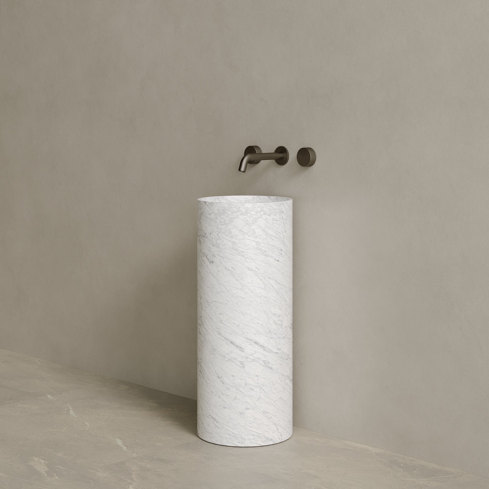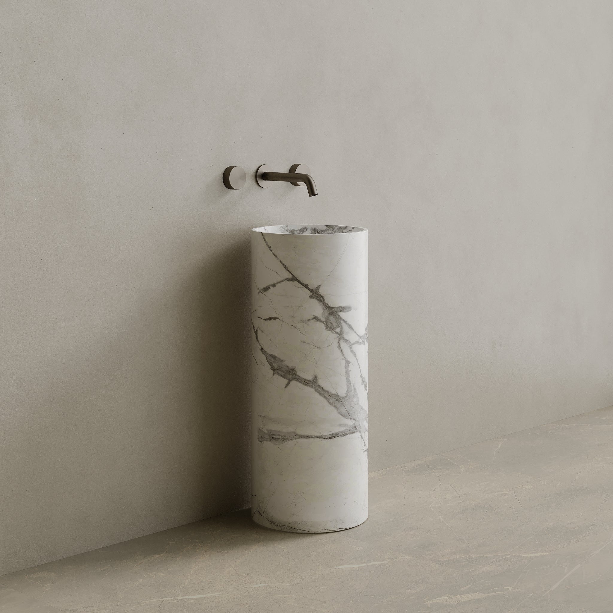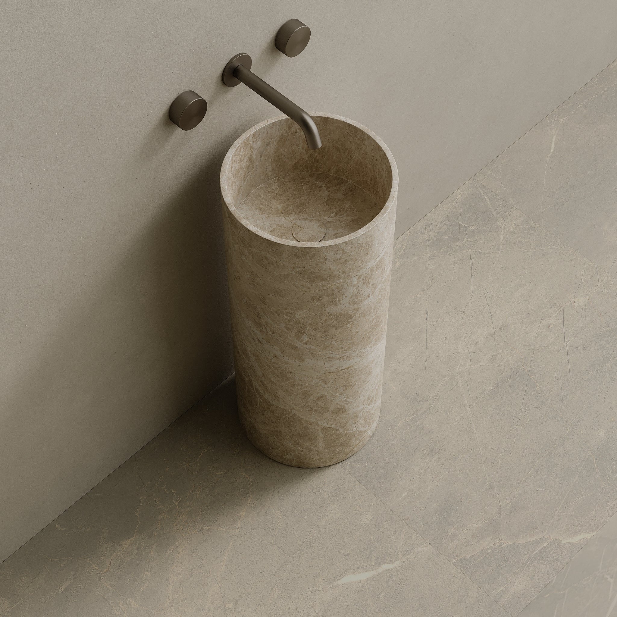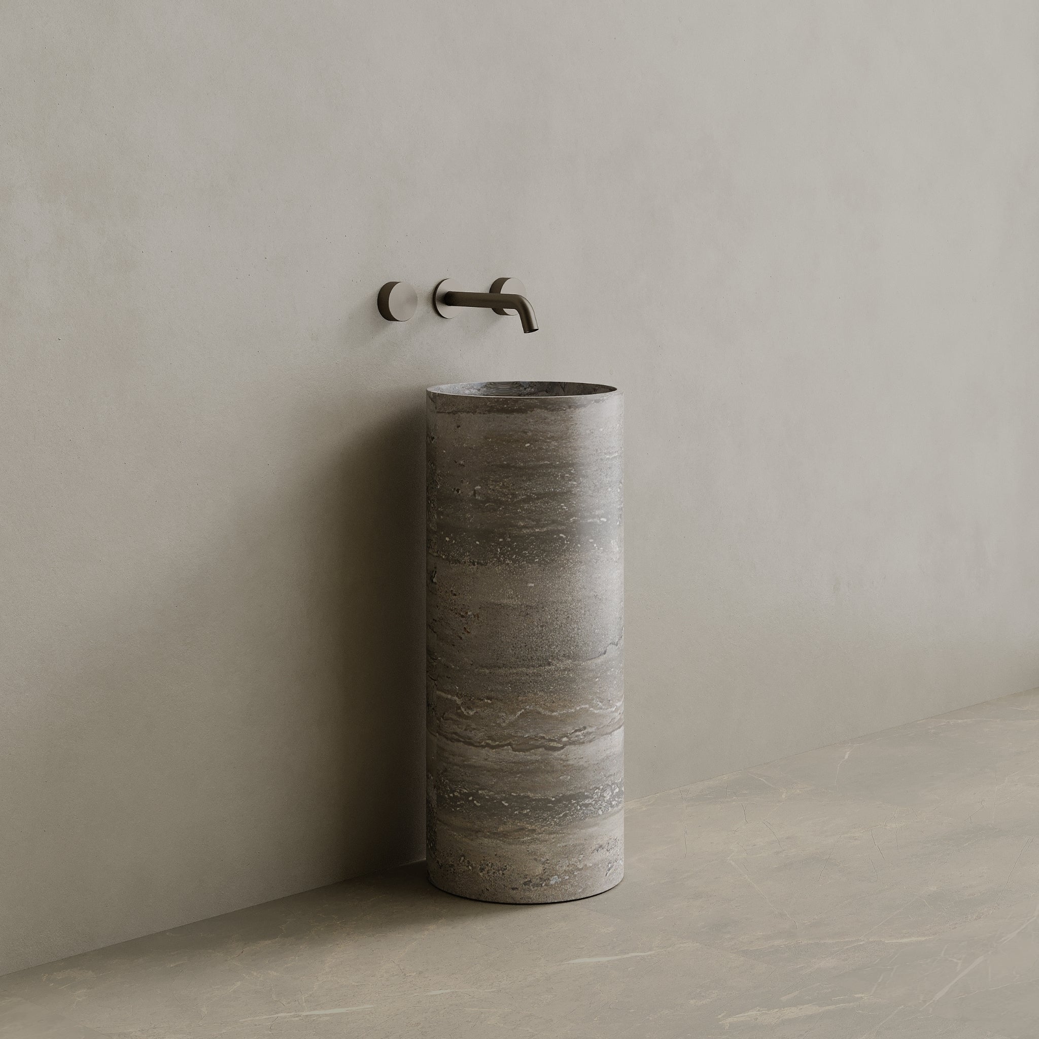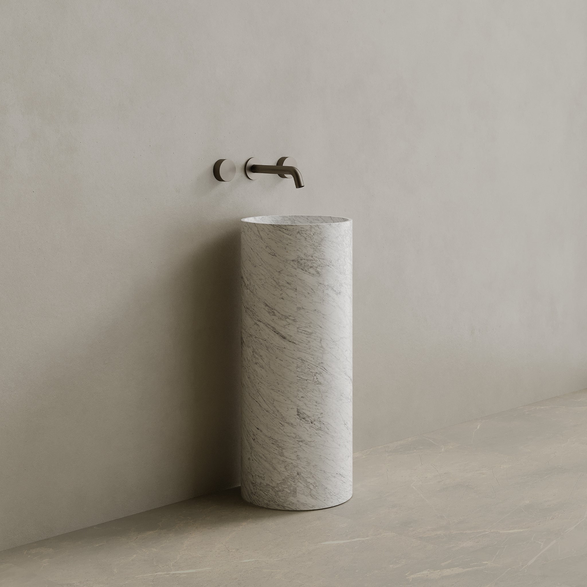 The Colva Freestanding Pedestal Sink introduces a refined sculptural silhouette with its slim, rounded form and minimalist profile. Hand-carved from natural stone, this monolithic sink offers a fluid presence and smooth surface, making it an understated yet impactful addition to any contemporary bath space.