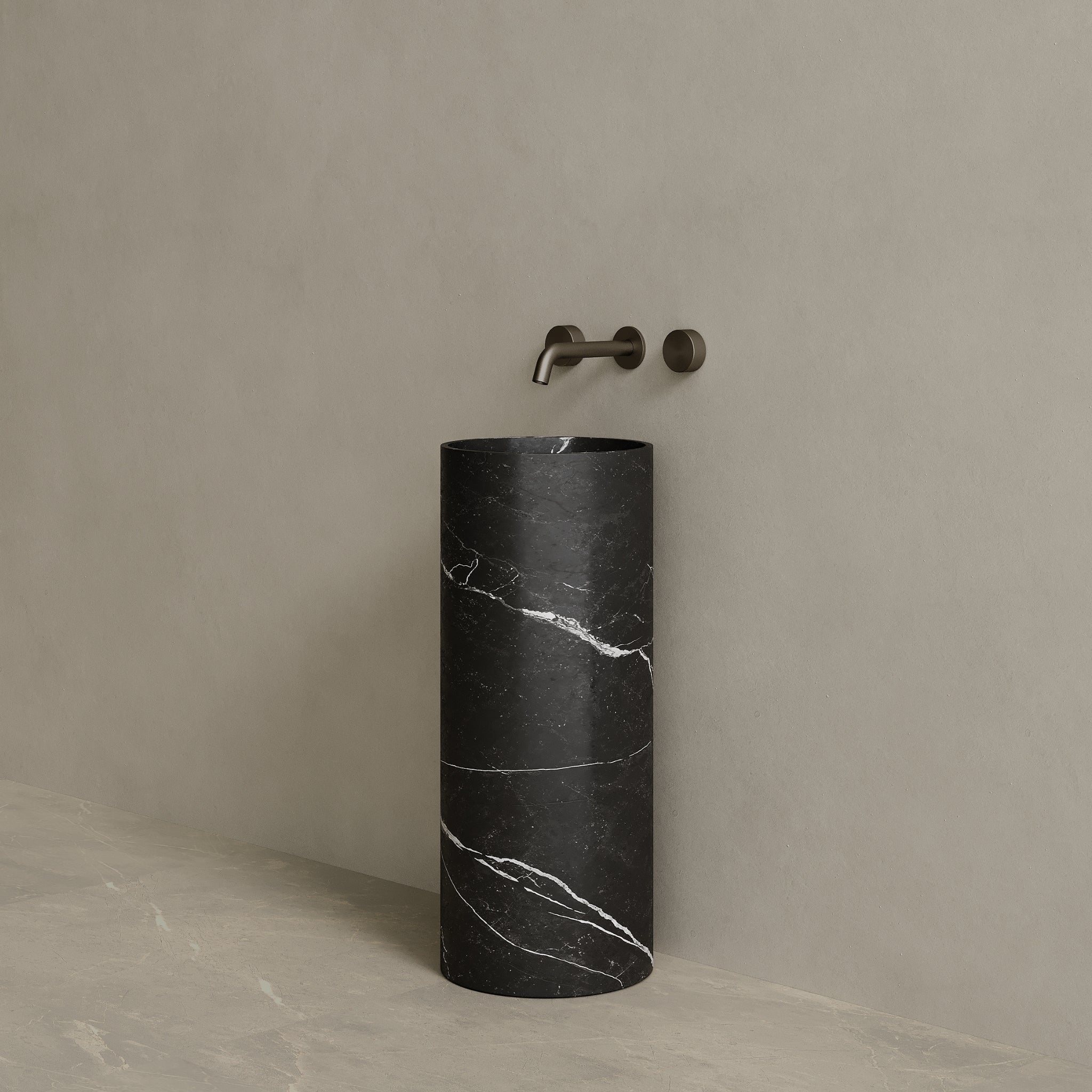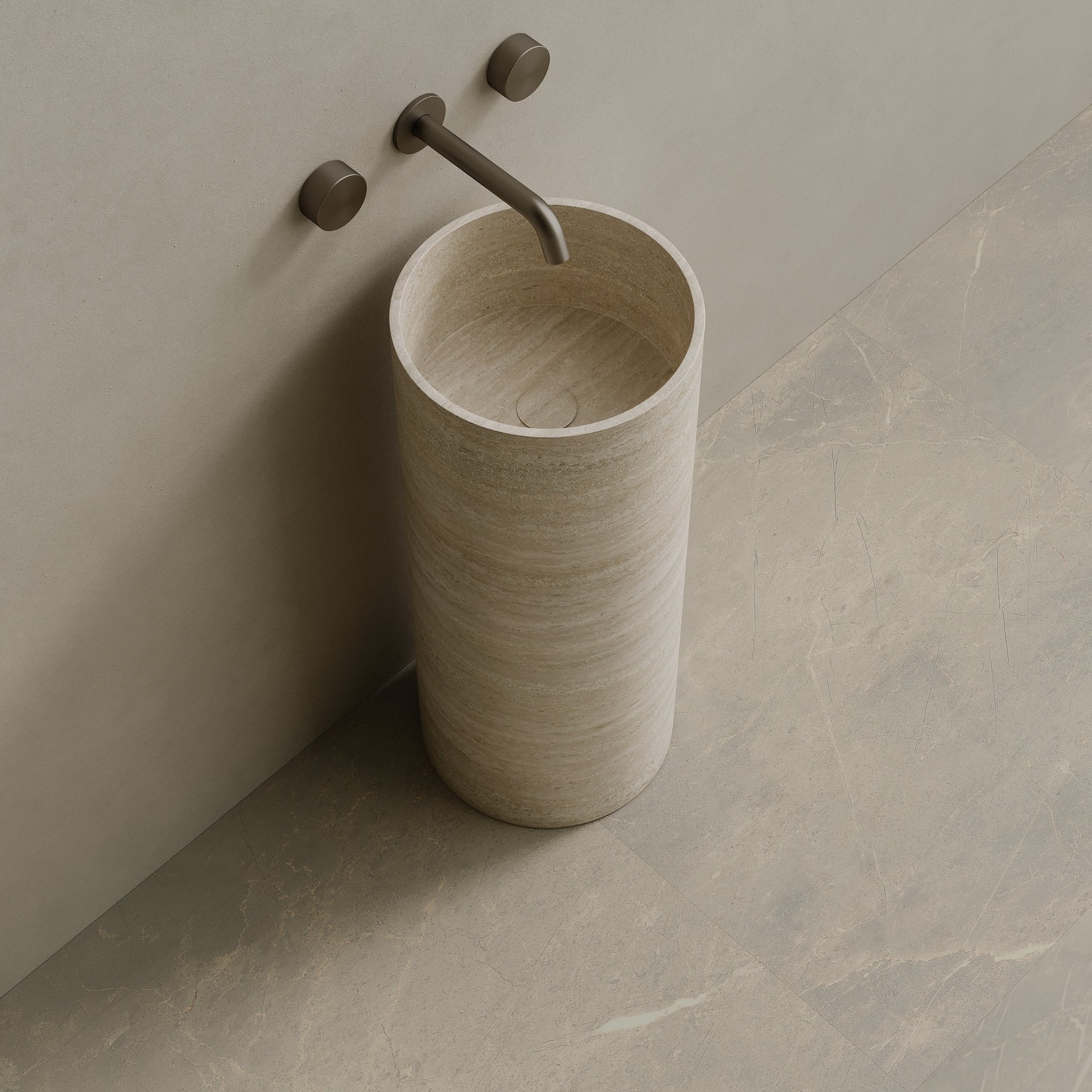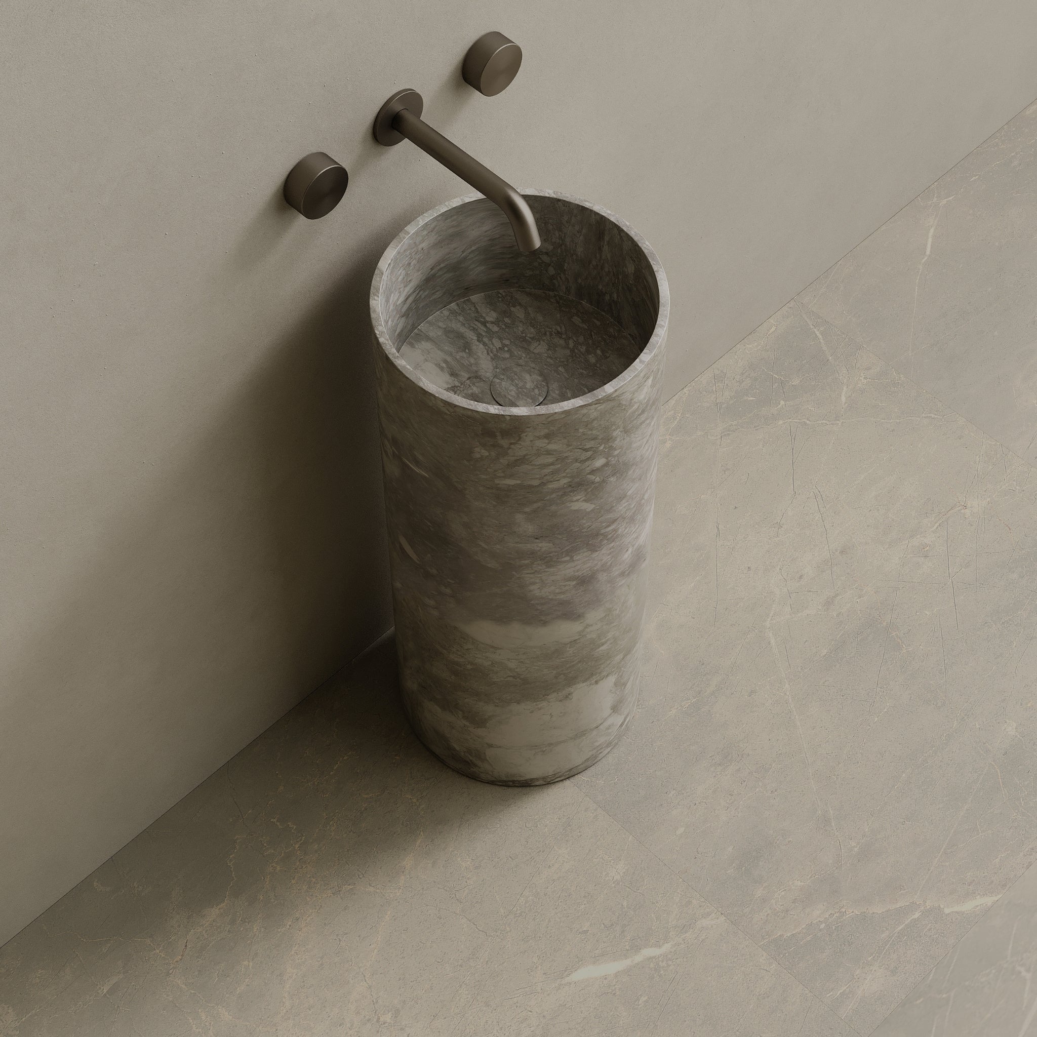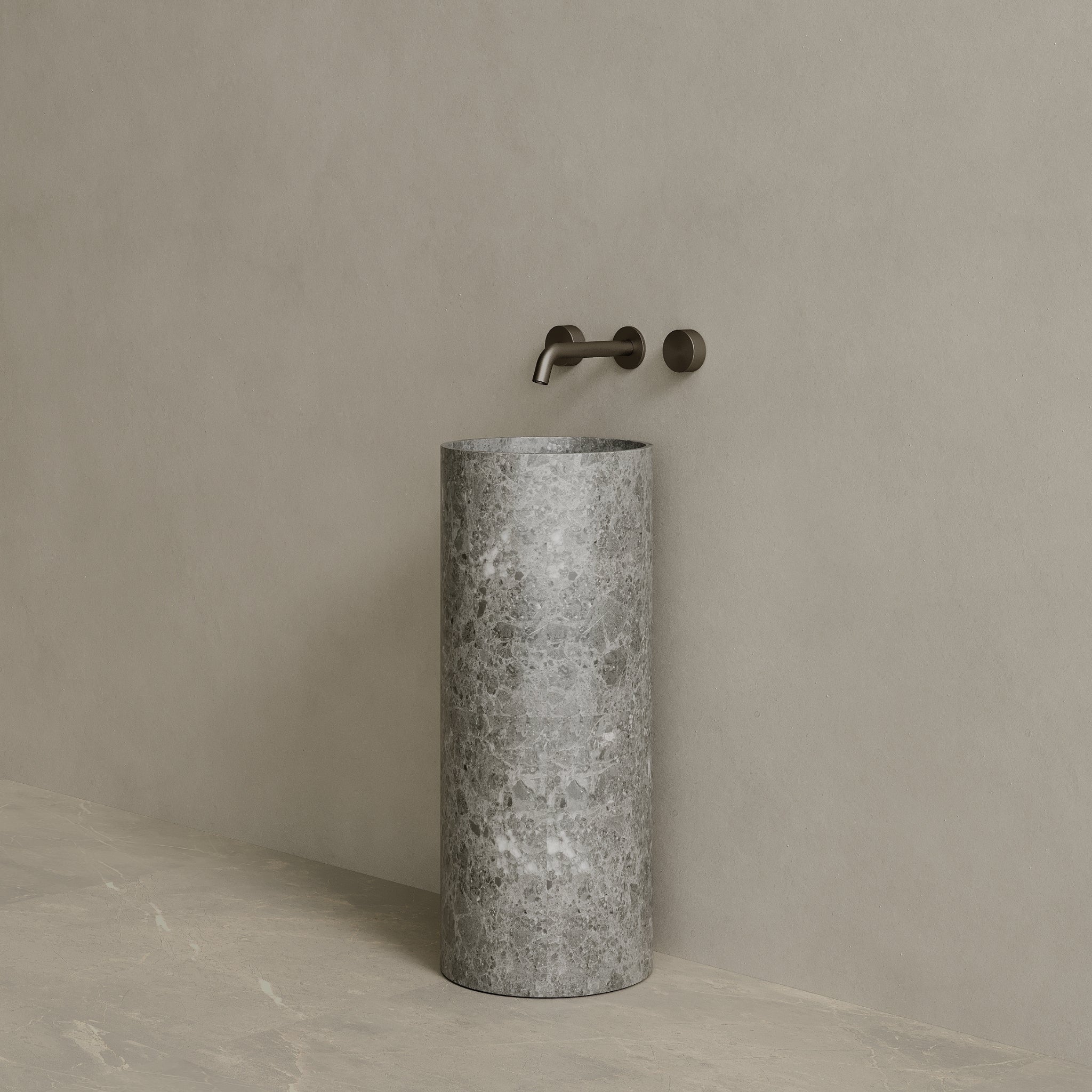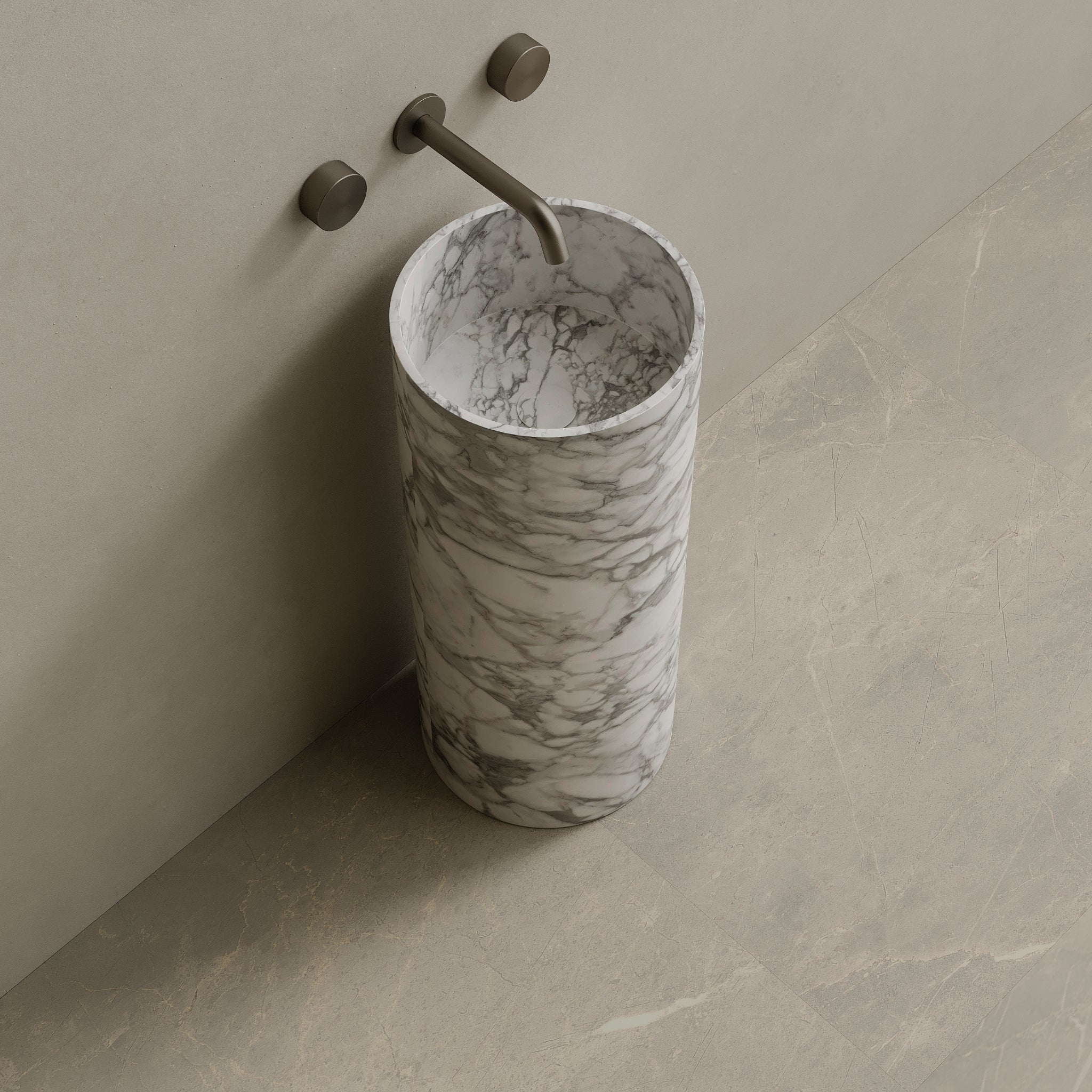 The Colva Freestanding Pedestal Sink introduces a refined sculptural silhouette with its slim, rounded form and minimalist profile. Hand-carved from natural stone, this monolithic sink offers a fluid presence and smooth surface, making it an understated yet impactful addition to any contemporary bath space.
