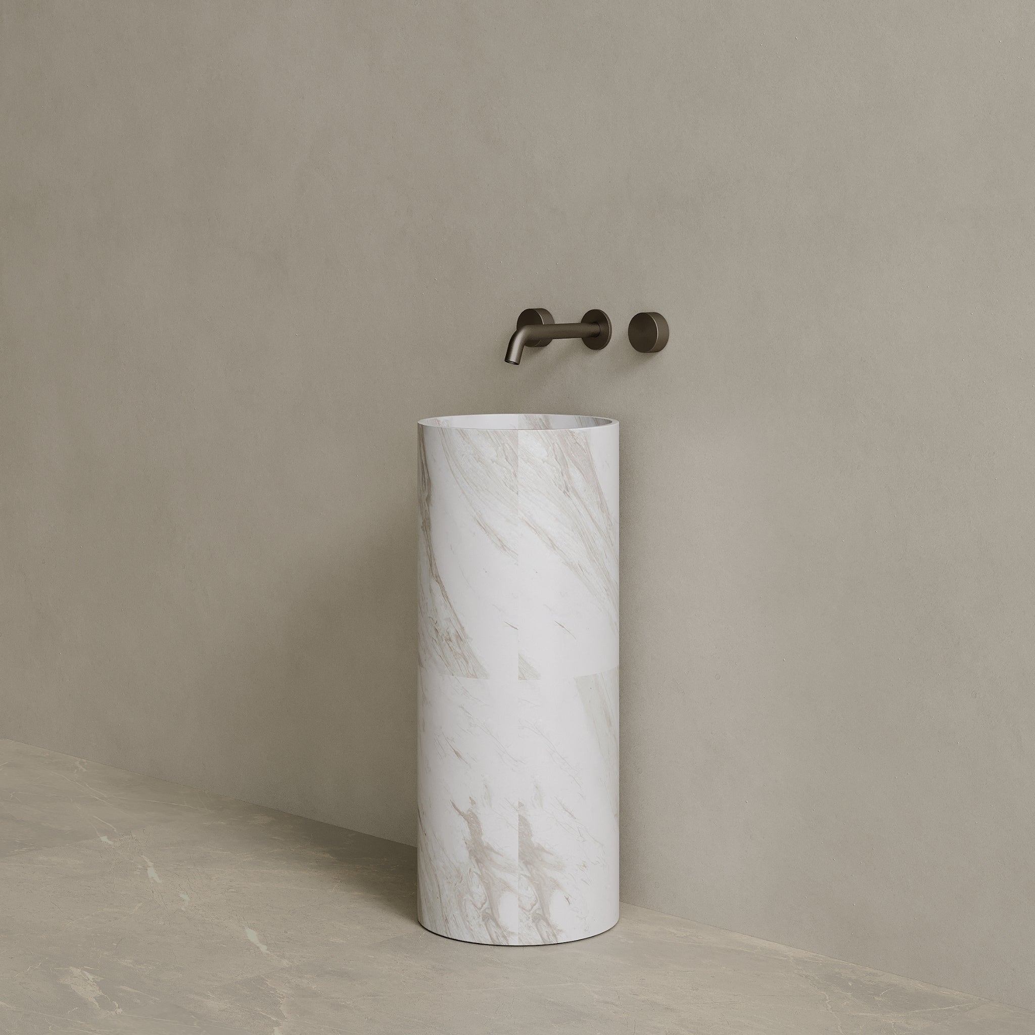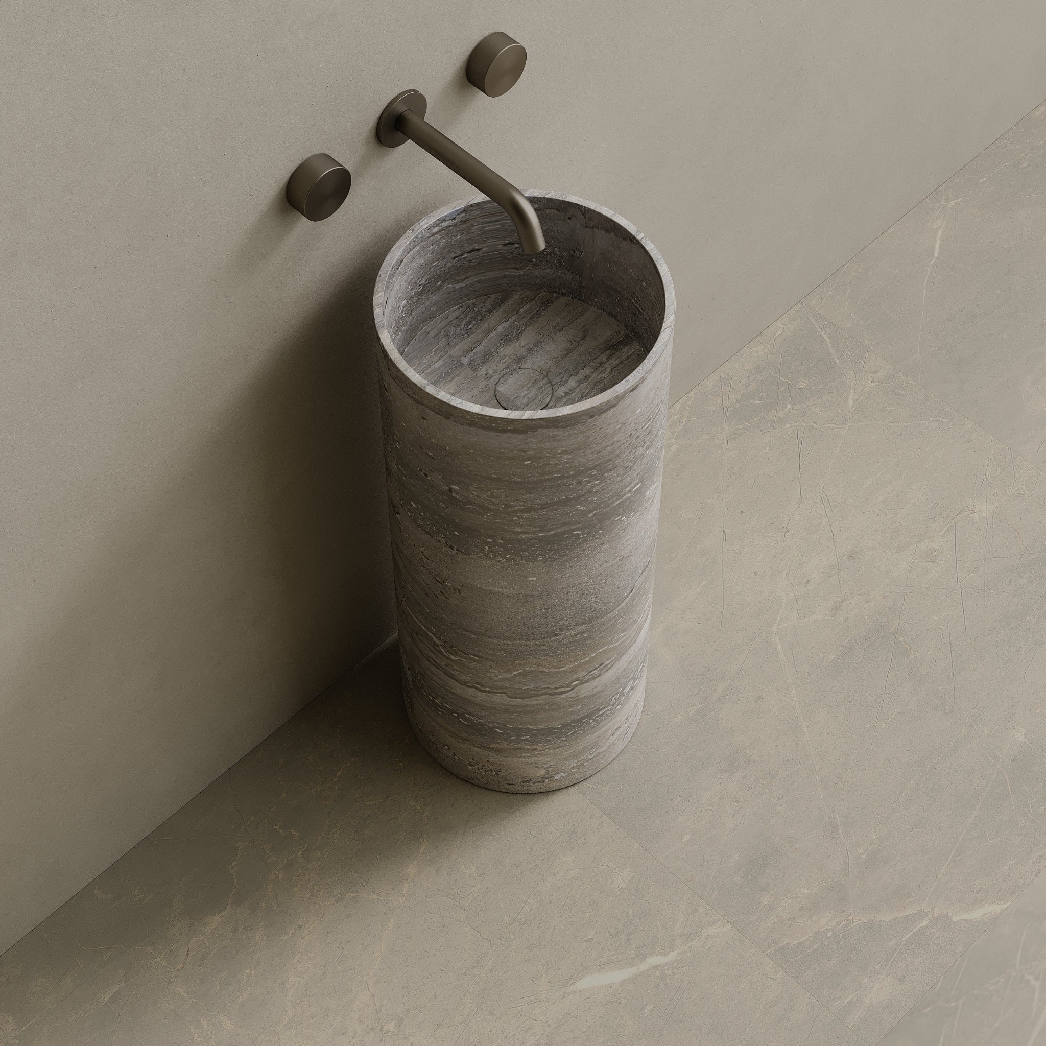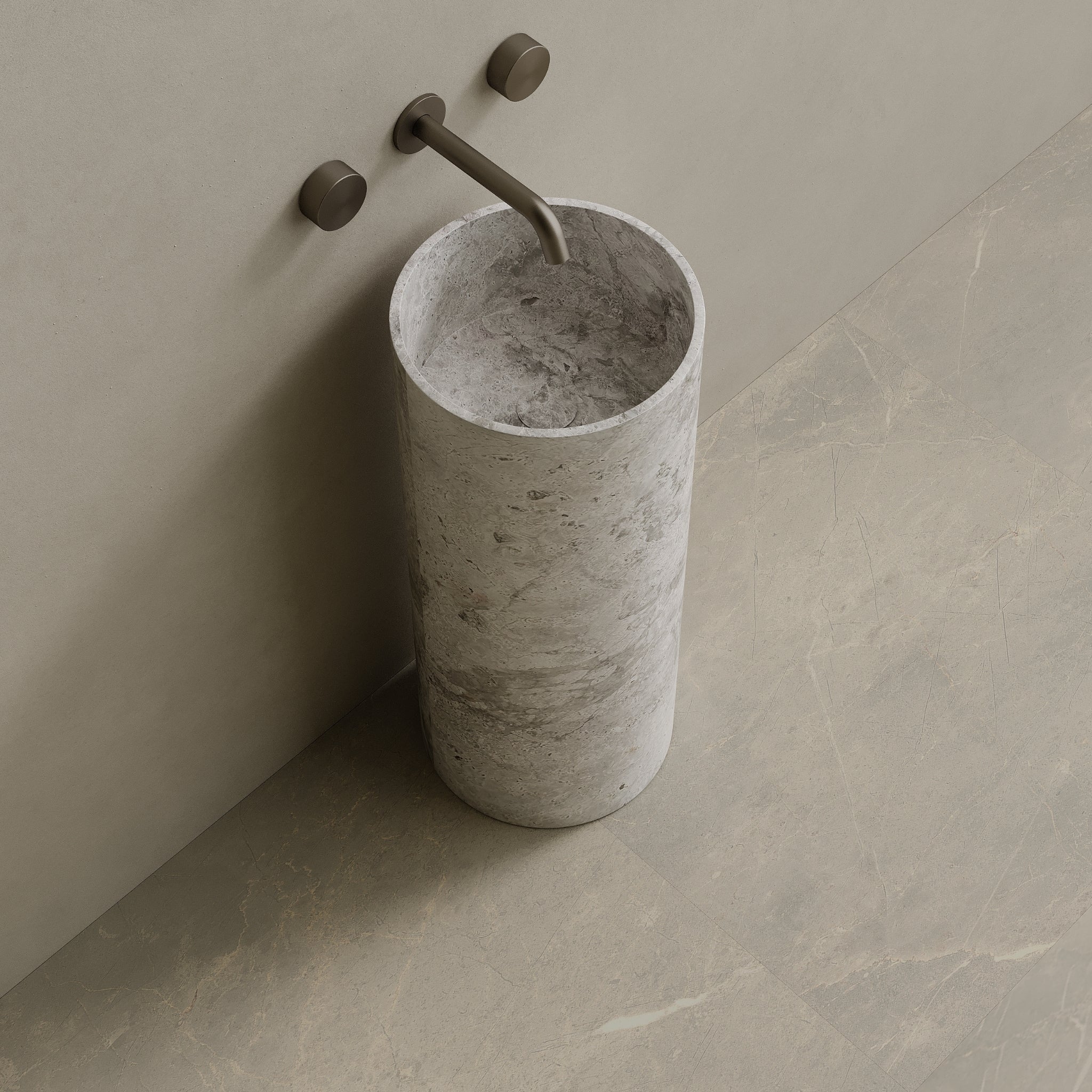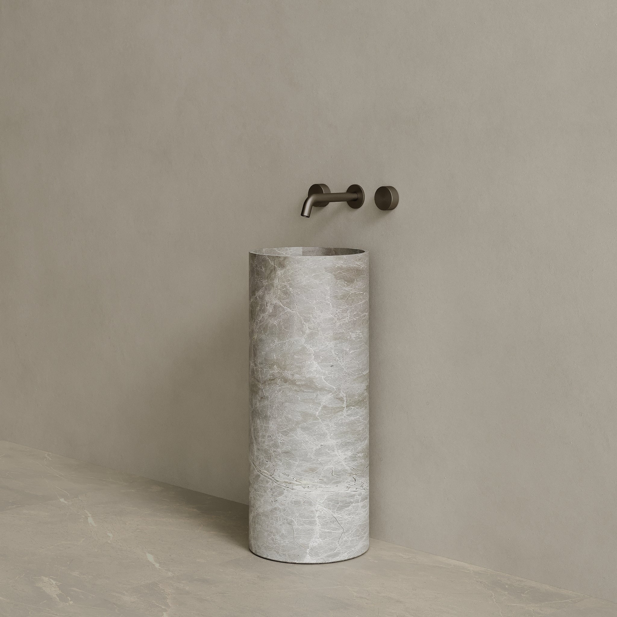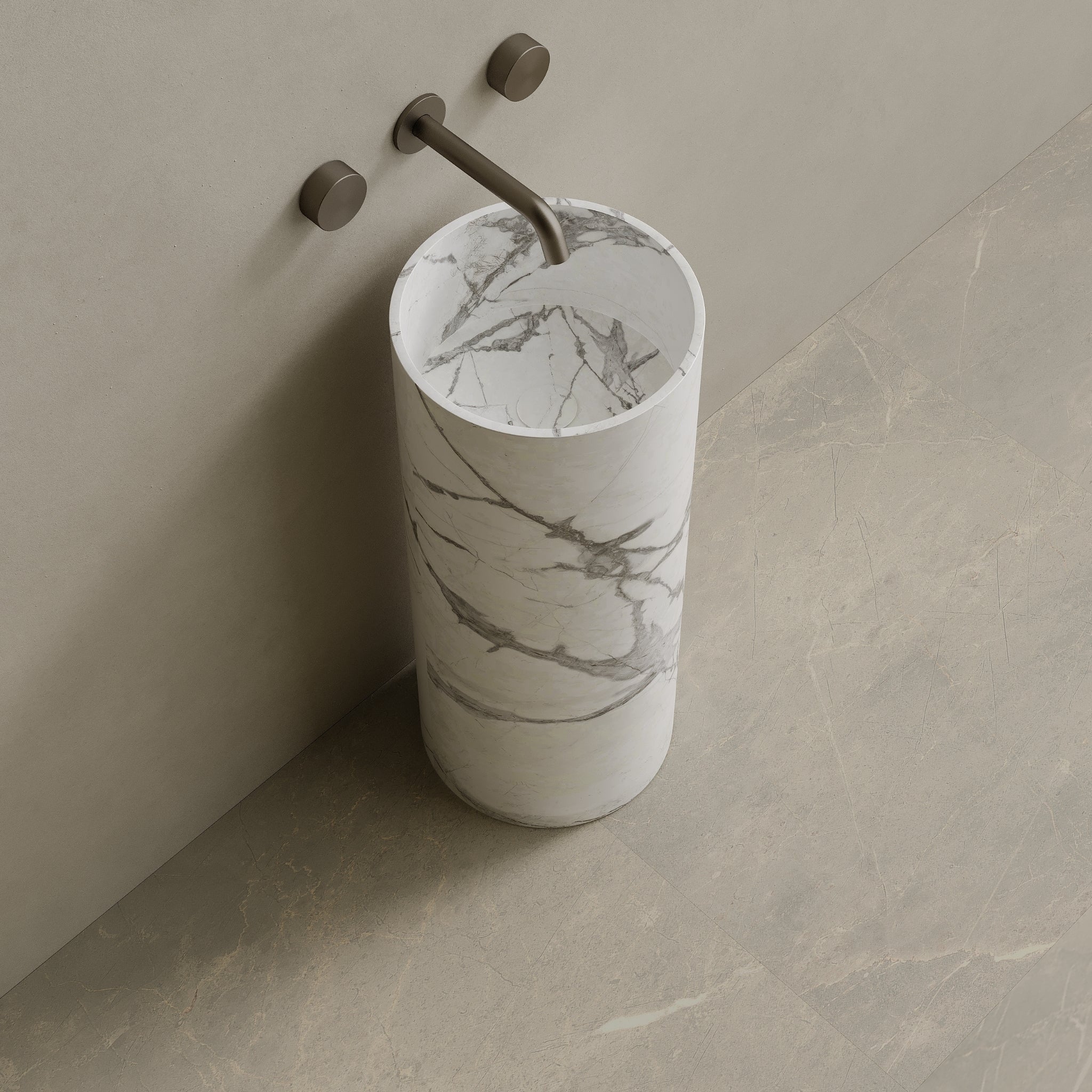 The Colva Freestanding Pedestal Sink introduces a refined sculptural silhouette with its slim, rounded form and minimalist profile. Hand-carved from natural stone, this monolithic sink offers a fluid presence and smooth surface, making it an understated yet impactful addition to any contemporary bath space.