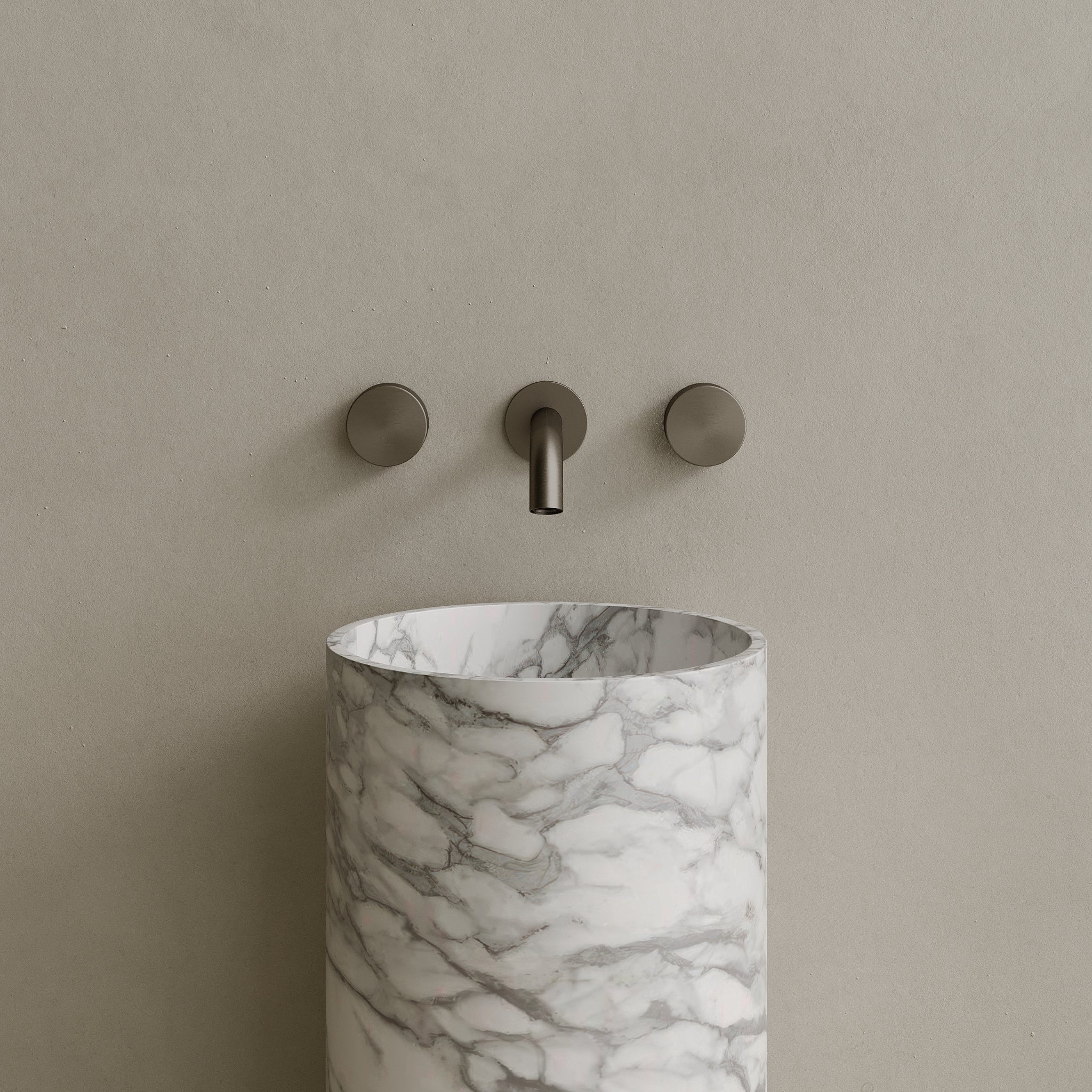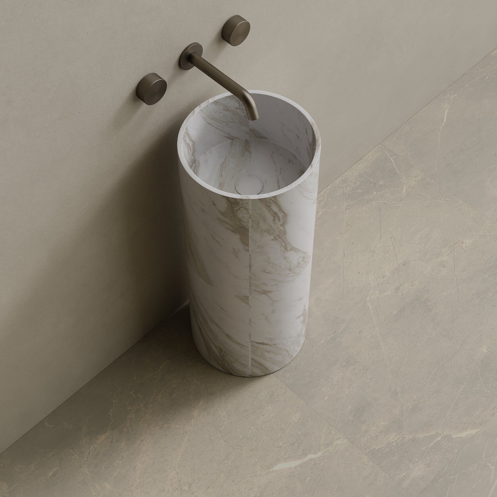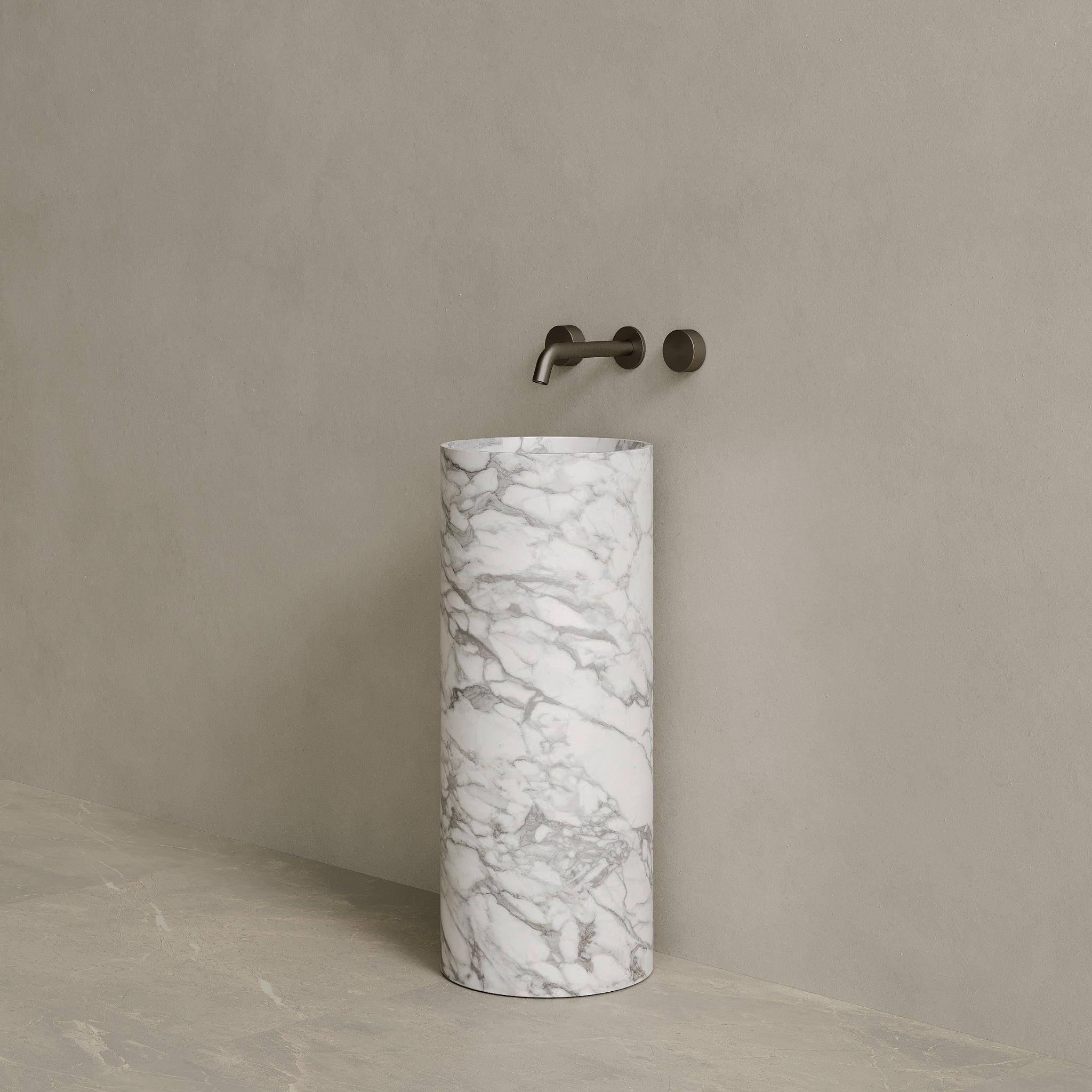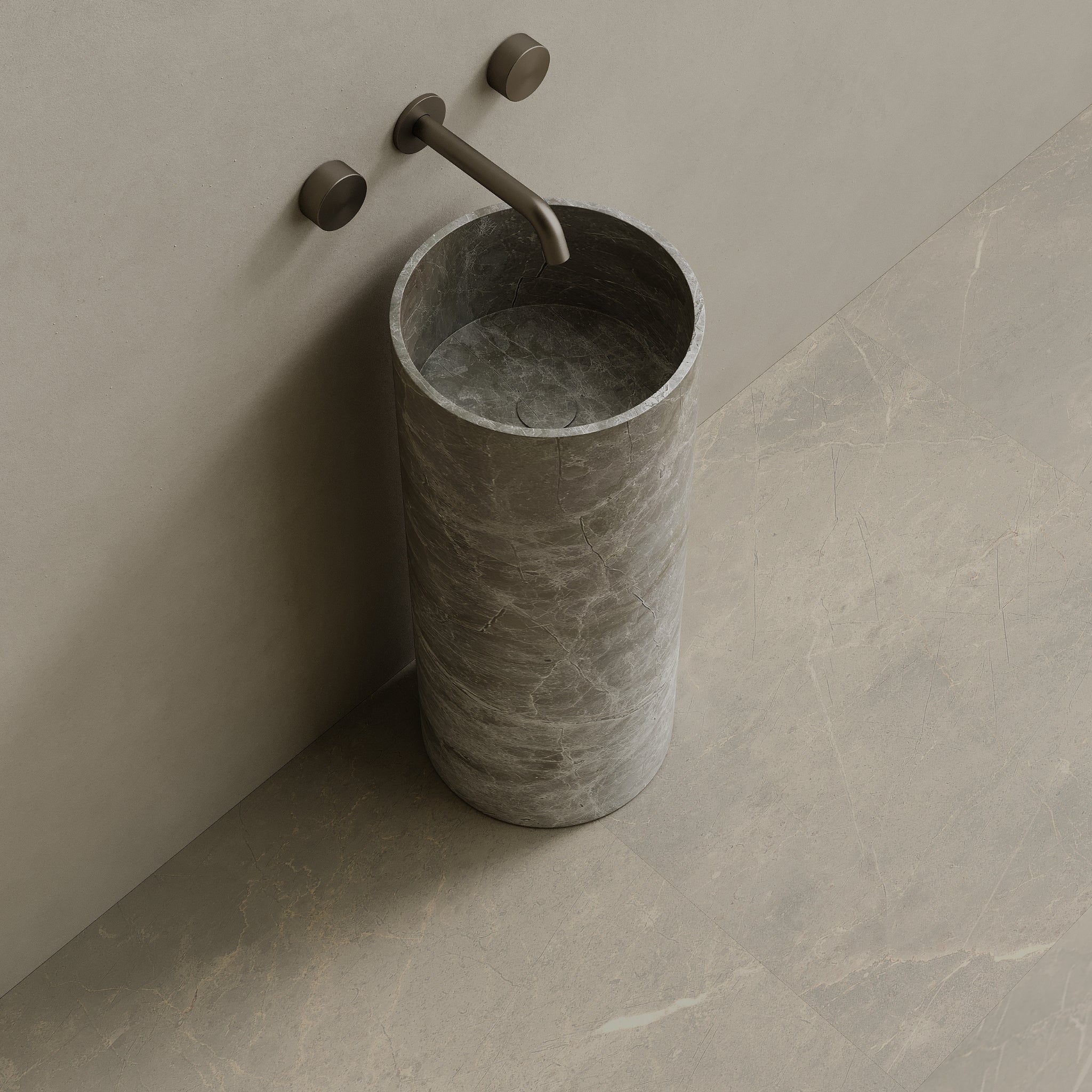The Colva Freestanding Pedestal Sink introduces a refined sculptural silhouette with its slim, rounded form and minimalist profile. Hand-carved from natural stone, this monolithic sink offers a fluid presence and smooth surface, making it an understated yet impactful addition to any contemporary bath space.