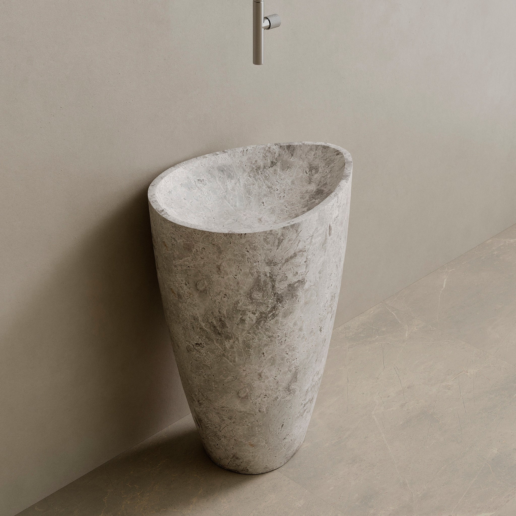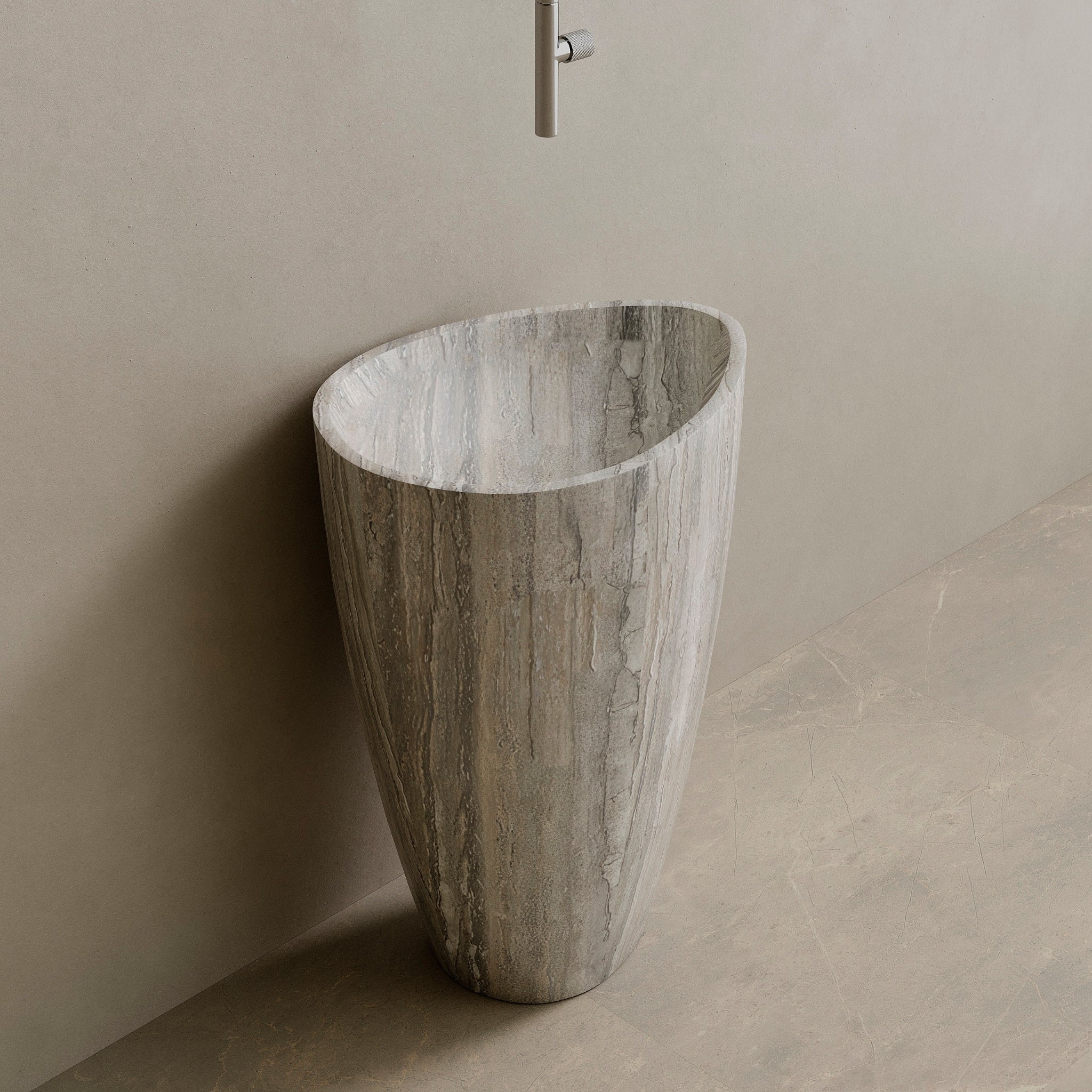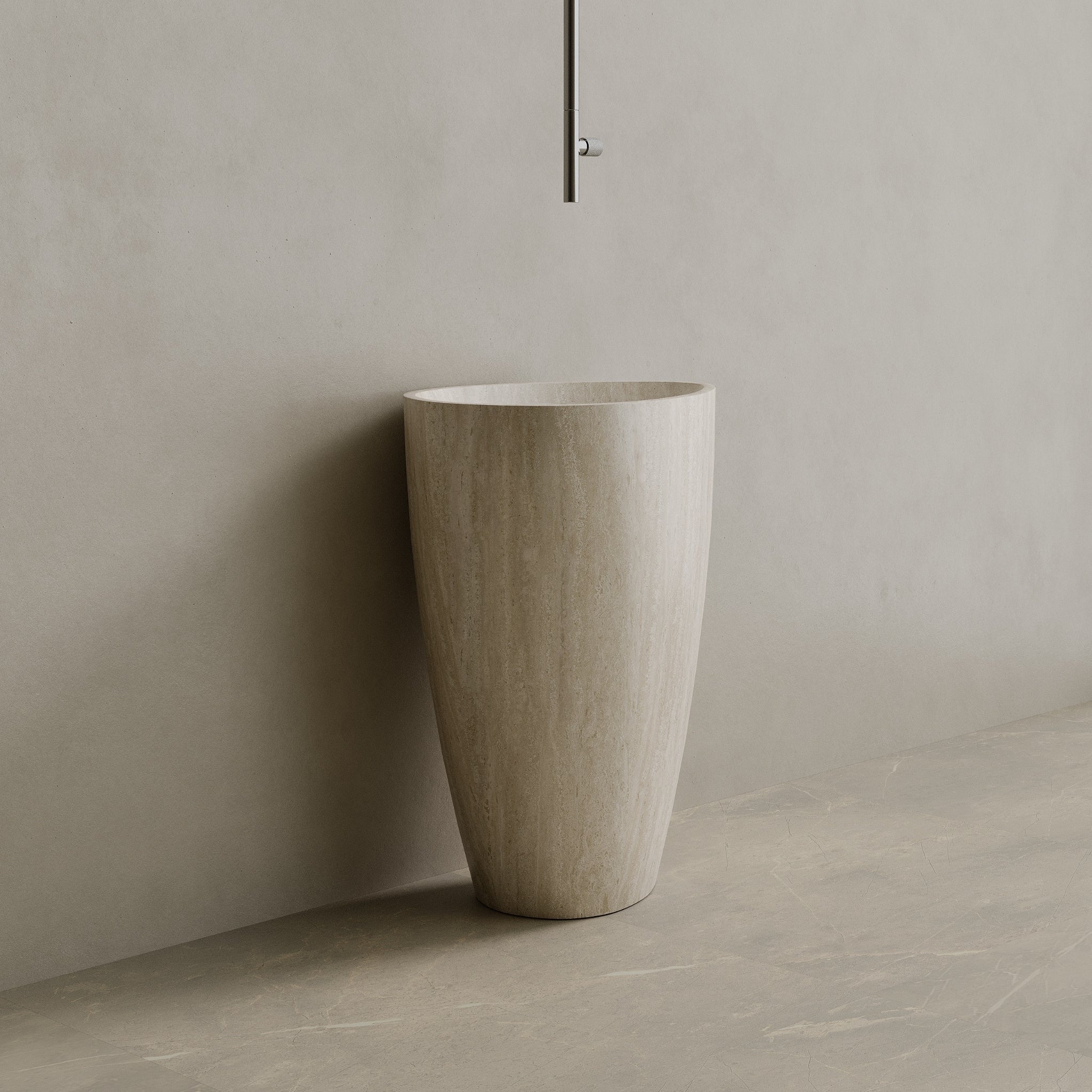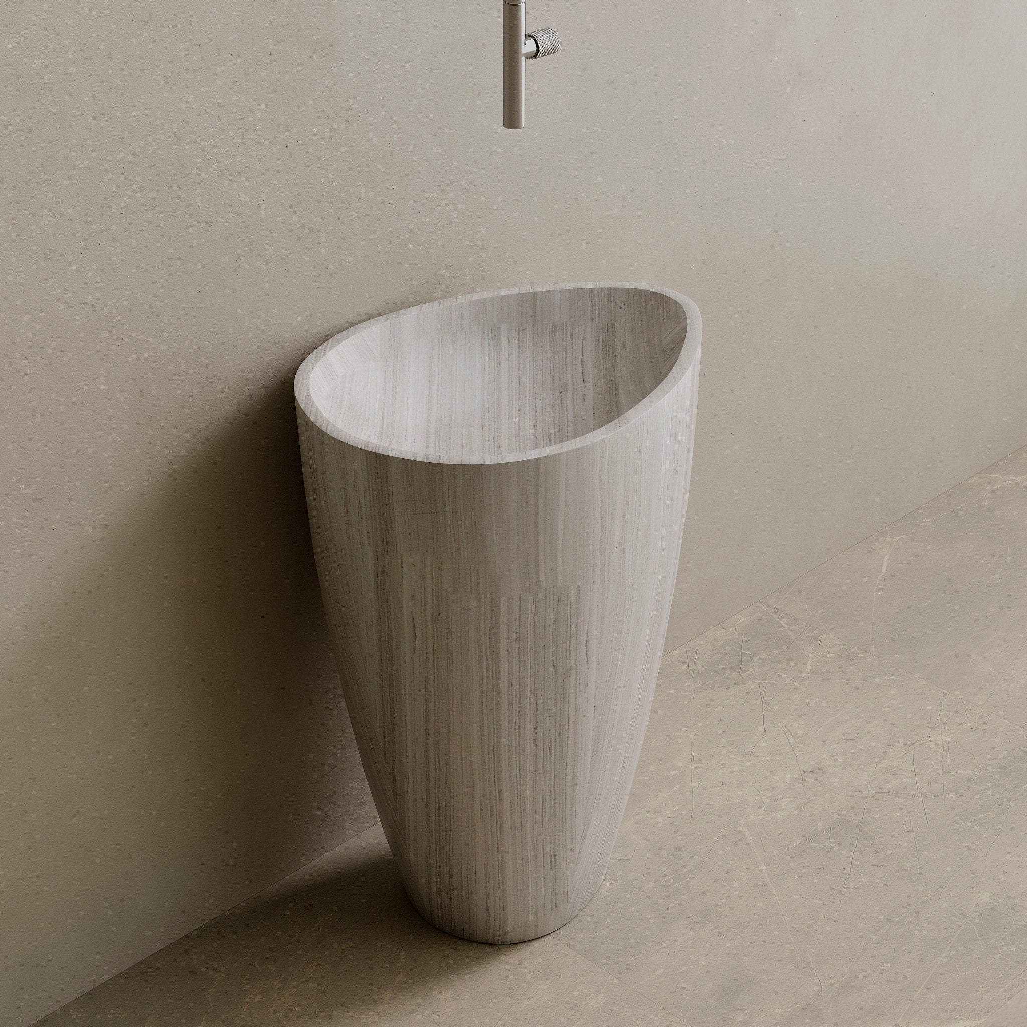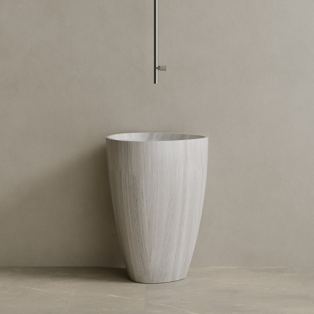 The Fluvio Freestanding Pedestal Sink offers a refined take on sculptural form and fluid design. Featuring an oval silhouette with a gracefully curved basin, this solid stone sink introduces organic symmetry and tactile softness. Handcrafted from natural stone, it forms a serene yet striking centerpiece in any contemporary bath.