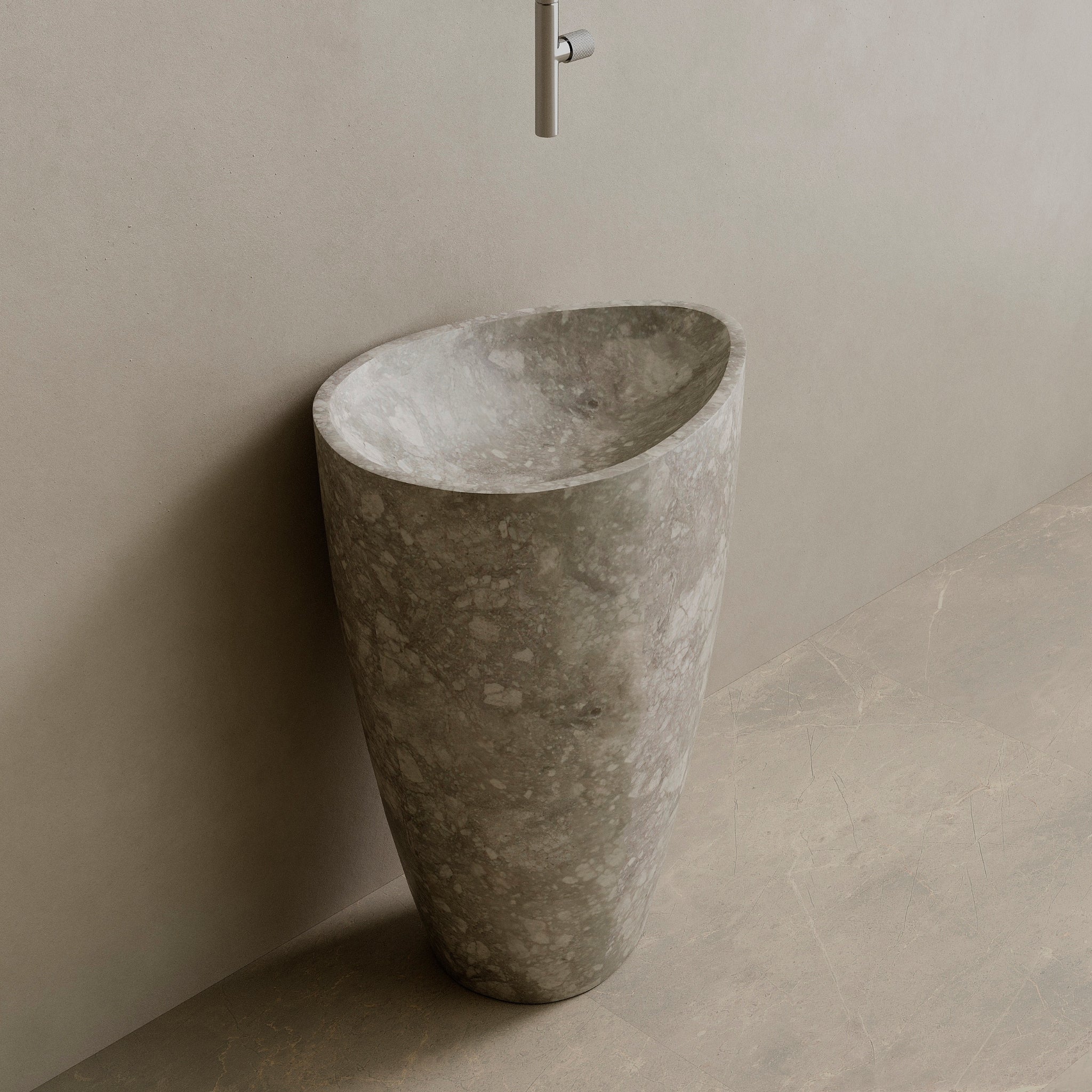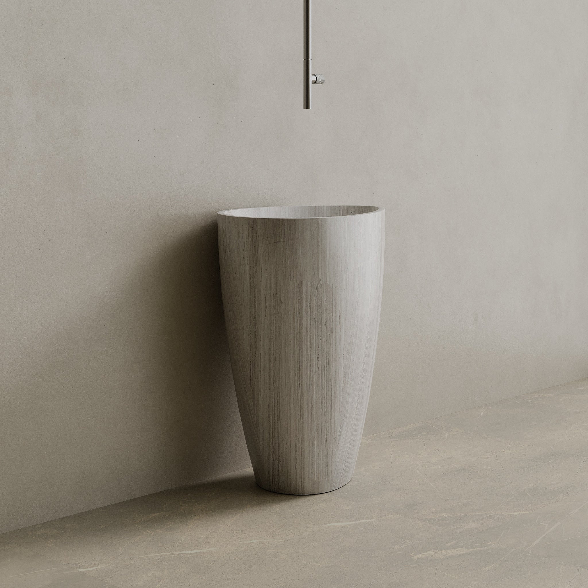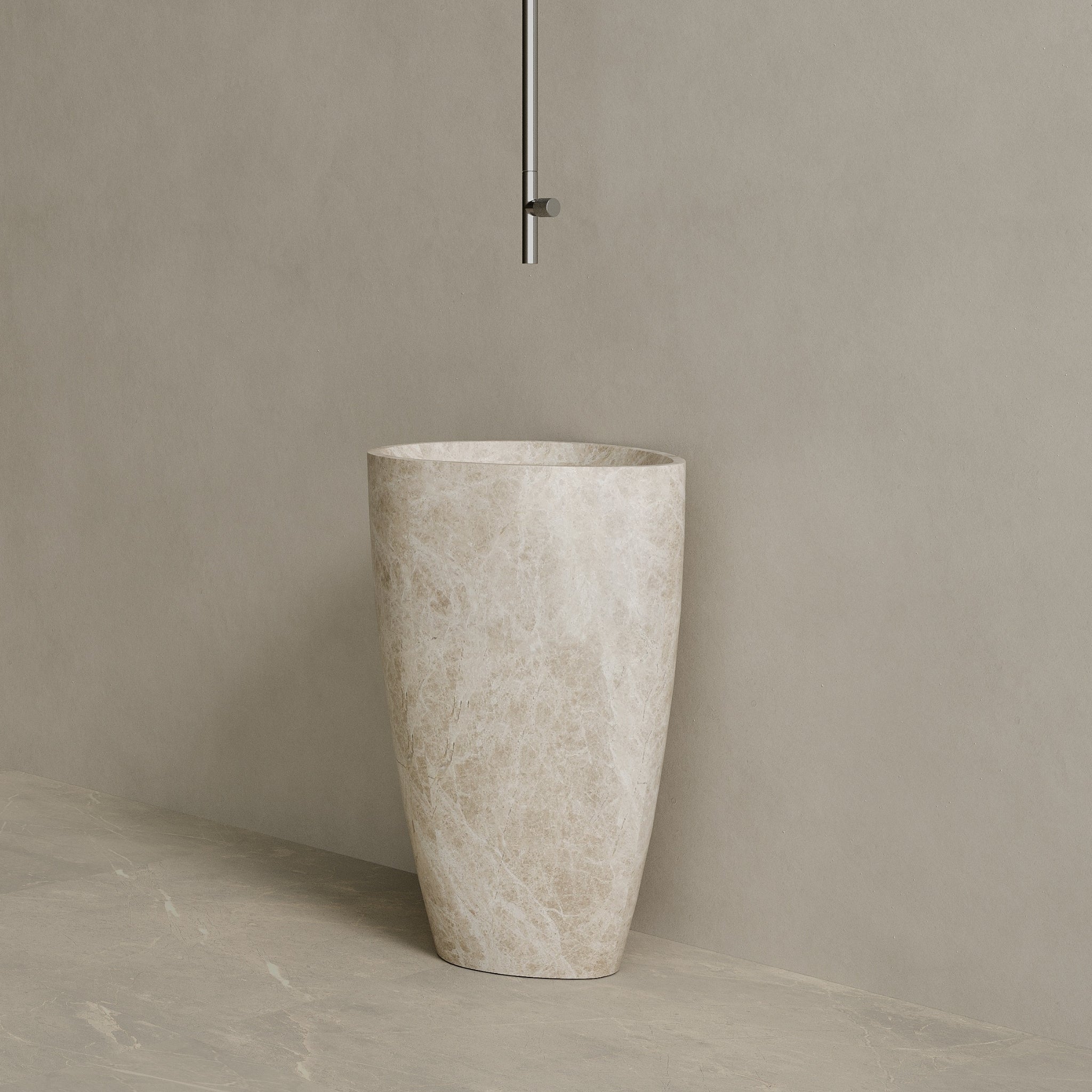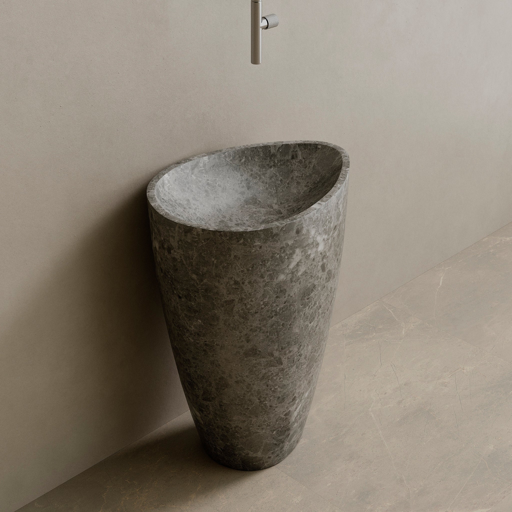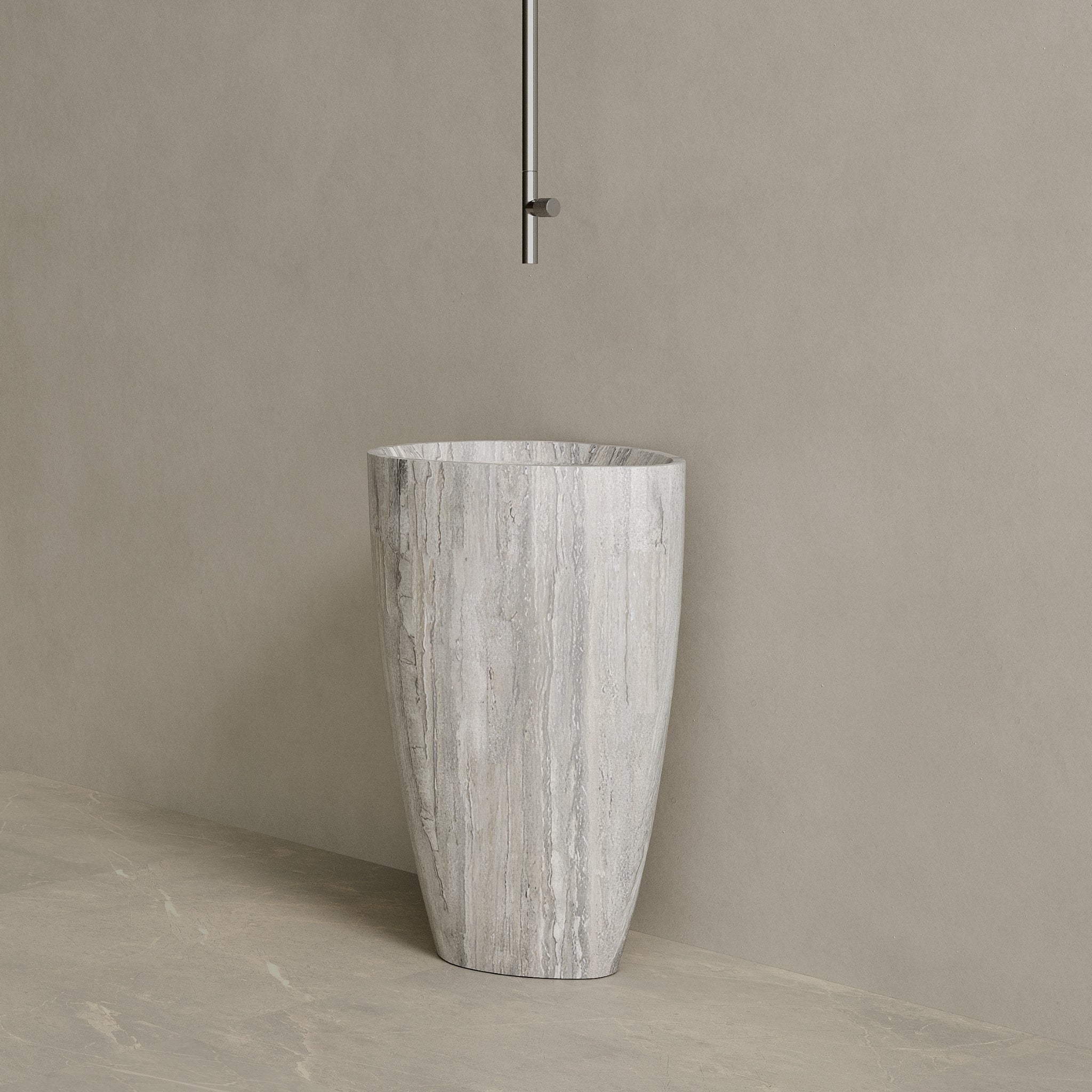 The Fluvio Freestanding Pedestal Sink offers a refined take on sculptural form and fluid design. Featuring an oval silhouette with a gracefully curved basin, this solid stone sink introduces organic symmetry and tactile softness. Handcrafted from natural stone, it forms a serene yet striking centerpiece in any contemporary bath.