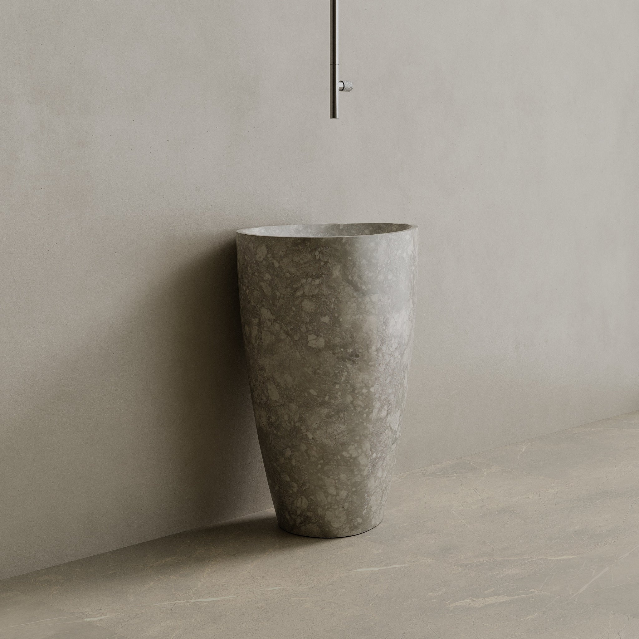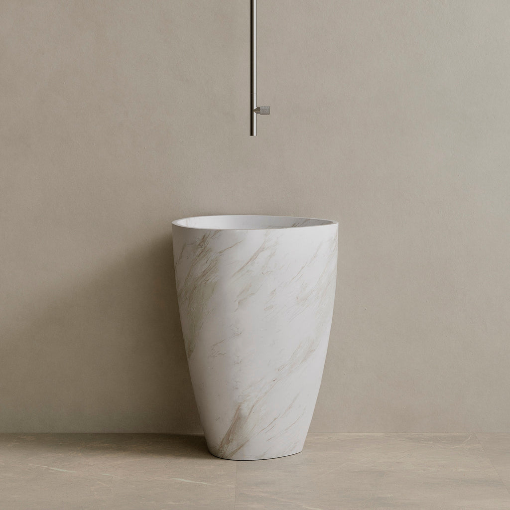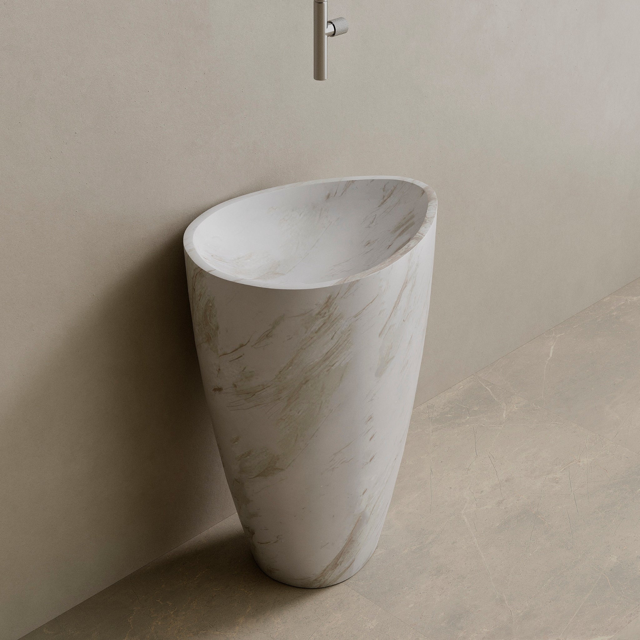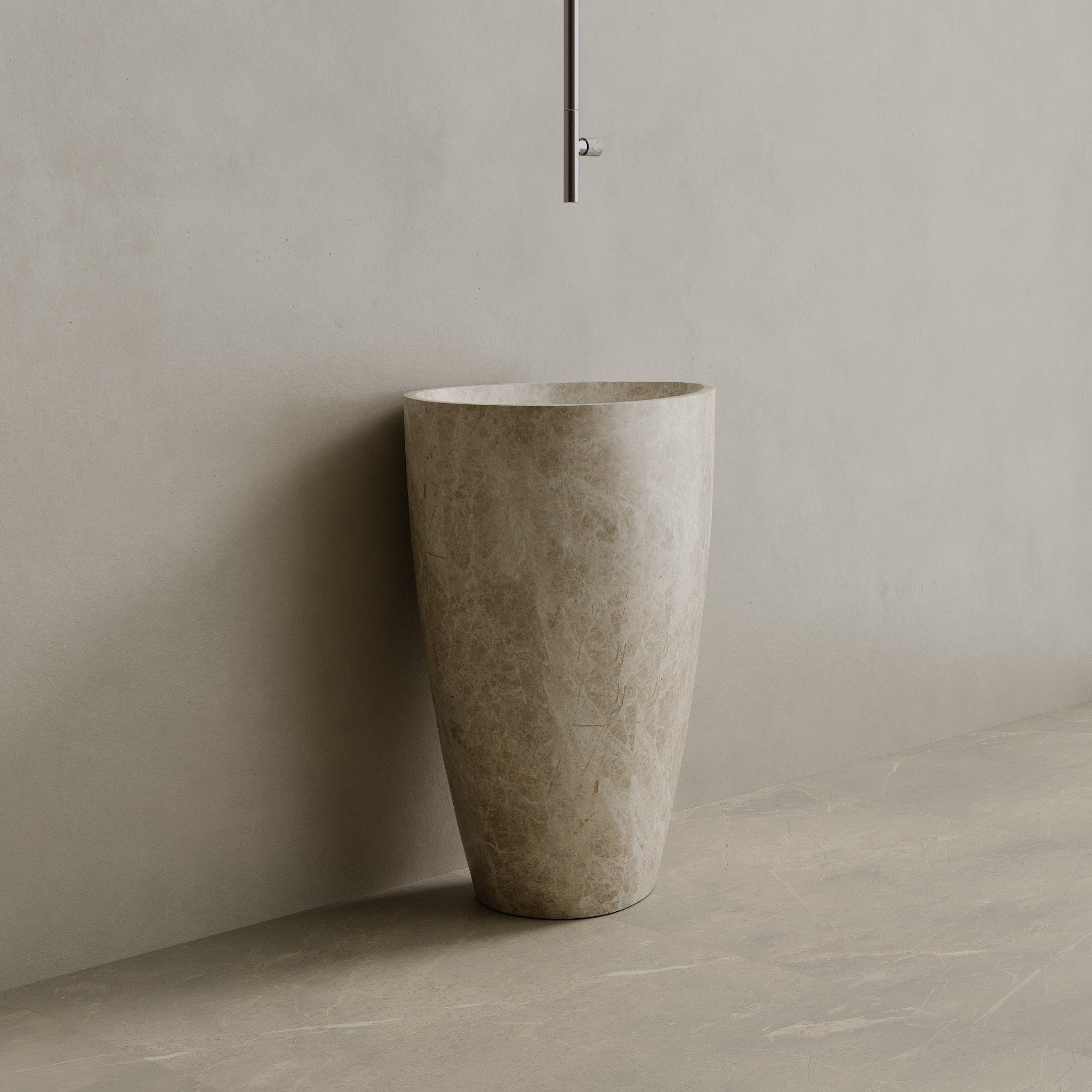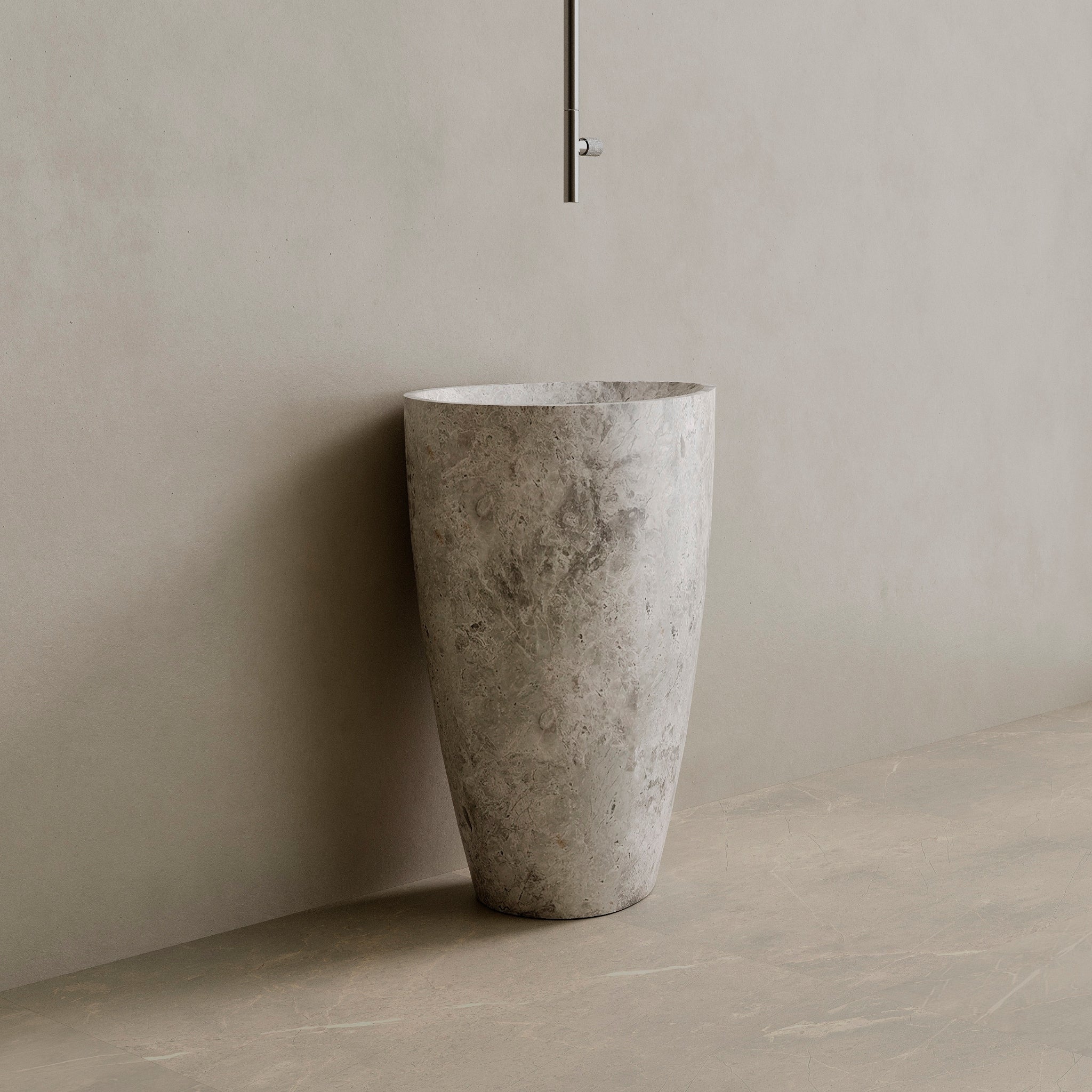 The Fluvio Freestanding Pedestal Sink offers a refined take on sculptural form and fluid design. Featuring an oval silhouette with a gracefully curved basin, this solid stone sink introduces organic symmetry and tactile softness. Handcrafted from natural stone, it forms a serene yet striking centerpiece in any contemporary bath.