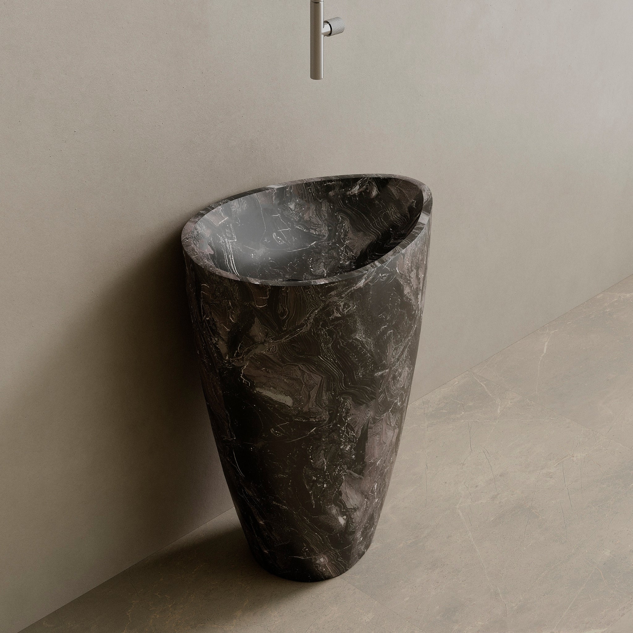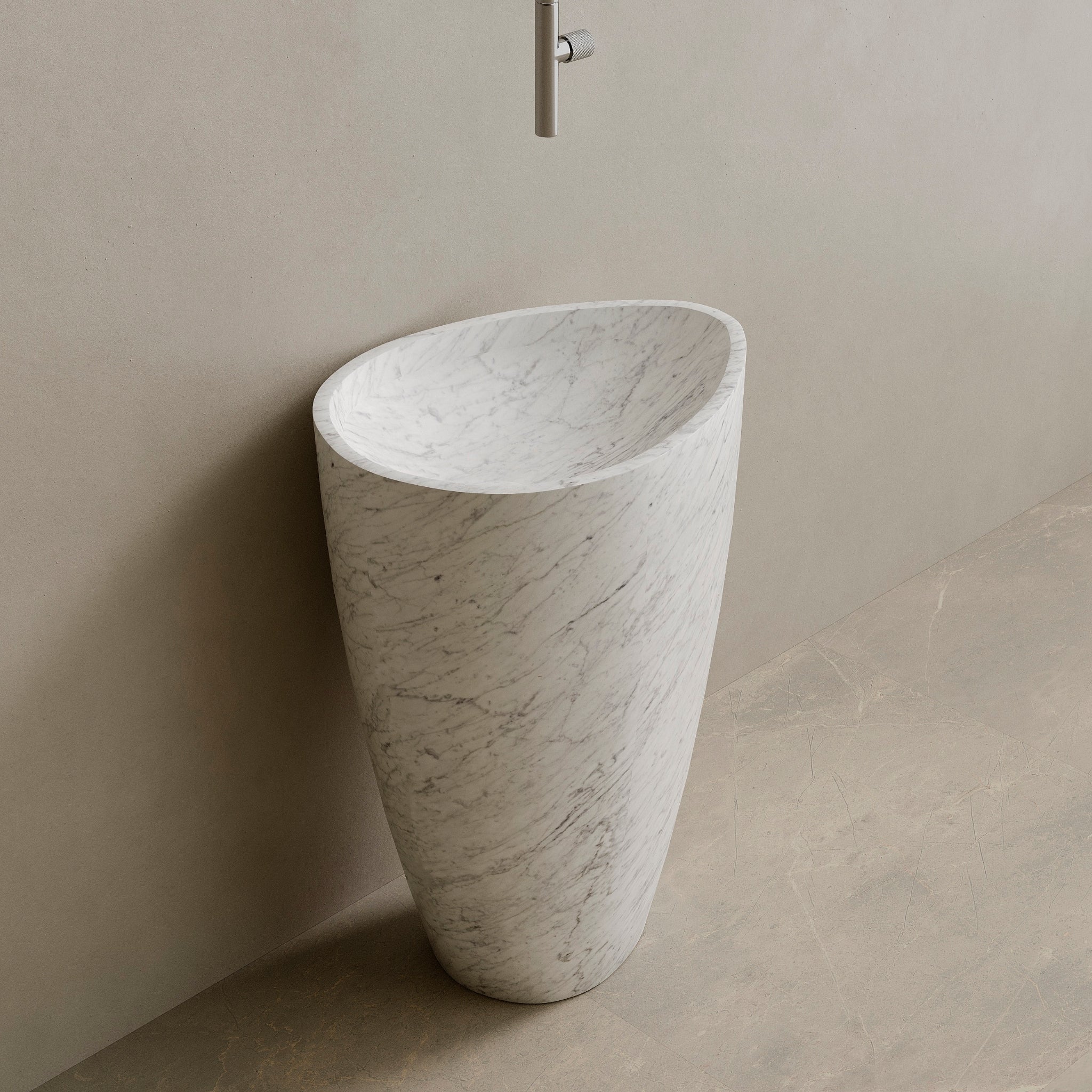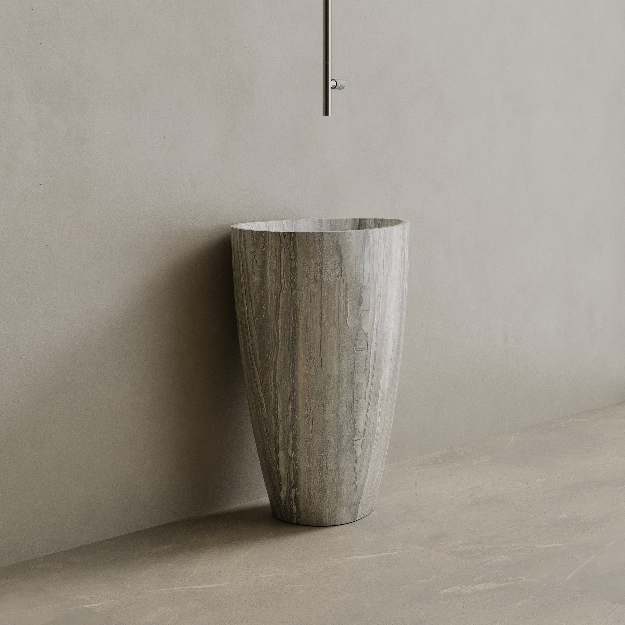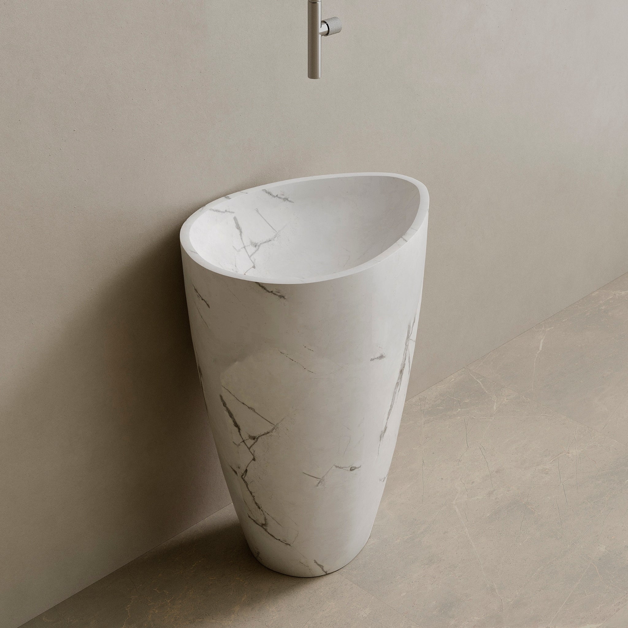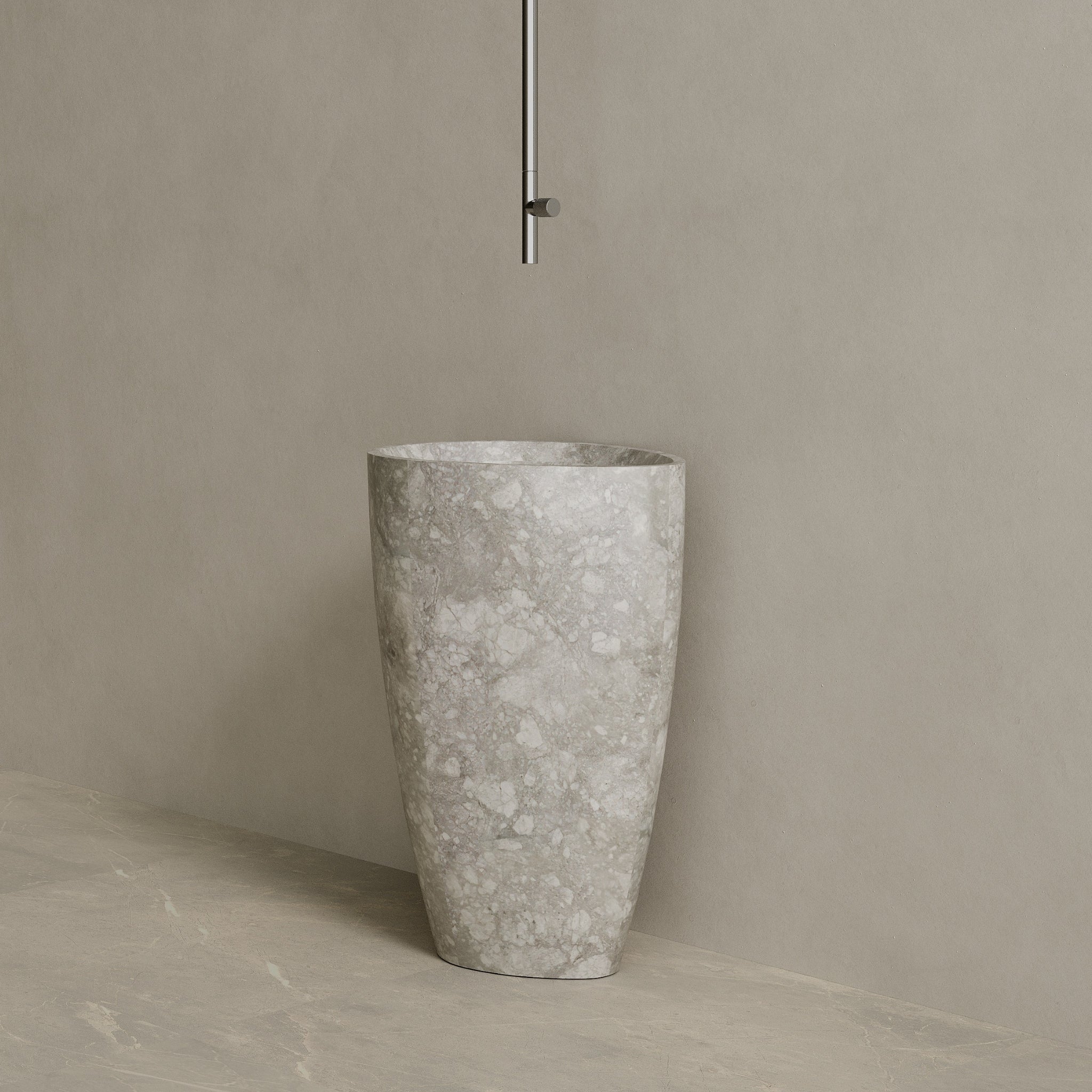 The Fluvio Freestanding Pedestal Sink offers a refined take on sculptural form and fluid design. Featuring an oval silhouette with a gracefully curved basin, this solid stone sink introduces organic symmetry and tactile softness. Handcrafted from natural stone, it forms a serene yet striking centerpiece in any contemporary bath.