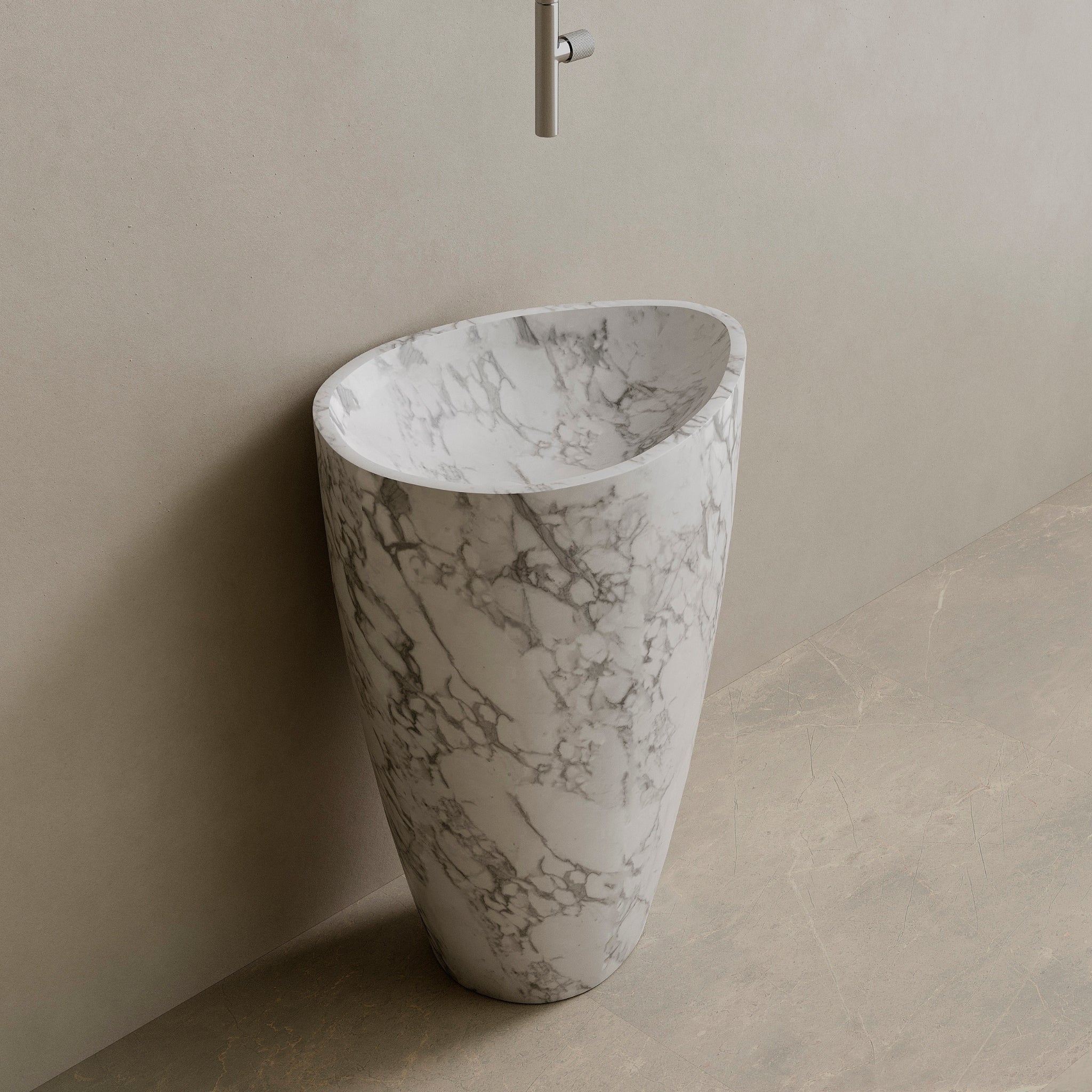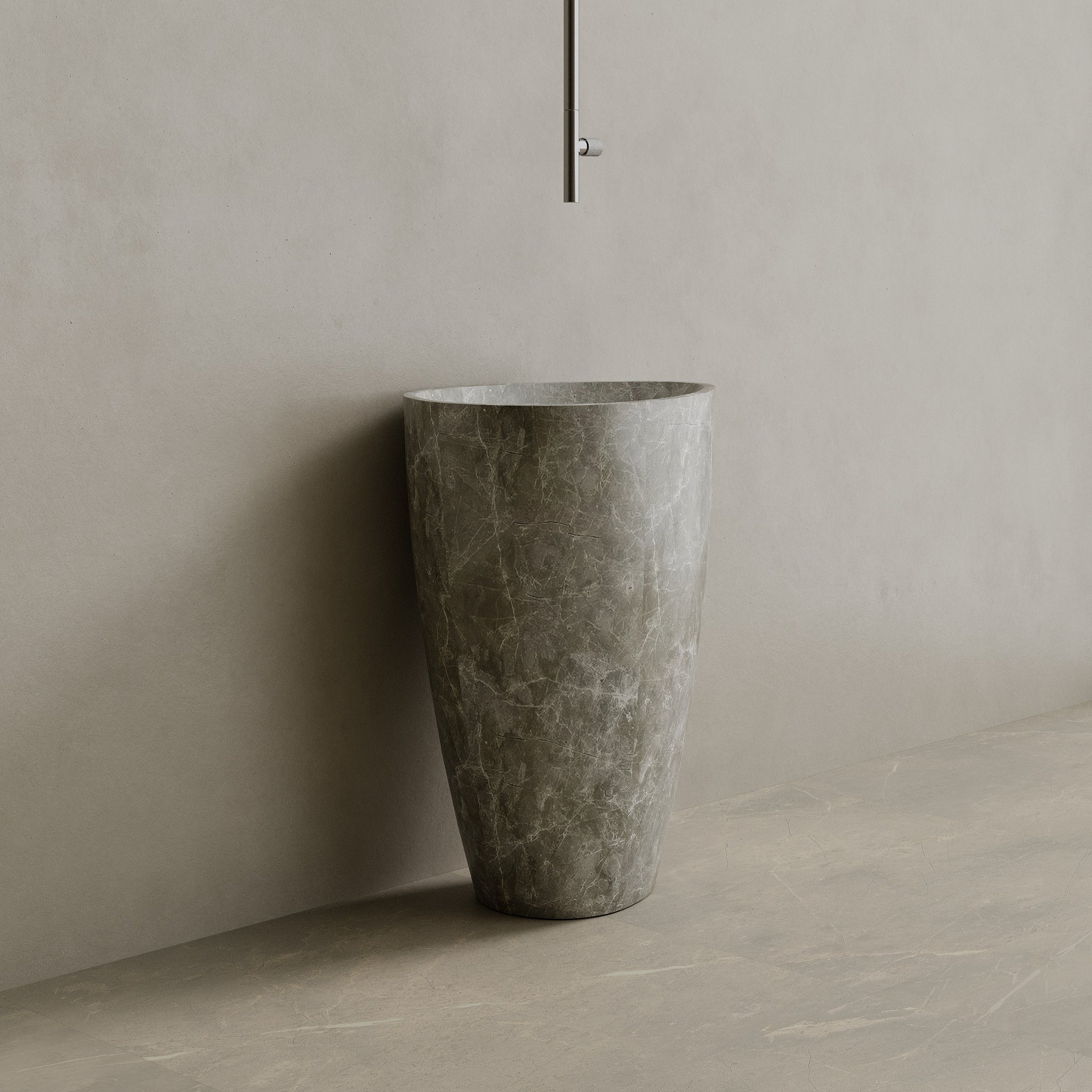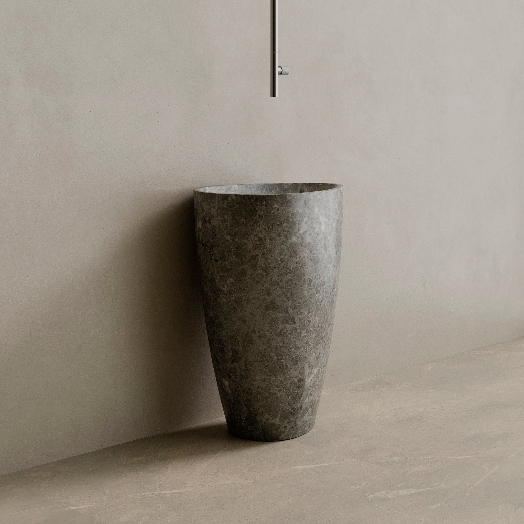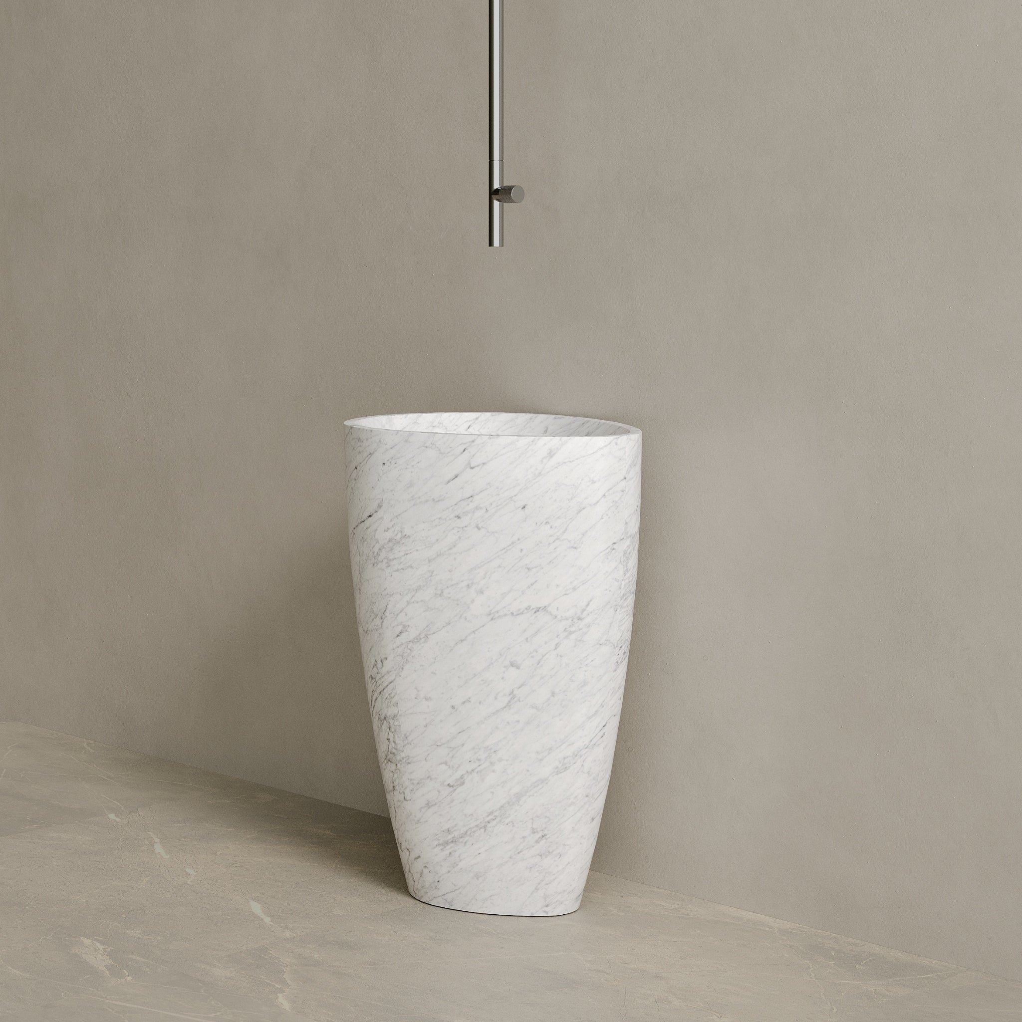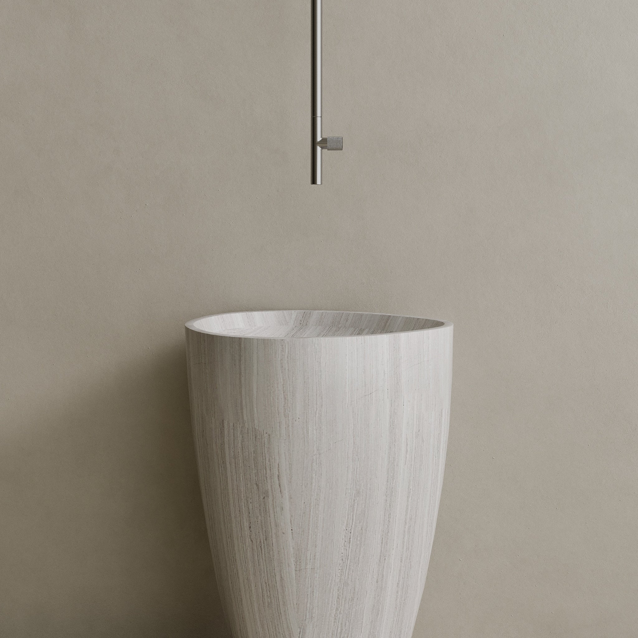 The Fluvio Freestanding Pedestal Sink offers a refined take on sculptural form and fluid design. Featuring an oval silhouette with a gracefully curved basin, this solid stone sink introduces organic symmetry and tactile softness. Handcrafted from natural stone, it forms a serene yet striking centerpiece in any contemporary bath.