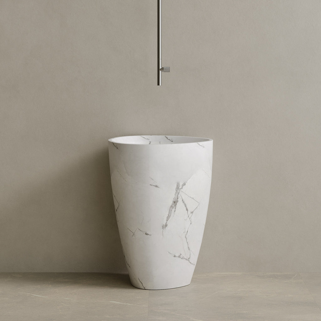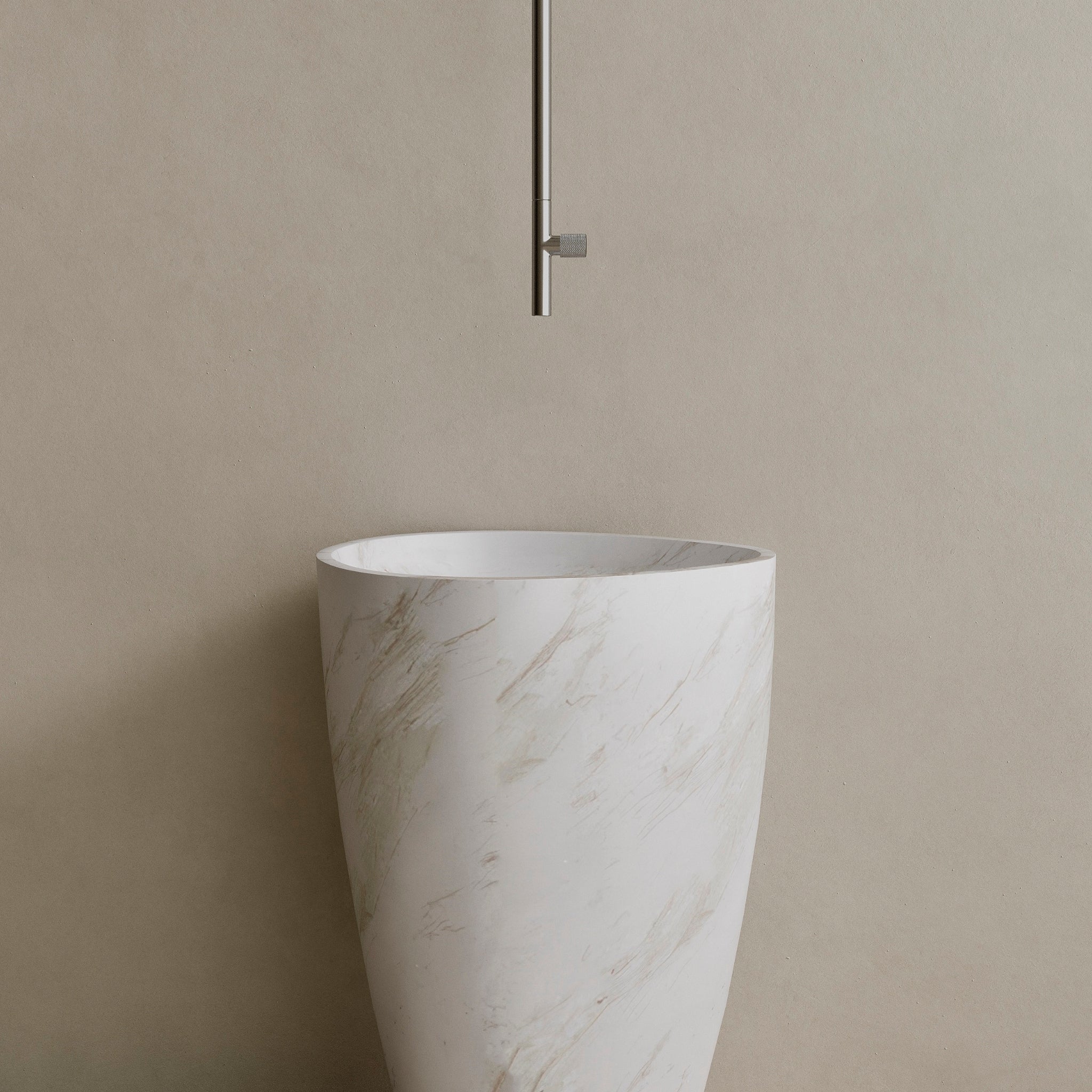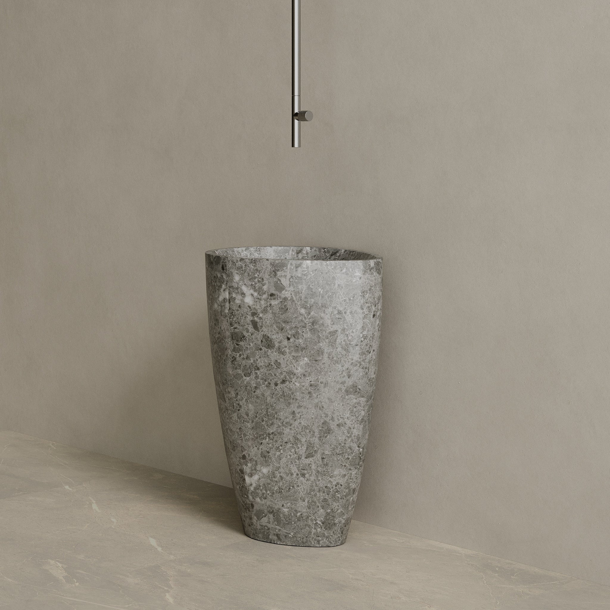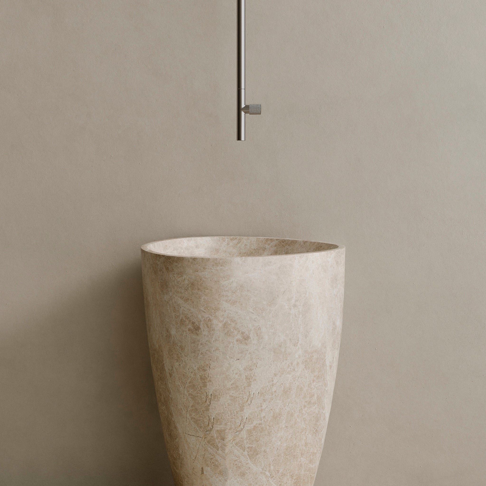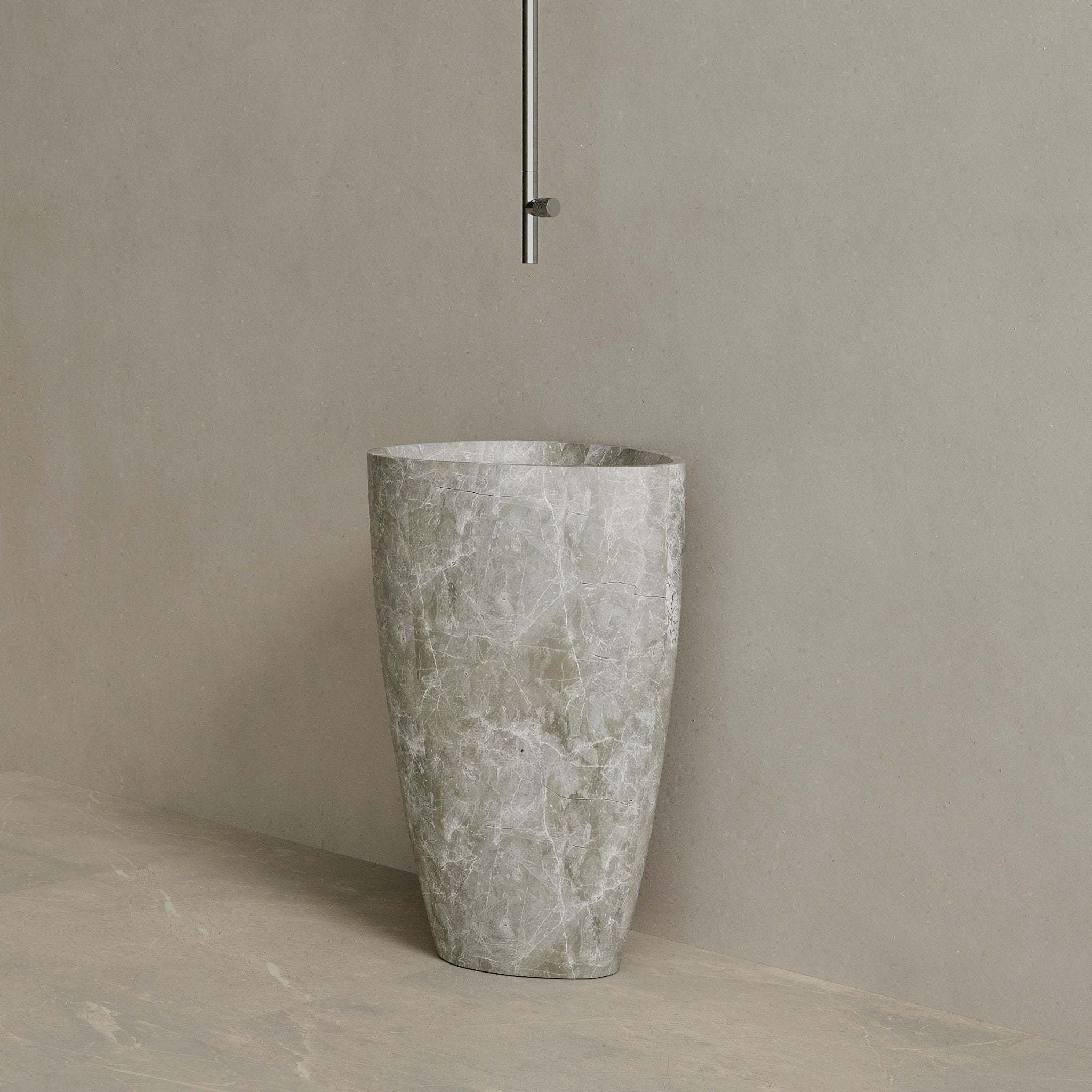 The Fluvio Freestanding Pedestal Sink offers a refined take on sculptural form and fluid design. Featuring an oval silhouette with a gracefully curved basin, this solid stone sink introduces organic symmetry and tactile softness. Handcrafted from natural stone, it forms a serene yet striking centerpiece in any contemporary bath.