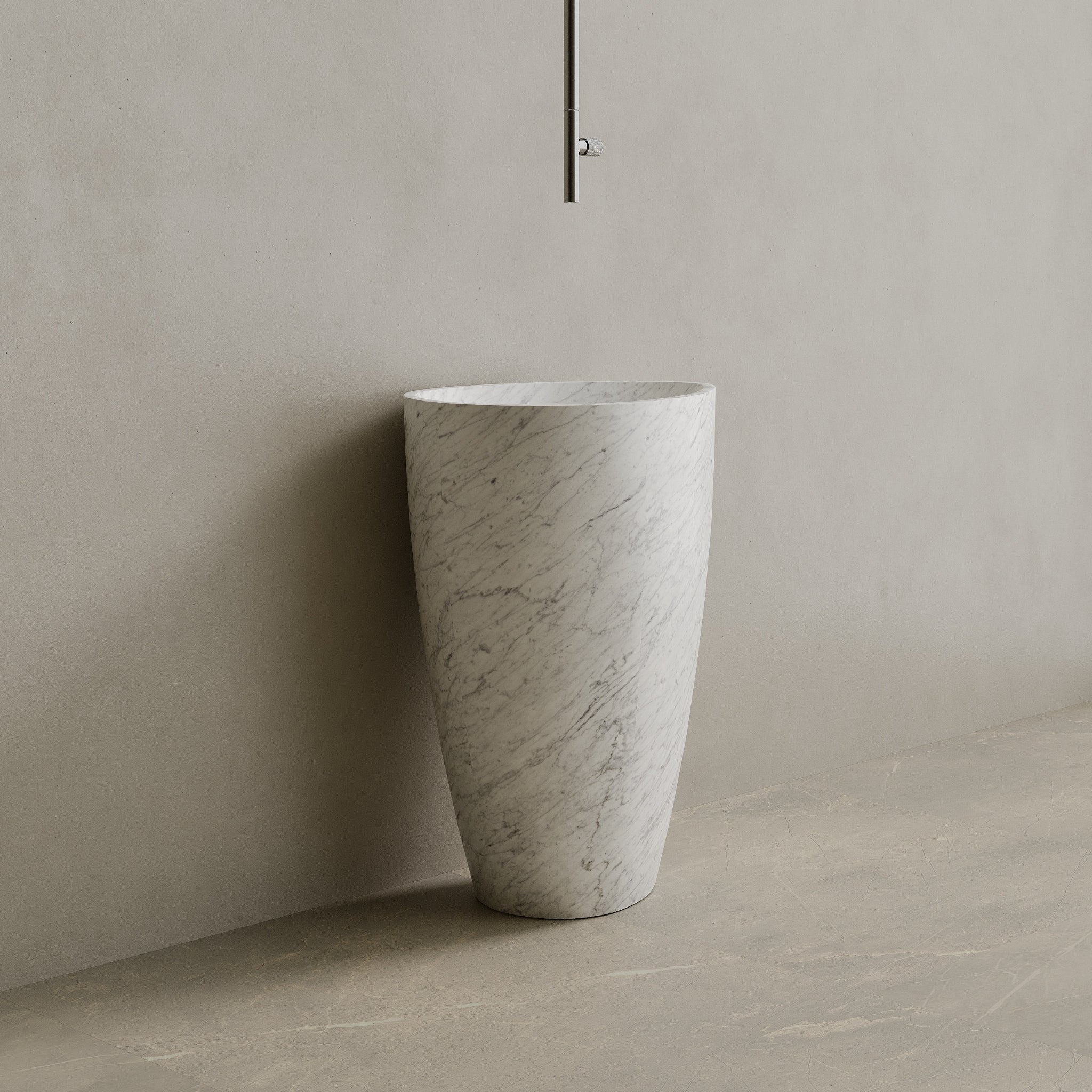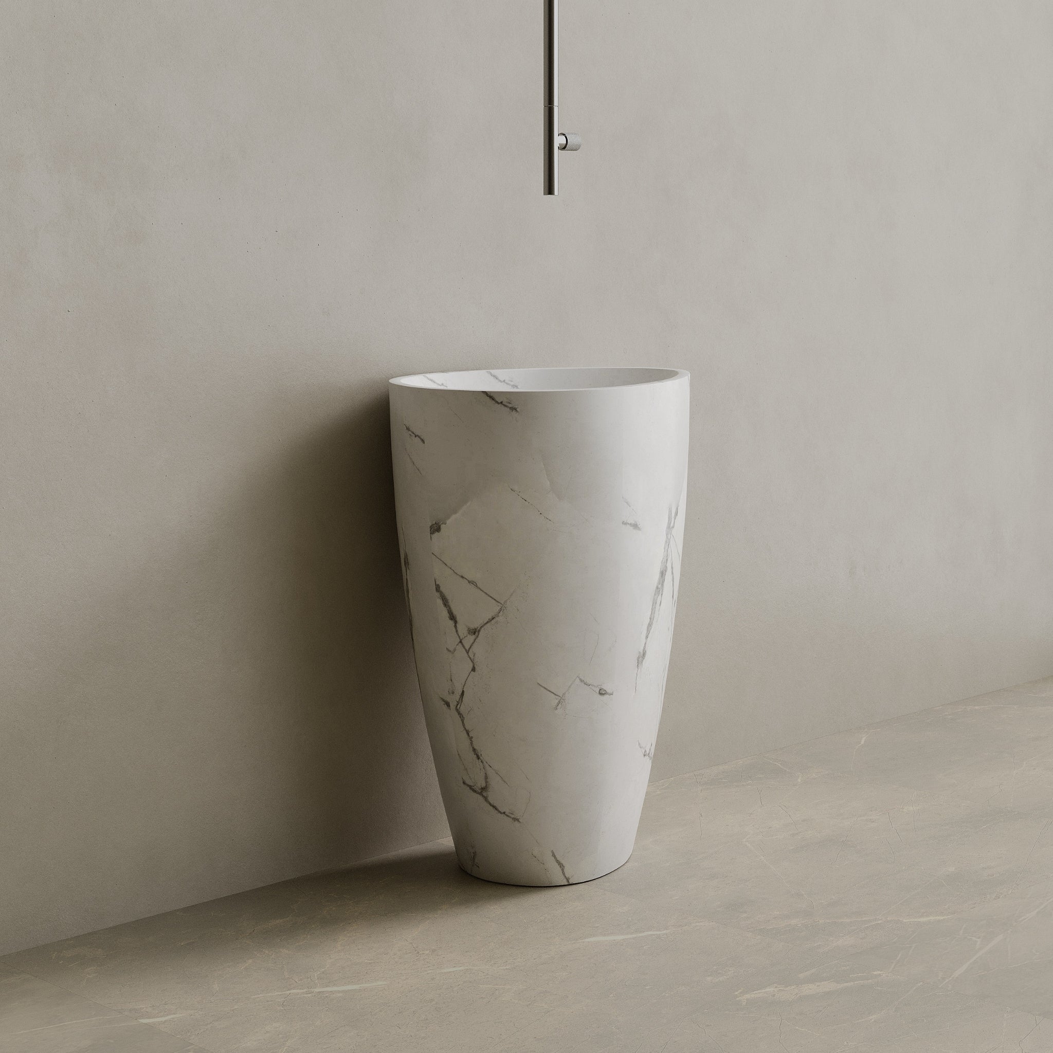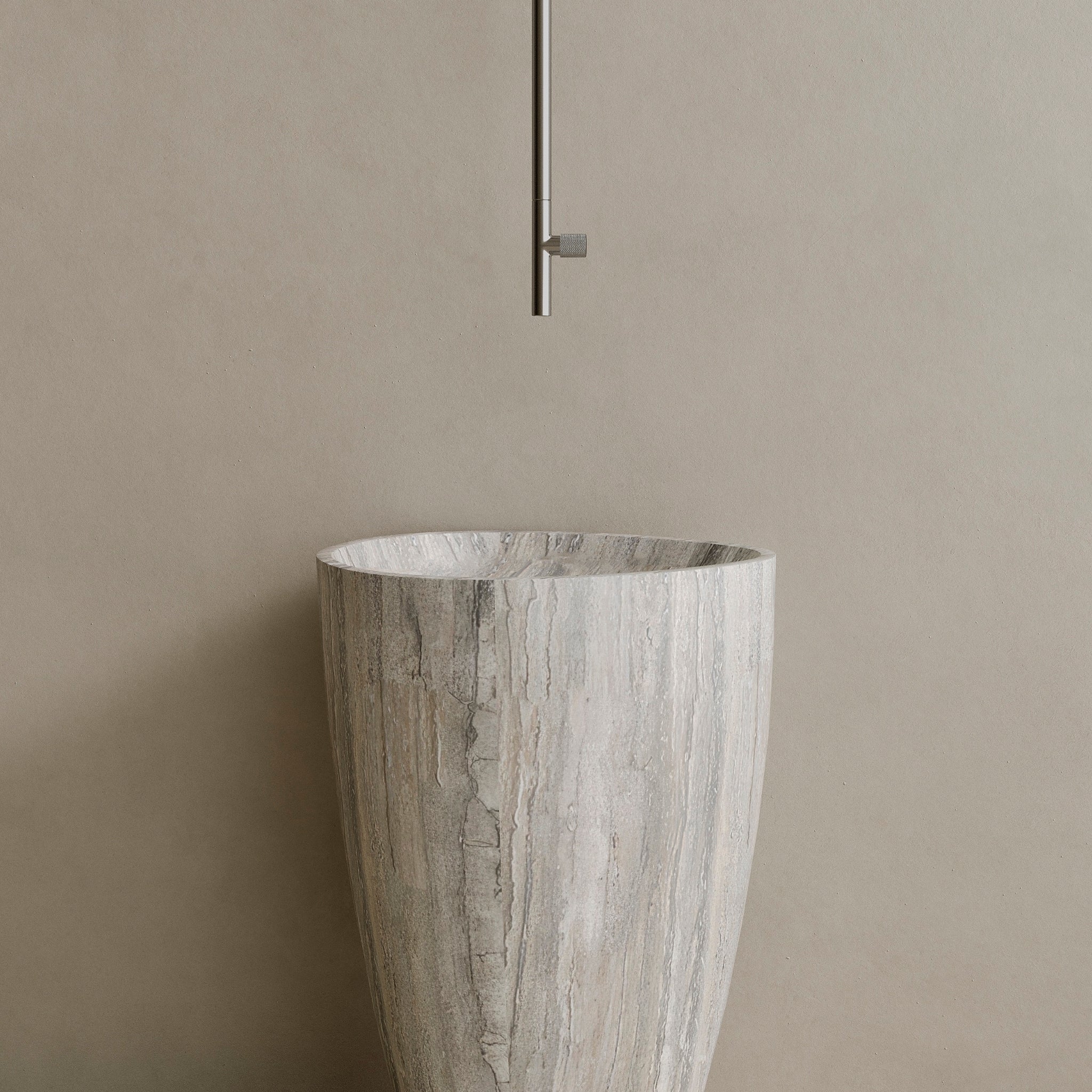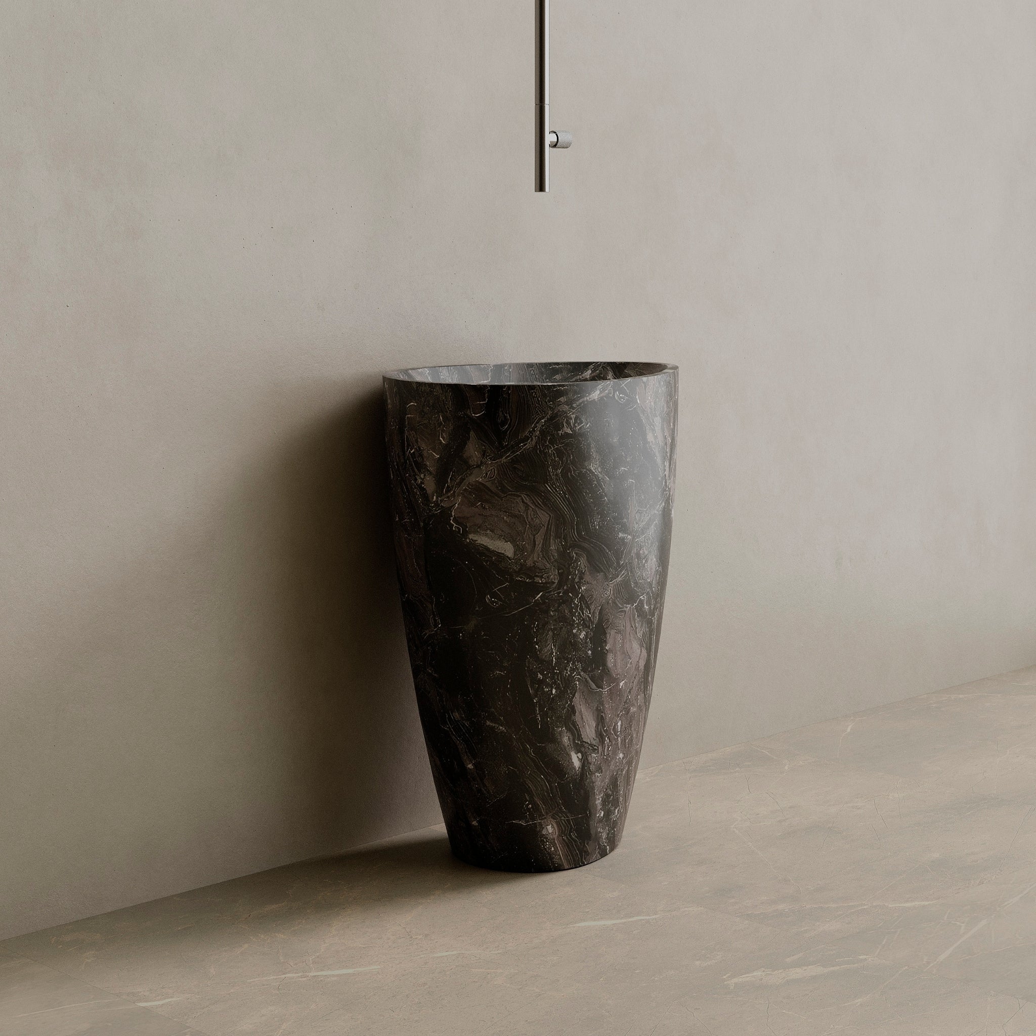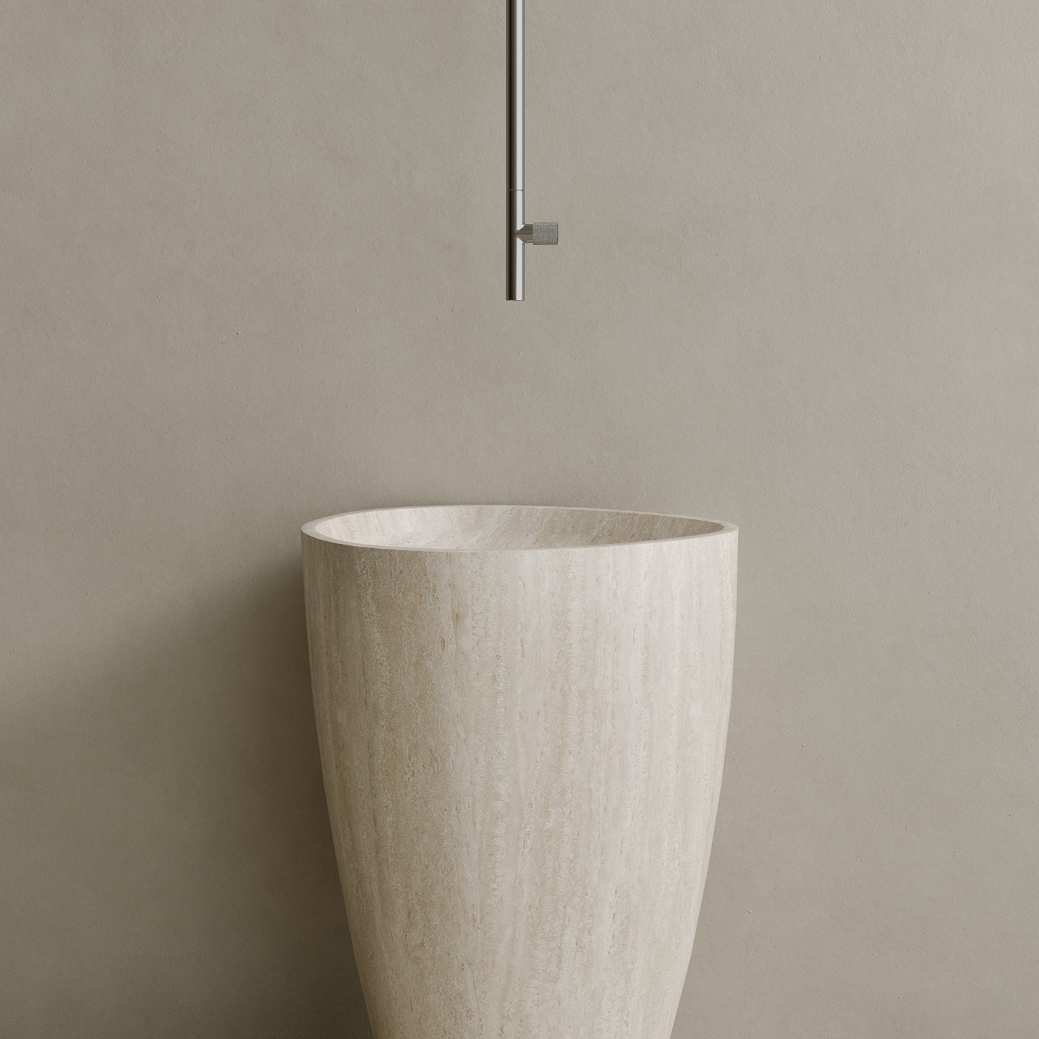 The Fluvio Freestanding Pedestal Sink offers a refined take on sculptural form and fluid design. Featuring an oval silhouette with a gracefully curved basin, this solid stone sink introduces organic symmetry and tactile softness. Handcrafted from natural stone, it forms a serene yet striking centerpiece in any contemporary bath.