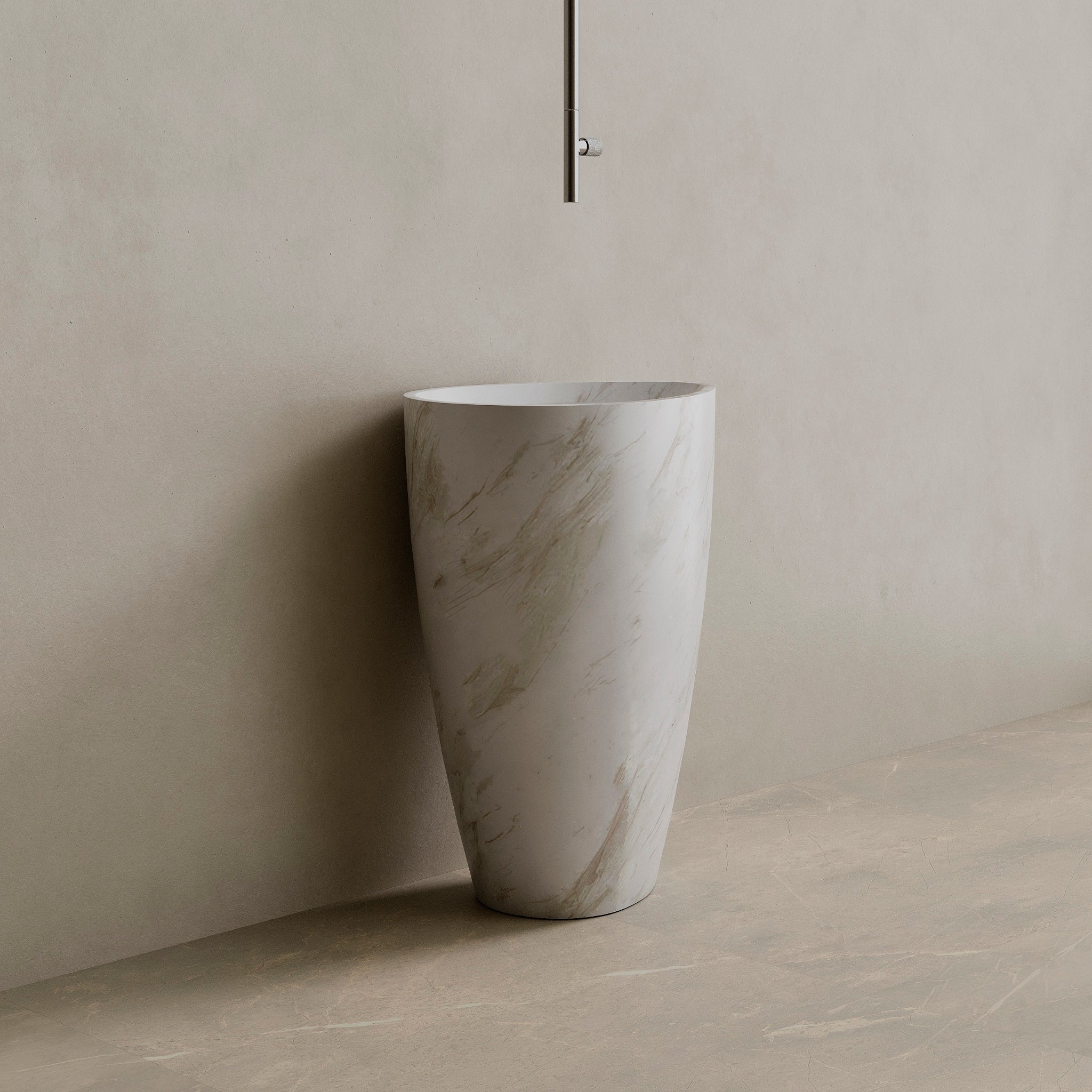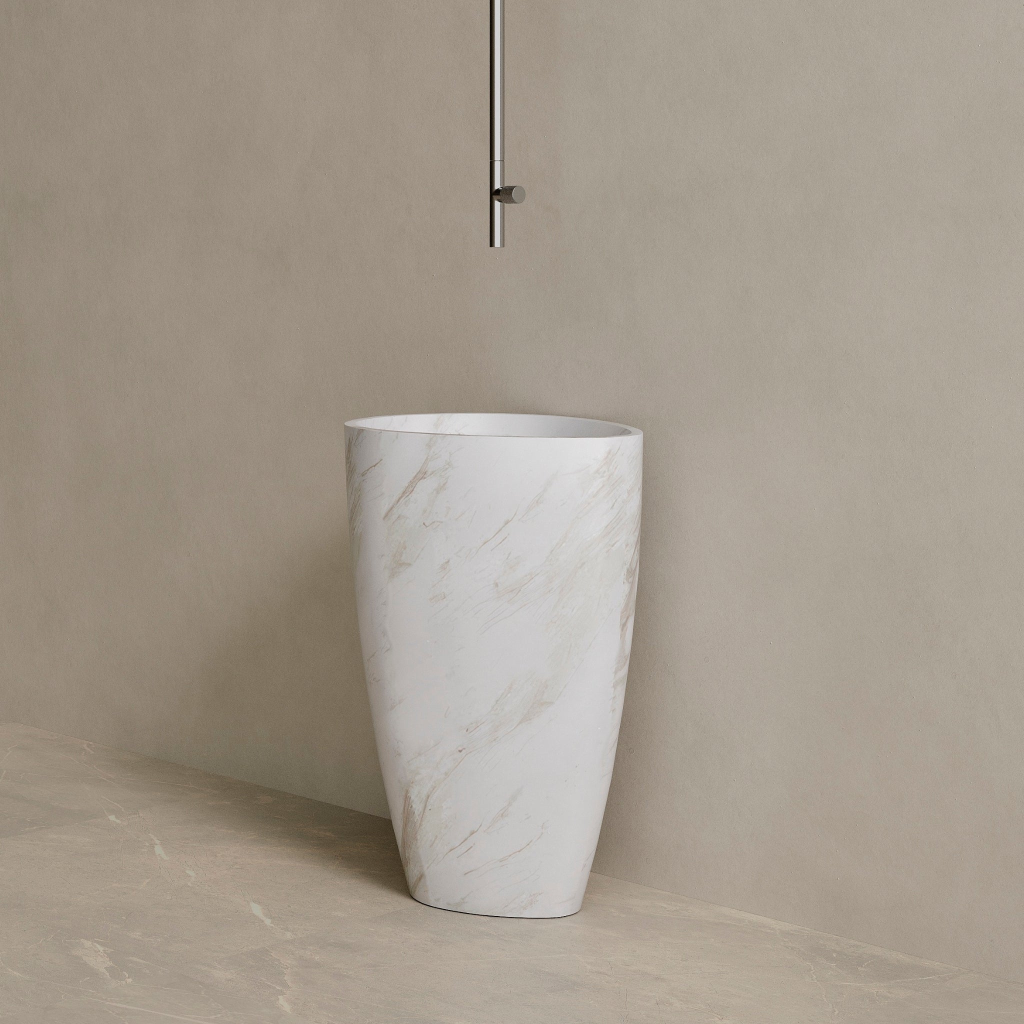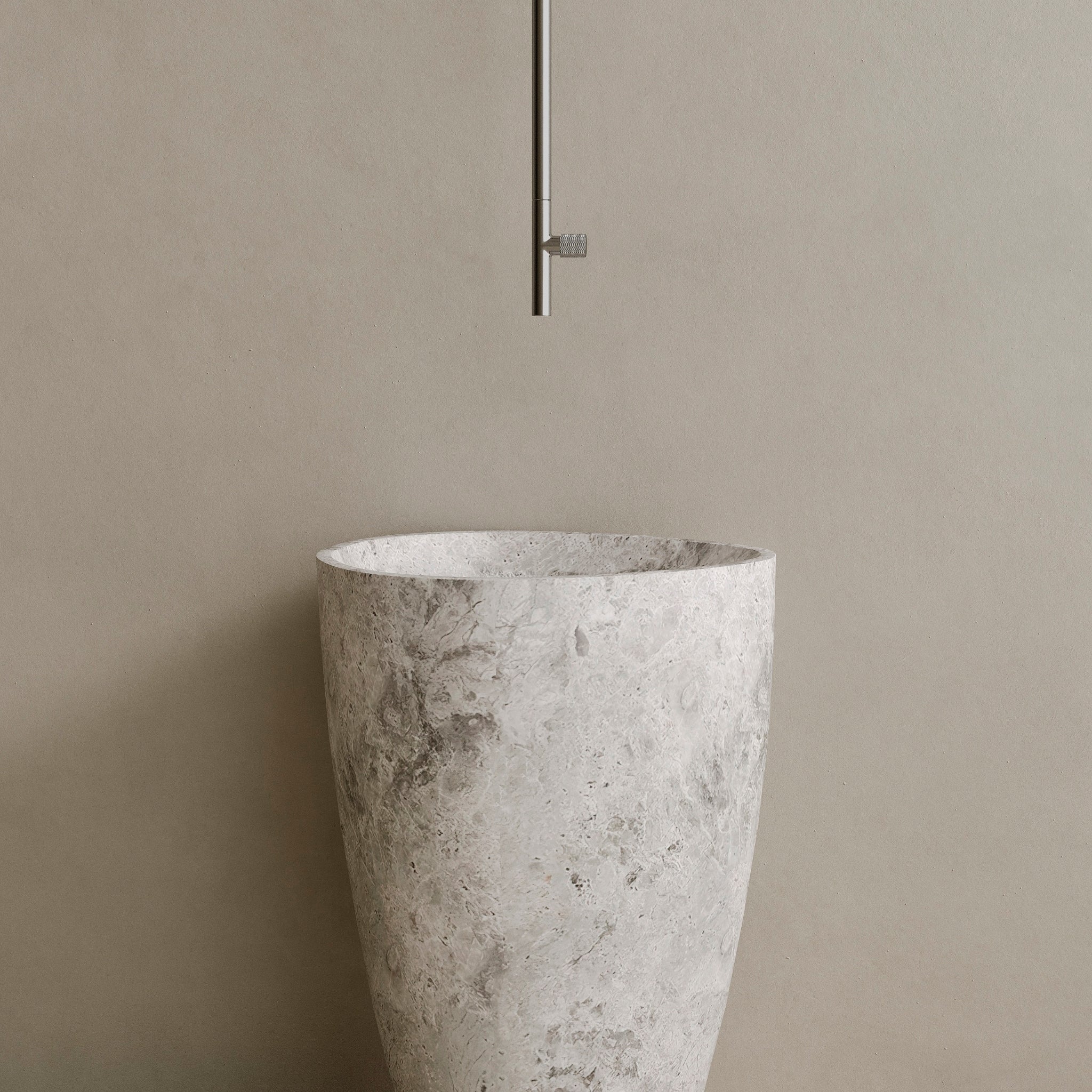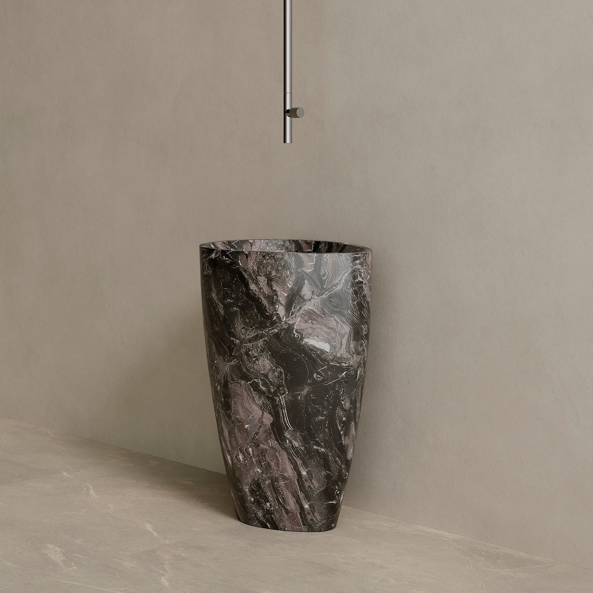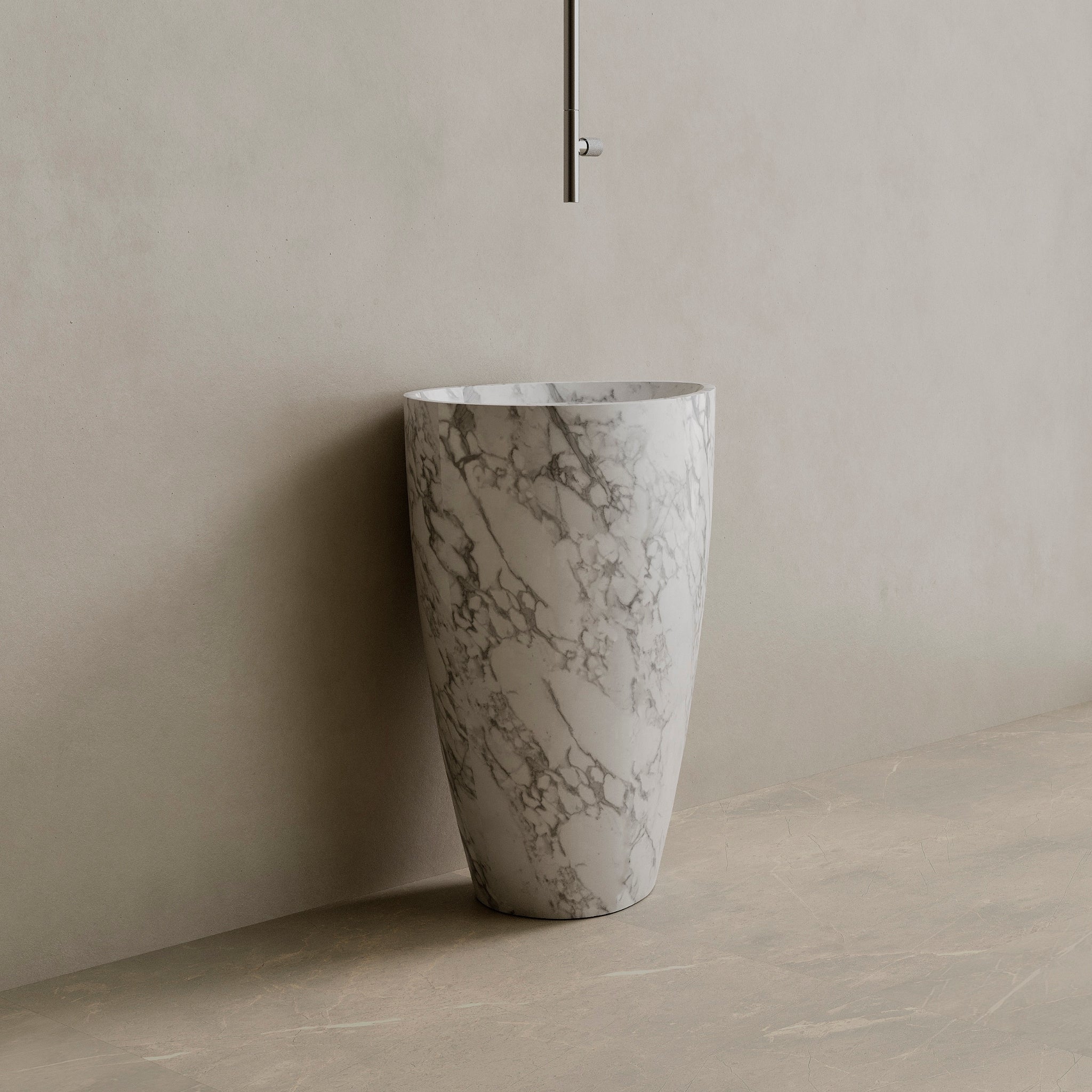 The Fluvio Freestanding Pedestal Sink offers a refined take on sculptural form and fluid design. Featuring an oval silhouette with a gracefully curved basin, this solid stone sink introduces organic symmetry and tactile softness. Handcrafted from natural stone, it forms a serene yet striking centerpiece in any contemporary bath.