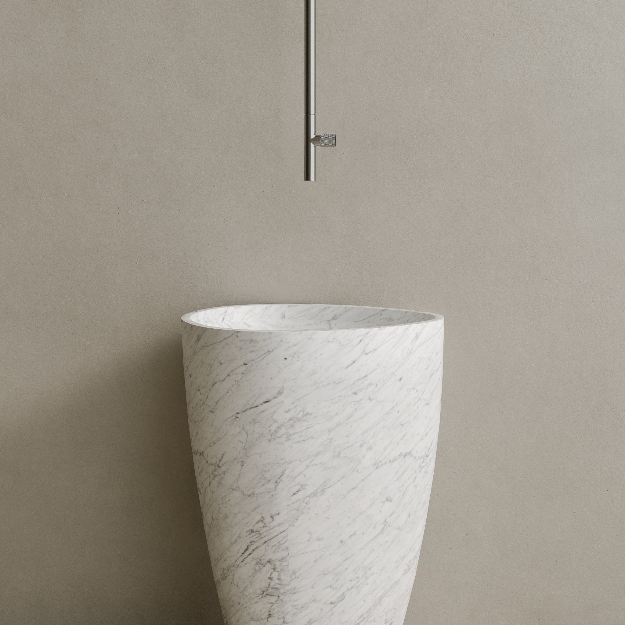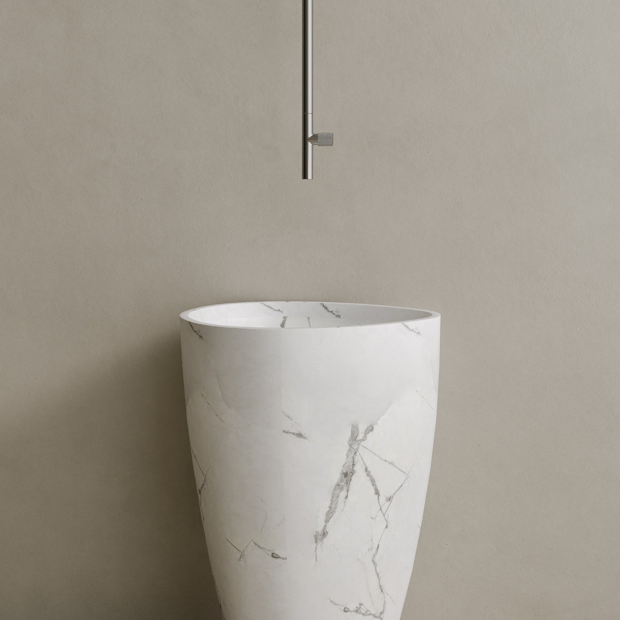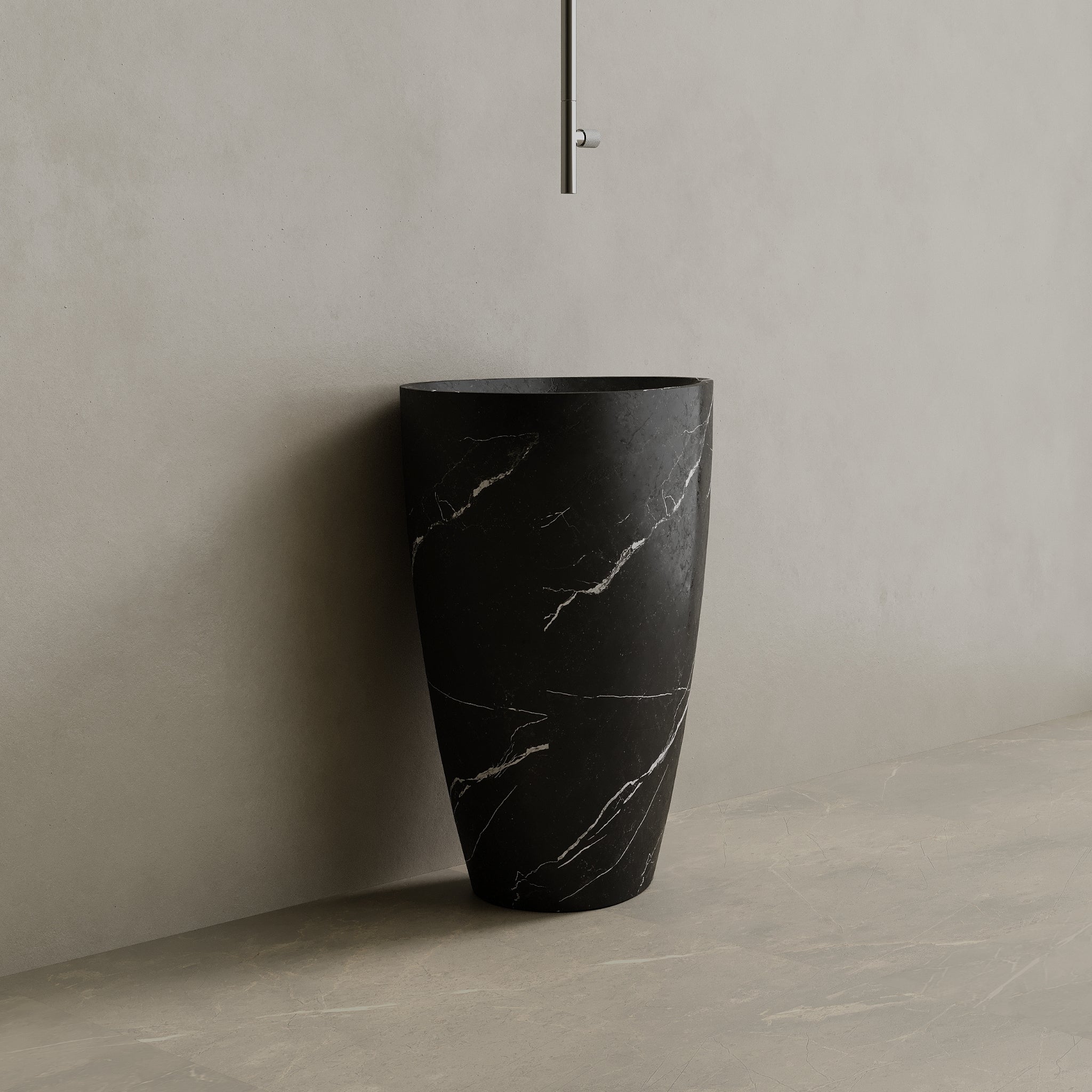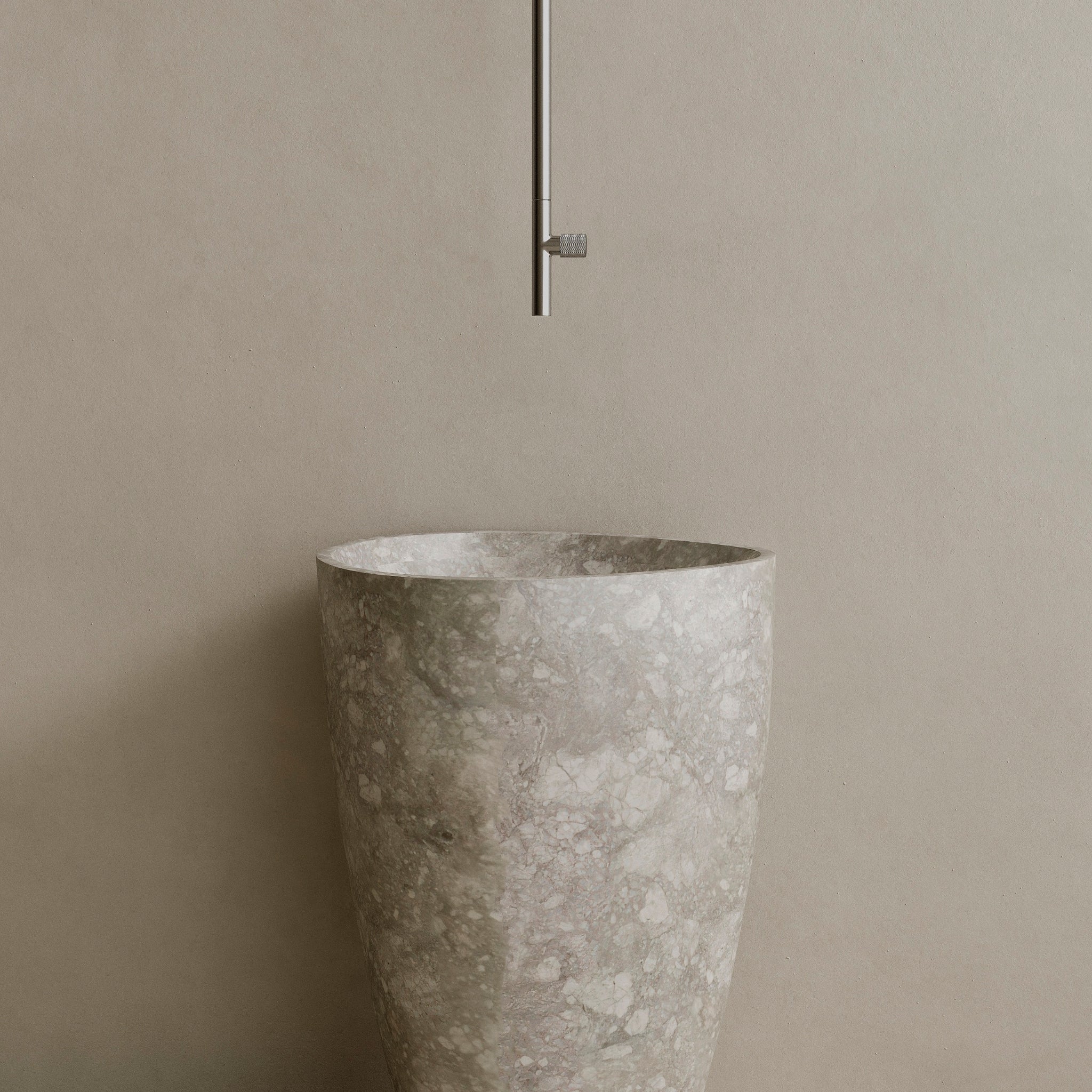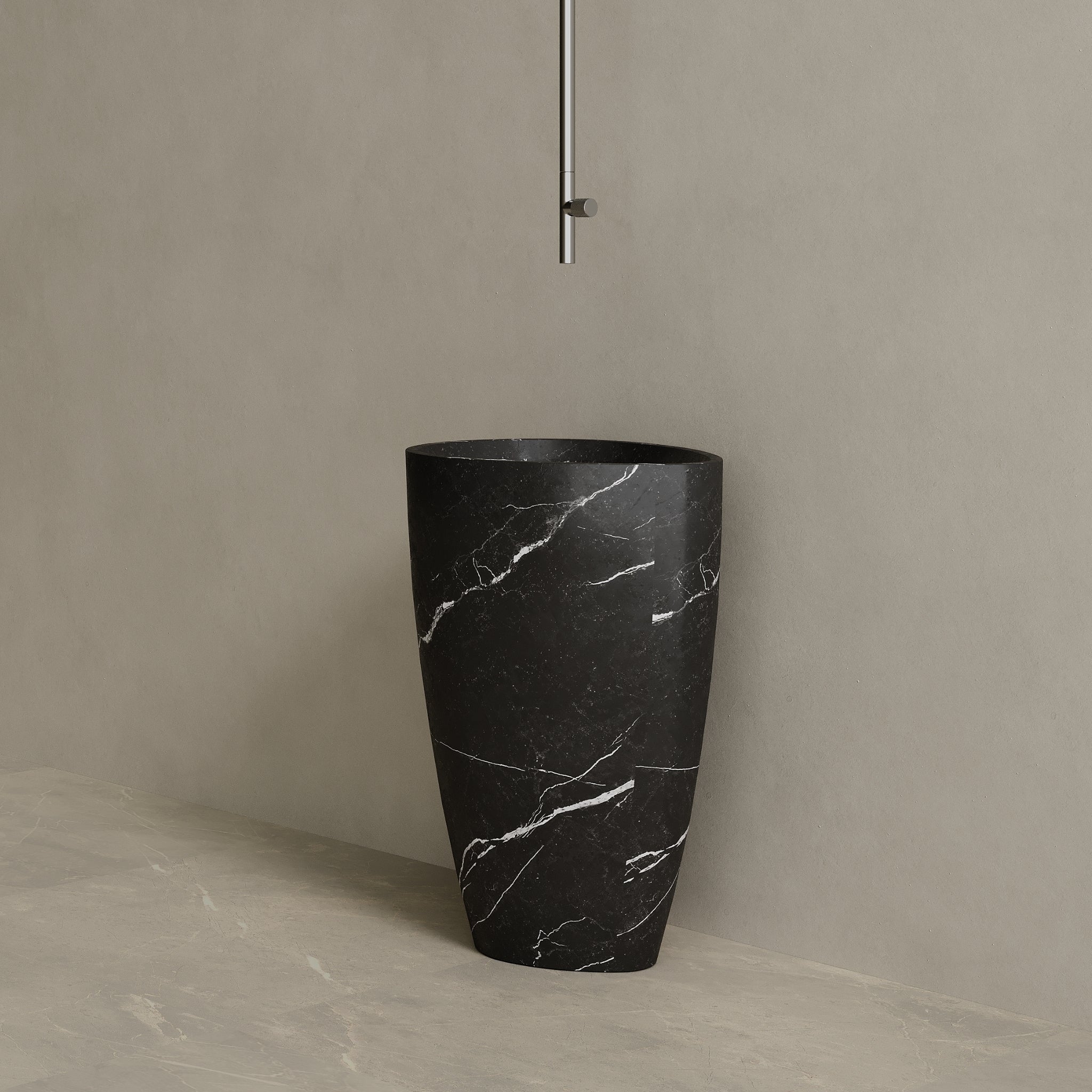 The Fluvio Freestanding Pedestal Sink offers a refined take on sculptural form and fluid design. Featuring an oval silhouette with a gracefully curved basin, this solid stone sink introduces organic symmetry and tactile softness. Handcrafted from natural stone, it forms a serene yet striking centerpiece in any contemporary bath.