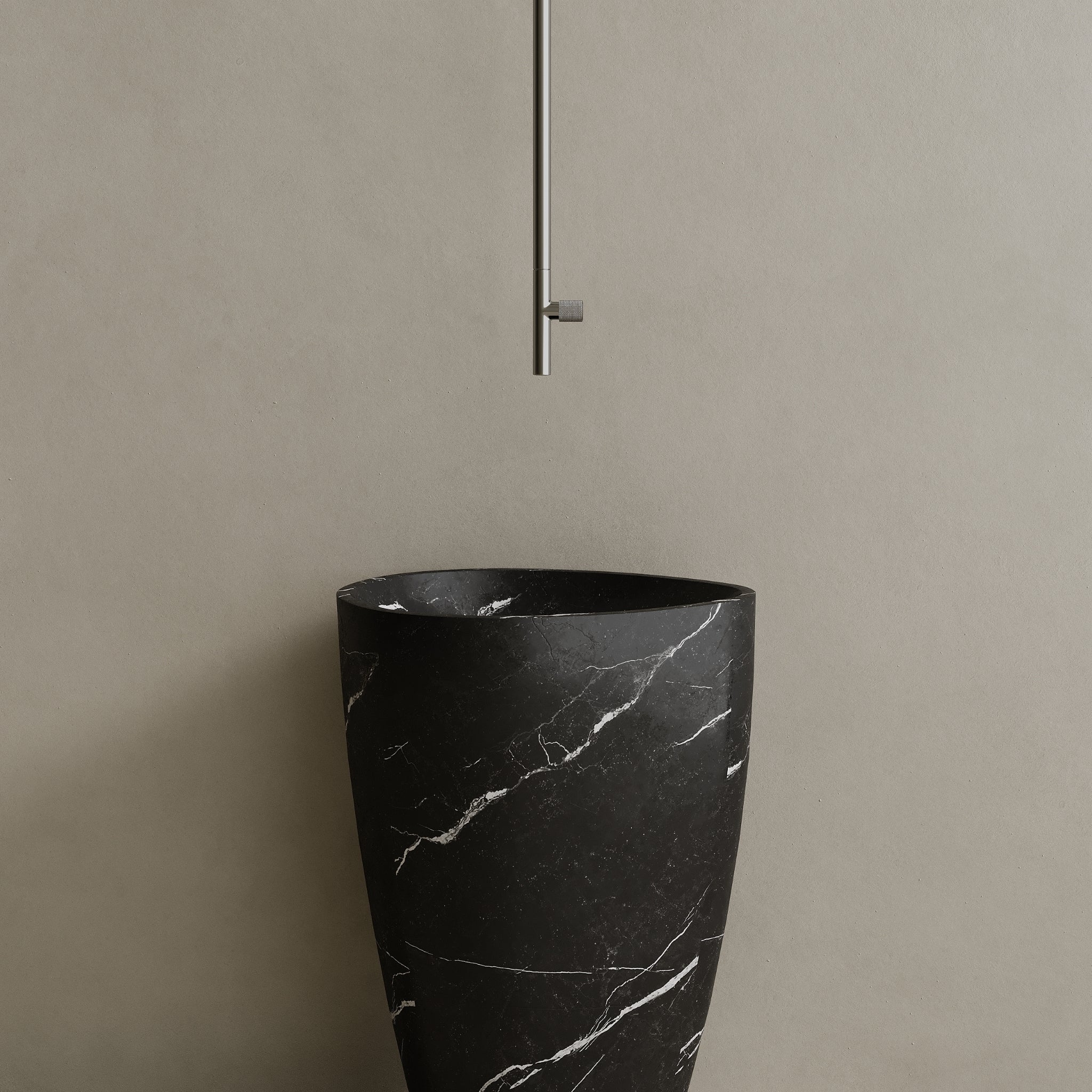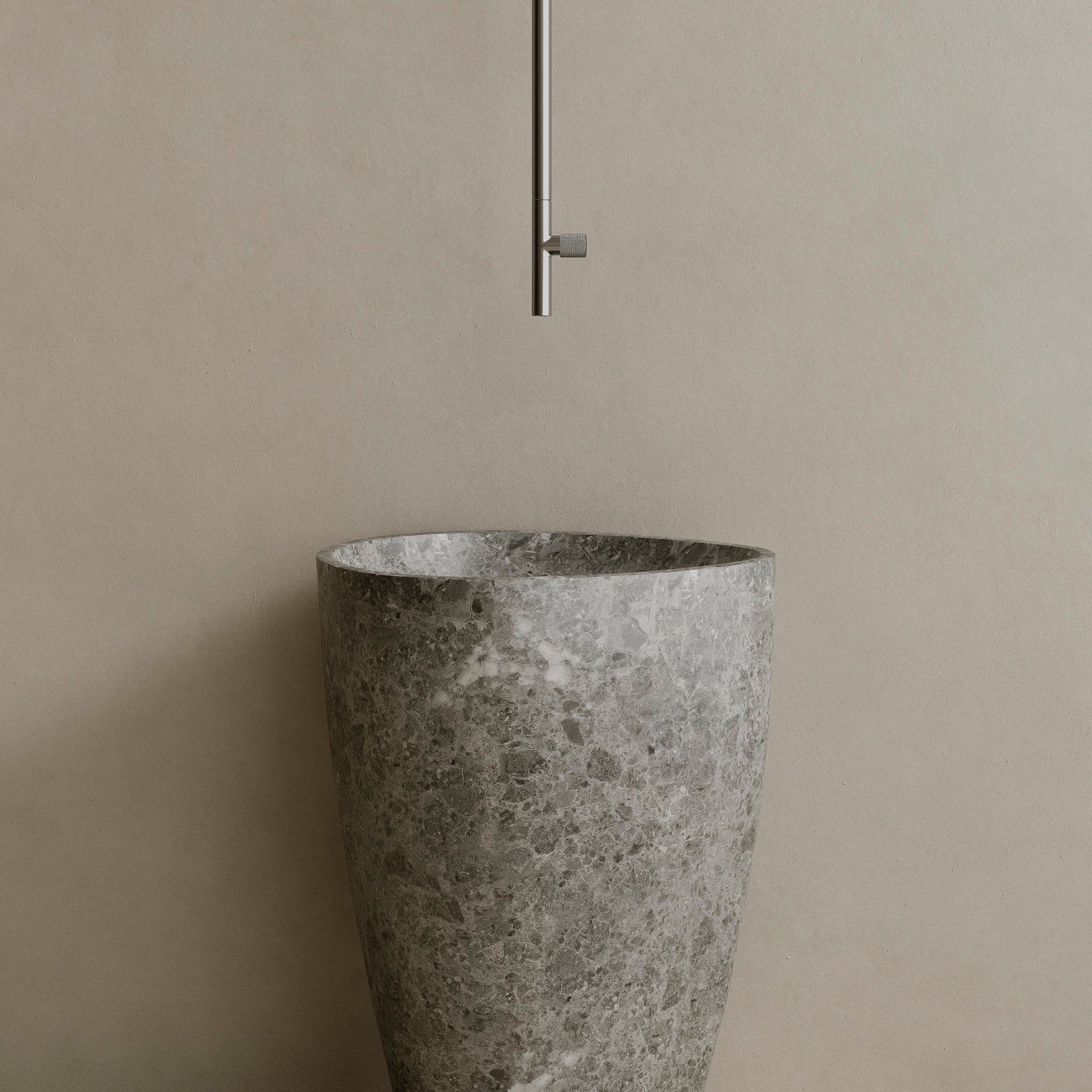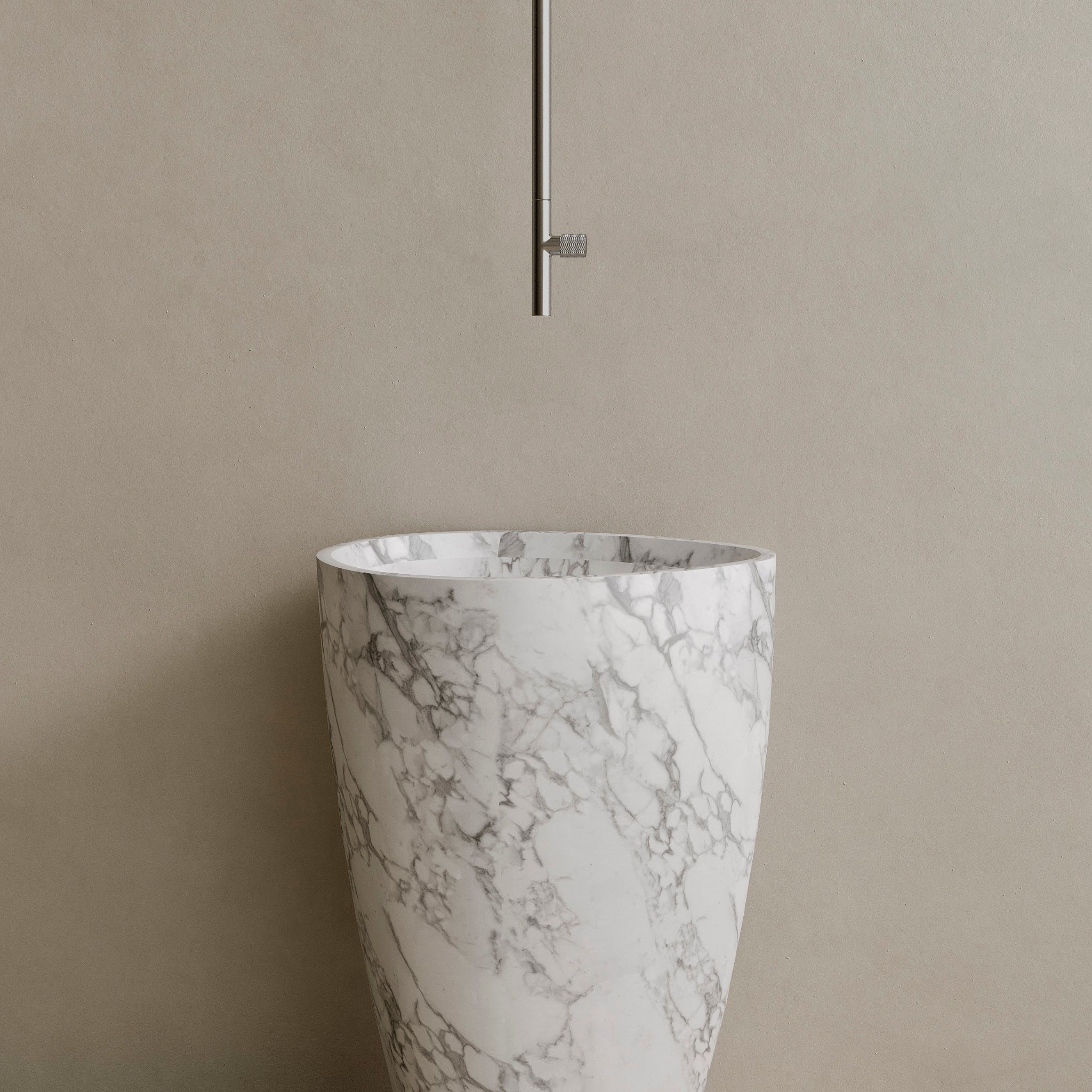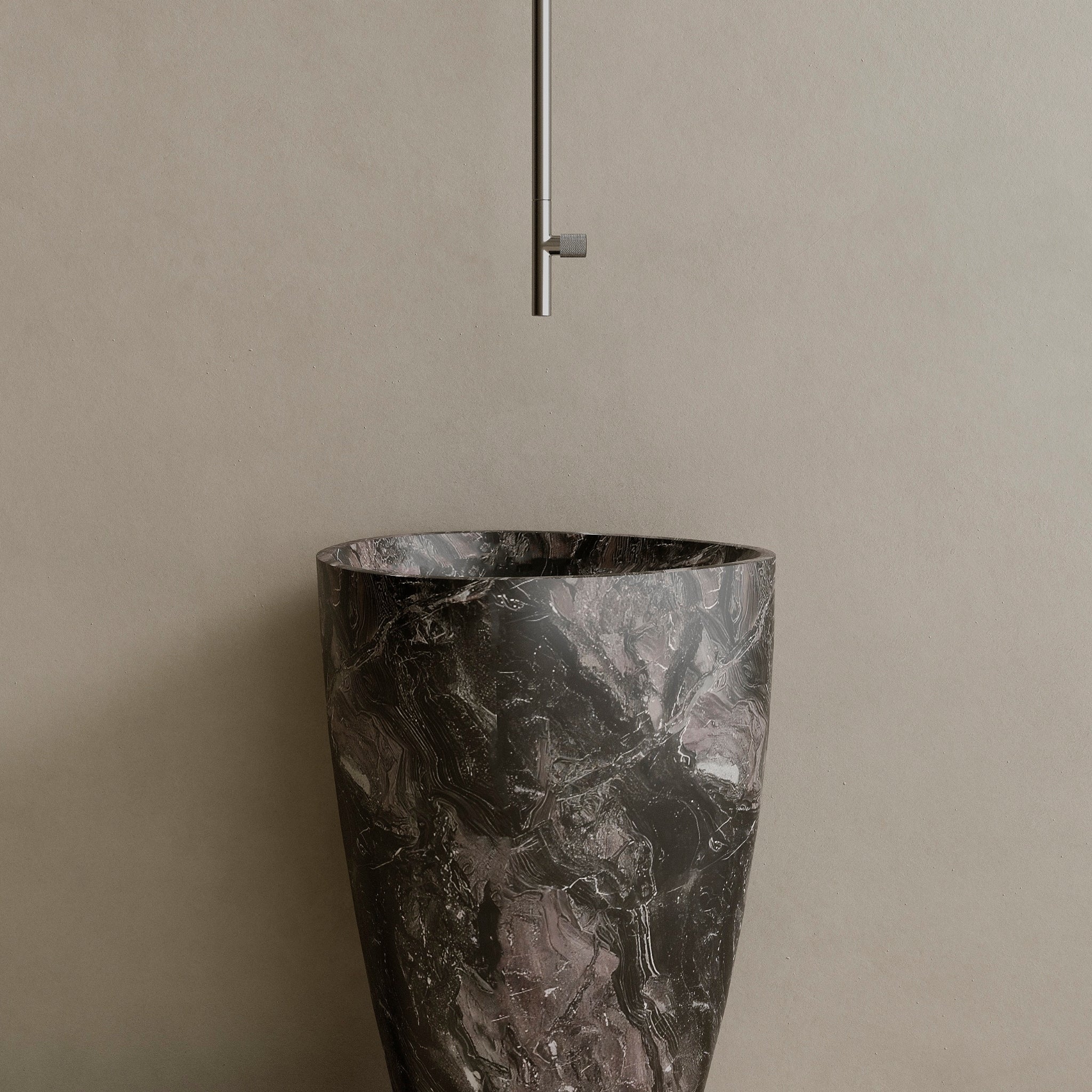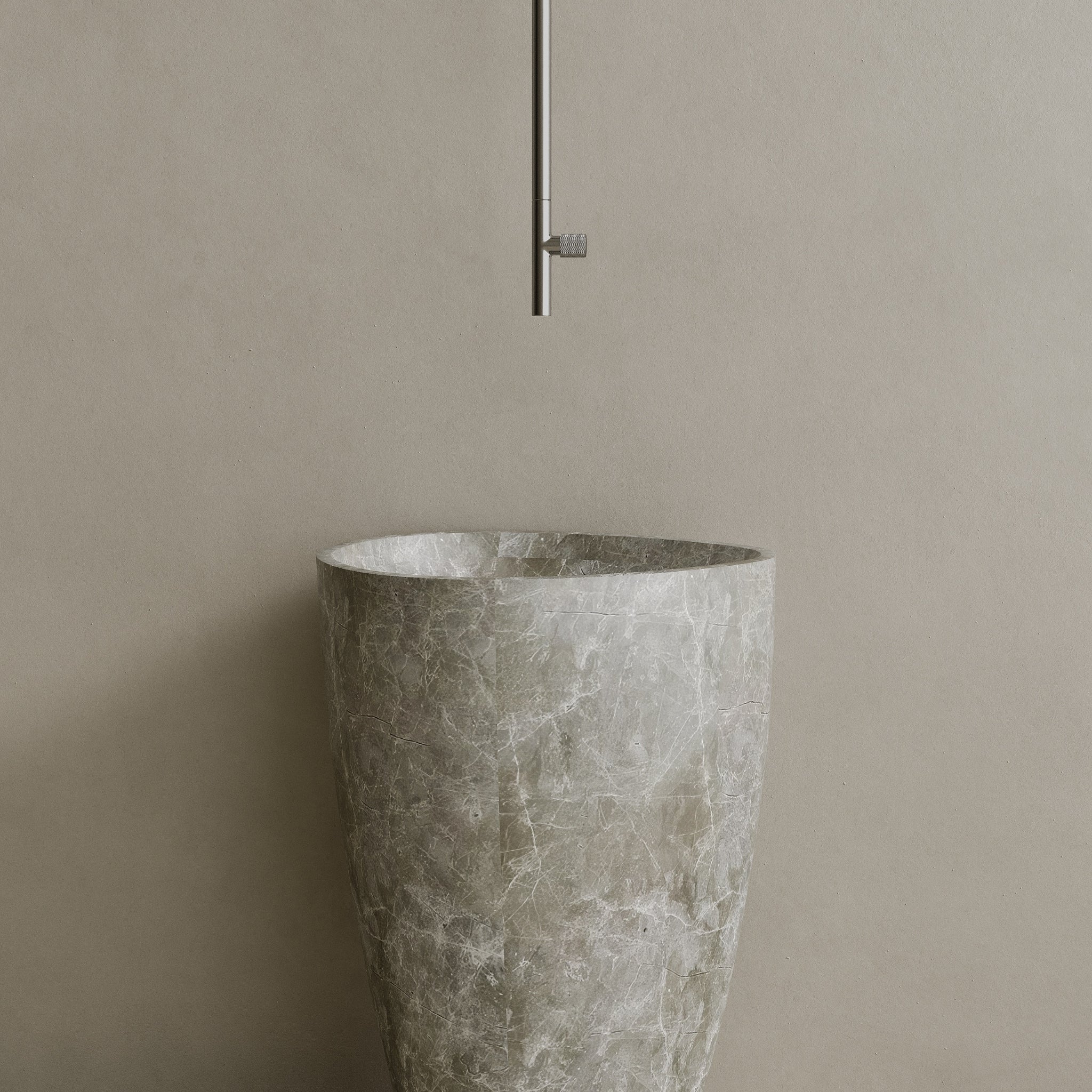 The Fluvio Freestanding Pedestal Sink offers a refined take on sculptural form and fluid design. Featuring an oval silhouette with a gracefully curved basin, this solid stone sink introduces organic symmetry and tactile softness. Handcrafted from natural stone, it forms a serene yet striking centerpiece in any contemporary bath.