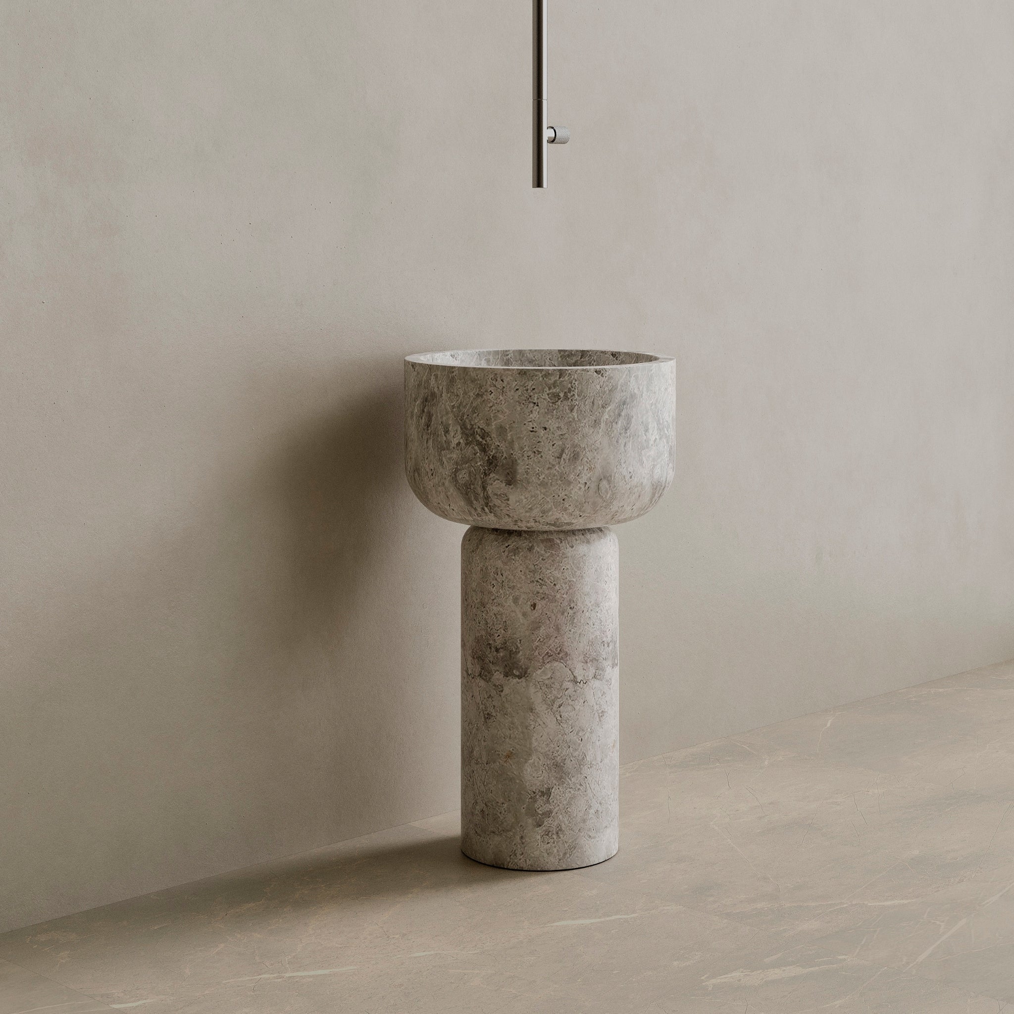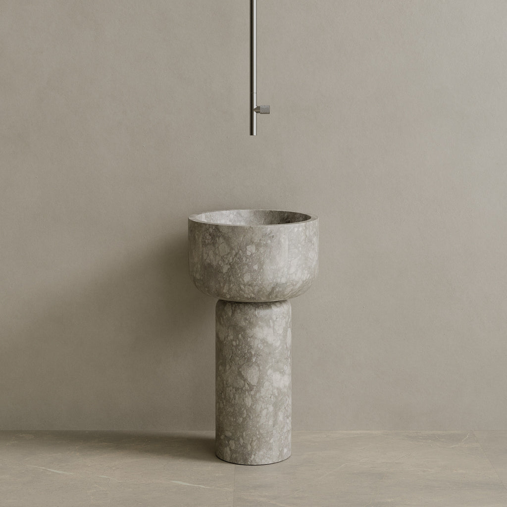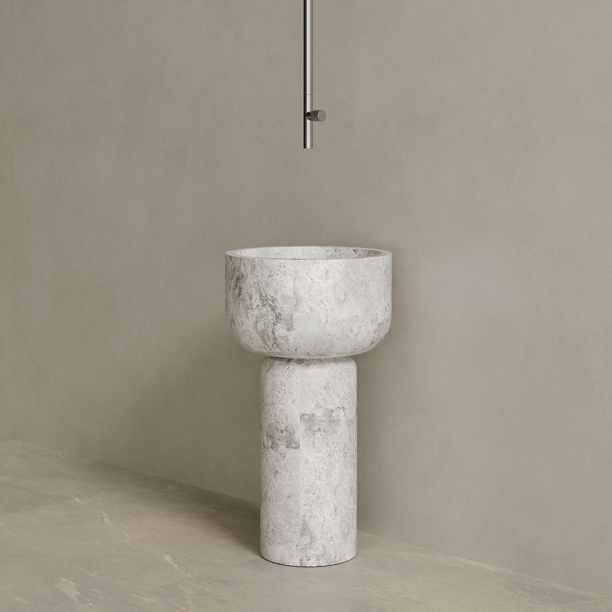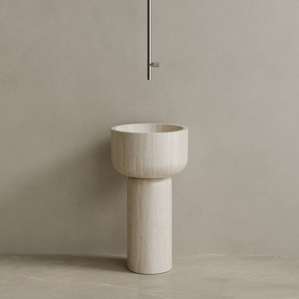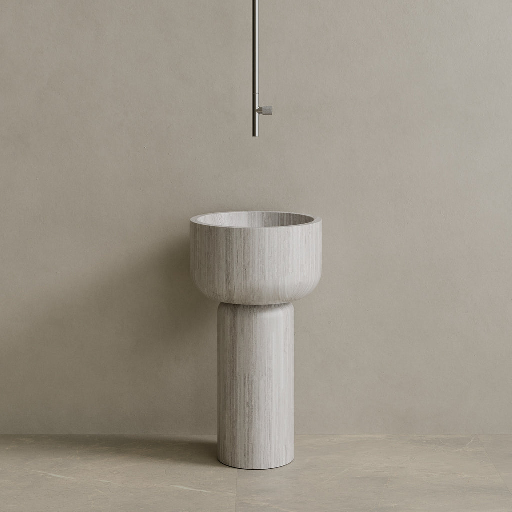 The Veso Freestanding Pedestal Sink introduces sculptural form with its deep, rounded basin and seamless cylindrical base. Crafted from solid stone, this monolithic sink merges classical vessel proportions with contemporary minimalism. Its softened geometry and bold silhouette create a striking focal point for refined bath spaces.
