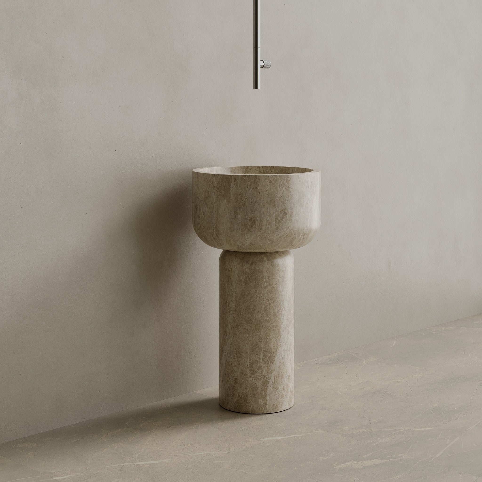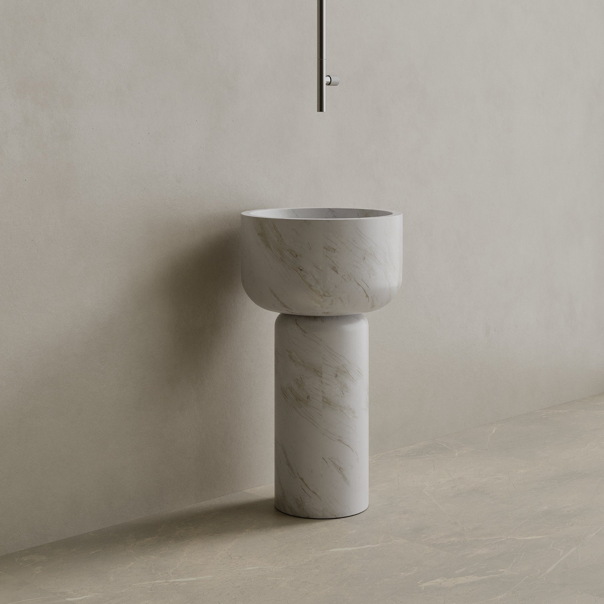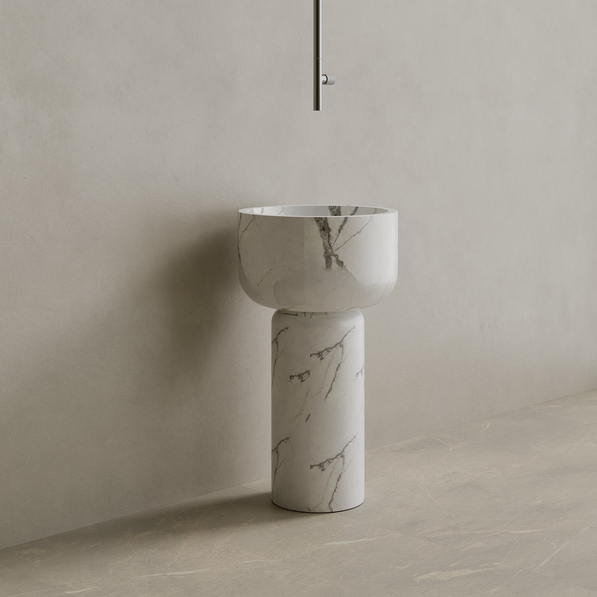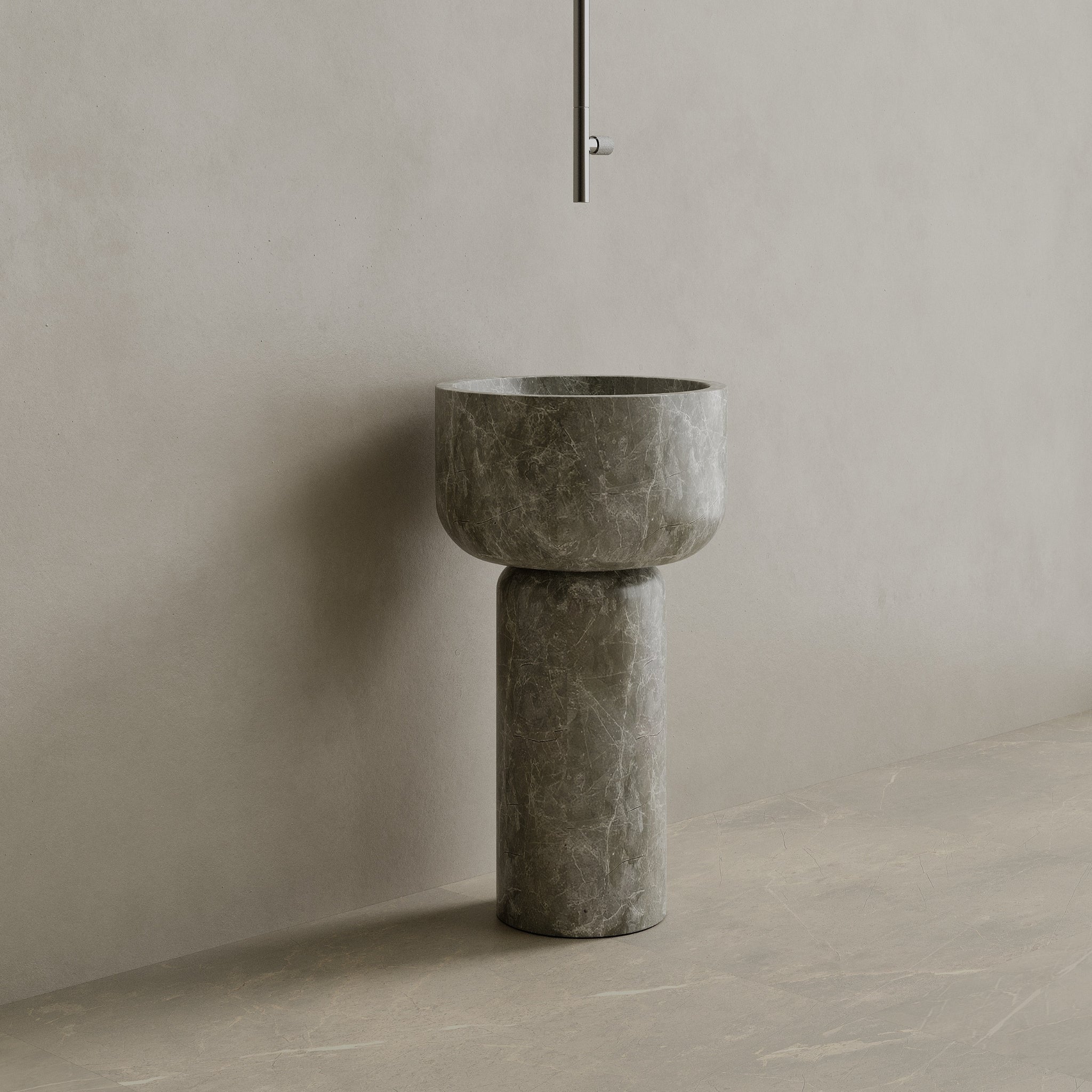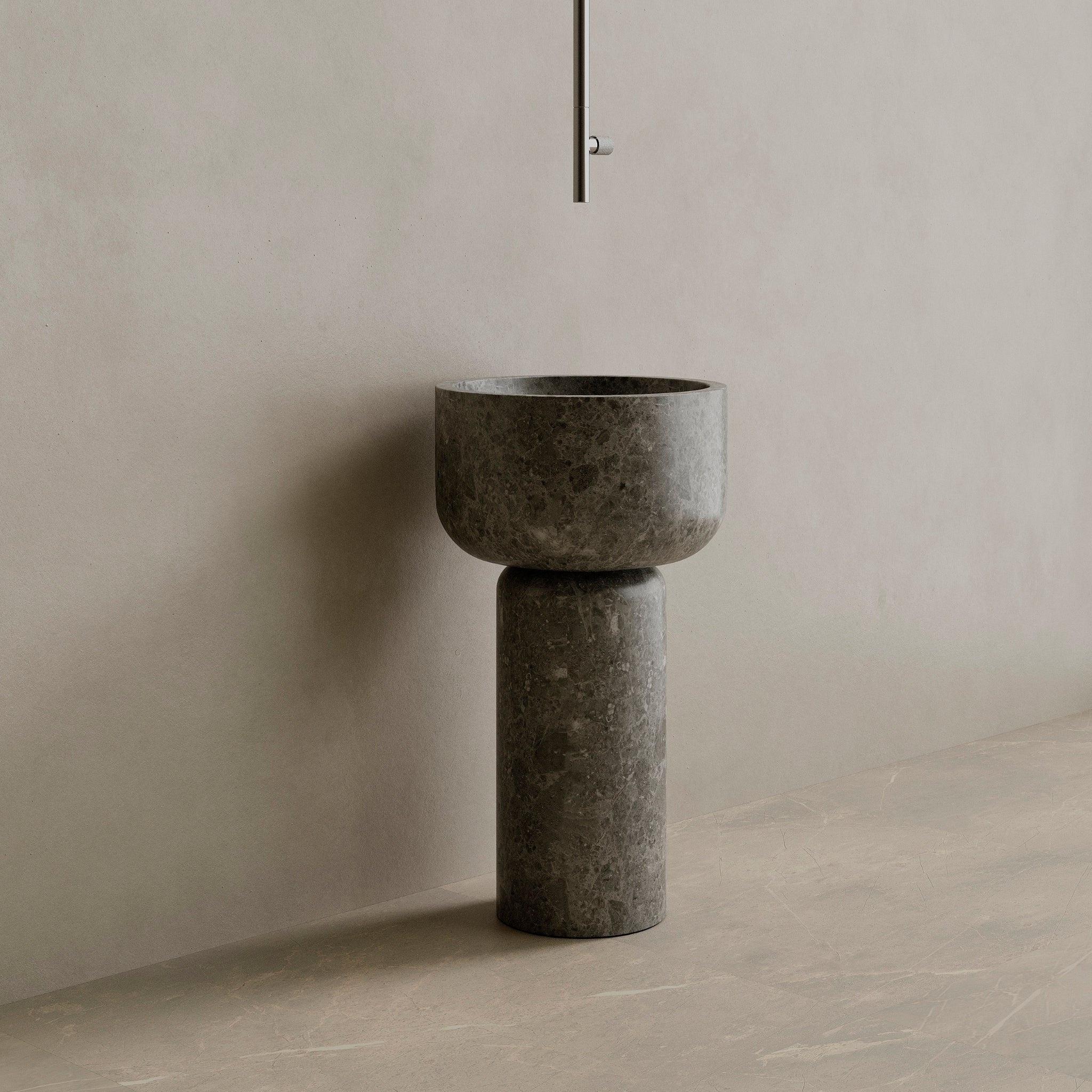 The Veso Freestanding Pedestal Sink introduces sculptural form with its deep, rounded basin and seamless cylindrical base. Crafted from solid stone, this monolithic sink merges classical vessel proportions with contemporary minimalism. Its softened geometry and bold silhouette create a striking focal point for refined bath spaces.