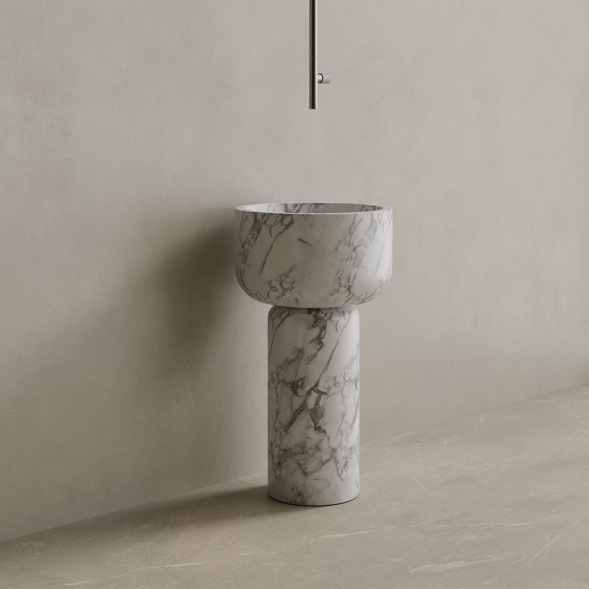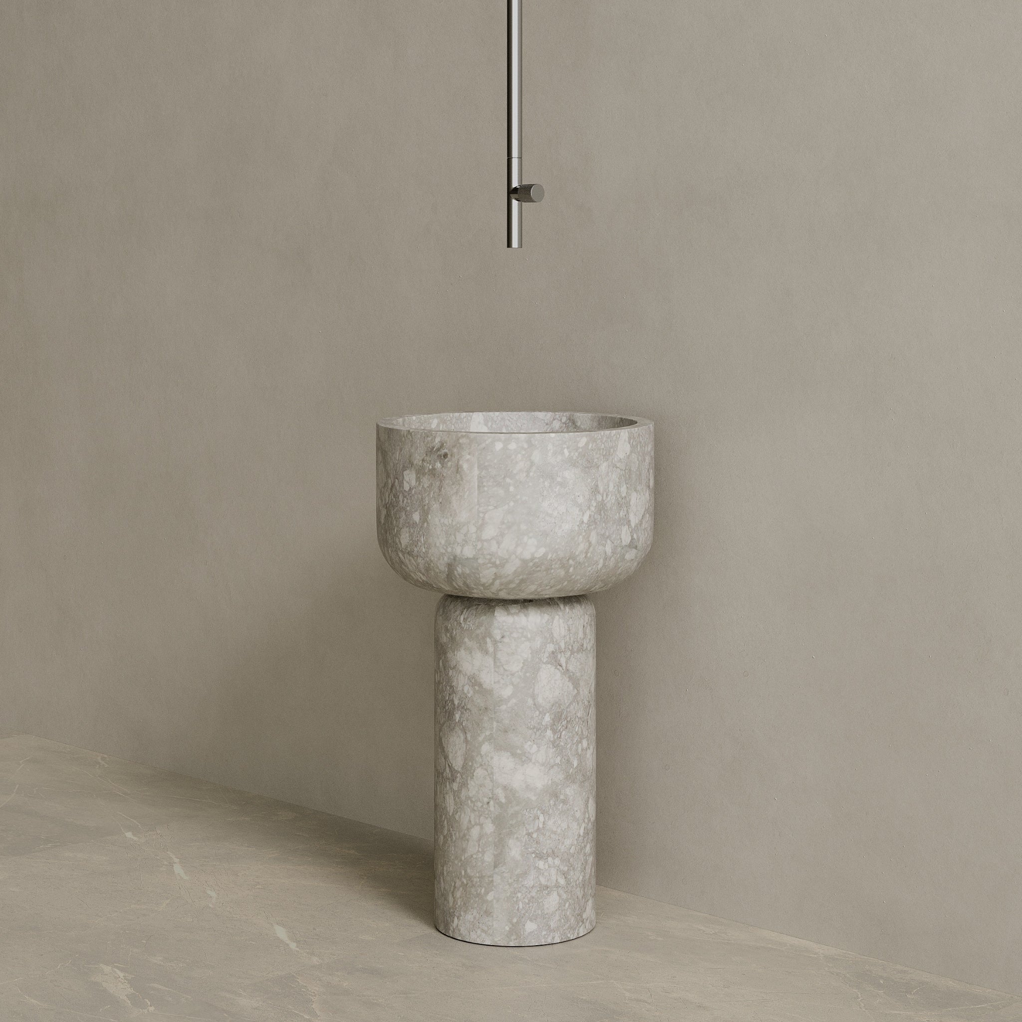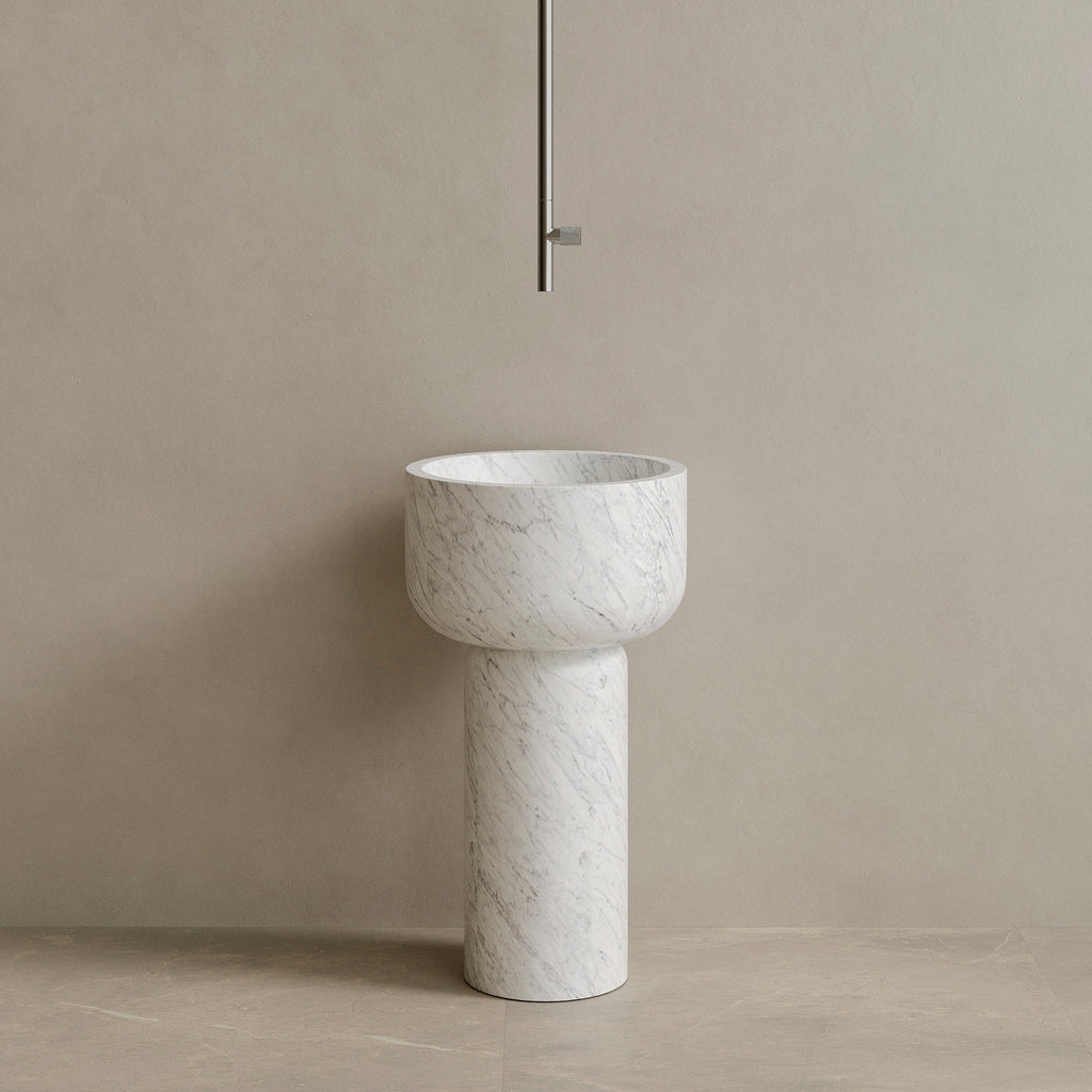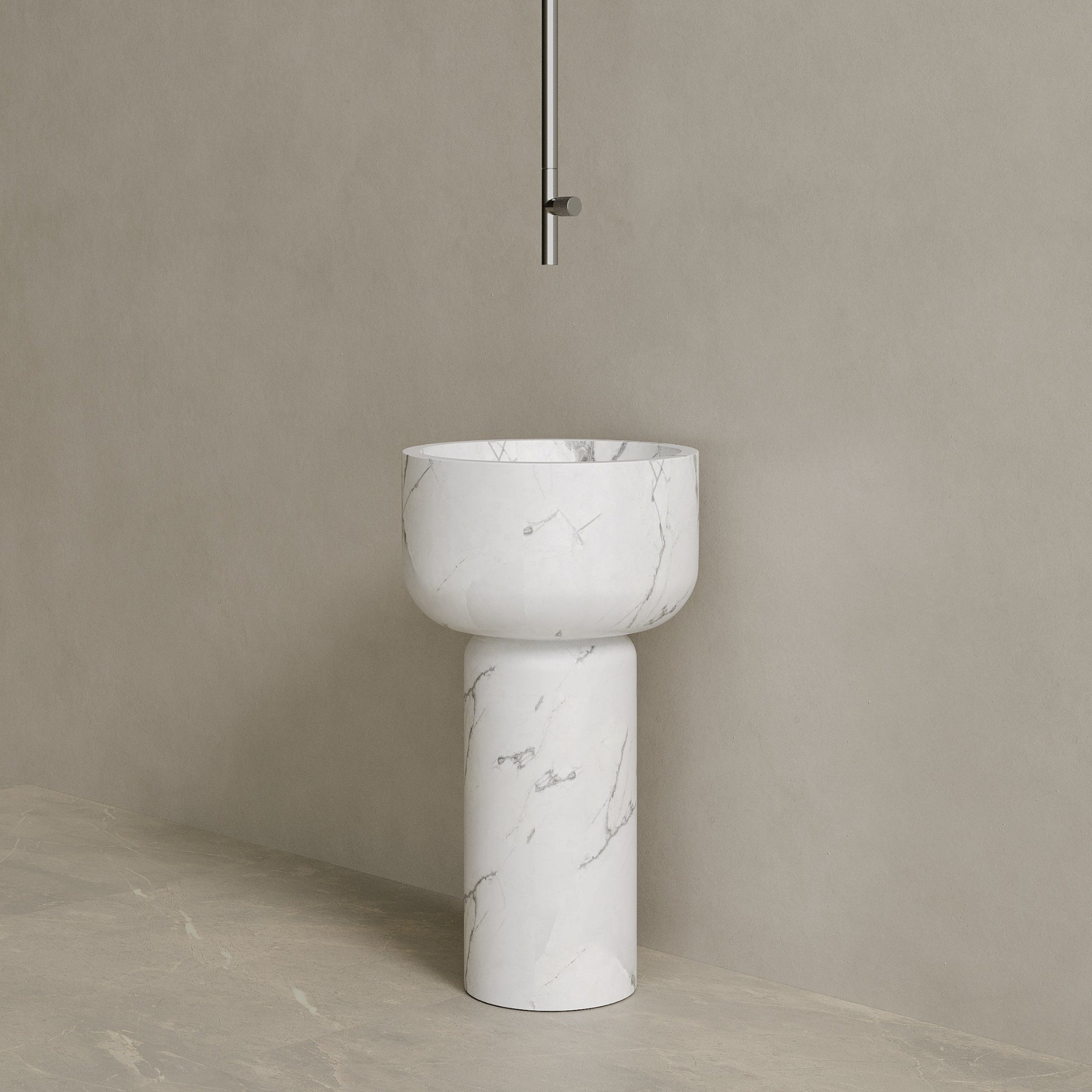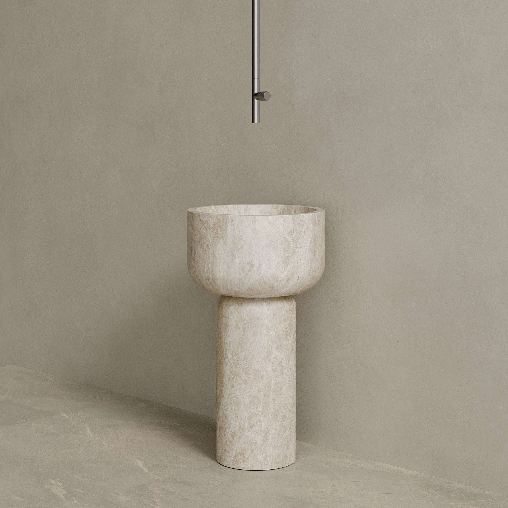 The Veso Freestanding Pedestal Sink introduces sculptural form with its deep, rounded basin and seamless cylindrical base. Crafted from solid stone, this monolithic sink merges classical vessel proportions with contemporary minimalism. Its softened geometry and bold silhouette create a striking focal point for refined bath spaces.