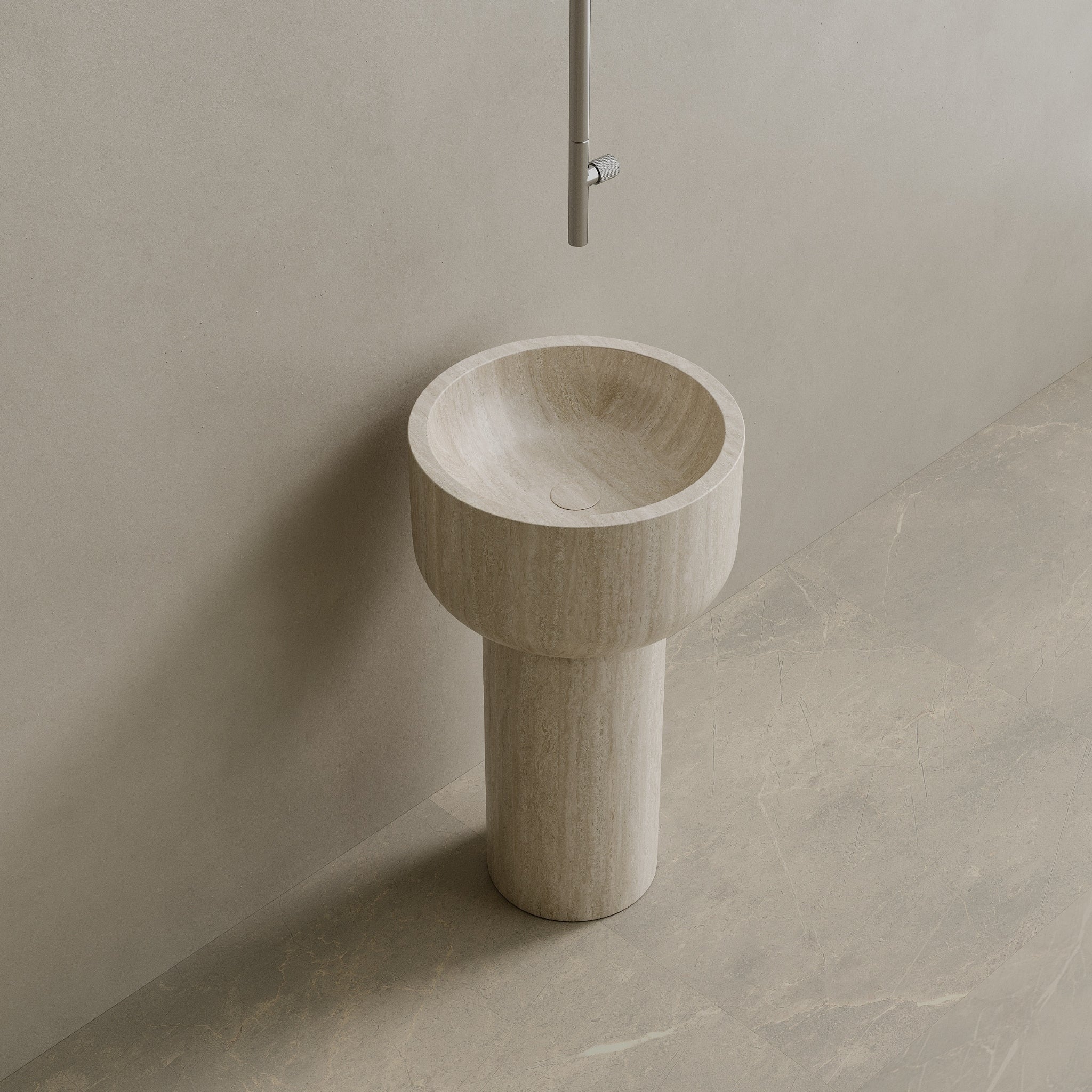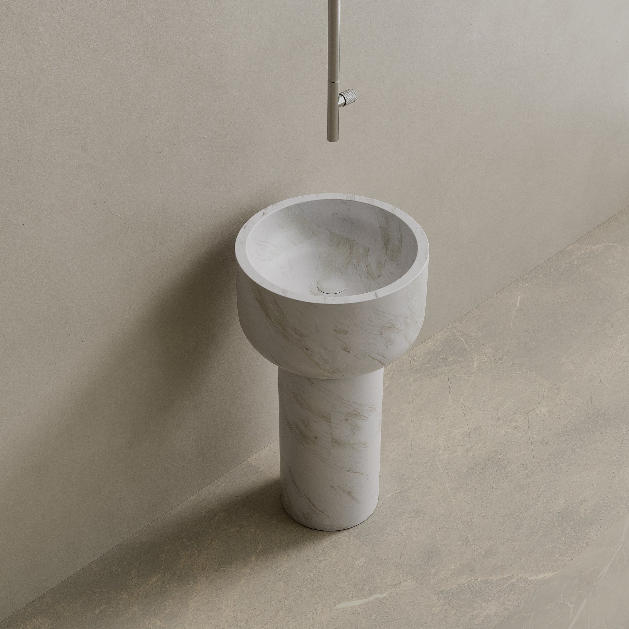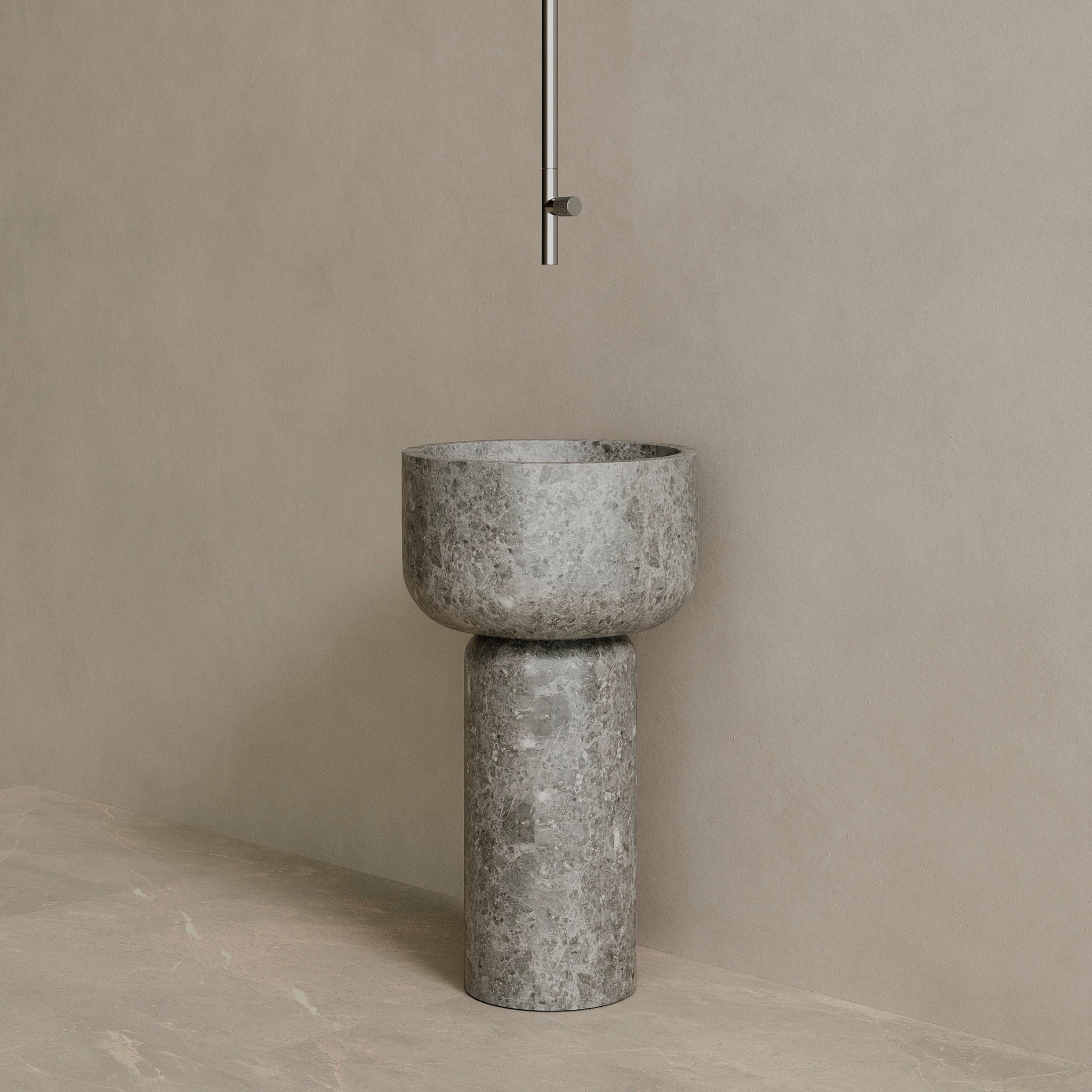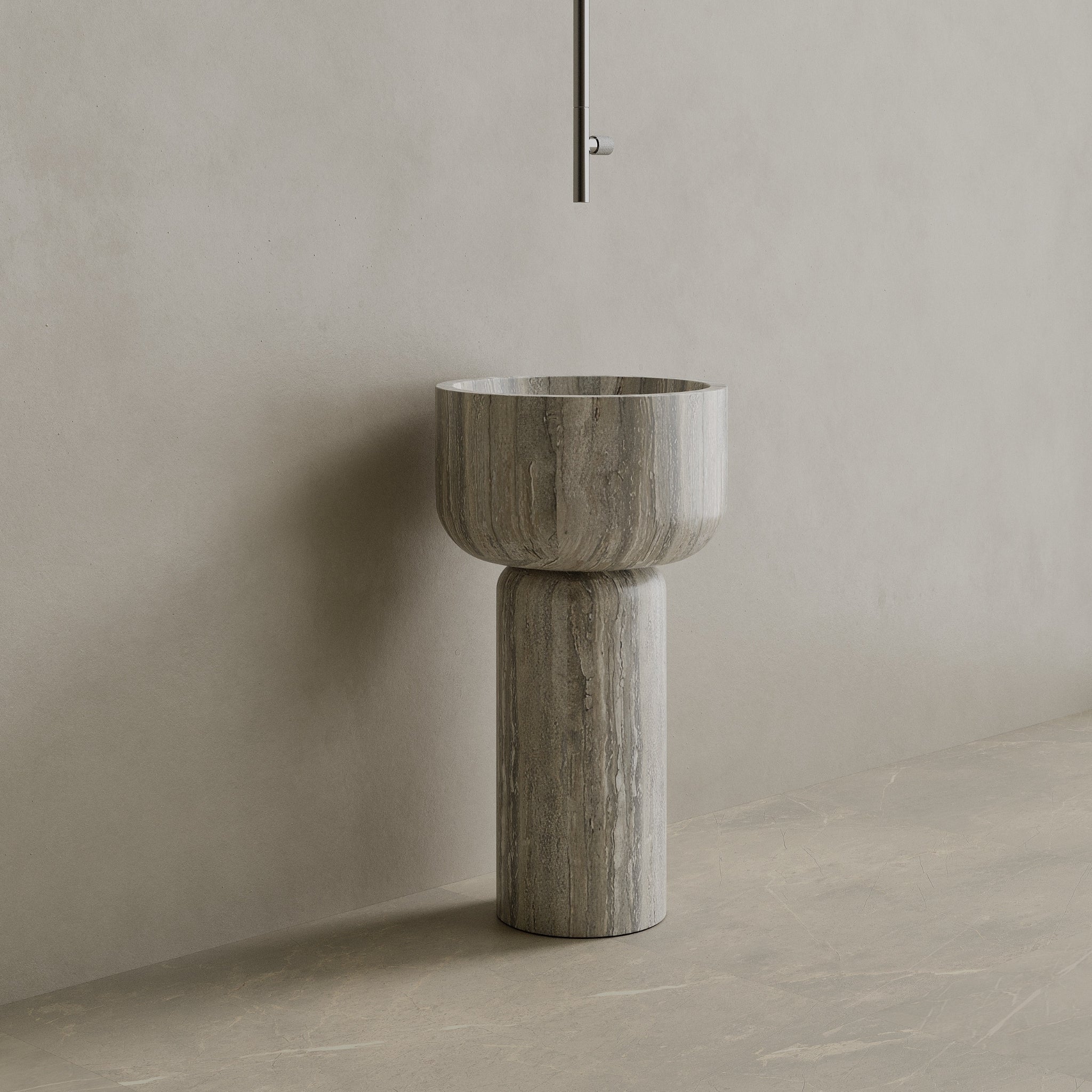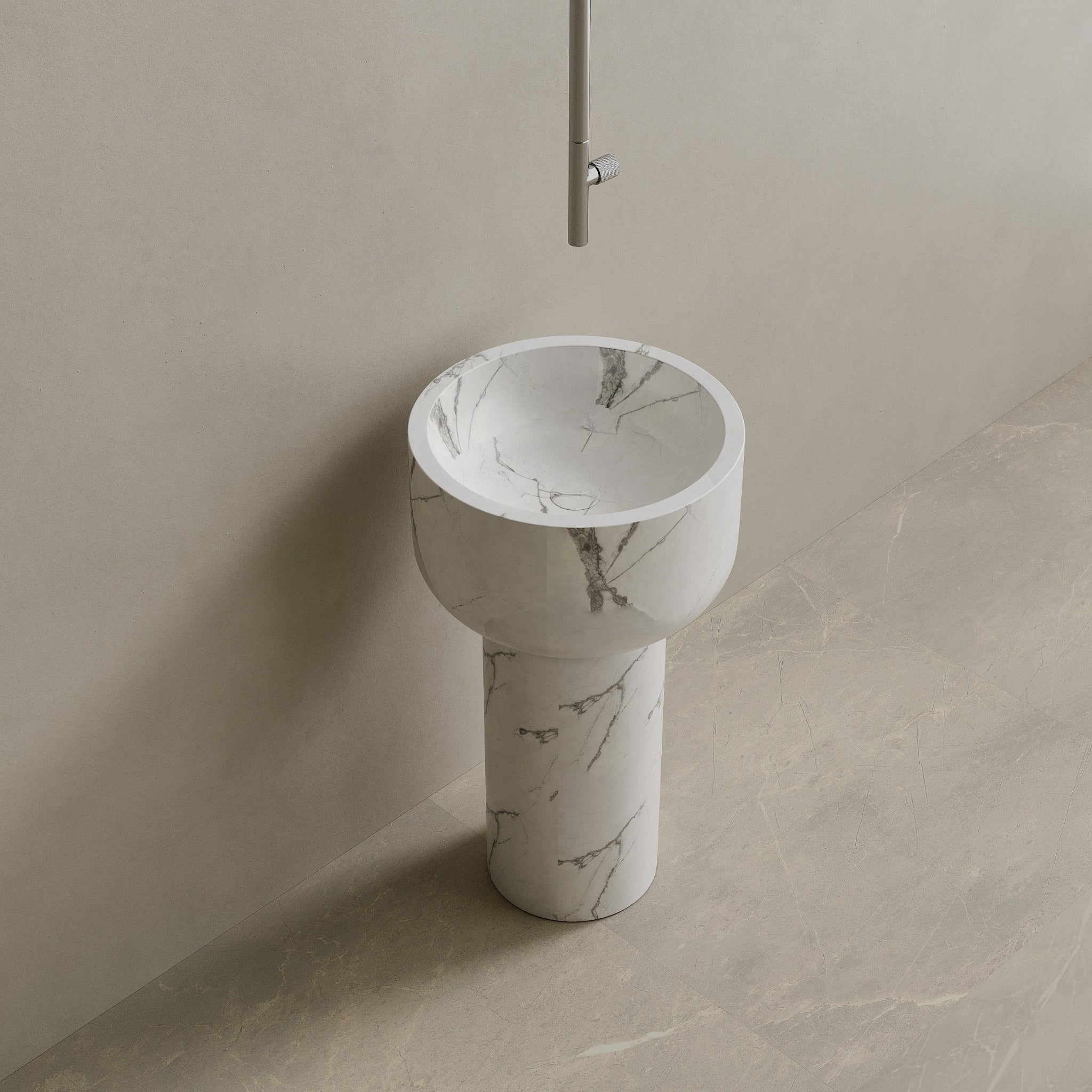 The Veso Freestanding Pedestal Sink introduces sculptural form with its deep, rounded basin and seamless cylindrical base. Crafted from solid stone, this monolithic sink merges classical vessel proportions with contemporary minimalism. Its softened geometry and bold silhouette create a striking focal point for refined bath spaces.
