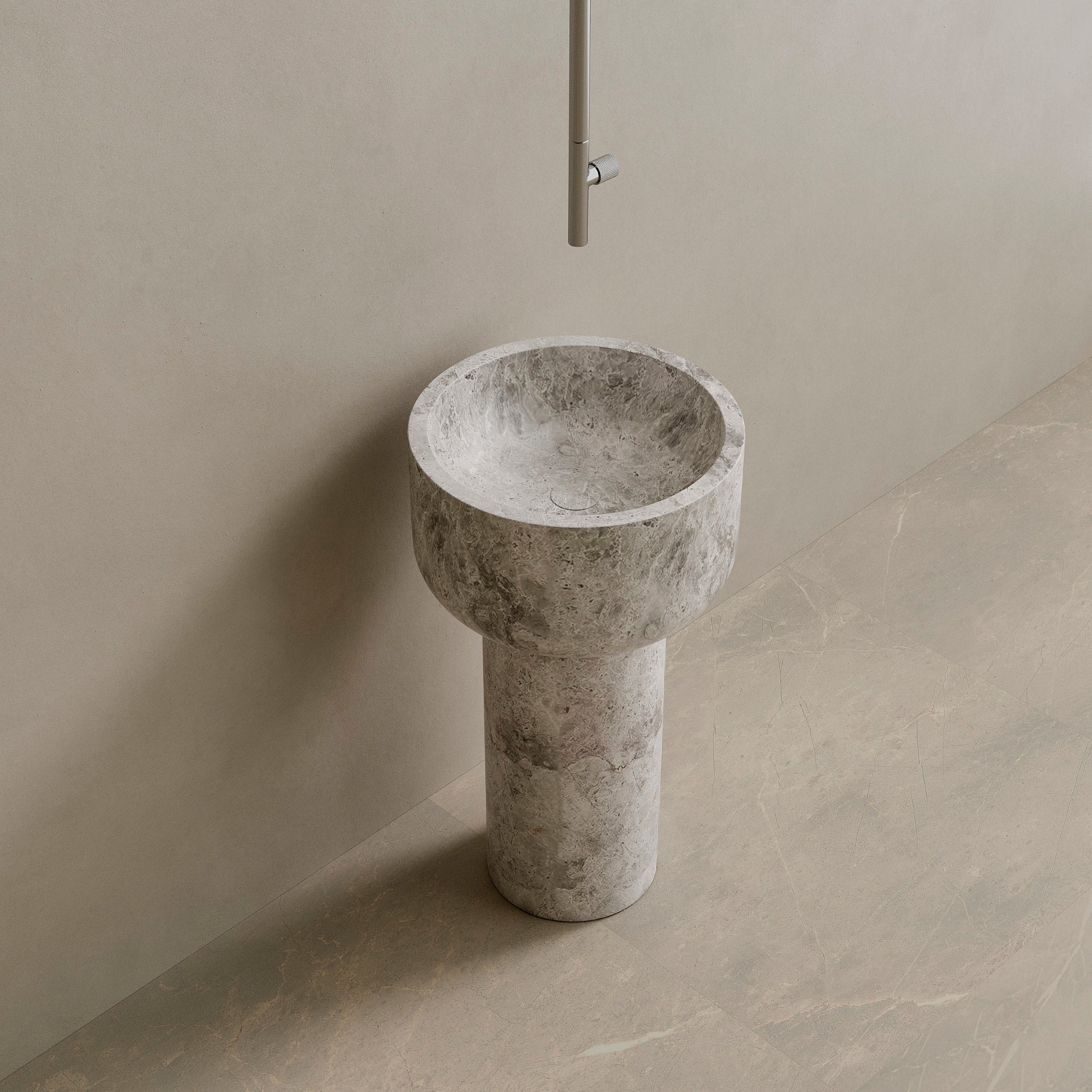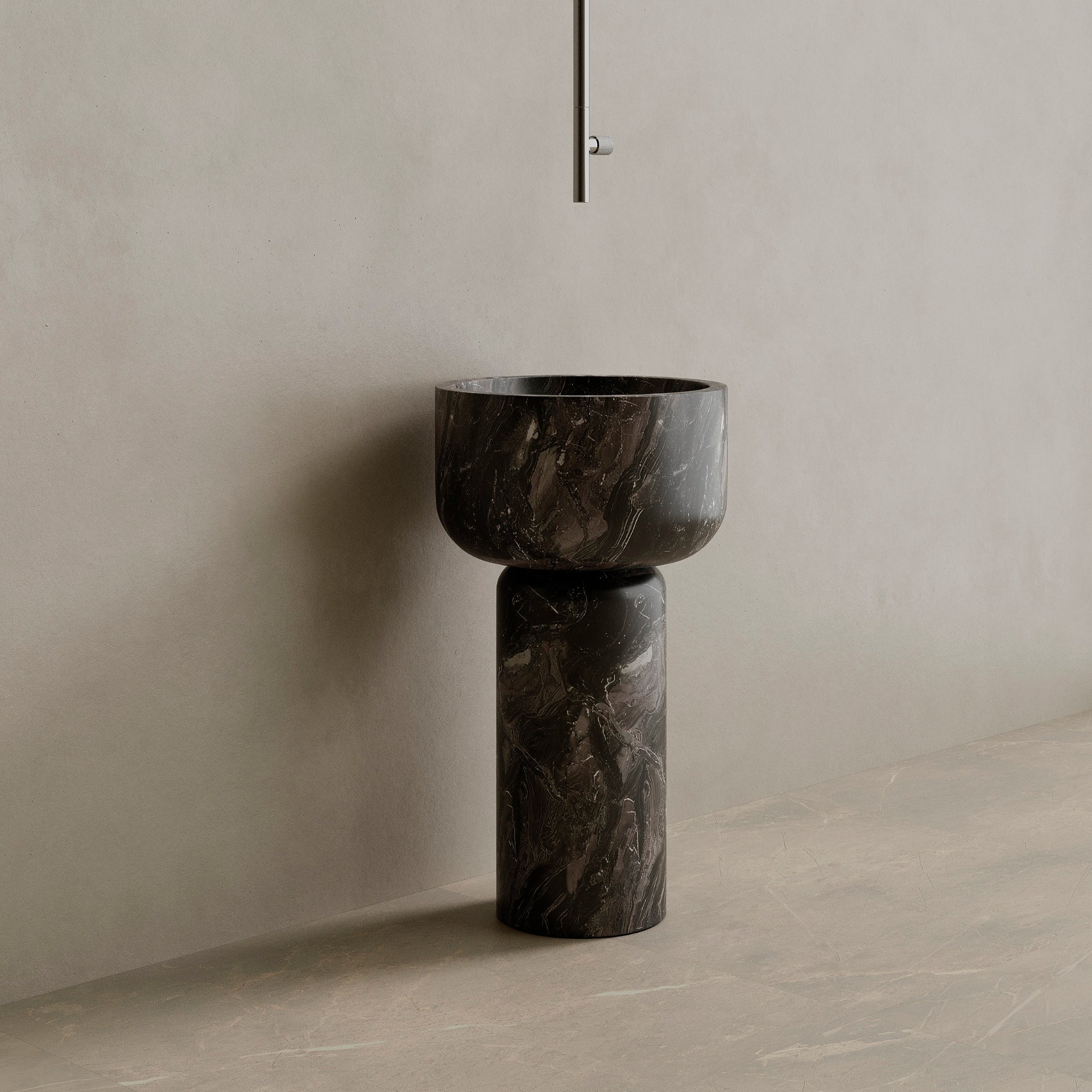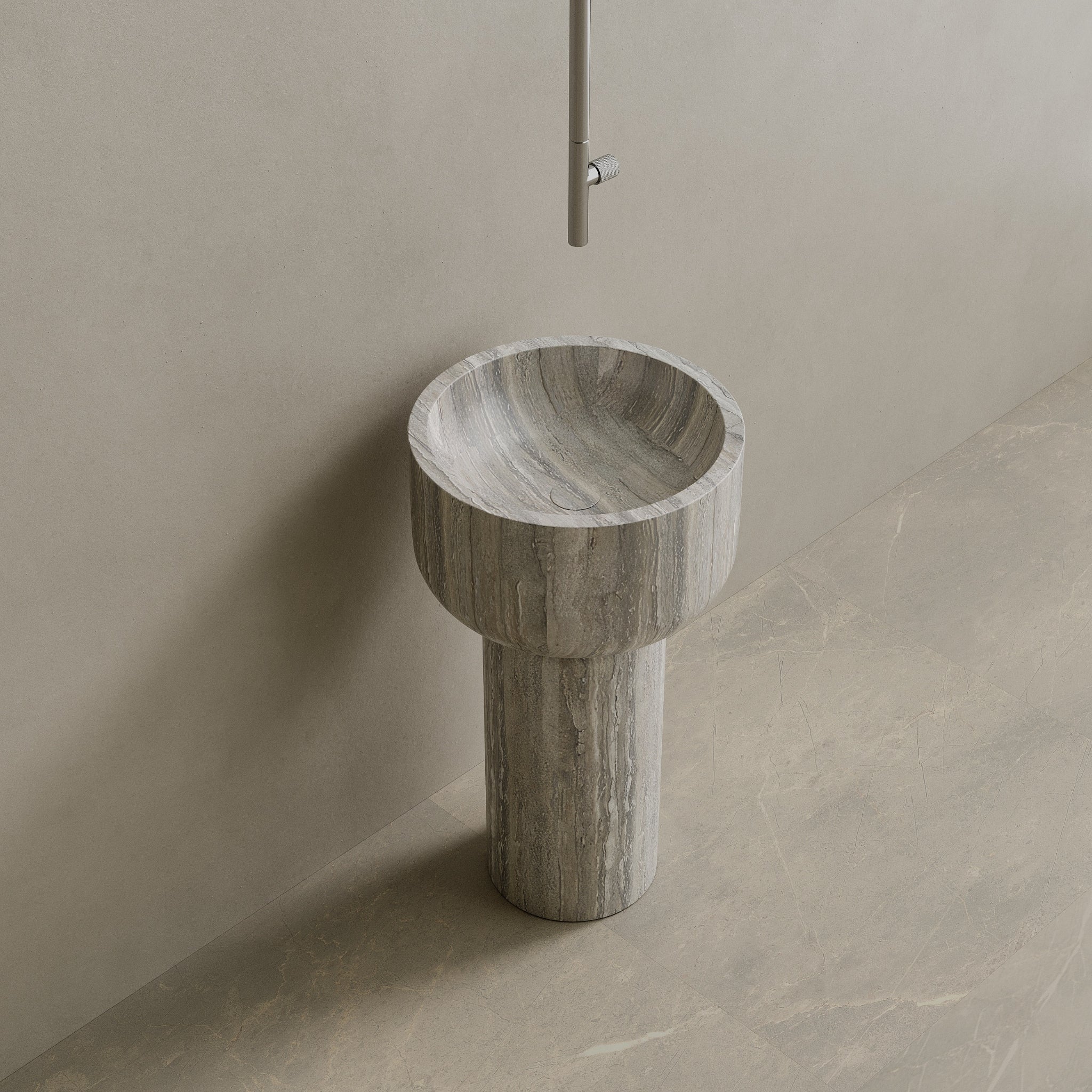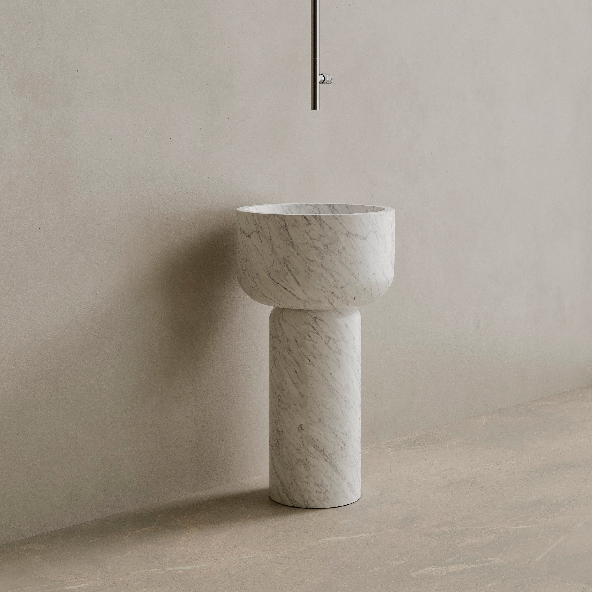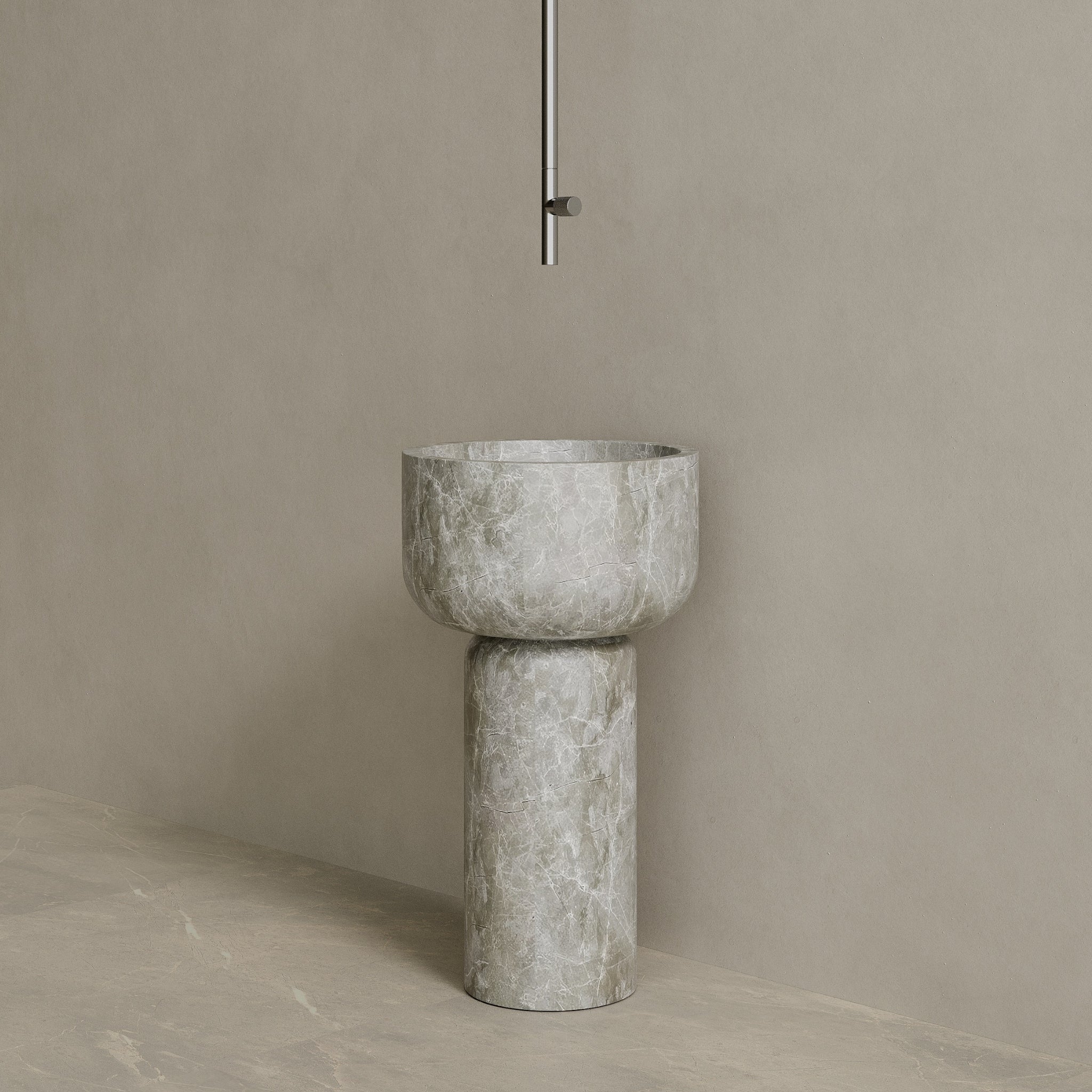 The Veso Freestanding Pedestal Sink introduces sculptural form with its deep, rounded basin and seamless cylindrical base. Crafted from solid stone, this monolithic sink merges classical vessel proportions with contemporary minimalism. Its softened geometry and bold silhouette create a striking focal point for refined bath spaces.