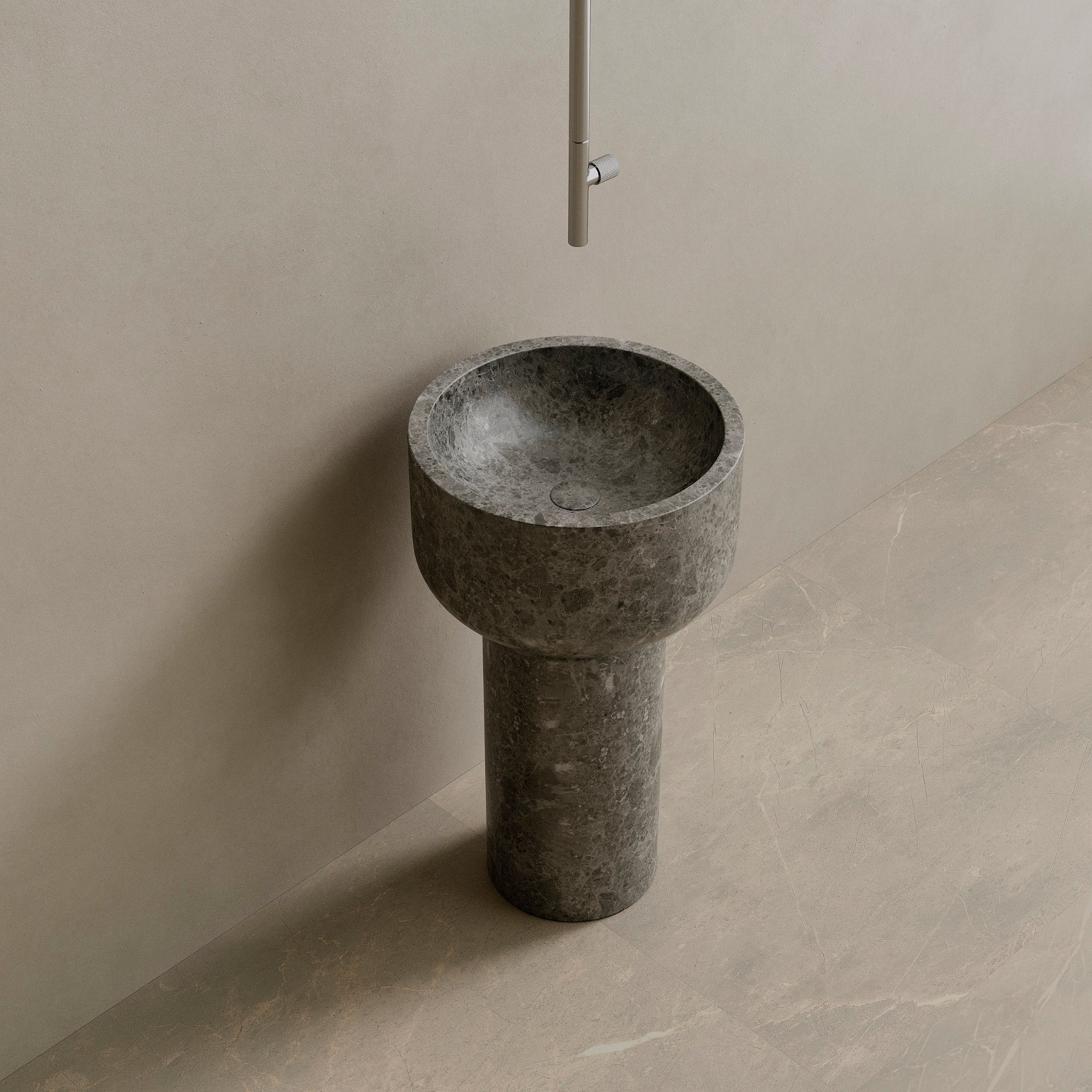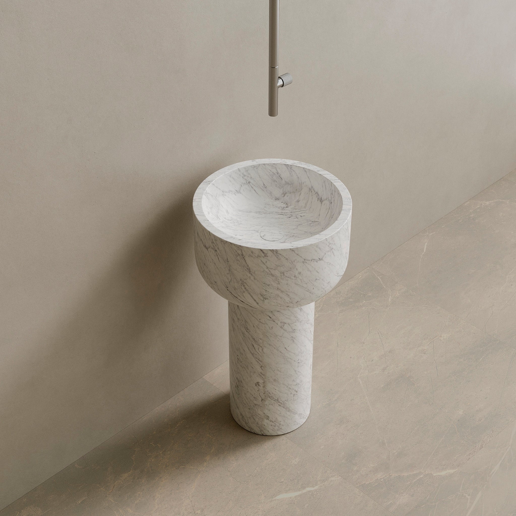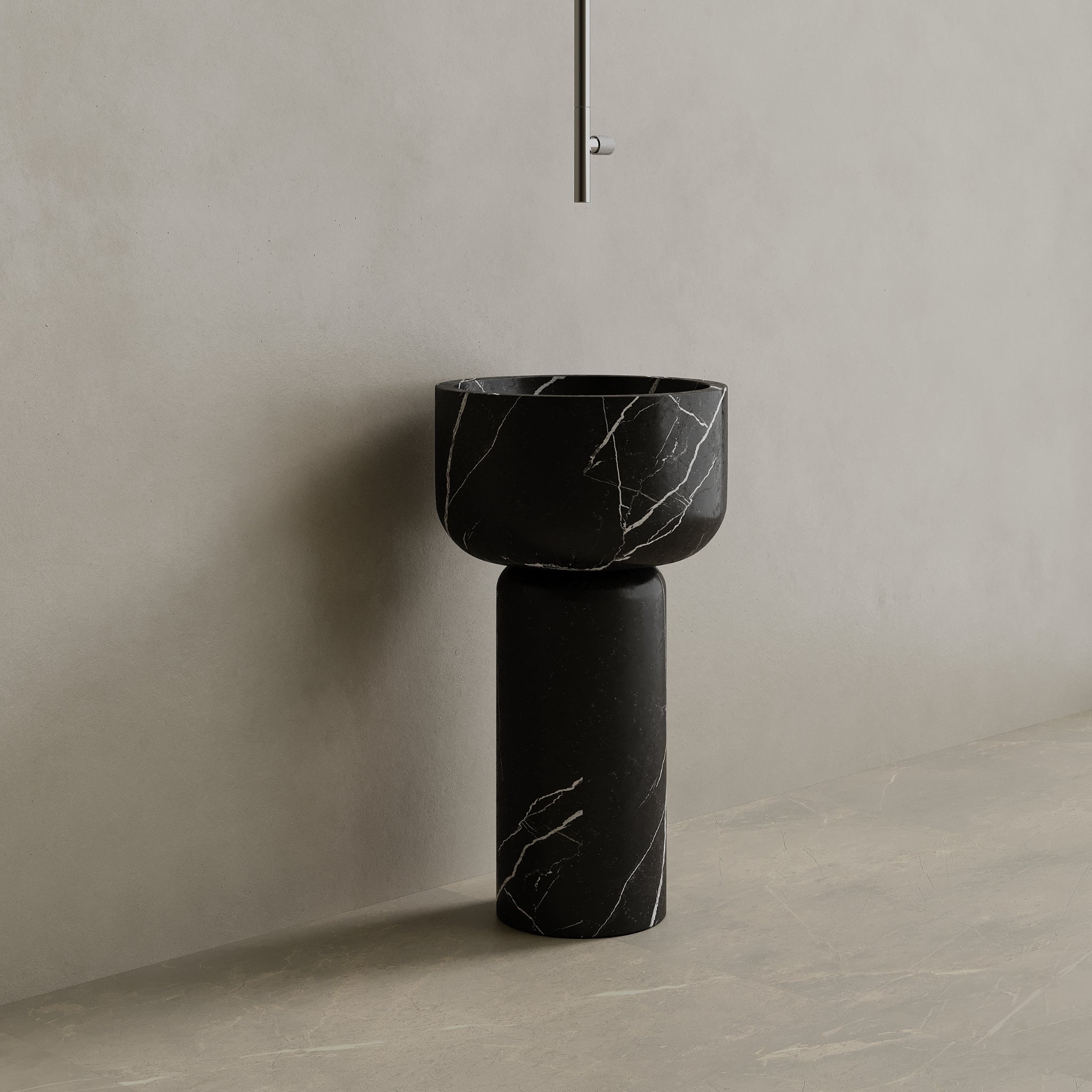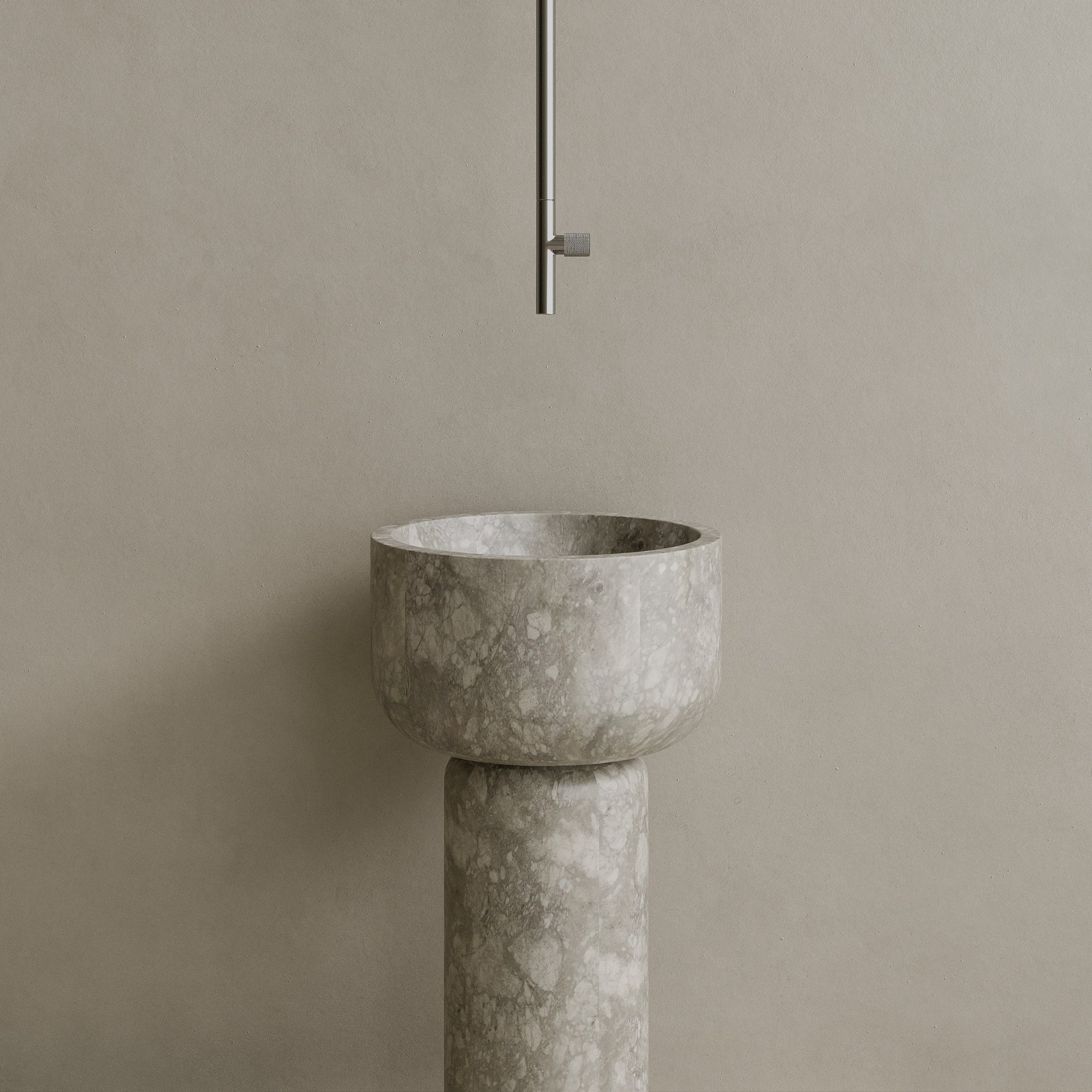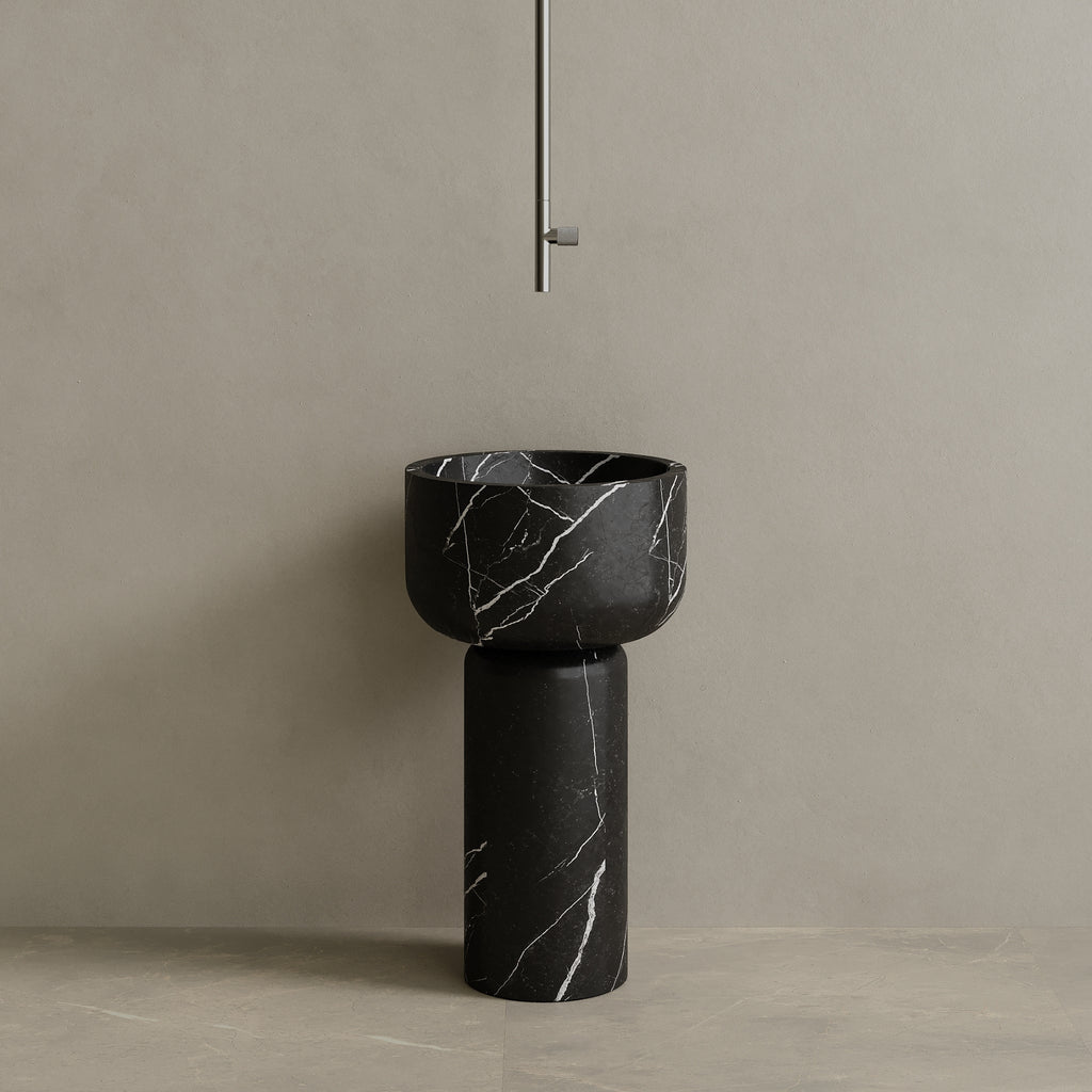The Veso Freestanding Pedestal Sink introduces sculptural form with its deep, rounded basin and seamless cylindrical base. Crafted from solid stone, this monolithic sink merges classical vessel proportions with contemporary minimalism. Its softened geometry and bold silhouette create a striking focal point for refined bath spaces.