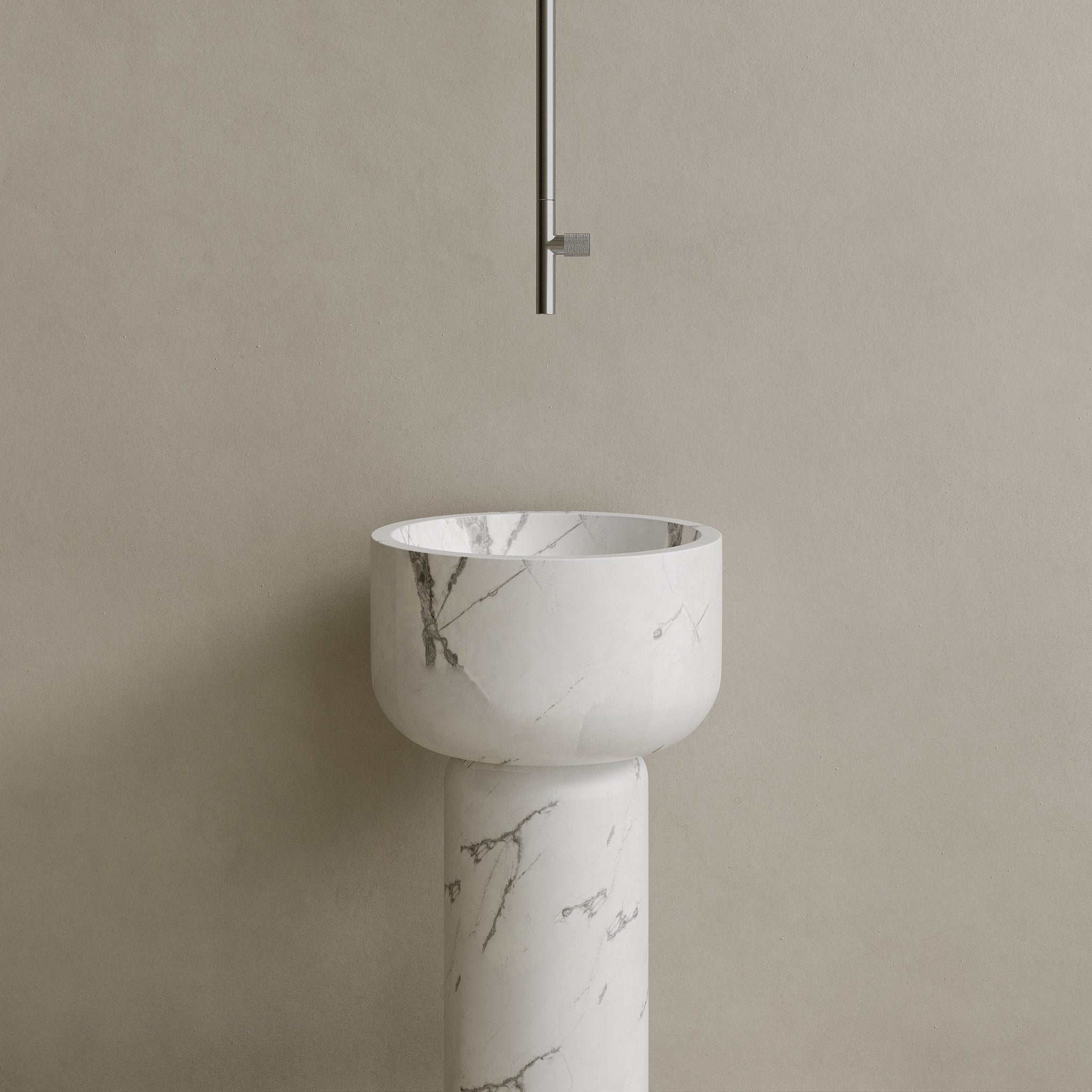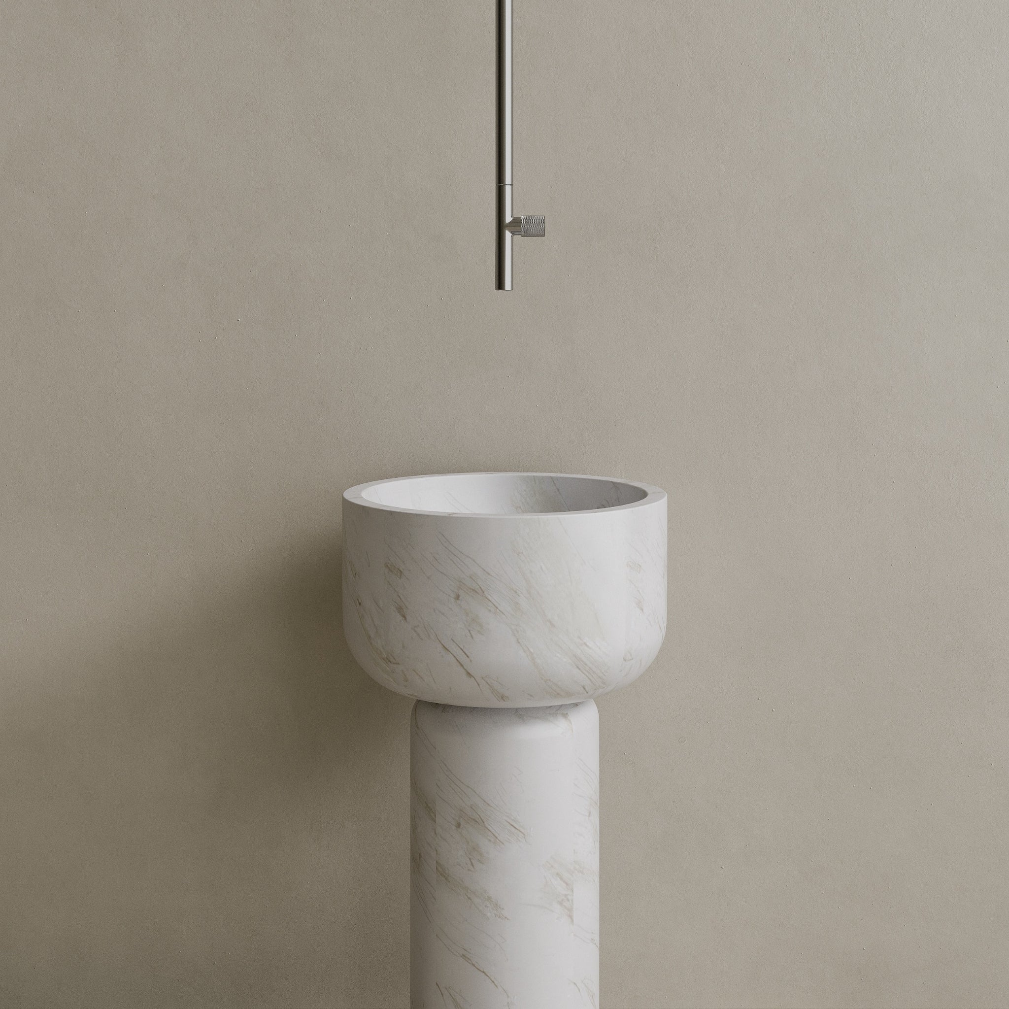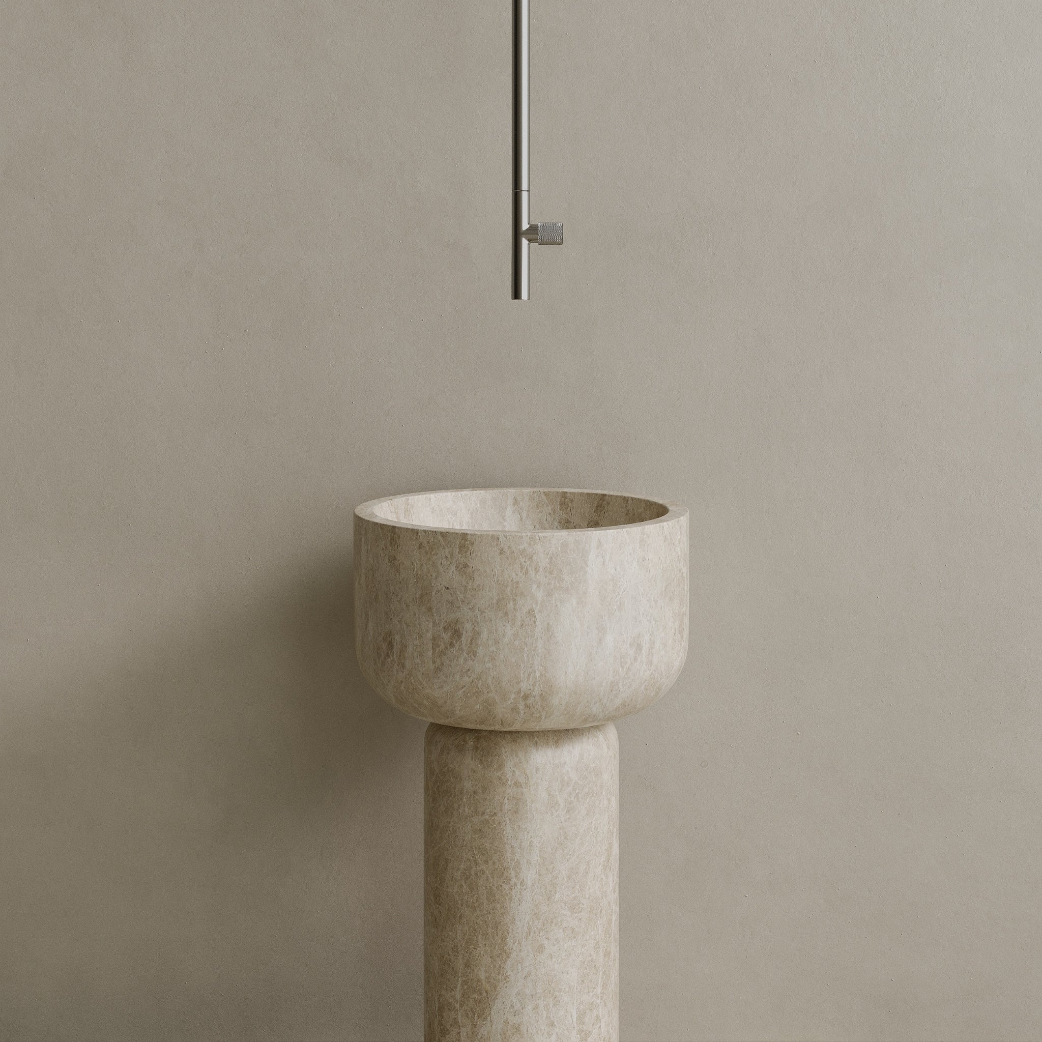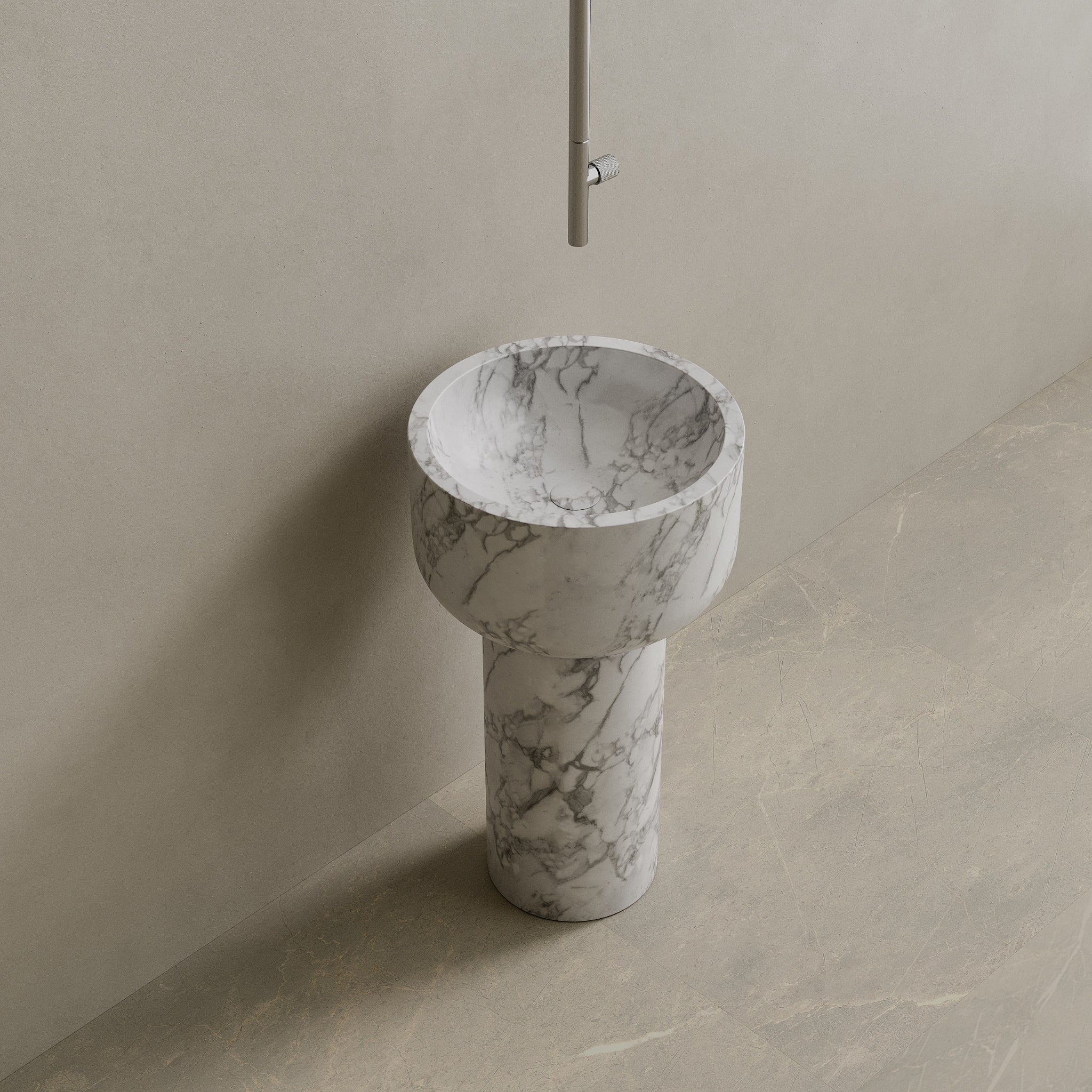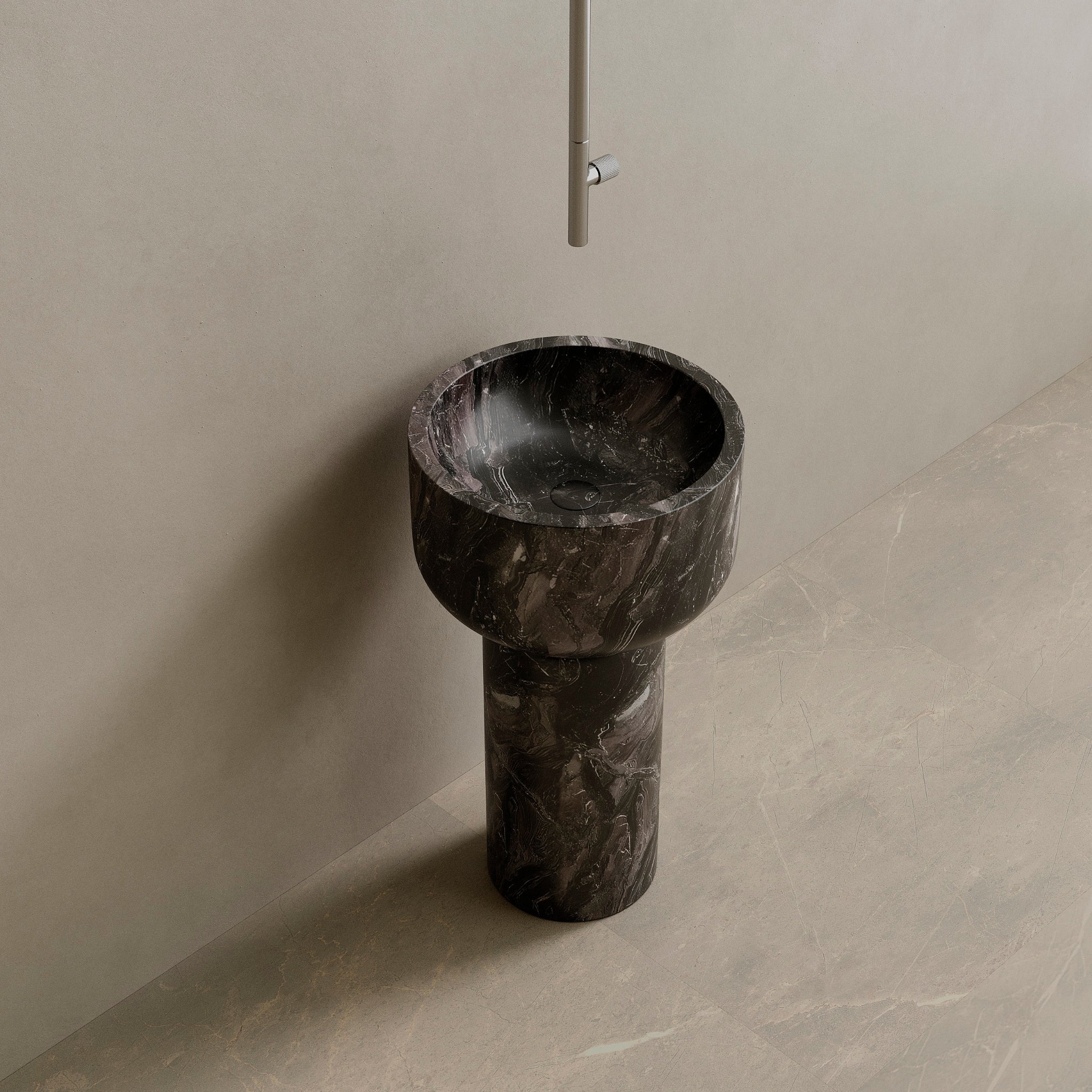 The Veso Freestanding Pedestal Sink introduces sculptural form with its deep, rounded basin and seamless cylindrical base. Crafted from solid stone, this monolithic sink merges classical vessel proportions with contemporary minimalism. Its softened geometry and bold silhouette create a striking focal point for refined bath spaces.