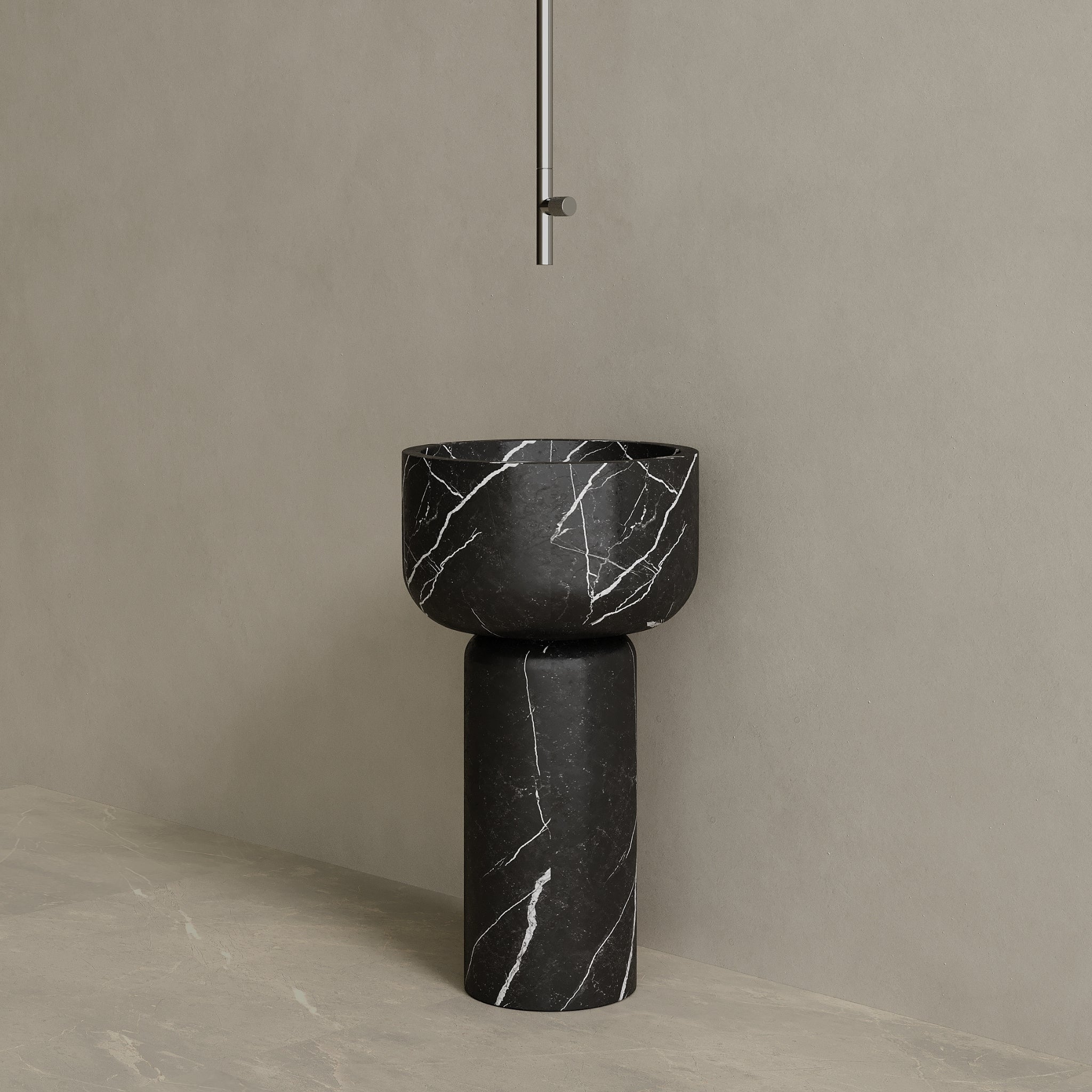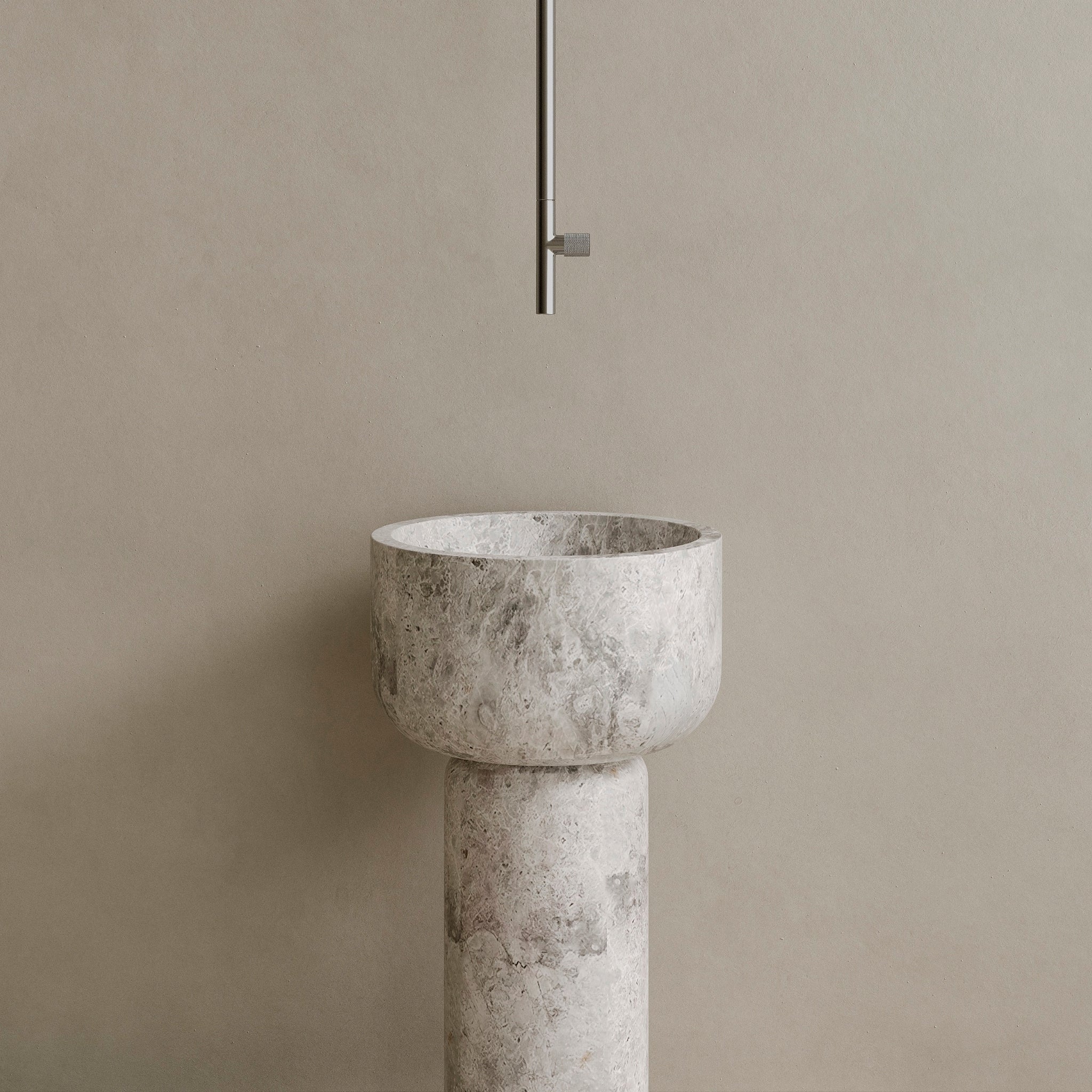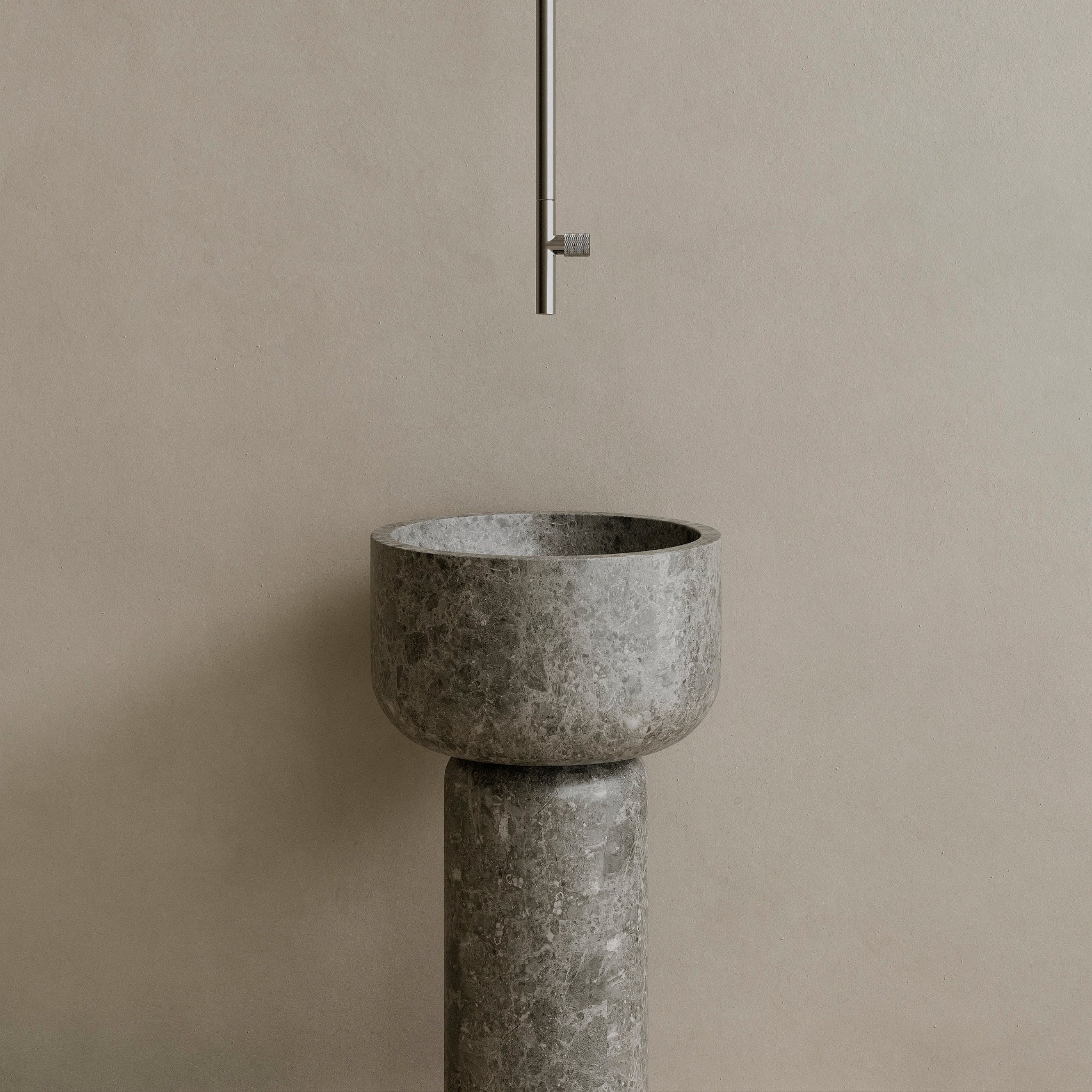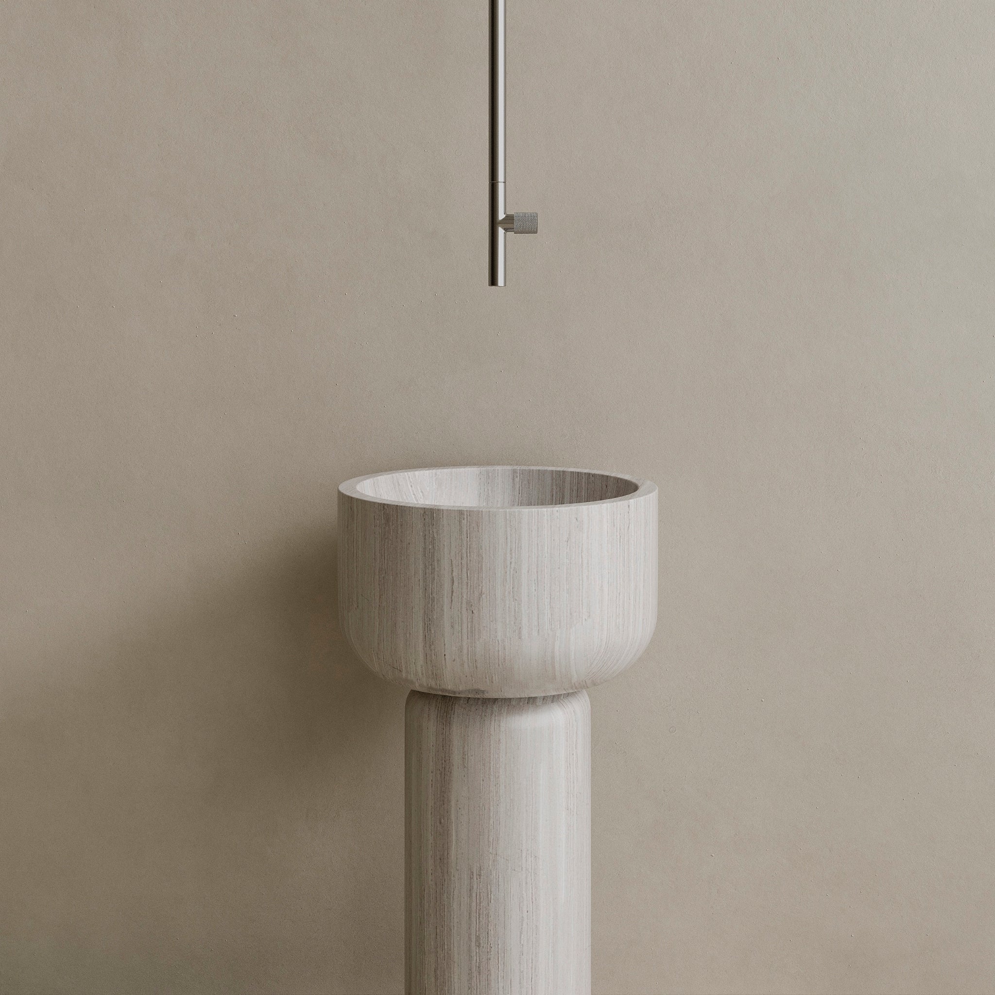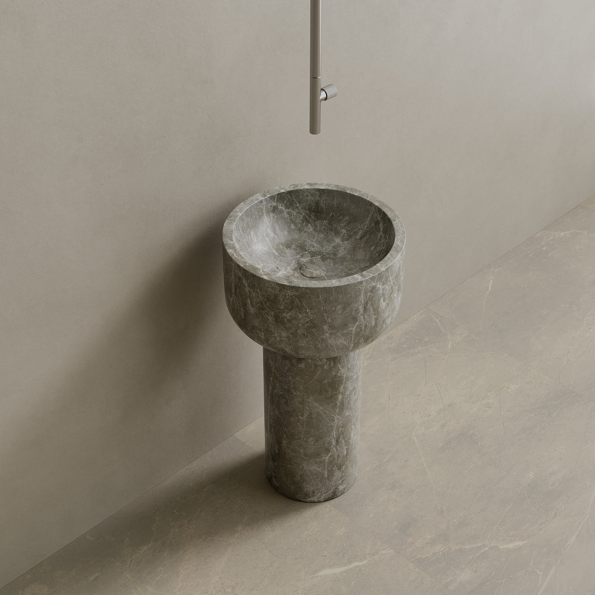 The Veso Freestanding Pedestal Sink introduces sculptural form with its deep, rounded basin and seamless cylindrical base. Crafted from solid stone, this monolithic sink merges classical vessel proportions with contemporary minimalism. Its softened geometry and bold silhouette create a striking focal point for refined bath spaces.