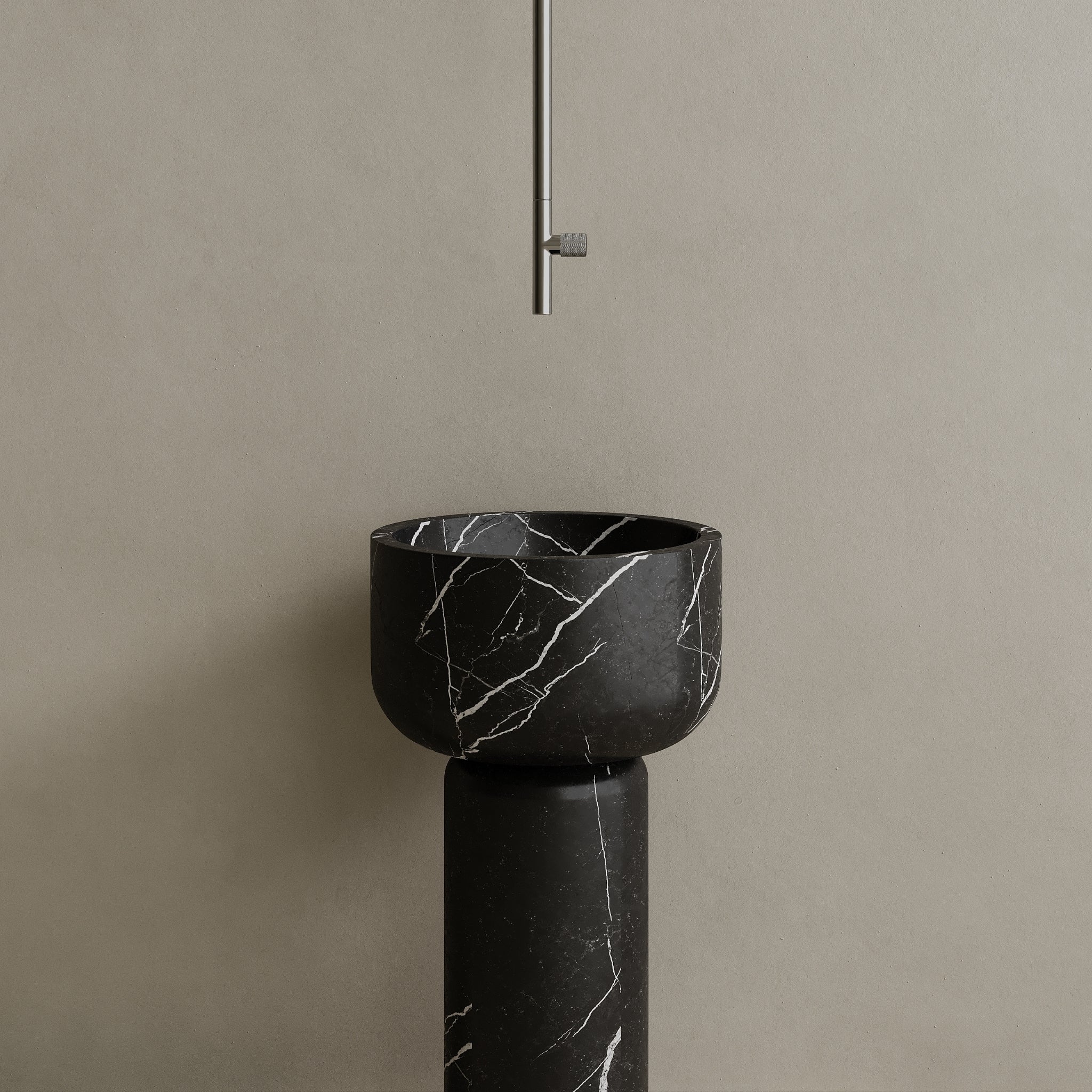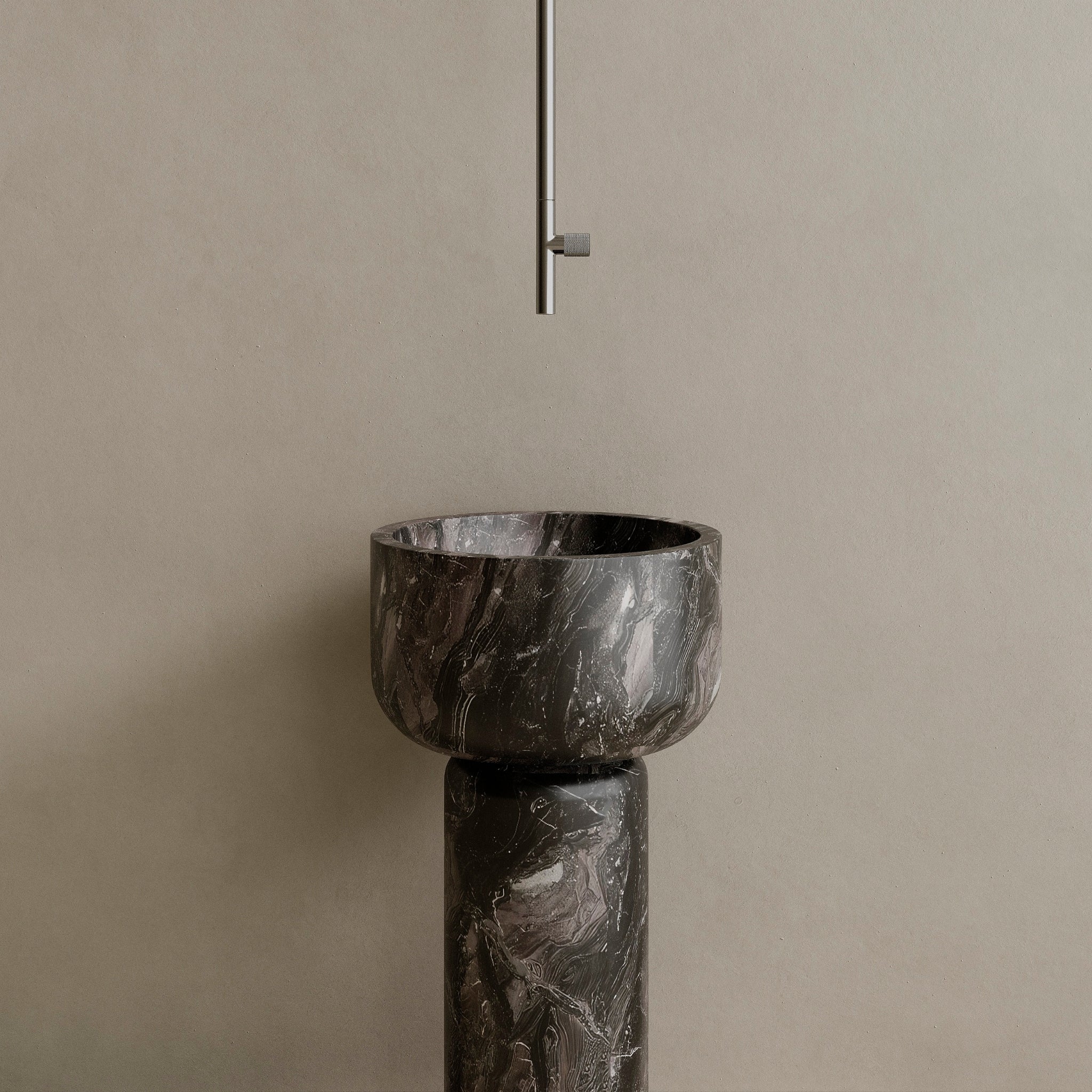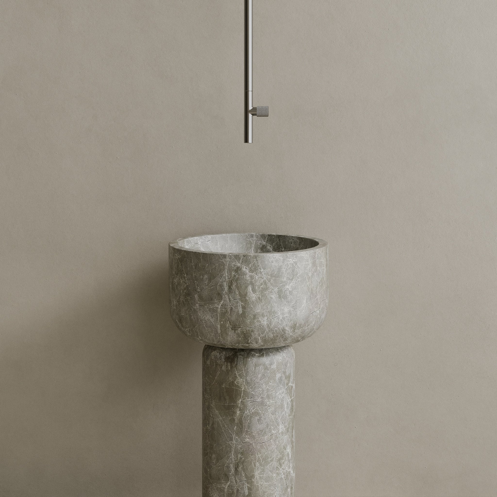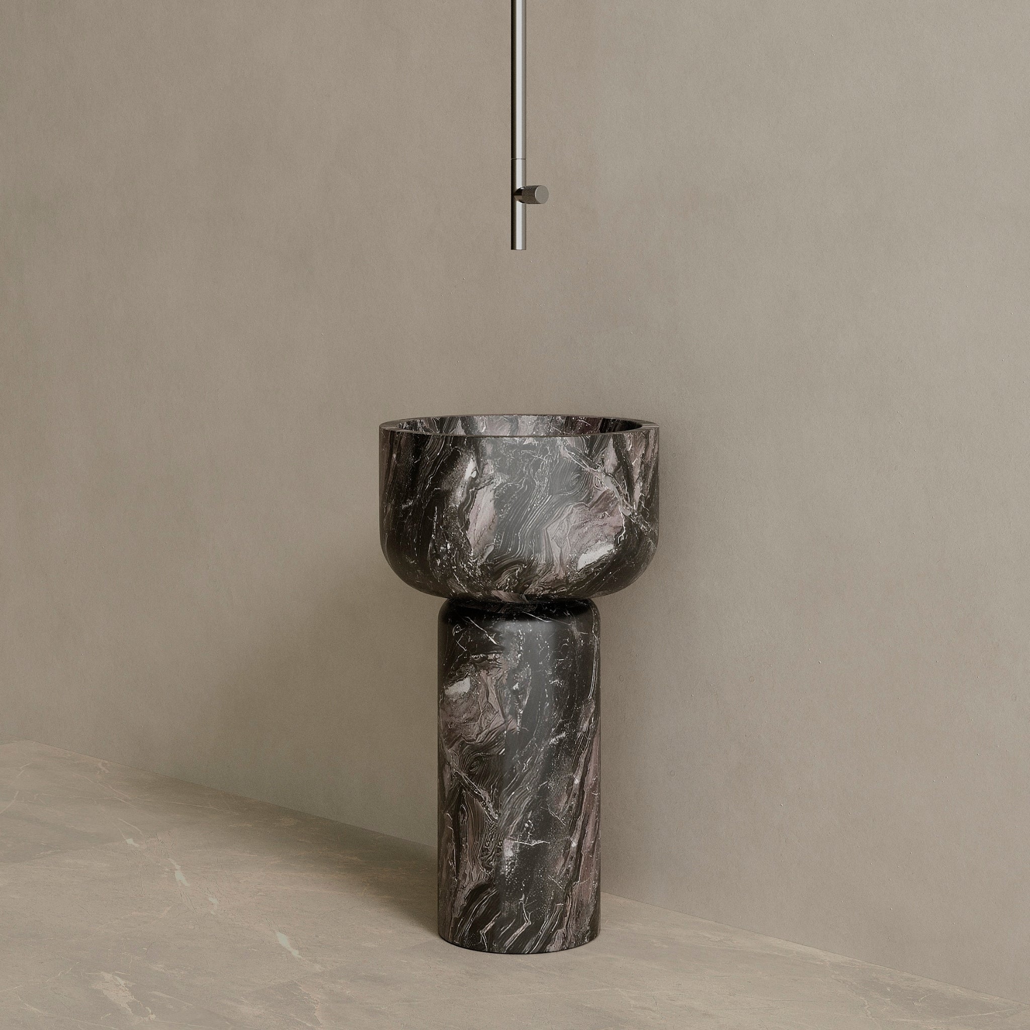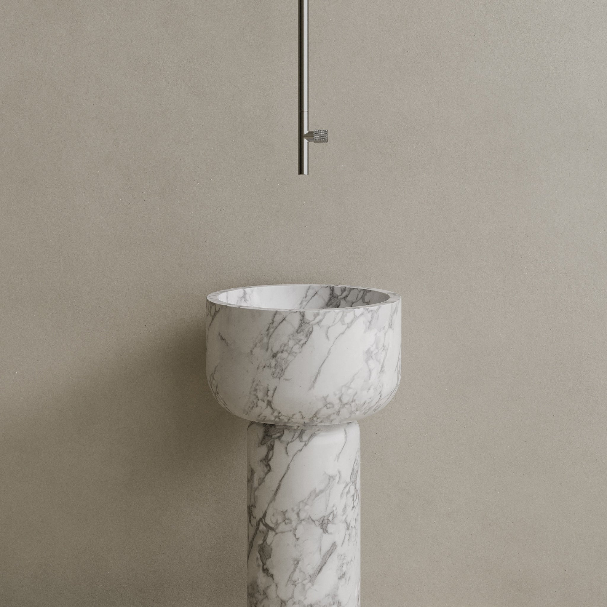 The Veso Freestanding Pedestal Sink introduces sculptural form with its deep, rounded basin and seamless cylindrical base. Crafted from solid stone, this monolithic sink merges classical vessel proportions with contemporary minimalism. Its softened geometry and bold silhouette create a striking focal point for refined bath spaces.