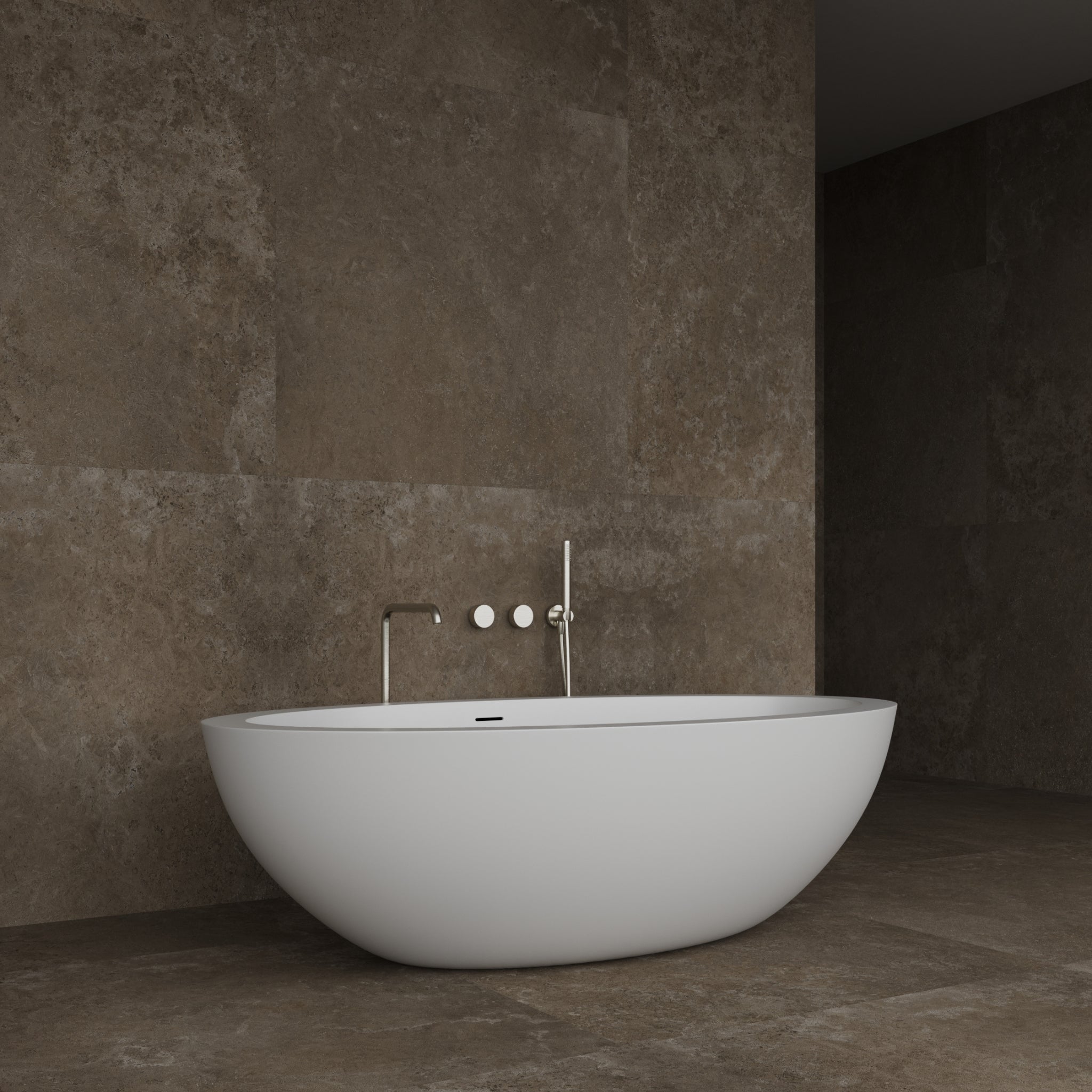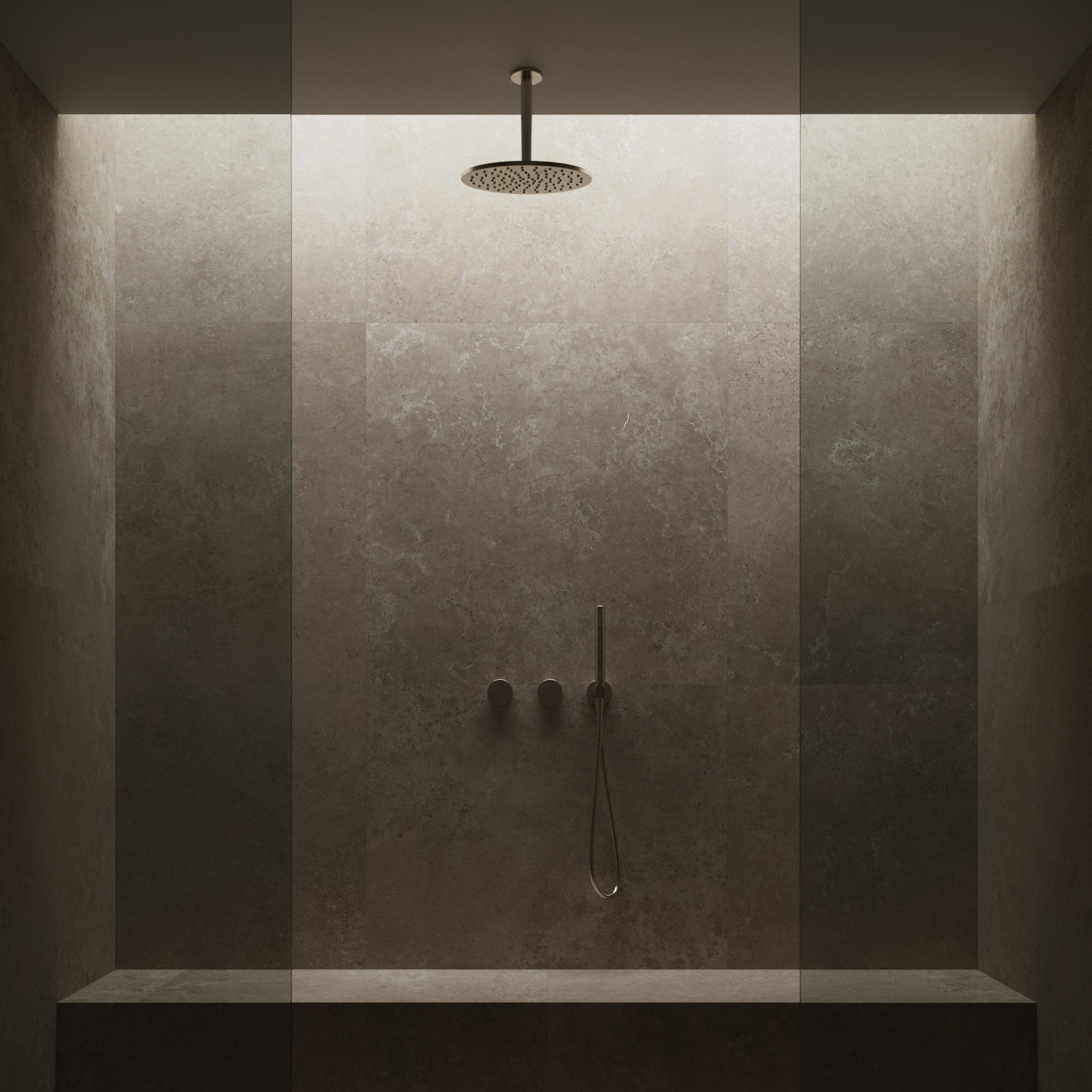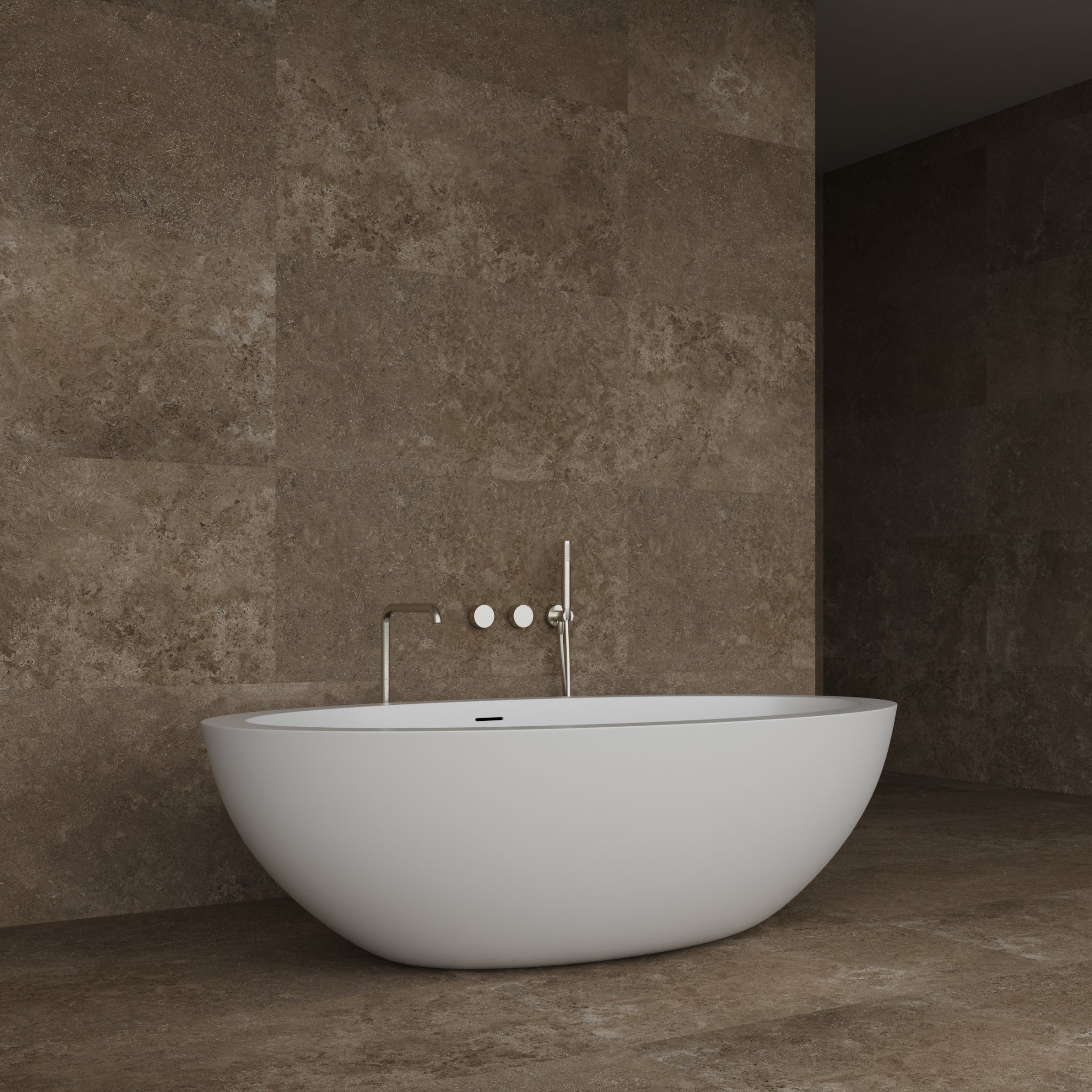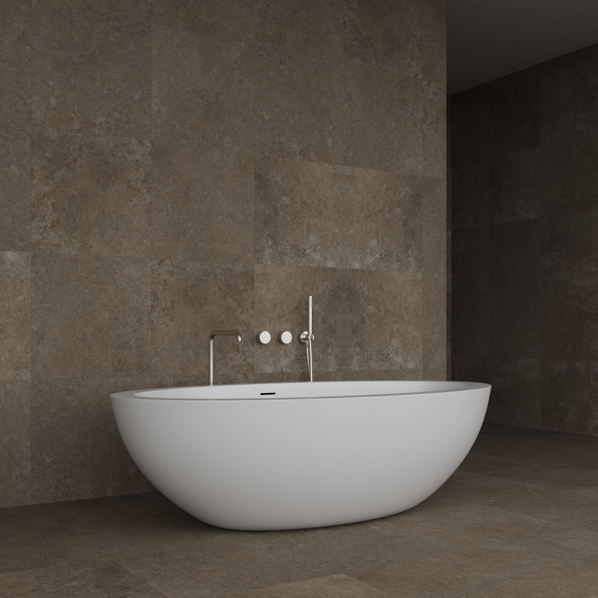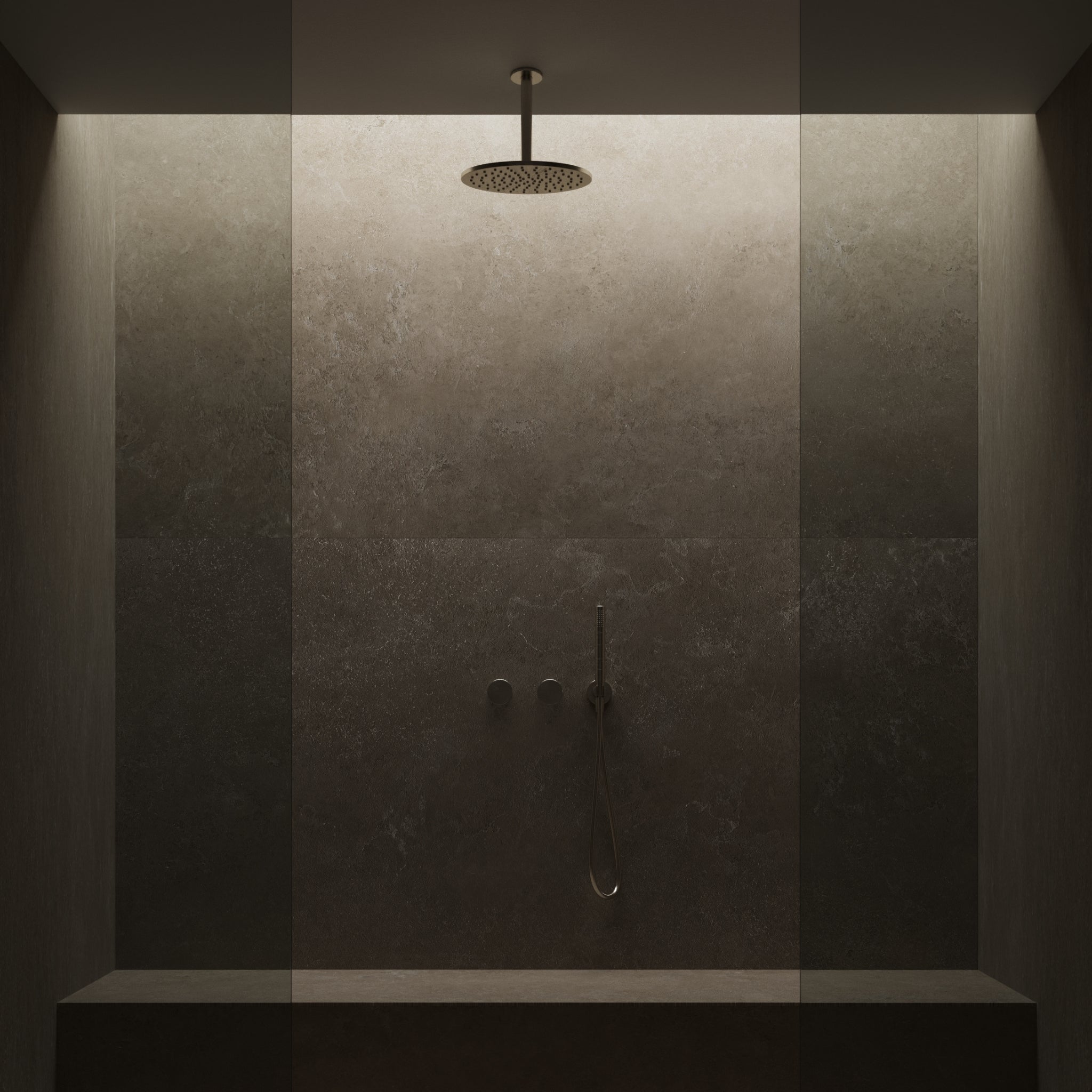 Terravia Ombra porcelain tile channels the density of stone in shadow, rendered in deep charcoal tones. Its matte surface highlights light and depth, producing bold visual character. Made in Italy, it is both enduring and expressive. Ombra serves as a centerpiece in modern bathroom design.