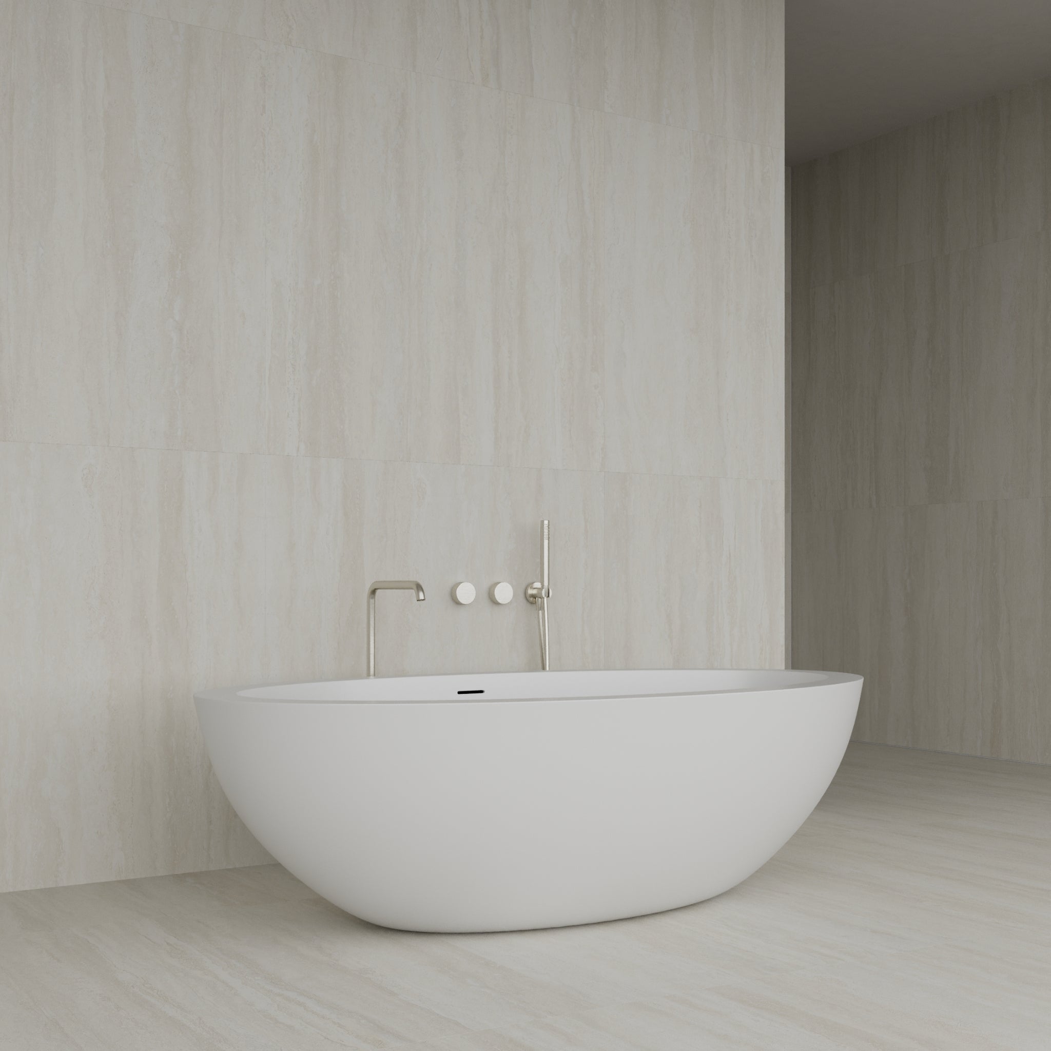 Velora Bianco Vein reflects the linear detail of vein-cut travertine in clean white tones. Its striated pattern introduces order and rhythm across surfaces, shaping interiors with definition. The matte finish softens its architectural presence while maintaining durability. Italian-made, it adds structure and clarity to modern design.
