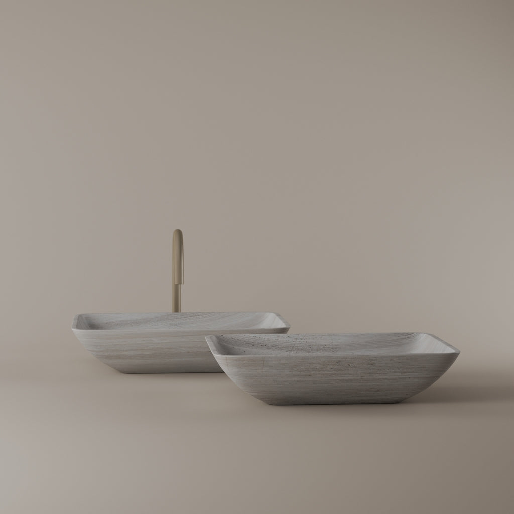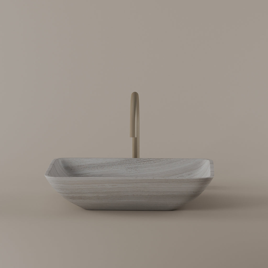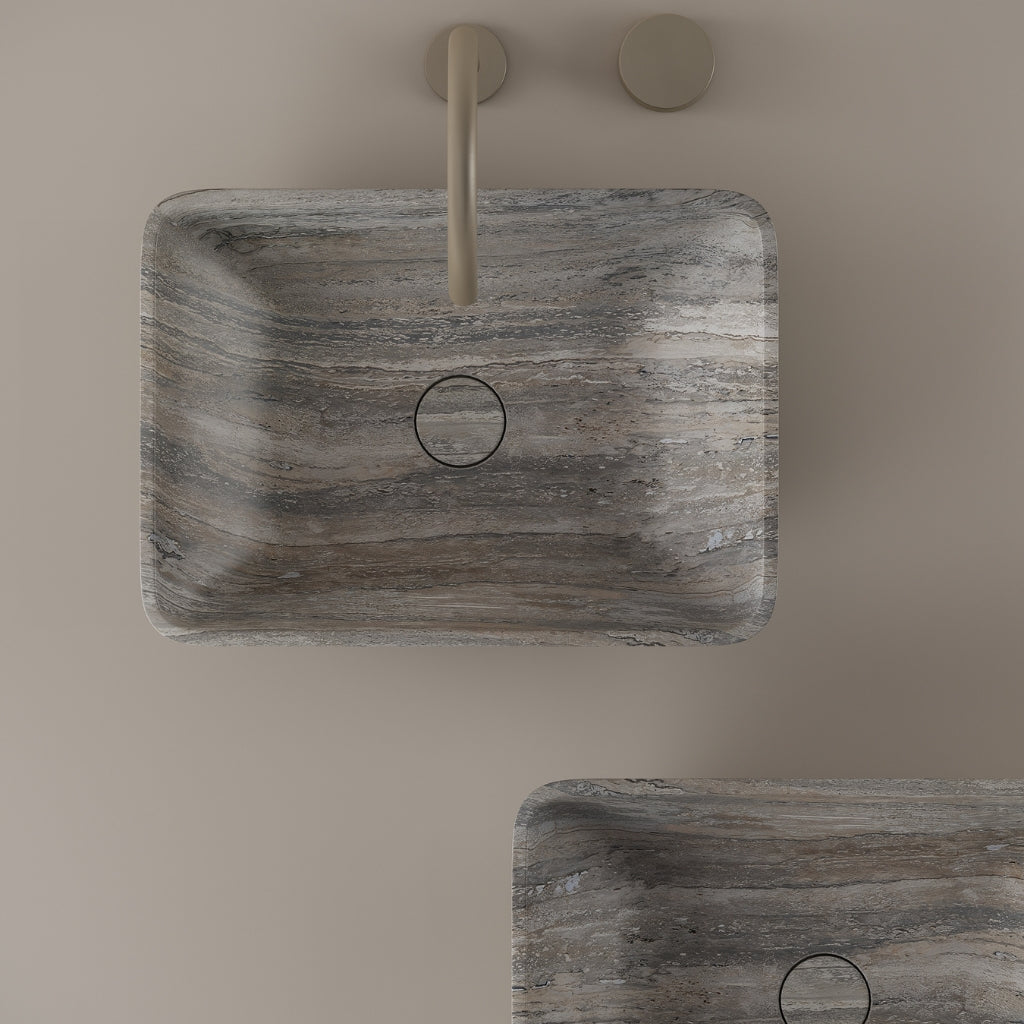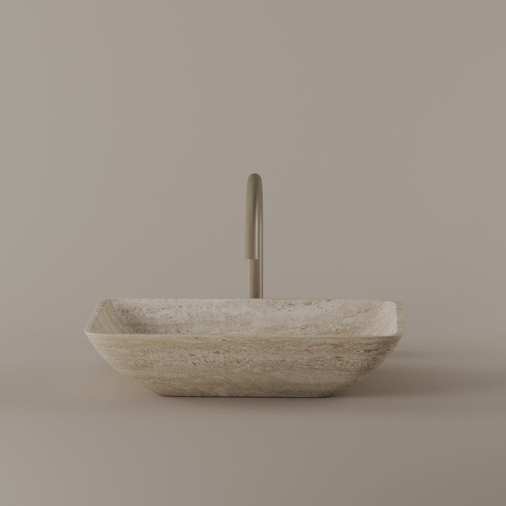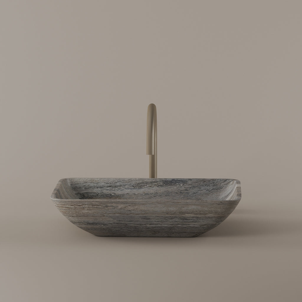 Carved from marble at 18 inches by 13 inches, this rectangular vessel sink combines a practical basin size with a clean linear structure. The defined edges create a strong directional presence while maintaining usability. Its surface introduces natural variation and depth.