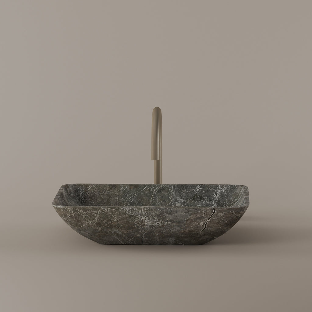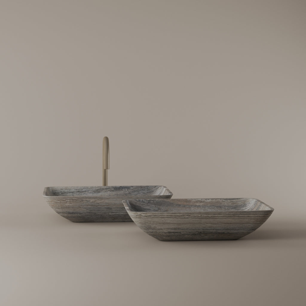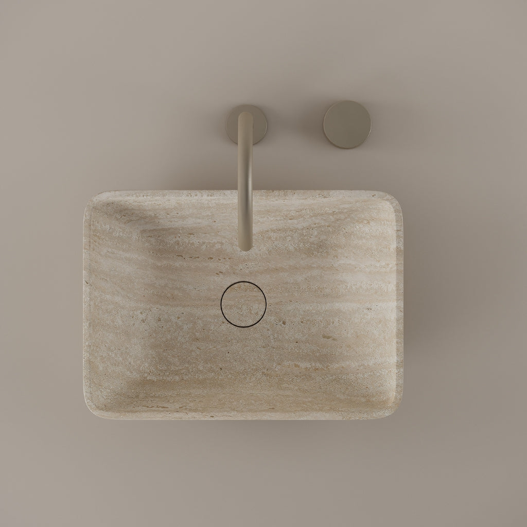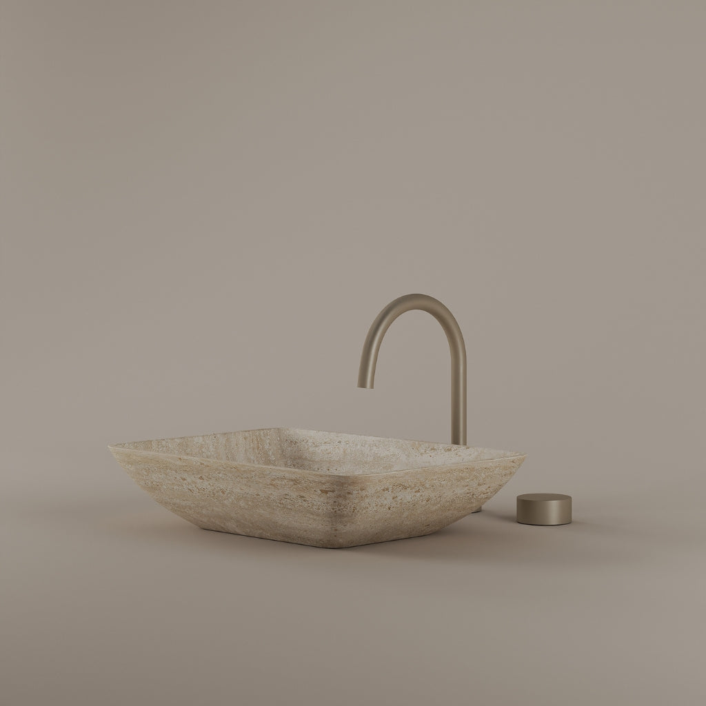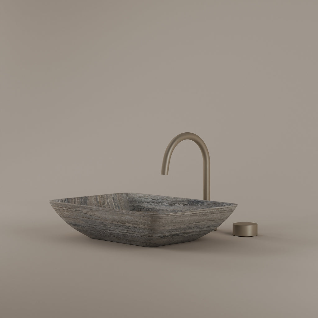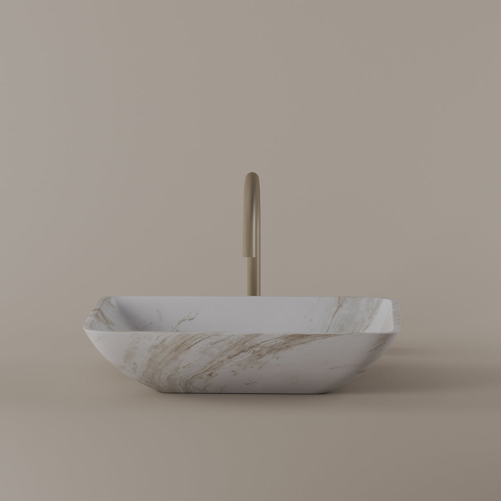Carved from marble at 18 inches by 13 inches, this rectangular vessel sink combines a practical basin size with a clean linear structure. The defined edges create a strong directional presence while maintaining usability. Its surface introduces natural variation and depth.