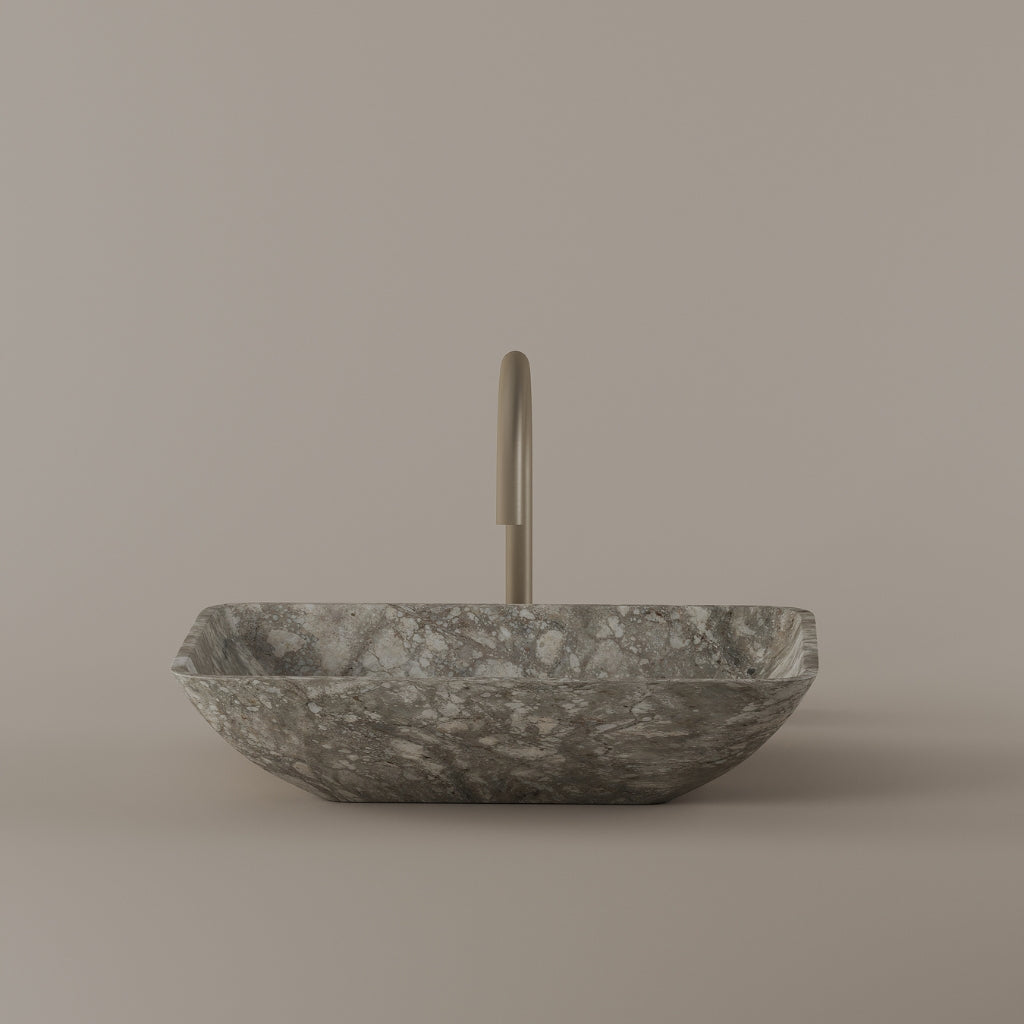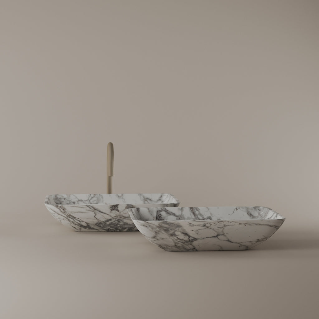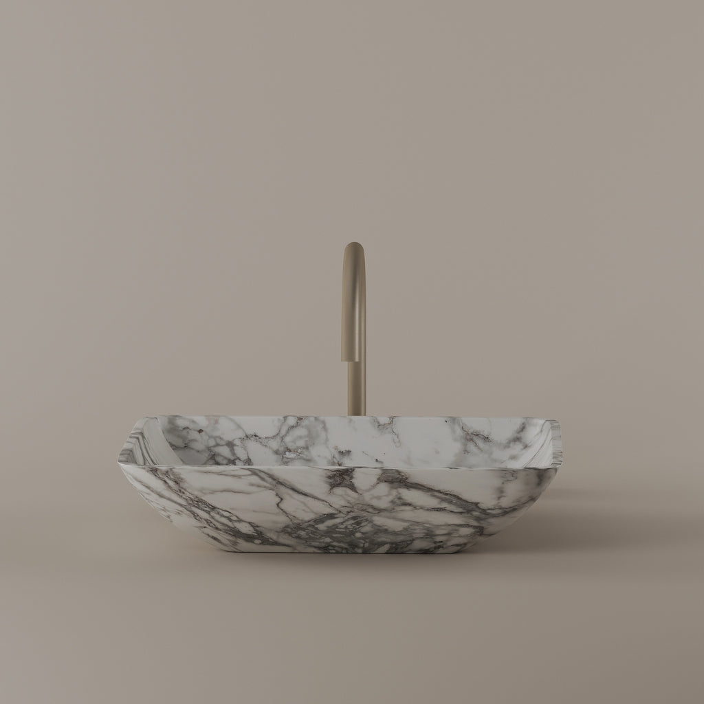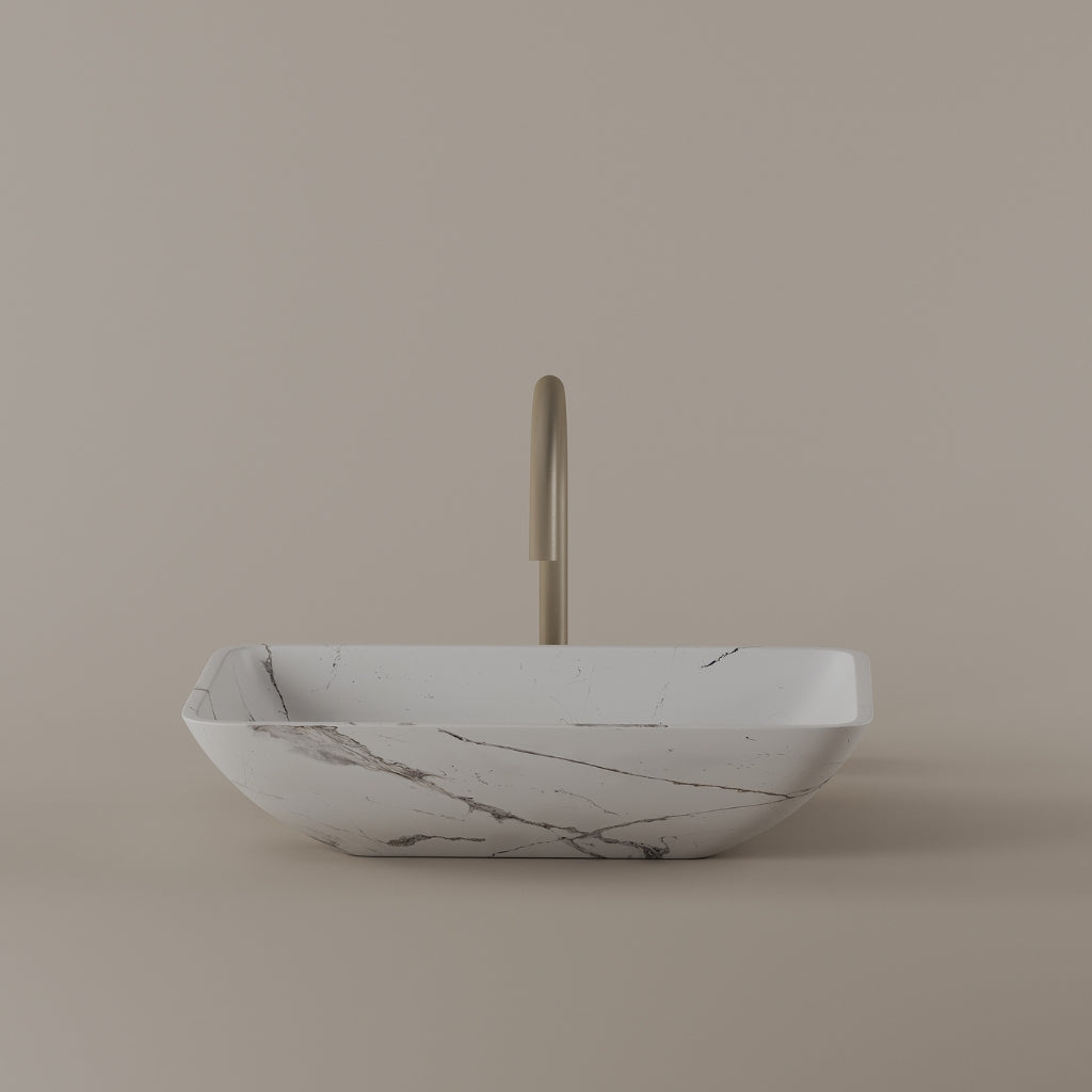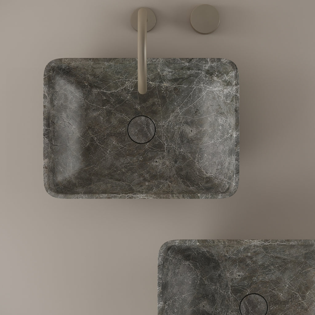 Carved from marble at 18 inches by 13 inches, this rectangular vessel sink combines a practical basin size with a clean linear structure. The defined edges create a strong directional presence while maintaining usability. Its surface introduces natural variation and depth.