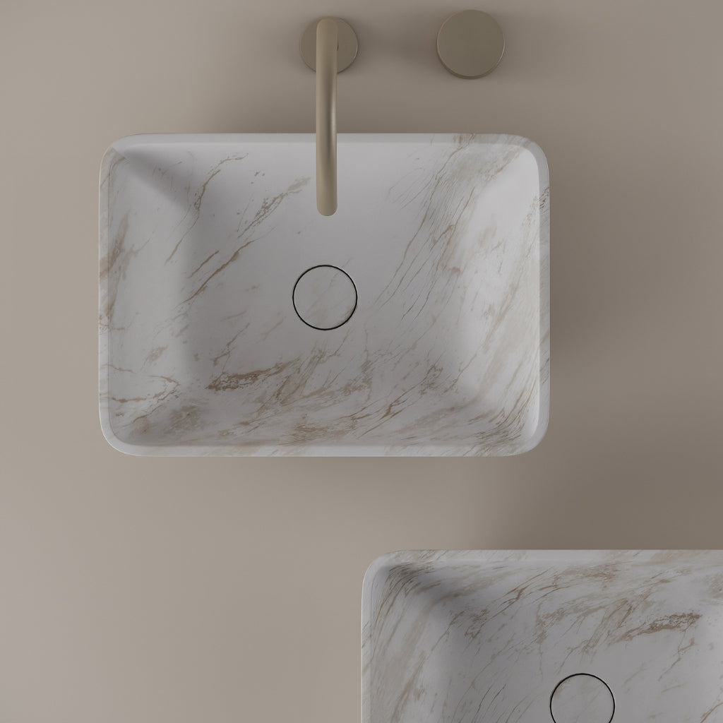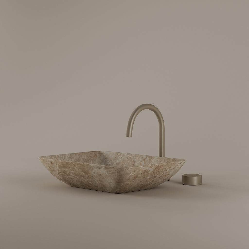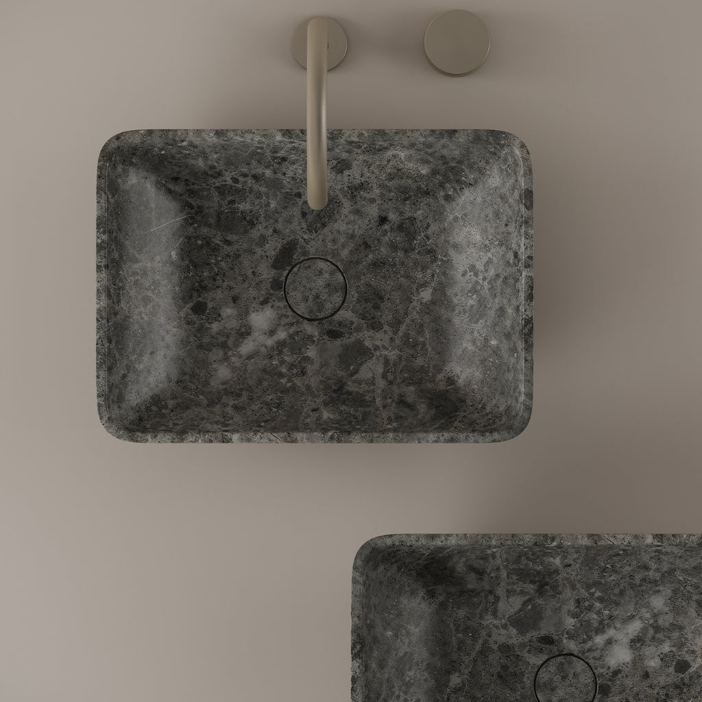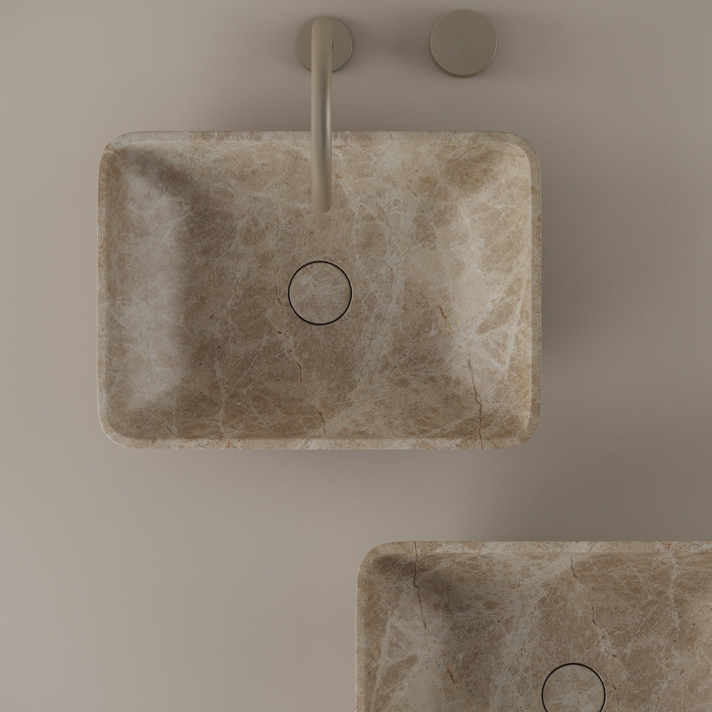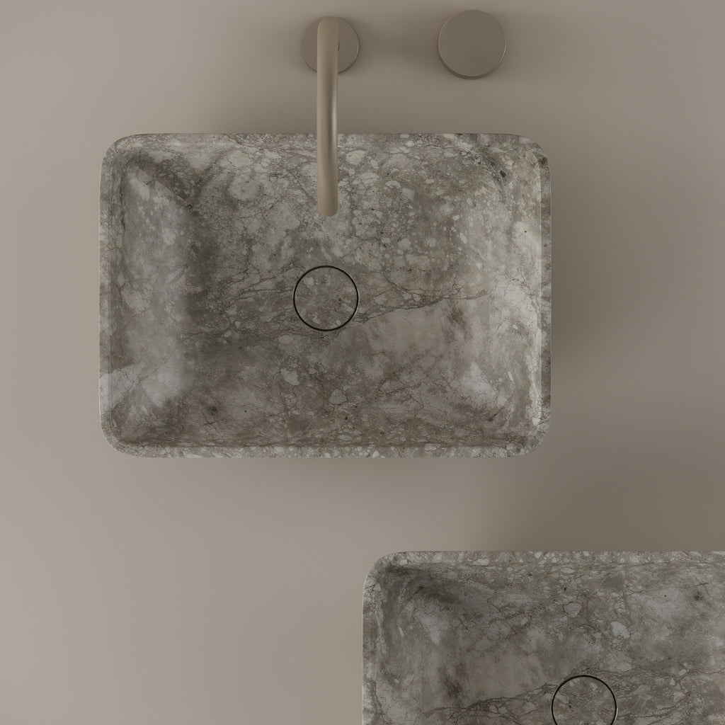 Carved from marble at 18 inches by 13 inches, this rectangular vessel sink combines a practical basin size with a clean linear structure. The defined edges create a strong directional presence while maintaining usability. Its surface introduces natural variation and depth.