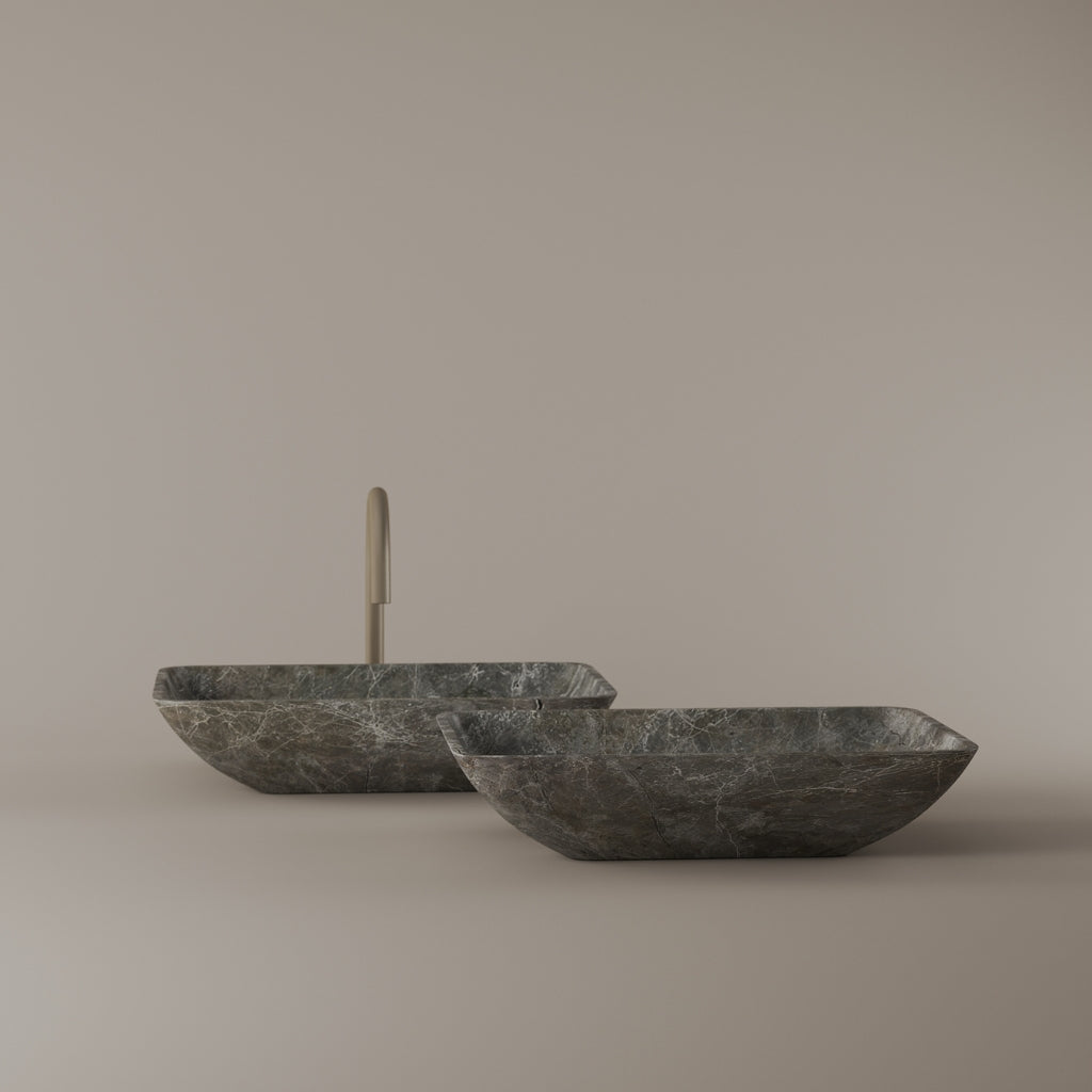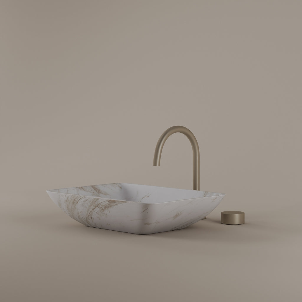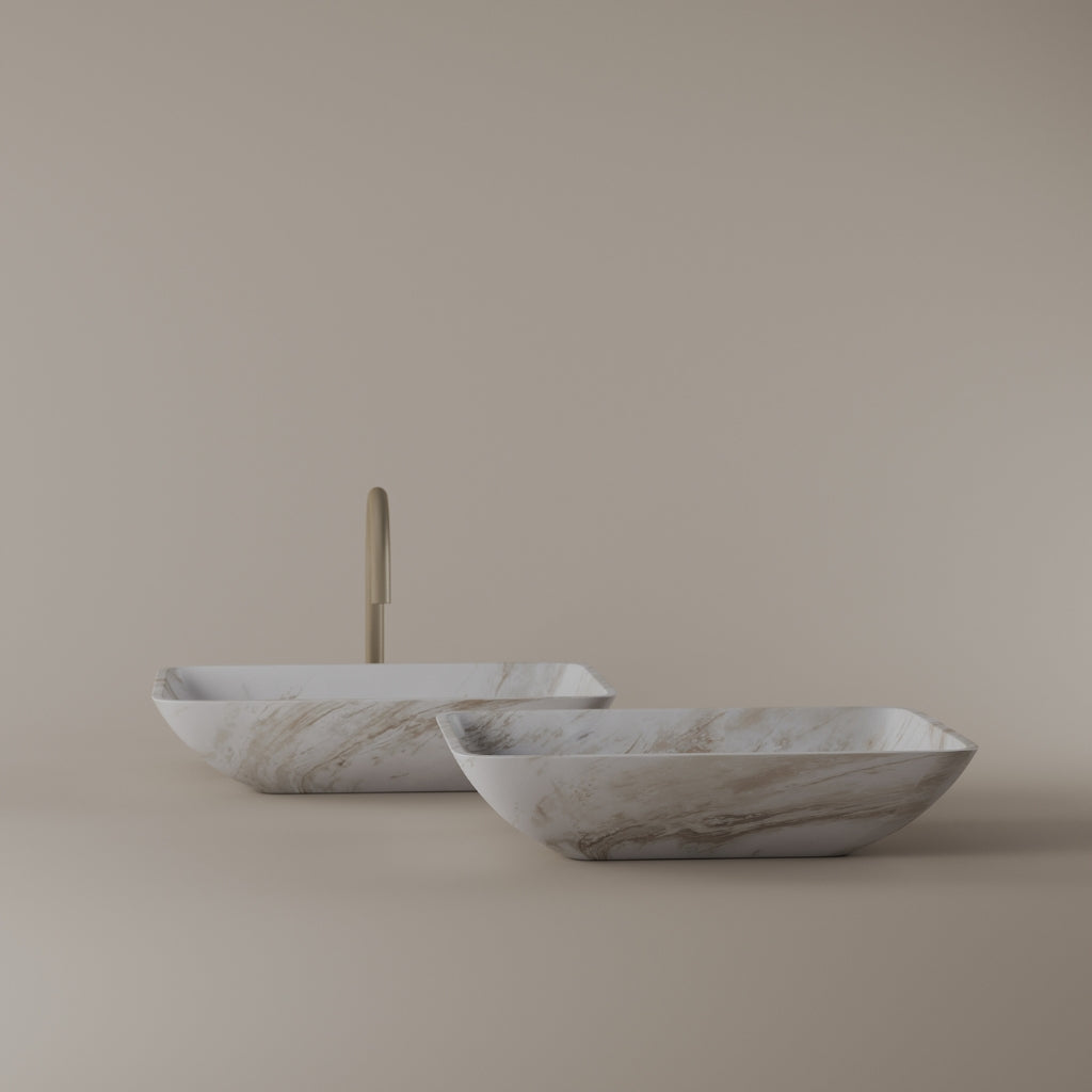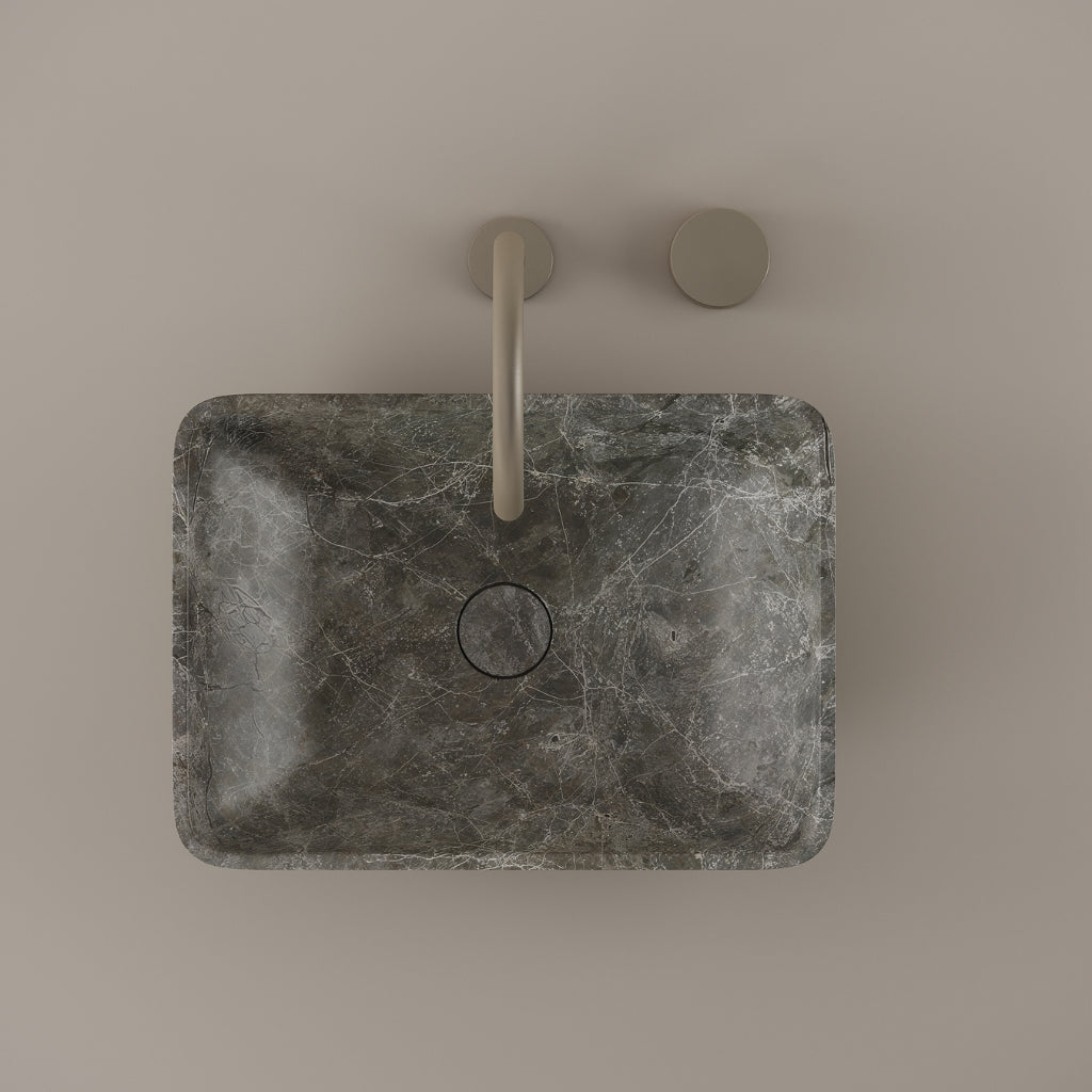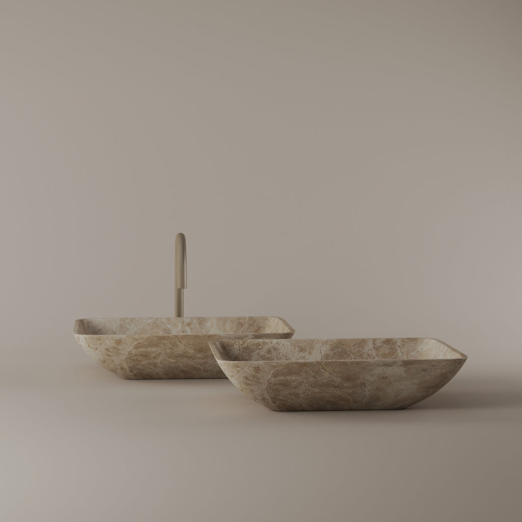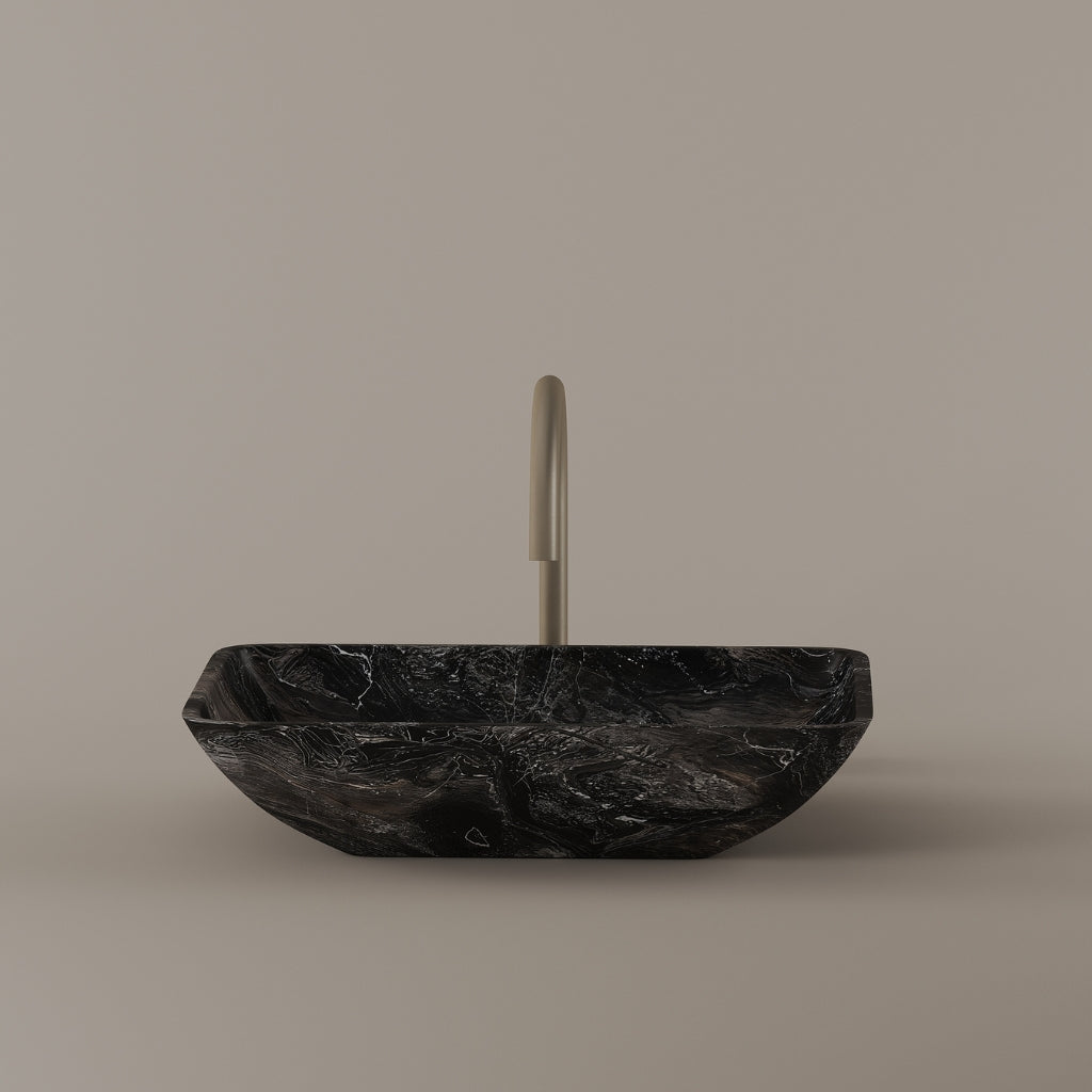 Carved from marble at 18 inches by 13 inches, this rectangular vessel sink combines a practical basin size with a clean linear structure. The defined edges create a strong directional presence while maintaining usability. Its surface introduces natural variation and depth.