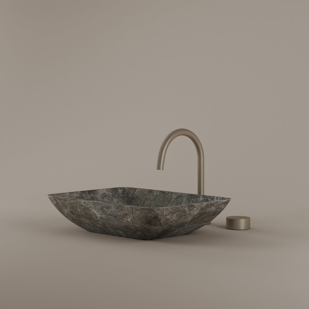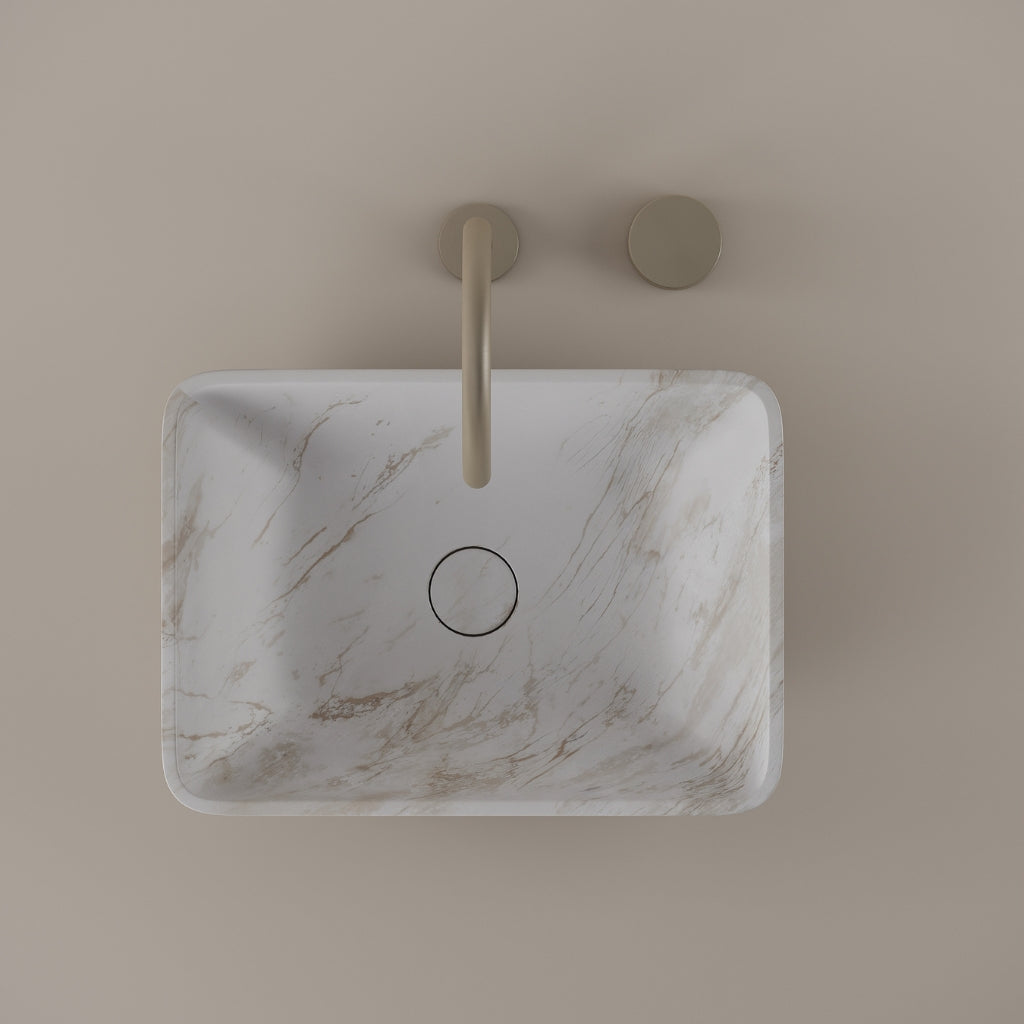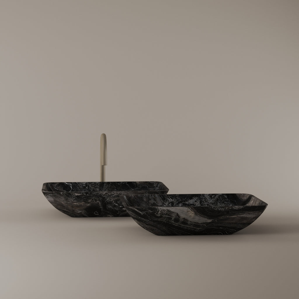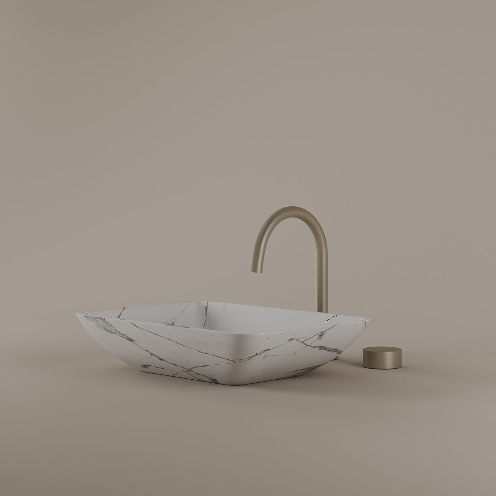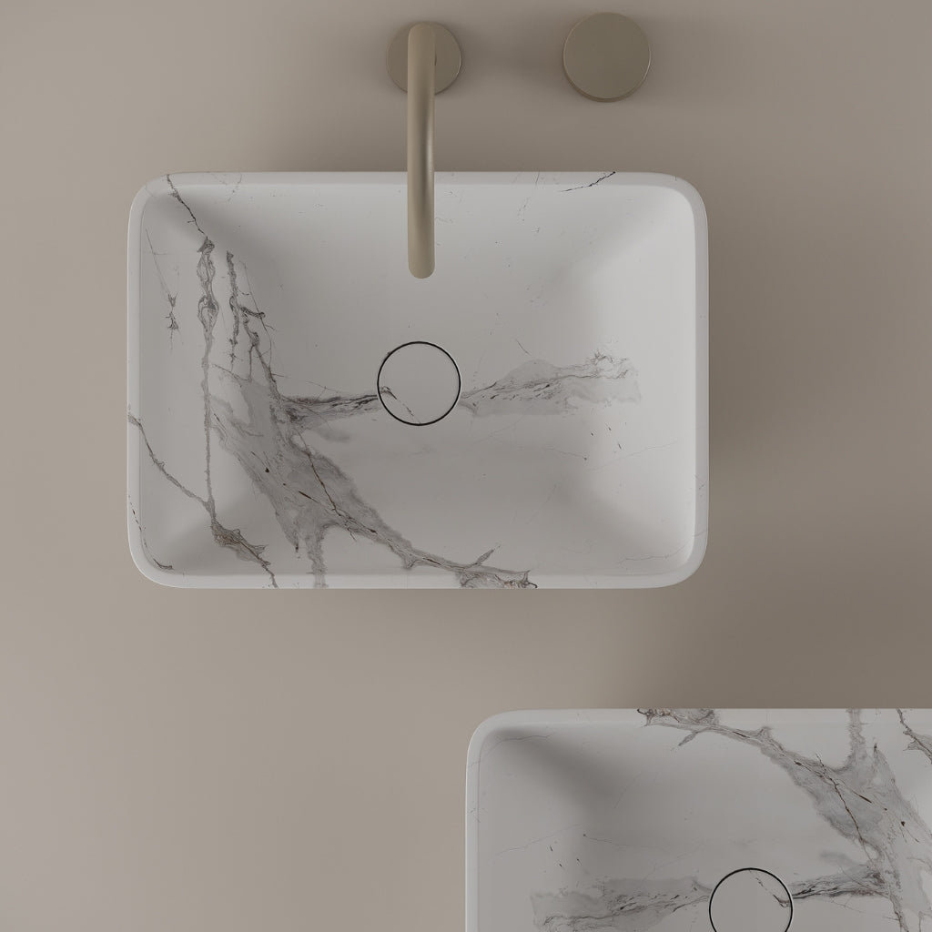 Carved from marble at 18 inches by 13 inches, this rectangular vessel sink combines a practical basin size with a clean linear structure. The defined edges create a strong directional presence while maintaining usability. Its surface introduces natural variation and depth.