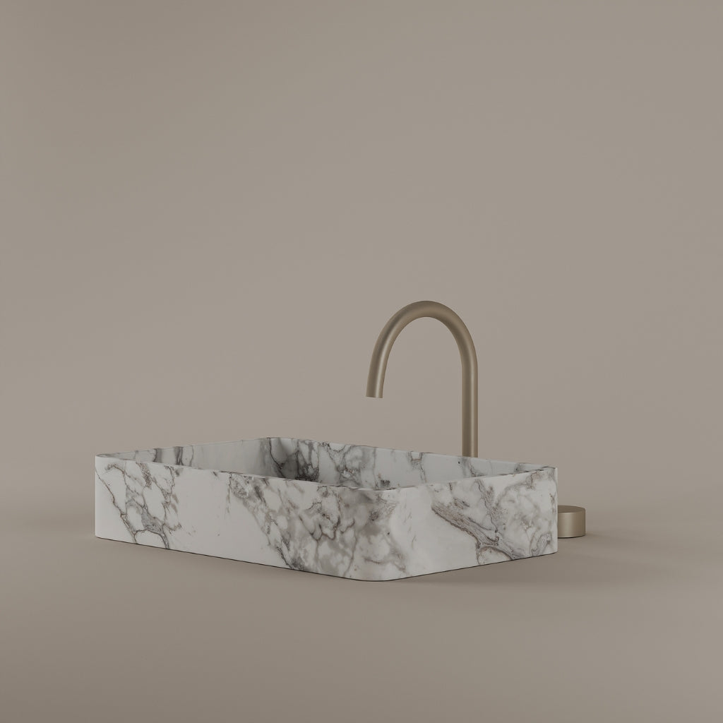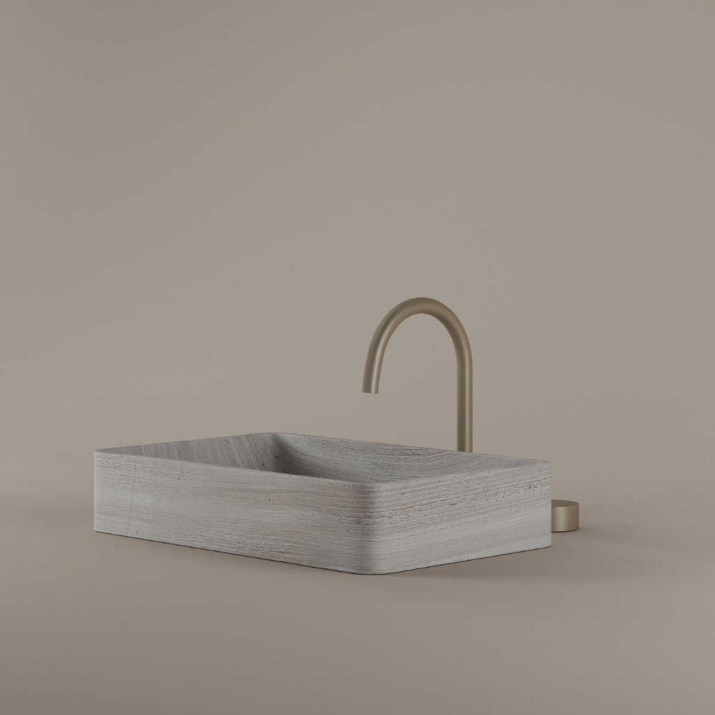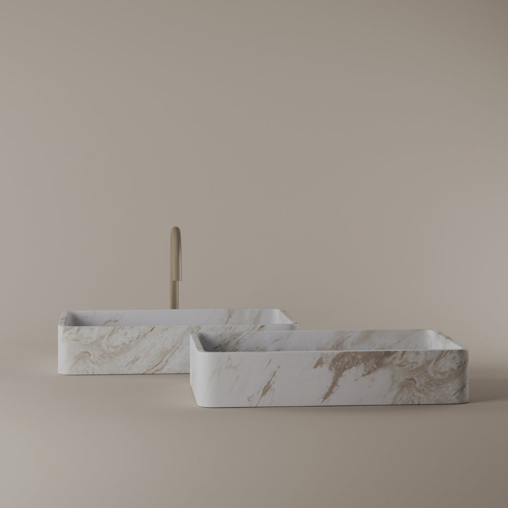 Carved from marble at 20 inches by 13 inches, this rectangular vessel sink presents a defined linear form. The elongated basin increases usable space while the structured edges reinforce a clean architectural presence. Its refined surface introduces natural variation, shaping a focused and functional bathroom setting.