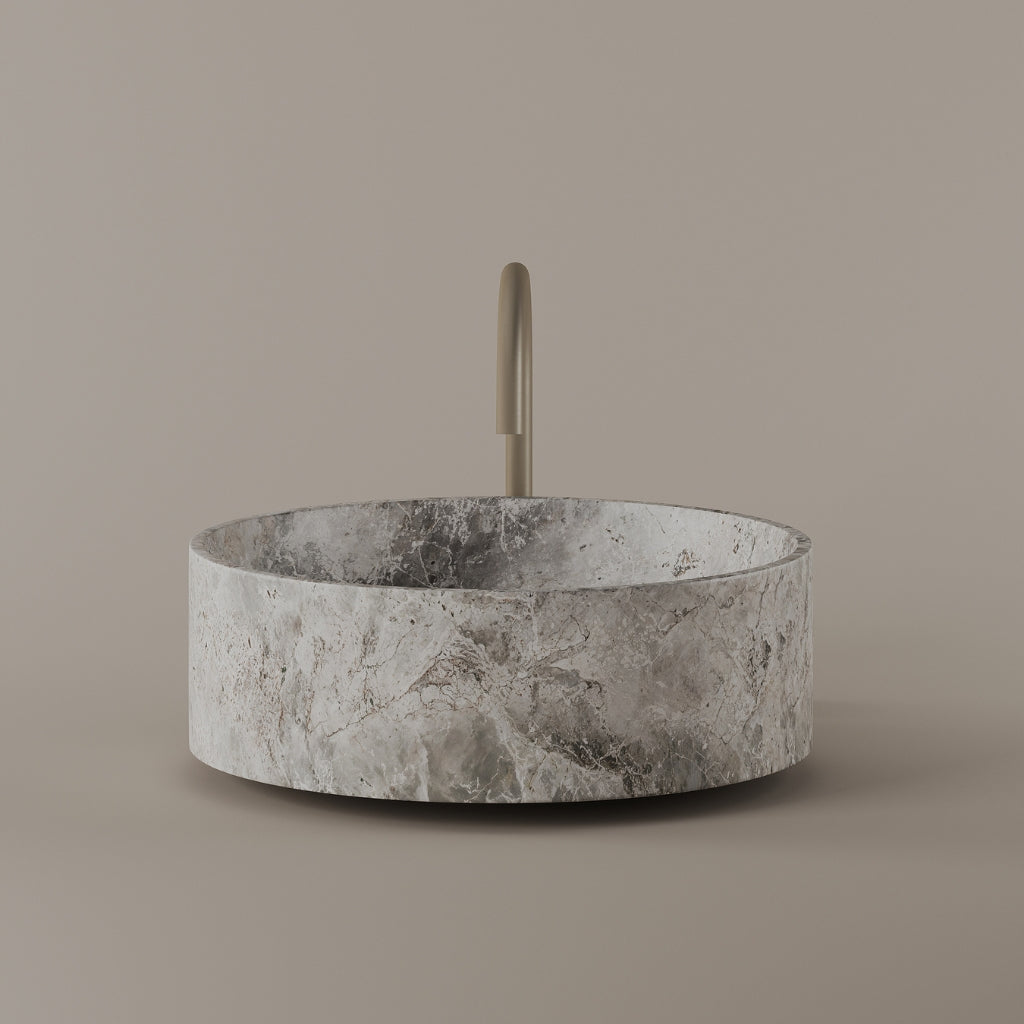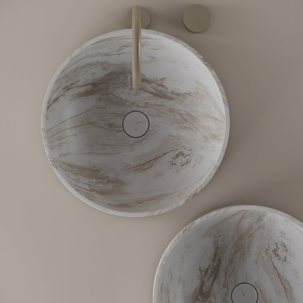 Carved from marble at 18 inches, this round vessel sink delivers a continuous circular basin with a balanced edge. The smooth interior supports daily use while maintaining a composed and uninterrupted form. Its natural variation adds depth to a clean and modern setting.