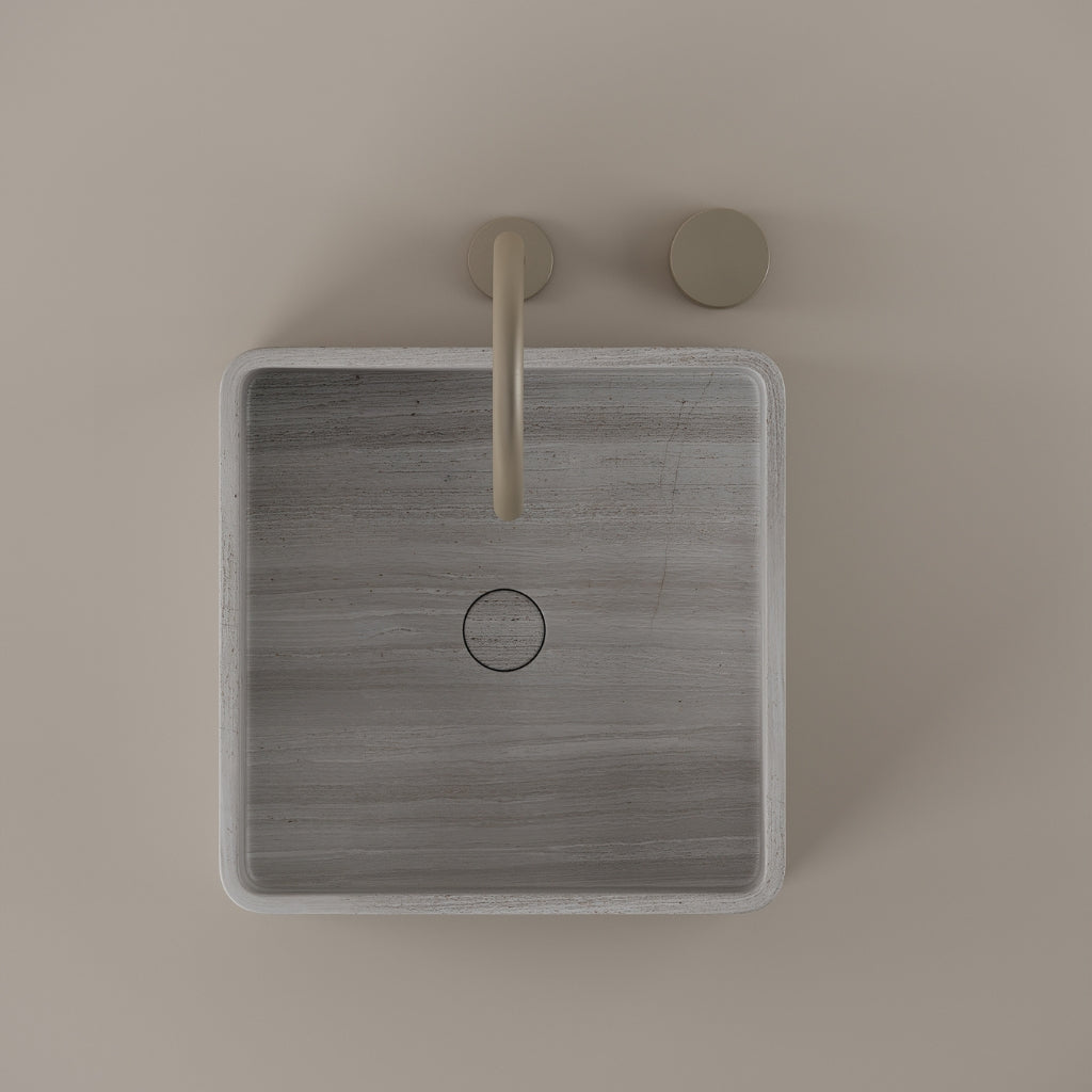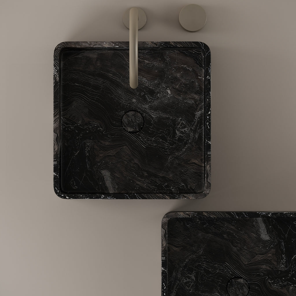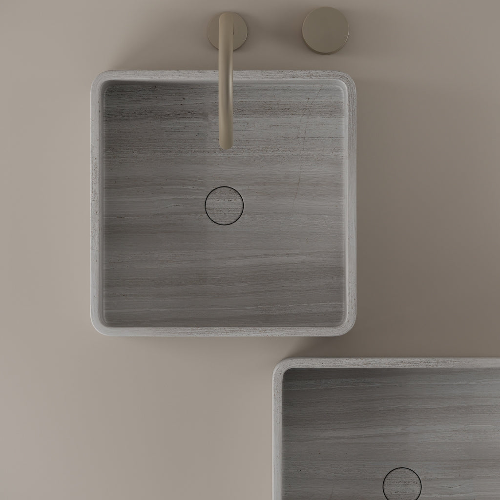 Shaped from marble at 15 inches by 15 inches, this square vessel sink defines the bathroom with clear symmetry. The equal dimensions create a structured layout while maximizing basin space. Its defined edges and natural surface establish a strong architectural presence.