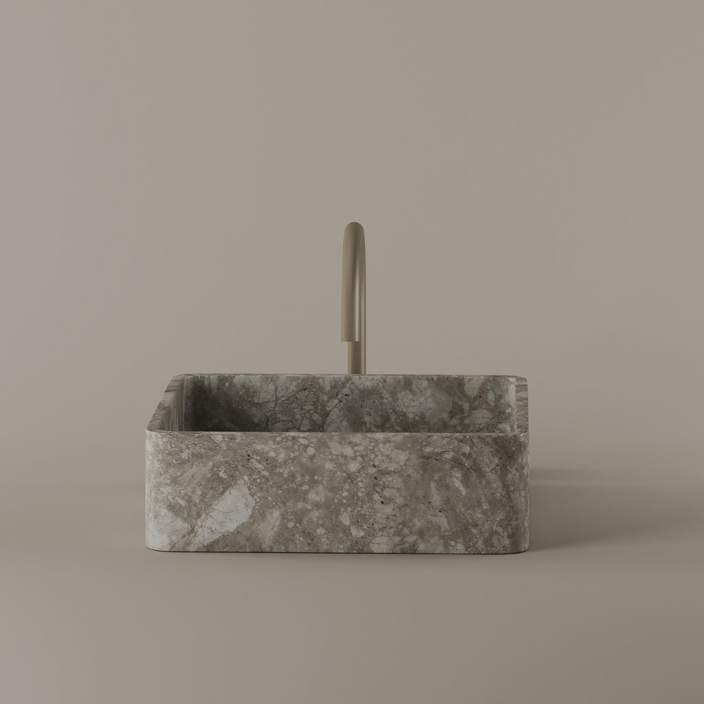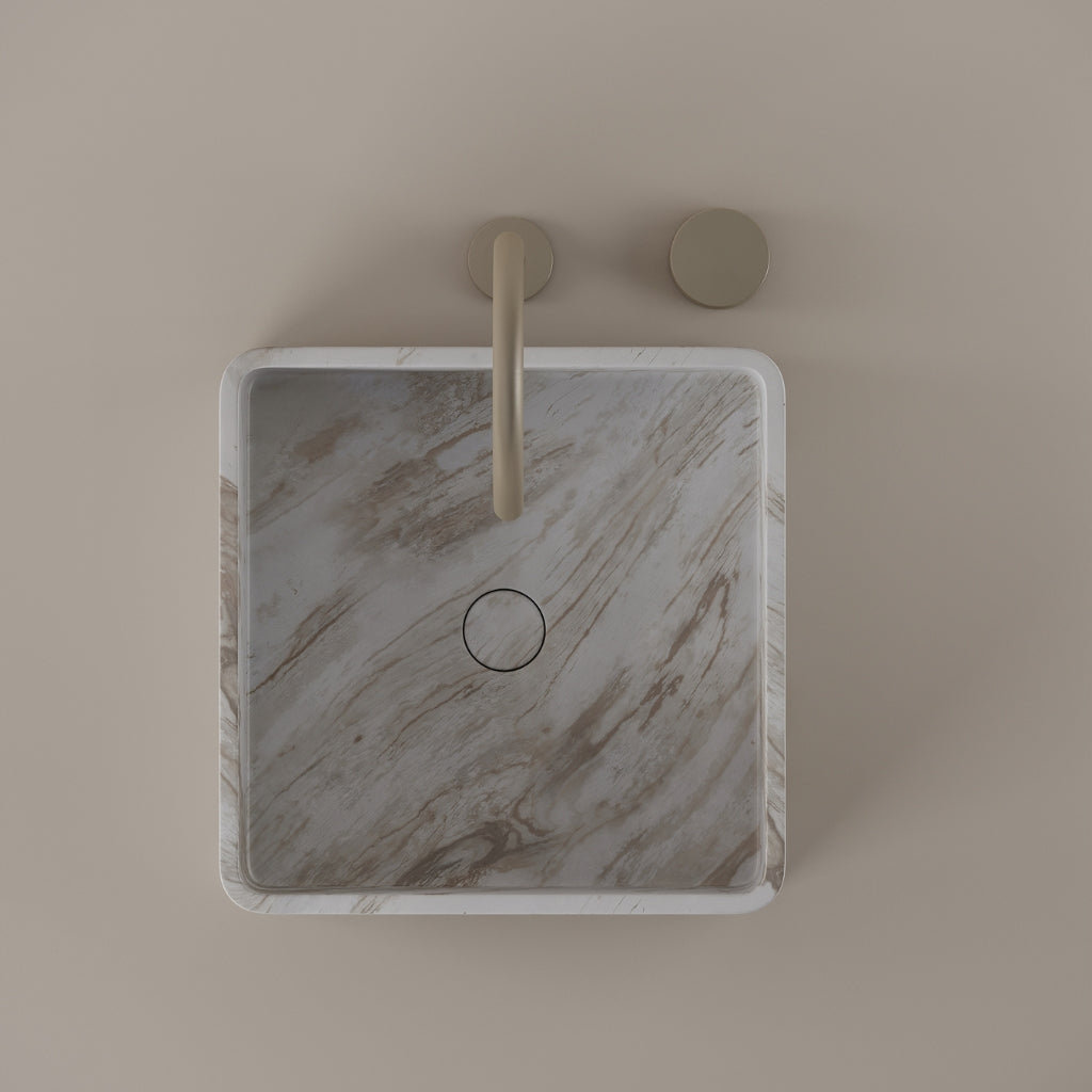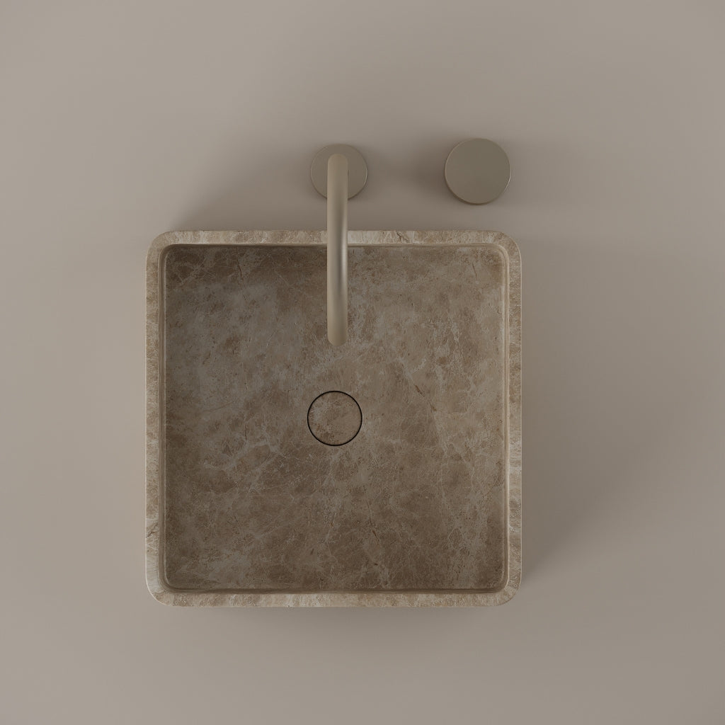 Shaped from marble at 15 inches by 15 inches, this square vessel sink defines the bathroom with clear symmetry. The equal dimensions create a structured layout while maximizing basin space. Its defined edges and natural surface establish a strong architectural presence.