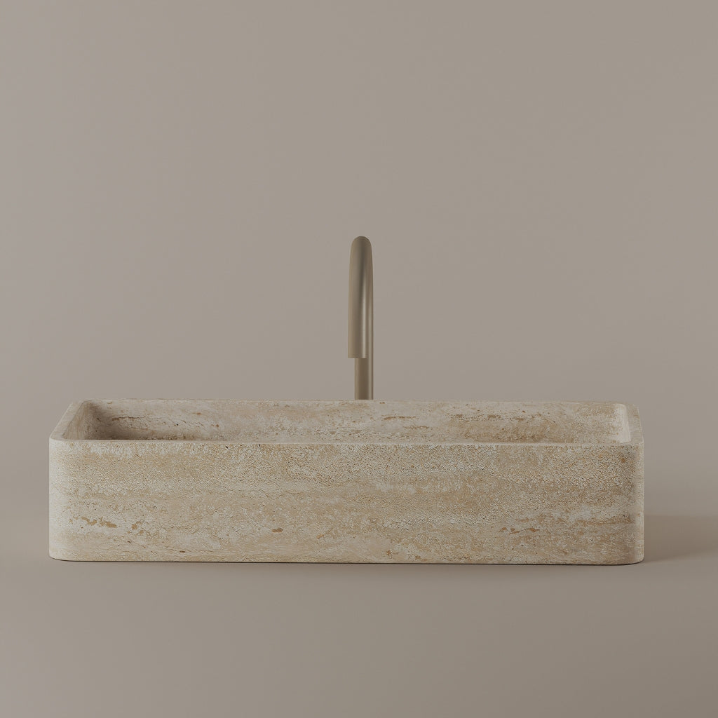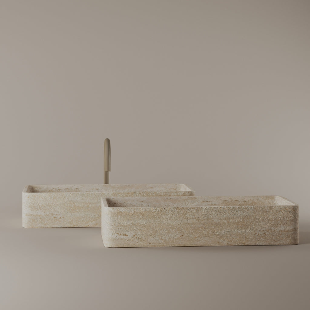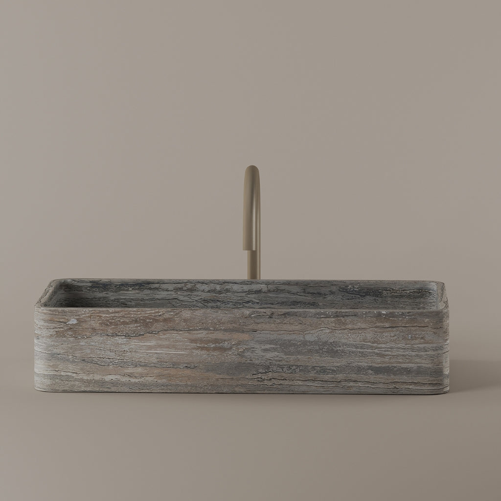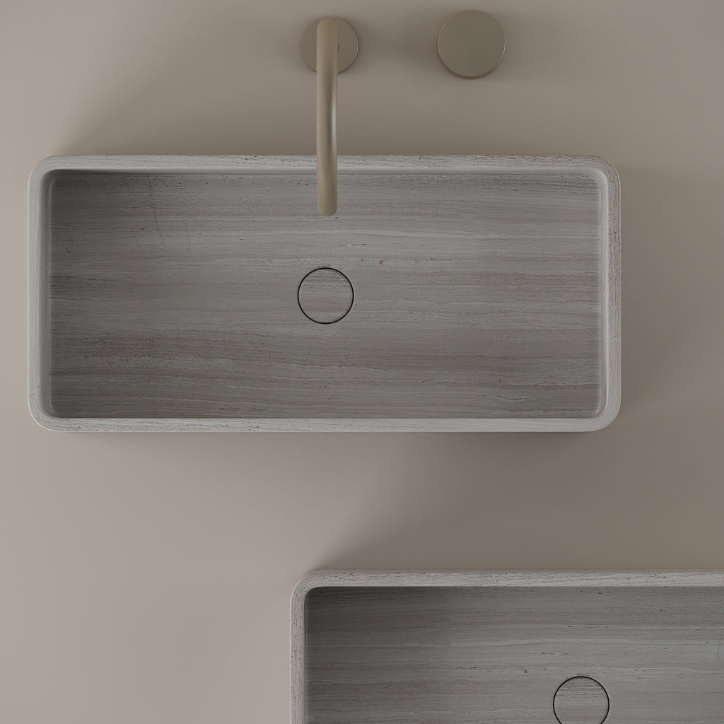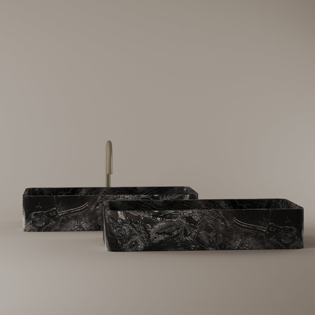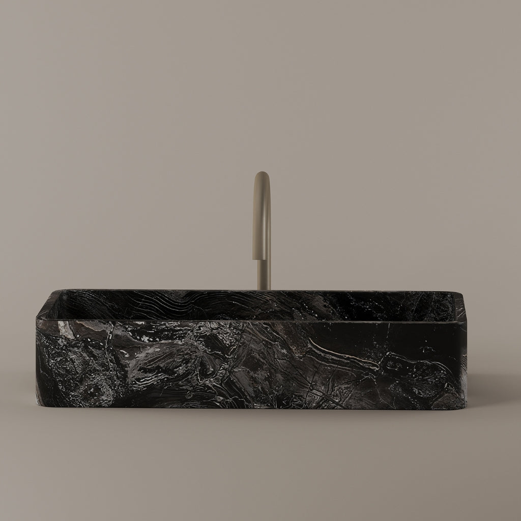 Carved from marble at 24 inches by 11 inches, this rectangular vessel sink features a long and narrow basin. The extended proportions enhance usability while maintaining a clean and directional profile. Its material depth reinforces a modern architectural expression.