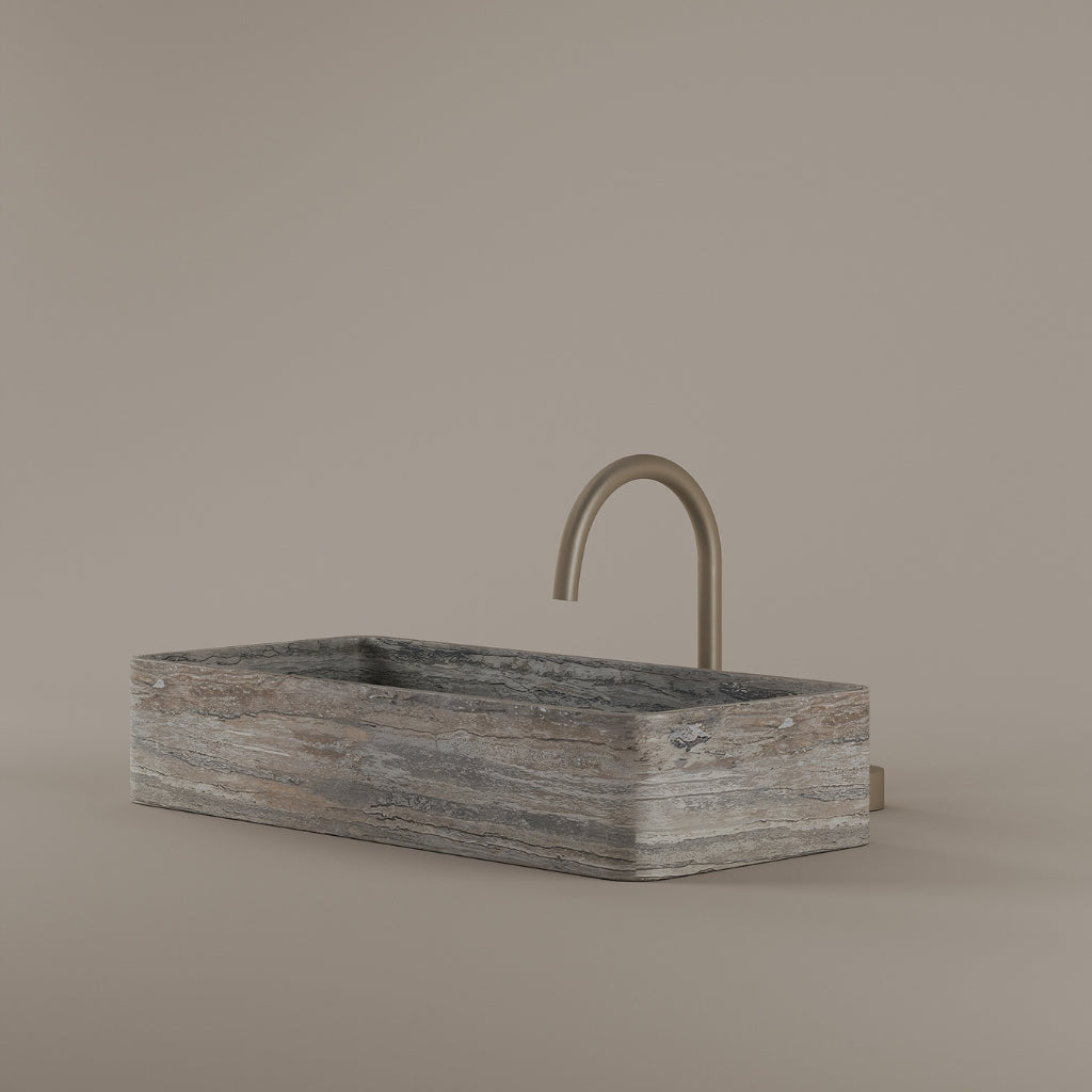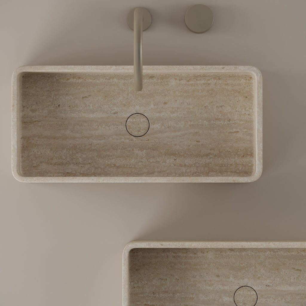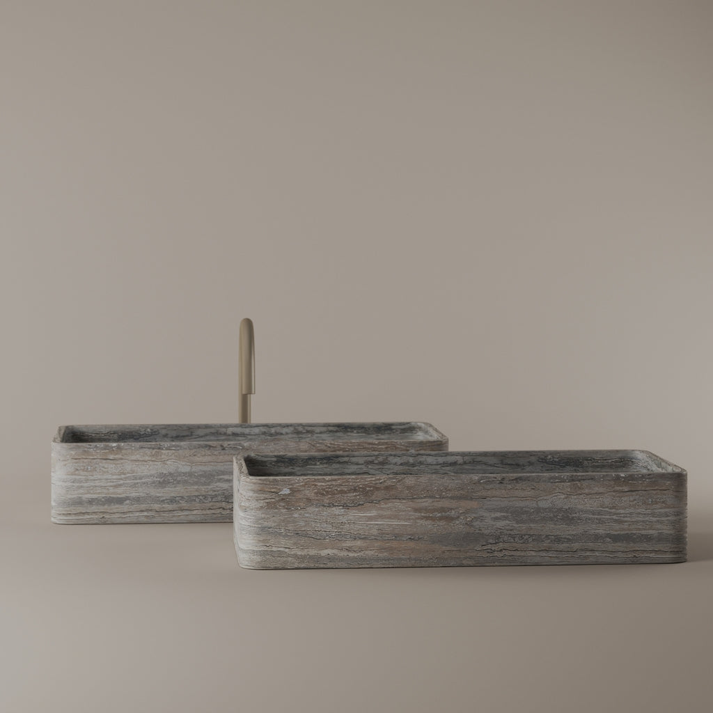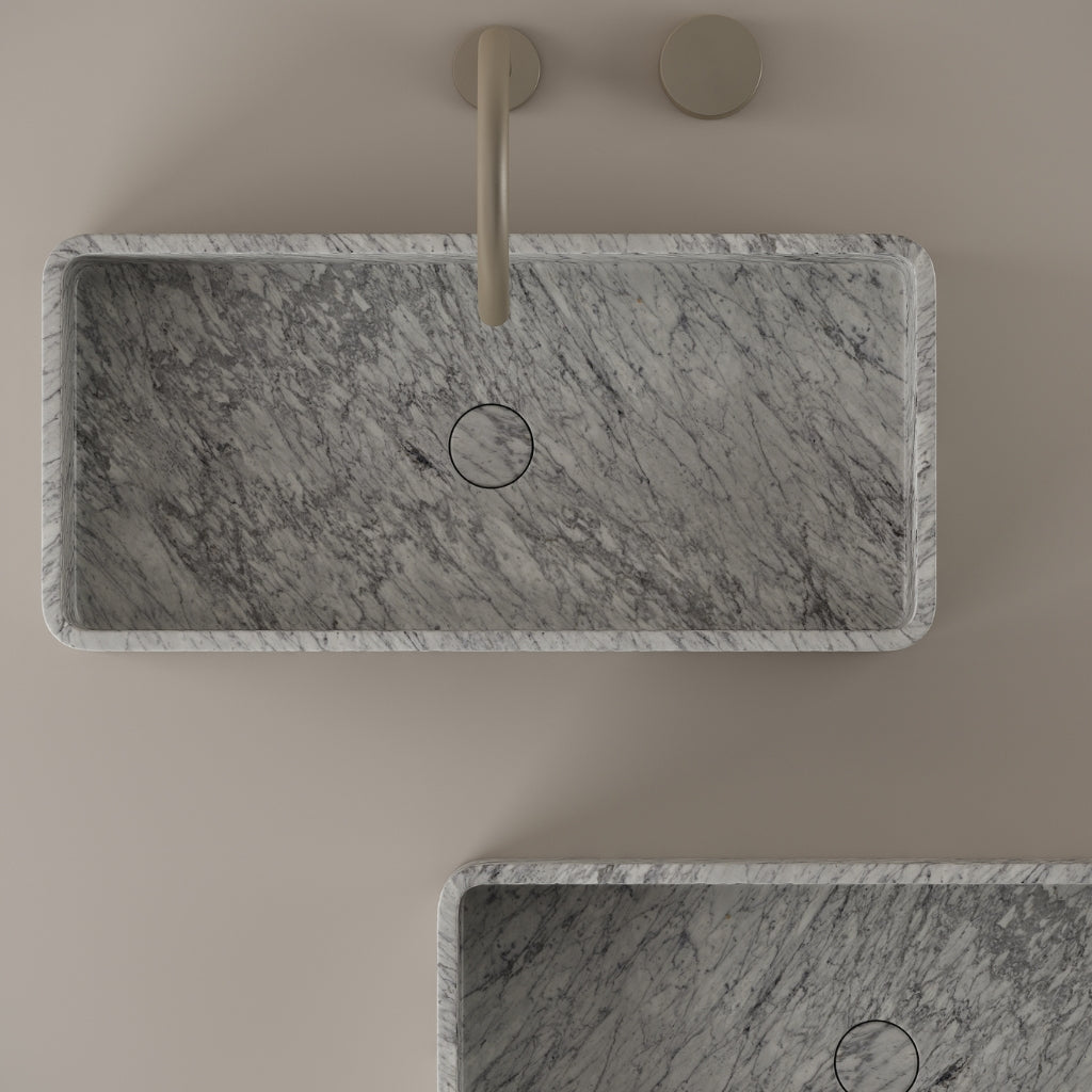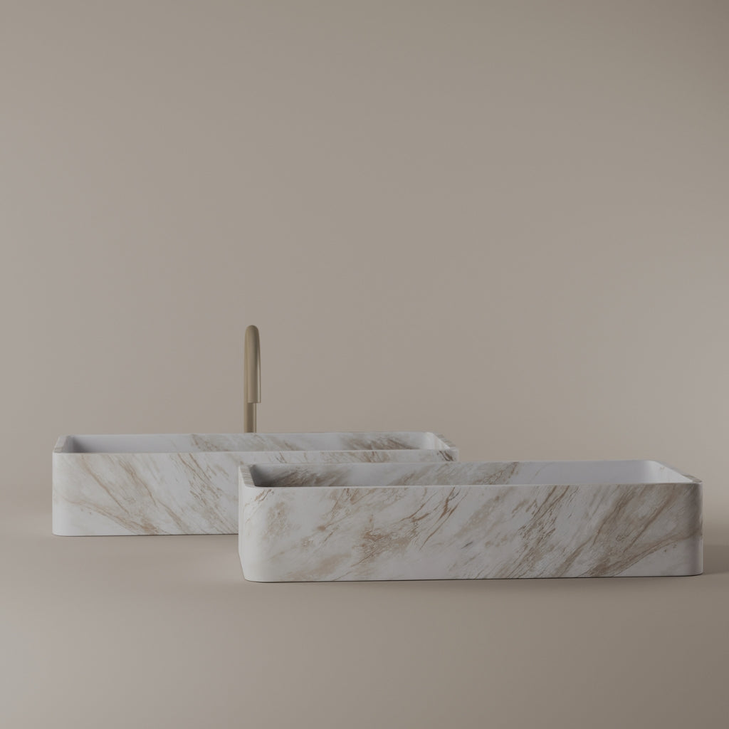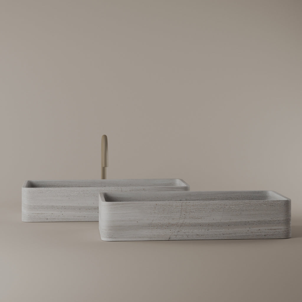 Carved from marble at 24 inches by 11 inches, this rectangular vessel sink features a long and narrow basin. The extended proportions enhance usability while maintaining a clean and directional profile. Its material depth reinforces a modern architectural expression.
