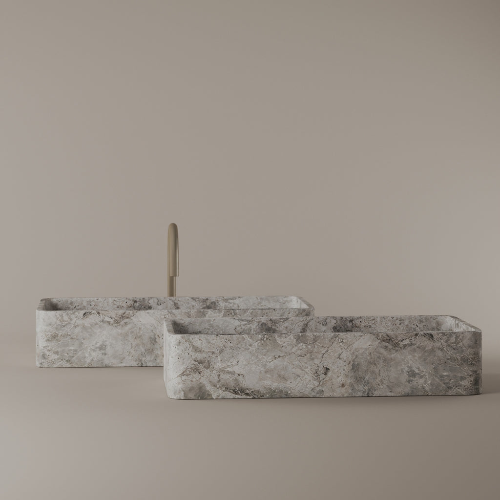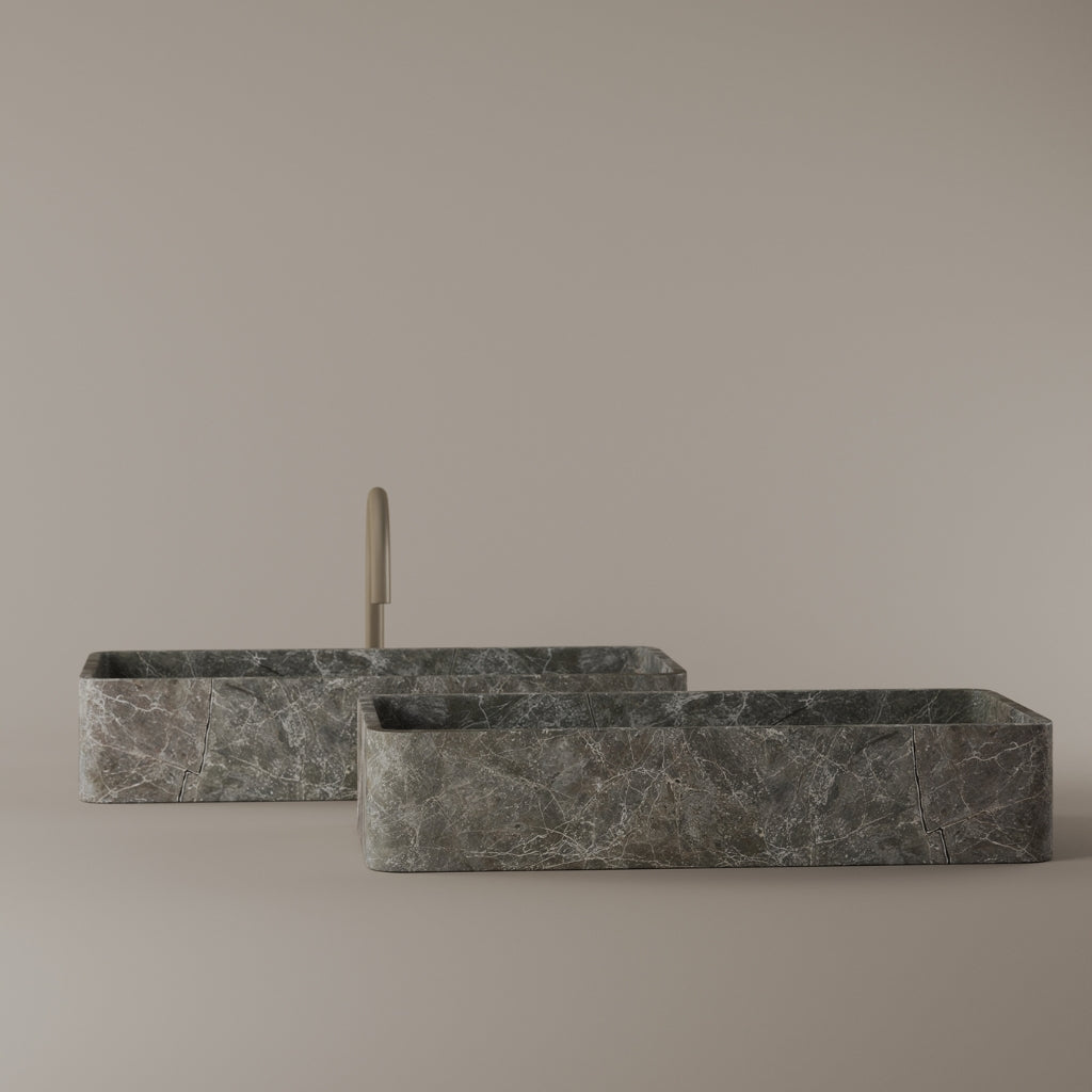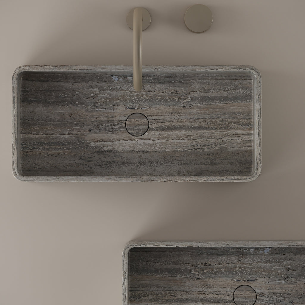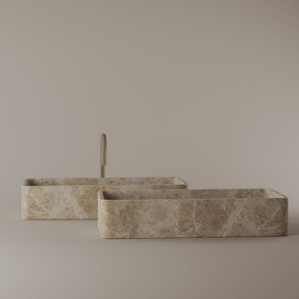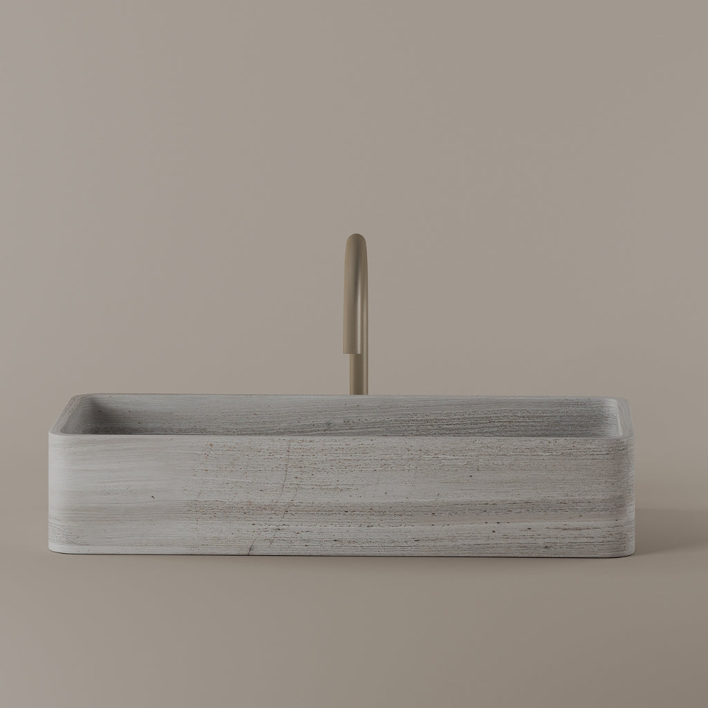 Carved from marble at 24 inches by 11 inches, this rectangular vessel sink features a long and narrow basin. The extended proportions enhance usability while maintaining a clean and directional profile. Its material depth reinforces a modern architectural expression.