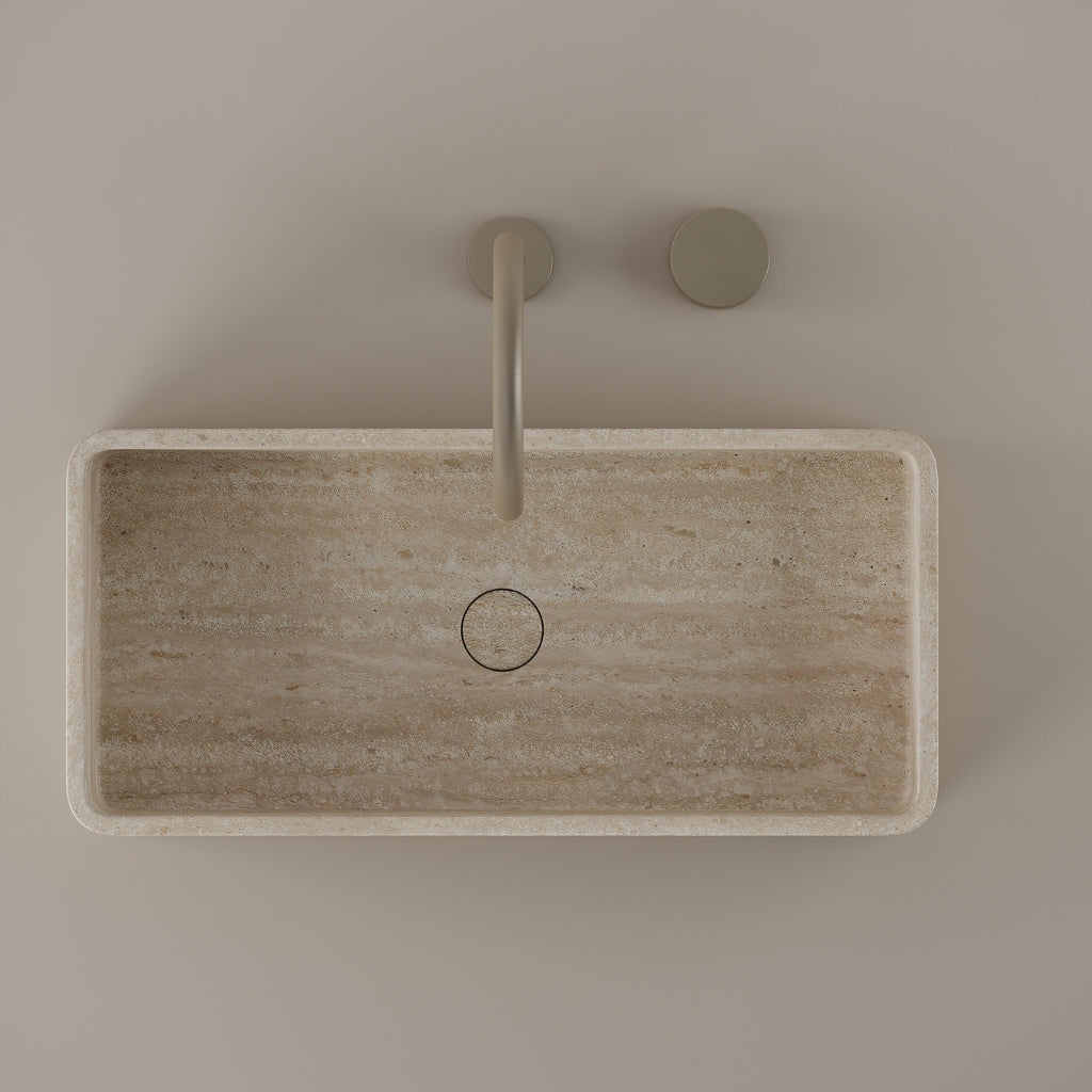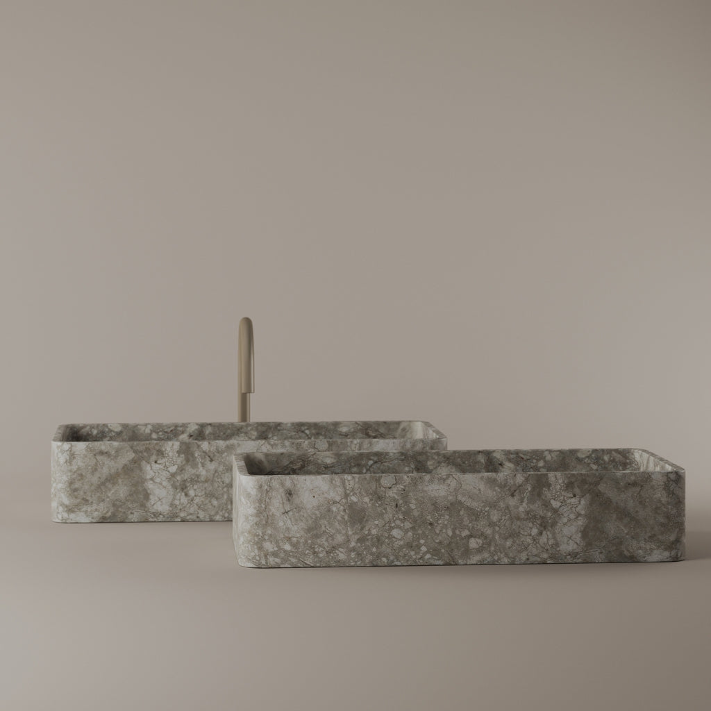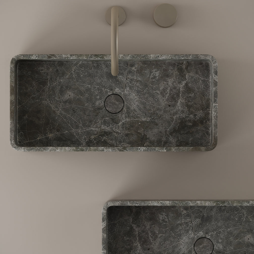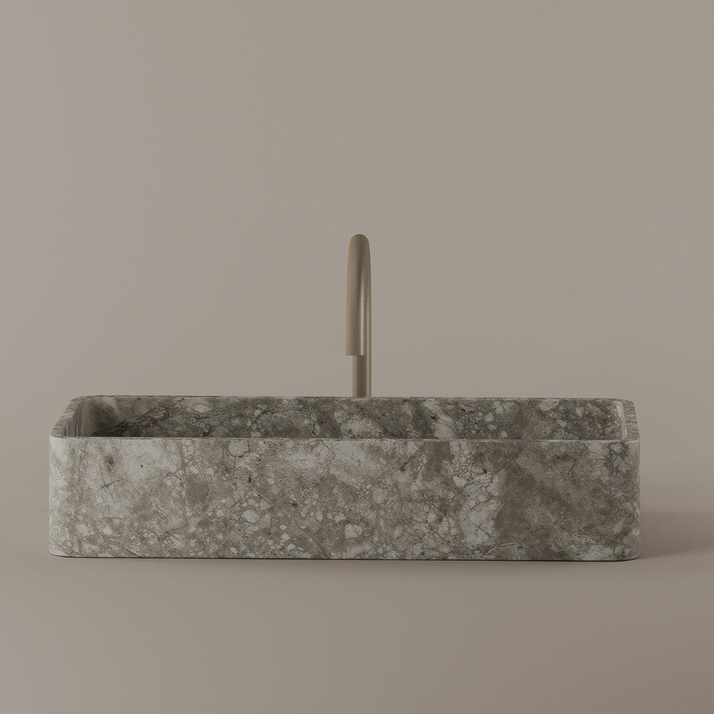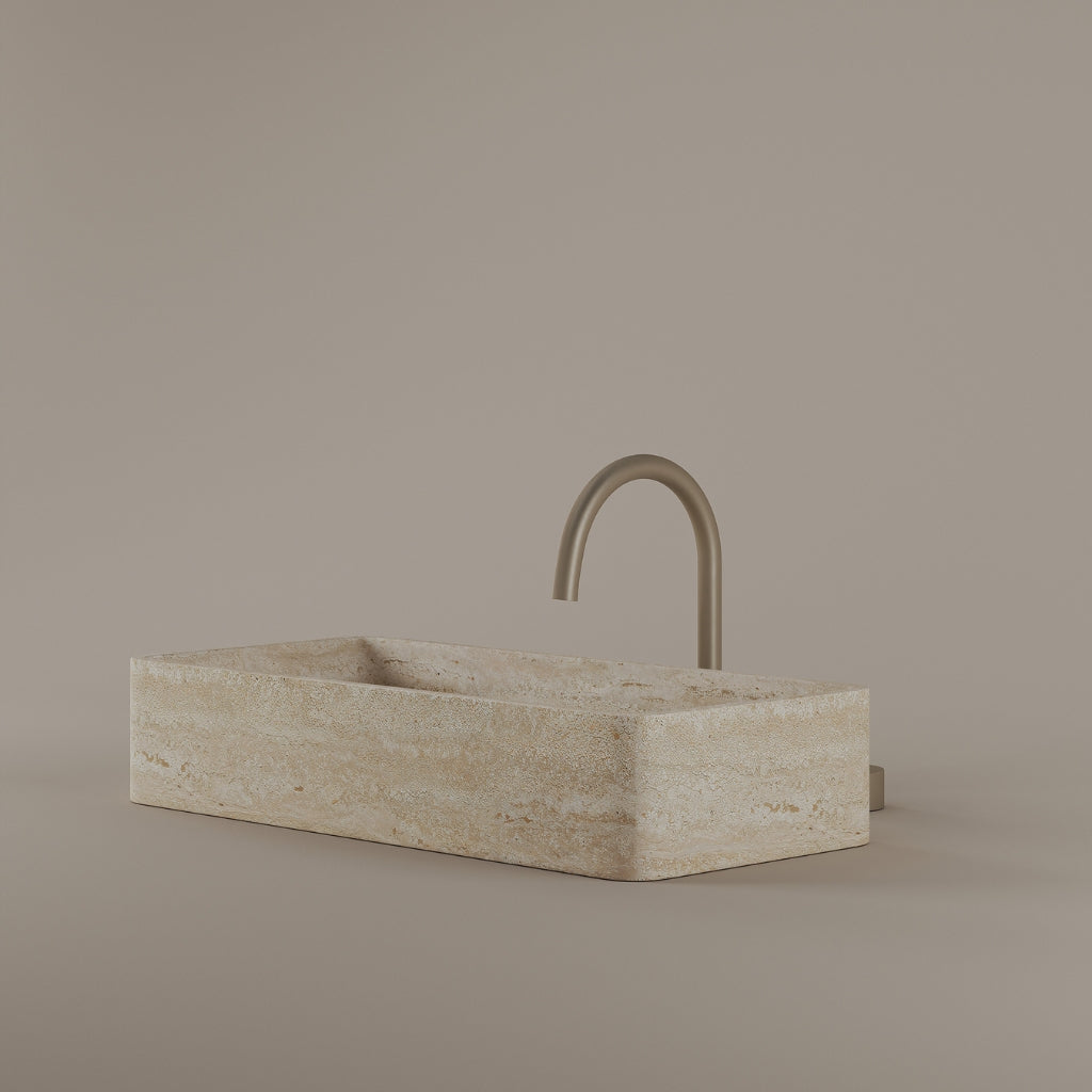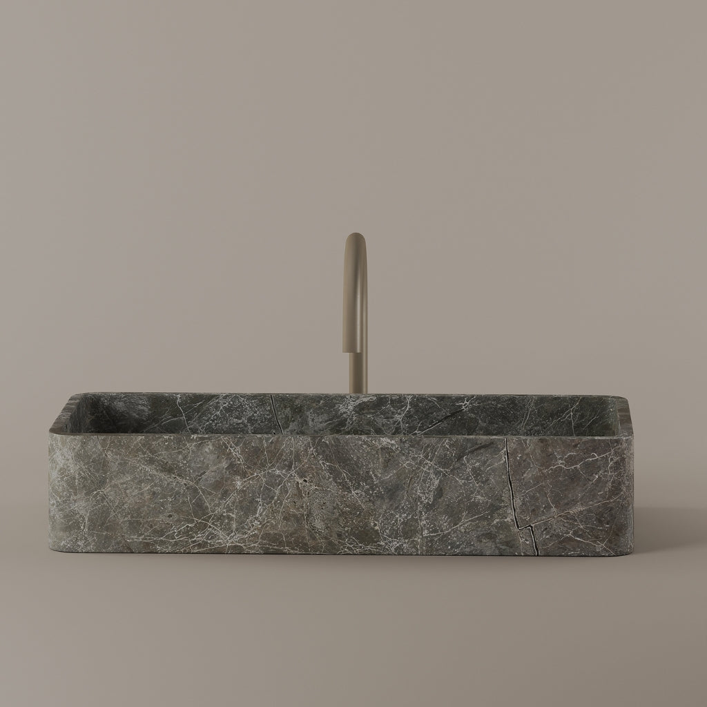 Carved from marble at 24 inches by 11 inches, this rectangular vessel sink features a long and narrow basin. The extended proportions enhance usability while maintaining a clean and directional profile. Its material depth reinforces a modern architectural expression.