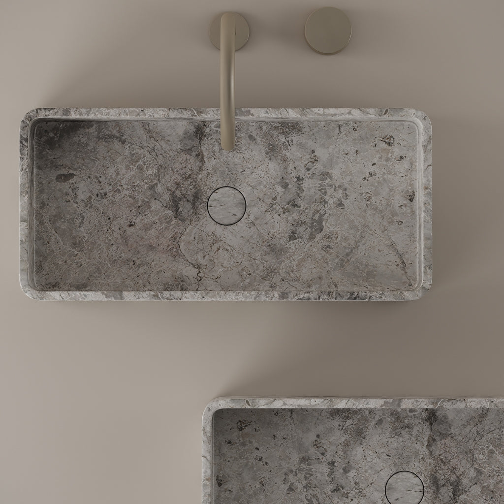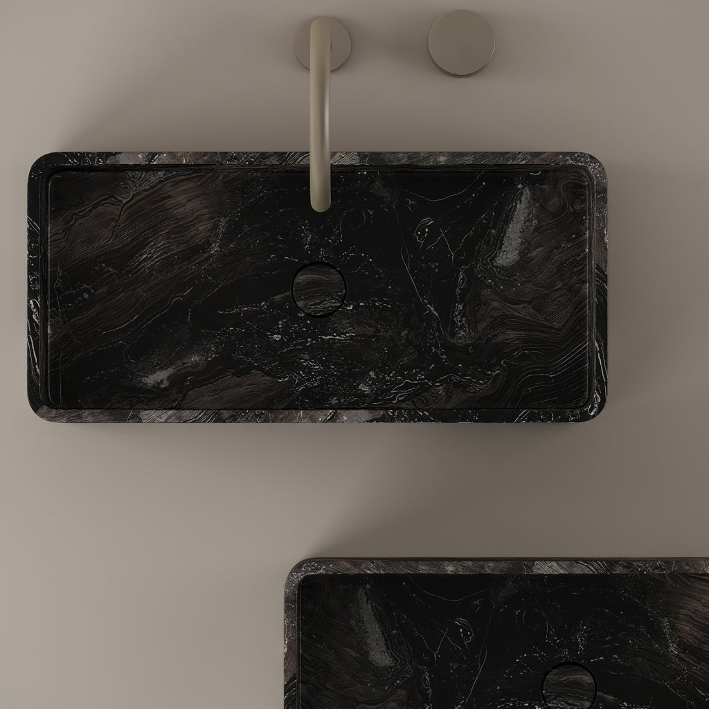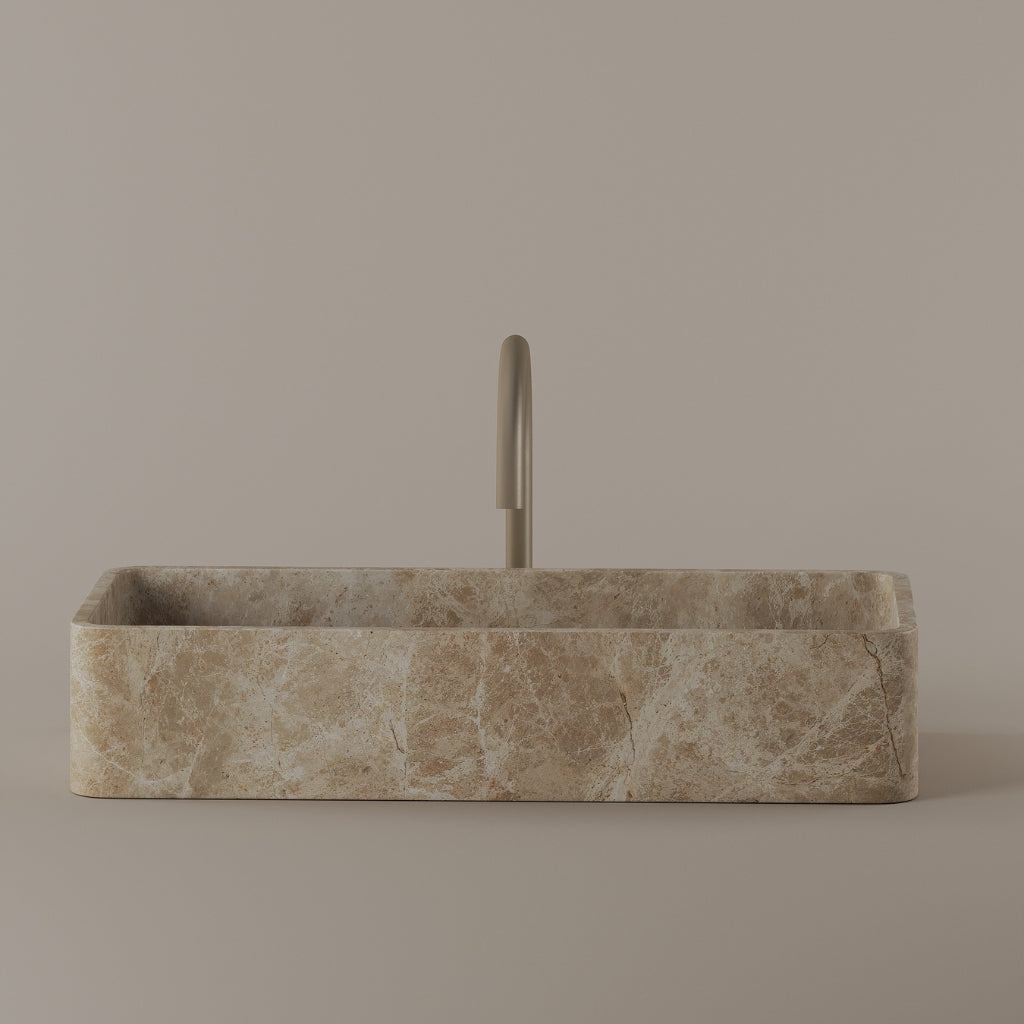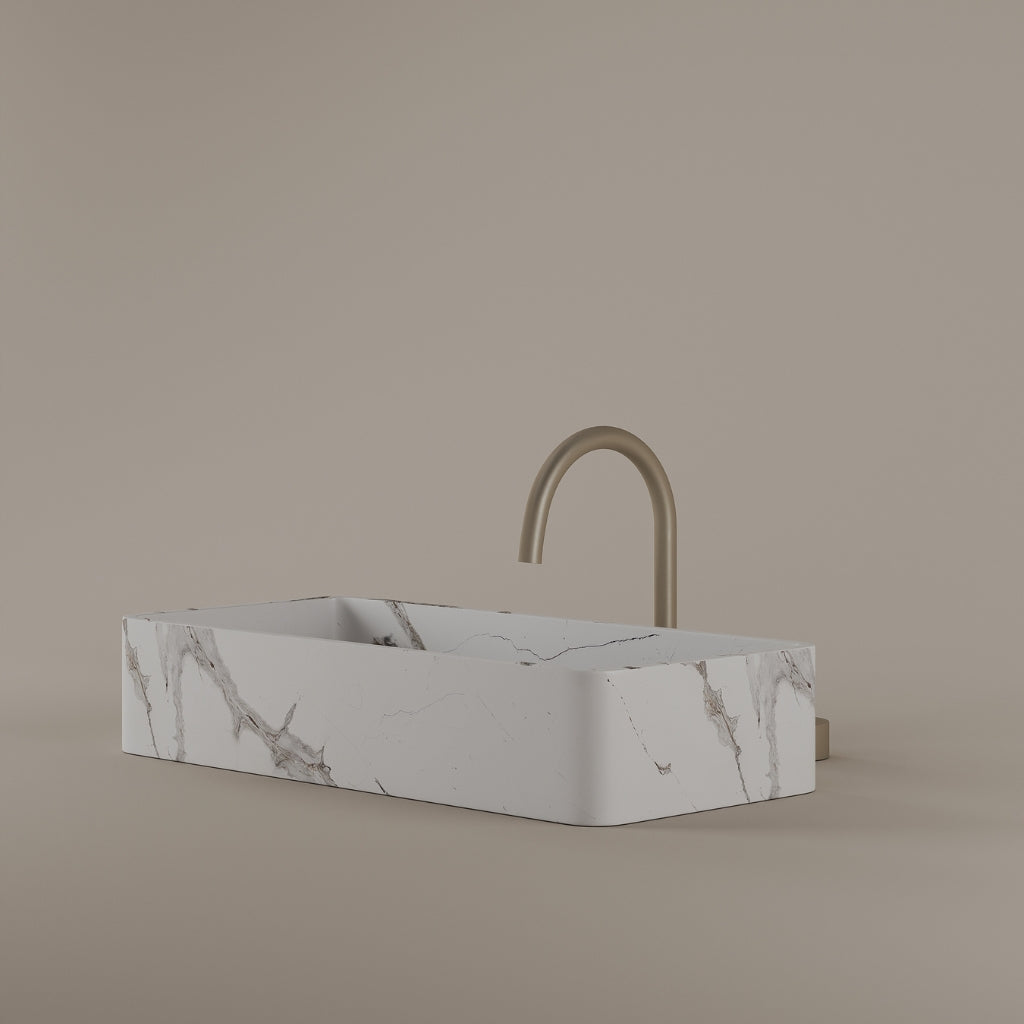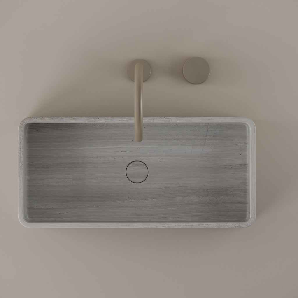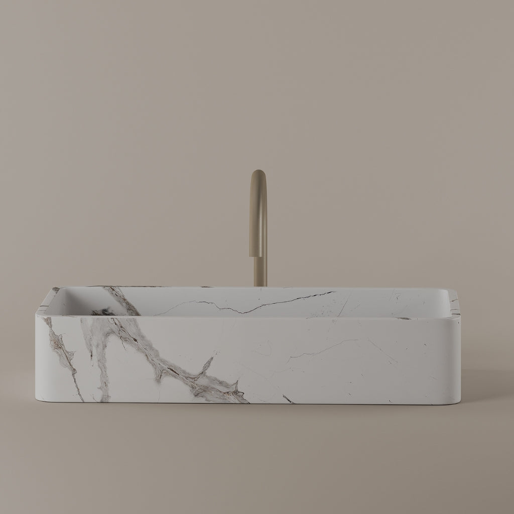 Carved from marble at 24 inches by 11 inches, this rectangular vessel sink features a long and narrow basin. The extended proportions enhance usability while maintaining a clean and directional profile. Its material depth reinforces a modern architectural expression.